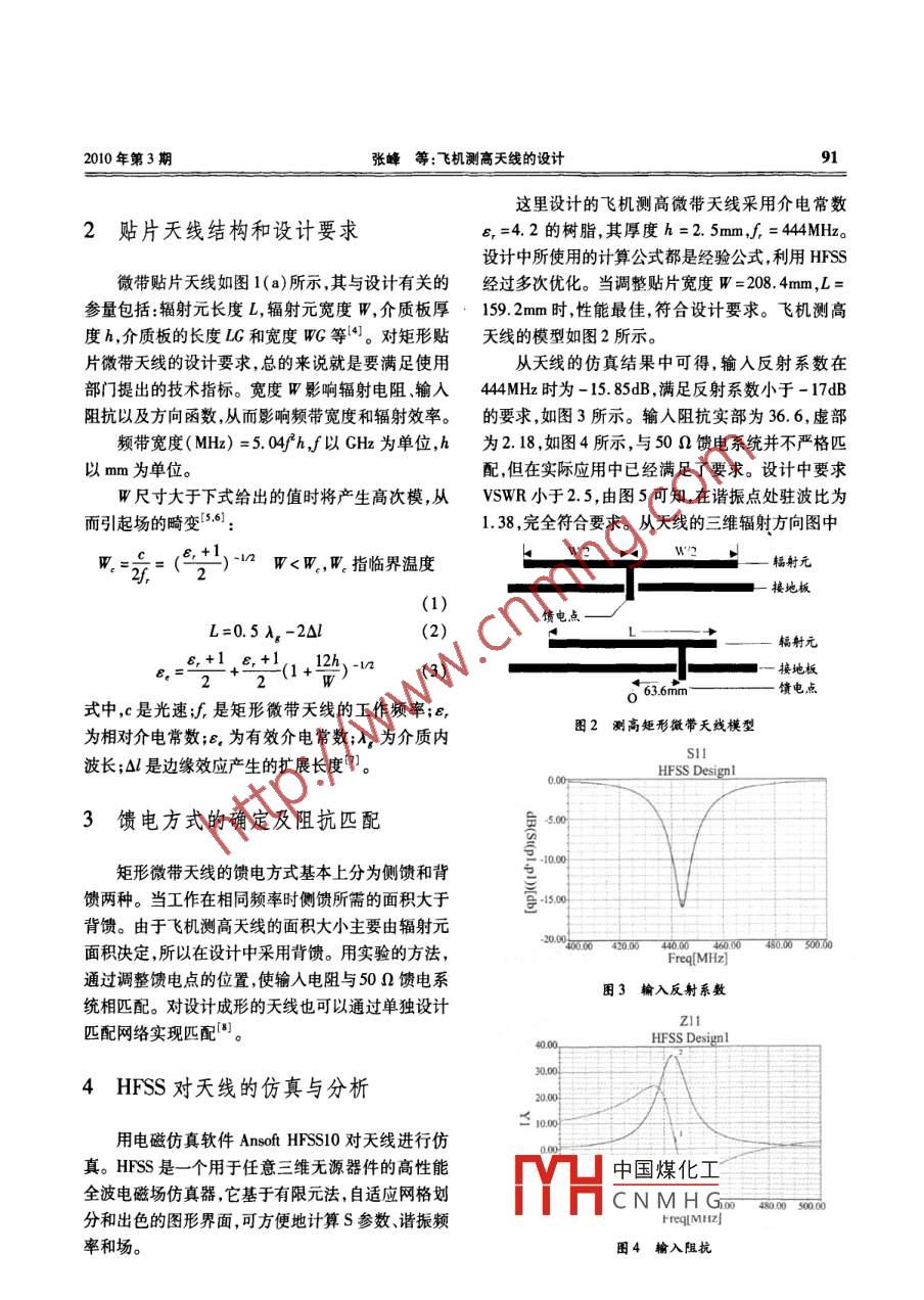 空間電子技術(shù)90SPACE ELECTRONIC TECHNOLOGY2010年第3期飛機測高天線的設(shè)計張峰于海龍(西安電子科技大學(xué)機電工程學(xué)院,西安710071)摘要文章研究了微帶天線的設(shè)計,論述了其結(jié)構(gòu)及應(yīng)用,介紹了設(shè)計流程和要求,并利用HFSS設(shè)計了一個用于飛機測高的天線,中心頻率在444MHz。仿真結(jié)果表明,所設(shè)計的微帶天線有較好的輻射特性,滿足設(shè)計要求。關(guān)鍵詞微帶天線HFSS10 天線分析阻抗匹配質(zhì)層和粘貼在其上下兩面的金屬接地板和輻射元構(gòu)0引言成。輻射元的形狀可以是方形、矩形、圓形等。矩形微帶天線的形狀如圖1(a)所示,分析這種天線有各近20年來,隨著微帶理論的發(fā)展,微帶天線的種方法,包括較嚴格的解法和比較簡單的方法”。應(yīng)用日益廣泛,現(xiàn)在已廣泛用于100MHz ~ 50GHzMunson[2]和Dermeryd'3)的傳輸線模型可得出適合的無線電設(shè)備中。它體積小、質(zhì)量輕、低剖面,能與大多 數(shù)工程應(yīng)用的結(jié)果。傳輸線法的基本假設(shè)是:載體(如飛行器)共形,并且除了在饋電點處要開出(1)微帶片和接地板構(gòu)成一段微帶傳輸線,傳輸準引線孔外,不破壞載體的機械結(jié)構(gòu),這對于高速飛行TEM波,波的傳輸方向決定于饋電點。線段長度L器特別有利。文章針對飛機測高天線的要求",設(shè)=λ_/2 ,λm為準TEM波的波長。場在傳輸方向是計了一個中心頻率為44MHz的矩形微帶天線,利駐波分布 ,而在其垂直方向是常數(shù)。(2)傳輸線的用Ansoft HFSS10進行天線的設(shè)計、仿真和優(yōu)化,使兩個開口端(始端和末端)等效為兩個輻射縫,長為天線的駐波比、輸人阻抗、增益及方向圖等均滿足系W,寬為h,縫口徑場即為傳輸線開口端場強??p平統(tǒng)工作要求。面看作位于微帶片兩端的延伸面上,即是將開口面向上折轉(zhuǎn)90° ,而開口場強隨之折轉(zhuǎn)。在此假設(shè)條1微帶貼片天線的分析件下,矩形微帶天線可看成是相距二分之-波長同相激勵并向地板以上半空間輻射的二元縫隙陣列,微帶天線是由一層或多層厚度遠小于波長的介輻射場如圖1(b)所示。-幅射無介質(zhì)板t(a)矩形微帶天線(b-1)(b-2)輻射場圈1矩形徵帶天線結(jié)構(gòu)中國煤化工收稿日期:2009 -02-18;修回日期:2009 -05 -04.TYHCNMHG2010年第3期張峰等:飛機測高天線的設(shè)計)1這里設(shè)計的飛機測高微帶天線采用介電常數(shù)2貼片天線結(jié)構(gòu)和設(shè)計要求8,=4.2的樹脂,其厚度h=2.5mm,f, = 44MHz。設(shè)計中所使用的計算公式都是經(jīng)驗公式,利用HFSS微帶貼片天線如圖1(a)所示,其與設(shè)計有關(guān)的經(jīng)過多次優(yōu)化。當調(diào)整貼片寬度W =208. 4mm,L =參量包括:輻射元長度L,輻射元寬度W,介質(zhì)板厚159.2mm時,性能最佳,符合設(shè)計要求。飛機測高度h,介質(zhì)板的長度LC和寬度WG等4。對矩形貼天線的模型如圖2所示。片微帶天線的設(shè)計要求,總的來說就是要滿足使用從天線的仿真結(jié)果中可得,輸入反射系數(shù)在部門提出的技術(shù)指標。寬度W影響輻射電阻、輸人444MHz時為- 15. 85dB,滿足反射系數(shù)小于- 17dB阻抗以及方向函數(shù),從而影響頻帶寬度和輻射效率。的要求,如圖3所示。輸入阻抗實部為36. 6,虛部頻帶寬度(MHz) =5. 04fh,f以CHz為單位,h為2.18 ,如圖4所示,與50 n饋電系統(tǒng)并不嚴格匹以mm為單位。配,但在實際應(yīng)用中已經(jīng)滿足了要求。設(shè)計中要求W尺寸大于下式給出的值時將產(chǎn)生高次模,從VSWR小于2.5,由圖5可知,在諧振點處駐波比為而引起場的畸變[5.6]:1.38 ,完全符合要求。從天線的三維輻射方向圖中W?w.== (81H)-1n w