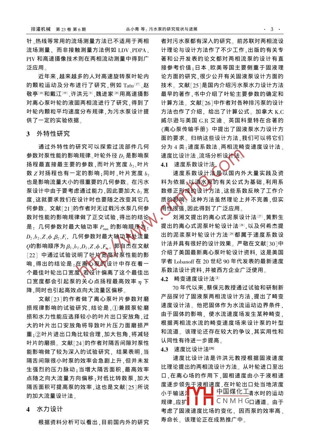 排灌機械第23卷 第6期叢小青等:污水泵的研究現(xiàn)狀與進展污水泵的研究現(xiàn)狀與進展叢小青,袁壽其',袁丹青2,陸偉剛1(1.江蘇大學(xué)流體機械工程技術(shù)中心,江蘇鎮(zhèn)江212013; 2.江蘇大學(xué)能源與動力工程學(xué)院,江蘇鎮(zhèn)江212013)摘要:研究固液兩相流體在離心泵內(nèi)的運動規(guī)律、完善其設(shè)計理論和設(shè)計方法-直是設(shè)計人員十分重視的課題。針對污水泵的研究情況,分別從污水泵理論研究、內(nèi)特性研究、外特性研究、水力設(shè)計等幾個方面對污水泵的研究現(xiàn)狀進行了較為詳細(xì)的闡述,指出加強泵內(nèi)外特性研究,探求流動機理開發(fā)適合水泵設(shè)計的專業(yè)化軟件用于泵產(chǎn)品的計算機集成制造(CIMS),將是泵行業(yè)發(fā)展的重要方向。關(guān)鍵詞:污水泵;兩相流;研究;現(xiàn)狀;進展中圖分類號: TH311文獻標(biāo)識碼: A文章編號: 1005- -6254(2005)06 -001-050理論及設(shè)計原理,即相對堵塞和相對抽吸理論:0引言當(dāng)固體速度小于水流速度時(例如在葉輪進口),污水泵廣泛應(yīng)用于石化、礦山冶金、電力以固相對水流產(chǎn)生相對堵塞效應(yīng);反之產(chǎn)生相對抽及城市排污等污水處理作業(yè)。隨著國民經(jīng)濟的發(fā)吸作用(例如在葉輪出口)。故而提出了兩相流水.展,市場對污水泵的需求量日益增大。由于污水流畸變設(shè)計法并給出了畸變方程和輸運方程[2]。泵工作條件相當(dāng)惡劣,所抽送的介質(zhì)對污水泵工這個理論開創(chuàng)了固液兩相流宏觀研究的新局面。況有很大影響。因此,同清水泵相比,同樣比轉(zhuǎn)速80年代末,許洪元教授提出了固液兩相流速的污水泵效率相對較低,使用壽命較短,這將增度比理論3),即:離心泵中兩相流動屬于分離流加設(shè)備投資。因此,深入研究污水泵內(nèi)部流動機動,在流道的不同部位,固體顆粒的受力不同,固理提高污水泵效率和壽命一直是科研工作者努液兩相間的速度比發(fā)生變化,使兩相流體的濃度力的目標(biāo)。本文分別從污水泵理論研究、內(nèi)特性比隨之變化,由此導(dǎo)出了固液速度比方程,并給研究、外特性研究、水力設(shè)計等幾個方面介紹了出了葉輪幾何參數(shù)的計算公式。污水泵的研究現(xiàn)狀,并對今后的發(fā)展方向作了展2內(nèi)特性 研究2.1泵輪內(nèi)固體顆粒運動規(guī)律的研究1流動理論研究研究泵輪內(nèi)固體顆粒運動規(guī)律對污水泵設(shè)國內(nèi)外對固液兩相流動理論作了很多研究,計有著重要的指導(dǎo)意義。30年前國外就有學(xué)者采但大多為管道內(nèi)的流動,對離心泵內(nèi)的流動研究用高速攝影技術(shù)拍攝泵輪中固體顆粒運動軌跡,較少。在兩相流條件下,因為慣性力不同,固液兩此后這方面的研究時有報道。蘇波隆用高速攝影相各以不同的速度運動。只有根據(jù)兩相流的速度機拍攝了葉輪中顆粒分別為8~10mm的沙礫和場來設(shè)計泵的葉型和流道才能更有效地轉(zhuǎn)換能1~2mm的沙子的運動軌跡結(jié)果表明:顆粒質(zhì)量量并降低磨損。但泵內(nèi)的流態(tài)十分復(fù)雜,即使清越大,其運動軌跡越偏離葉片工作面4。沙利亞分水也無法用純數(shù)學(xué)的方法求解,對于兩相流困難別于1975年和1983年利用高速攝影技術(shù)得到更大。到目前為止,還沒有建立一個公認(rèn)的數(shù)學(xué)了固體顆粒的運動軌跡,1975年作出的結(jié)論是顆方程式[I。粒質(zhì)量越大、其運動軌跡越靠近葉片工作面,與70年代中期,蔡保元教授首先提出了兩相流蘇波隆結(jié)中國煤化工作出的結(jié)論和YHCNMHG基金項目:江蘇省教育廳高新技術(shù)產(chǎn)業(yè)發(fā)展項目(JH03- -033);江蘇省教育廳六大人才資助項目作者簡介:叢小青(1966.6-),女,山東威海人,江蘇大學(xué)在讀博士生副研究員。DRAINAGE AND IRRIGATION MACHINERY Vol.23 No.6蘇波隆的結(jié)論相同15.1。板谷樹用高速攝像機拍攝方法;如果顆粒相只被處理成一相的話,常常又泵輪中顆粒分別為5.19 mm 8.82 mm、12.75 mm被稱為雙流體模型。第二類是把流體當(dāng)作連續(xù)介的玻璃球的運動軌跡,并用Lagrange法進行理論質(zhì),顆粒被視為離散體,在Euler坐標(biāo)系下考察流計算,發(fā)現(xiàn)在該粒徑范圍內(nèi),質(zhì)量對運動軌跡幾體相的運動,在Lagrange坐標(biāo)系下研究顆粒群的乎沒有影響7]。運動,即顆粒群軌道模型。第三類模型是液體擬國內(nèi)自20世紀(jì)80年代后期,清華大學(xué)西顆粒模型,該模型不僅將宏觀離散顆粒當(dāng)成離散安交大、浙江大學(xué)先后開始涉及這-課題研究。相處理,還將連續(xù)的液體也采用擬顆粒性質(zhì)的流朱金曦、趙敬亭在文獻[8]中采用固體兩相流離體微團來處理。心泵用有限元法和差分法分別計算了葉輪S流國內(nèi)對污水泵內(nèi)部流場的研究主要集中在面速度場及葉輪內(nèi)固體顆粒的運動軌跡,得出的顆粒運動規(guī)律的數(shù)值模擬與試驗研究上。彭維明結(jié)論與蘇波隆相同。許洪元等利用高速攝像機,等第一次用Euler-Lagrange模型,結(jié)合雷諾輸運分別采用豆類(d=4 mm .6 mm .8 mm)、玻璃球(d=定律,計算了水渦輪機械中軸對稱的固液兩相4mm.6mm8mm)、鋼球(d=6mm.12mm)、石子流,得出了顆粒從葉輪進口到出口的速度分布,(d=1~2 mm .5~6 mm),對不同的葉片形狀在不同并對顆粒速度的變化原因