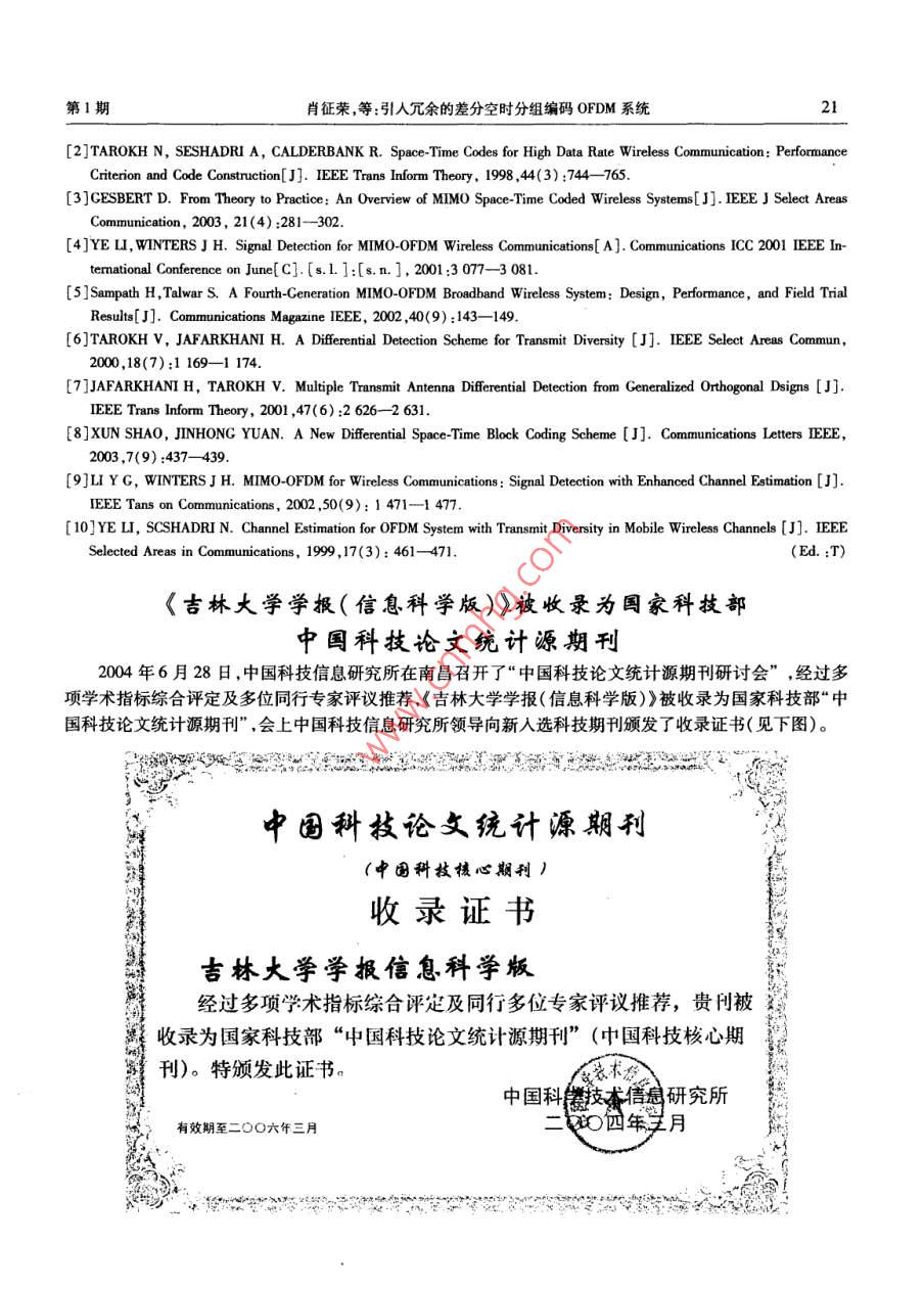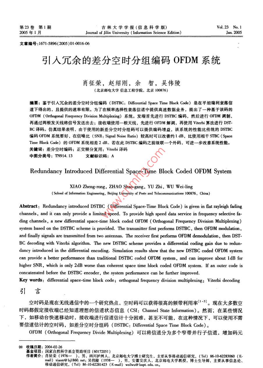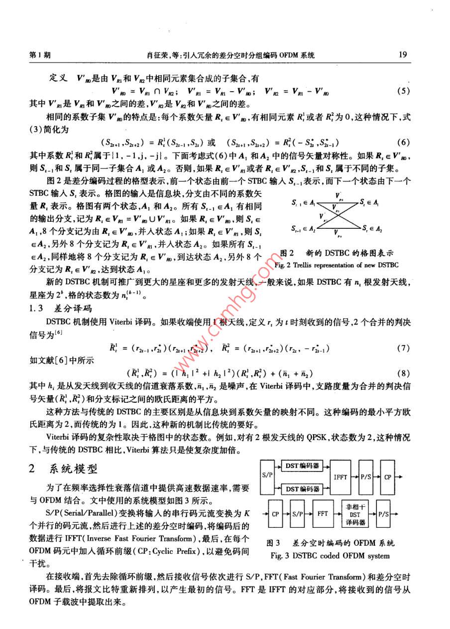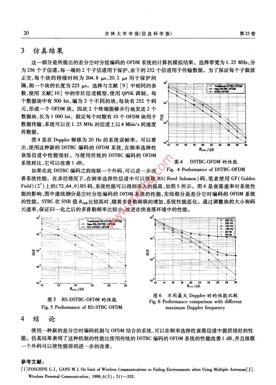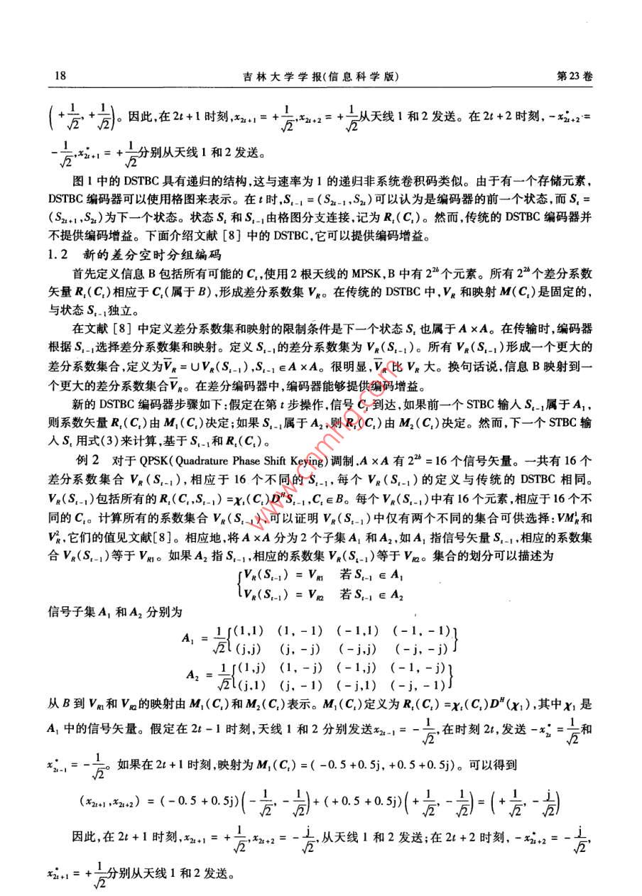 第23卷第1期吉林大學(xué)學(xué)報(bào)(信息科學(xué)版)Vol 23 No. 12005年1月Joumal of Jilin University(Information Science EditioJan.2005文章編號(hào):16715896(2005)010016406引入冗余的差分空時(shí)分組編碼OFDM系統(tǒng)肖征榮,趙紹剛,余智,吳偉陵(北京郵電大學(xué)信息工程學(xué)院,北京100876)摘要:鑒于引人冗余的差分空時(shí)分組編碼( DSTBC: Differential Space Time Block Code)是在平坦瑞利衰落信道下得出的,且提供的速率有限。為了在頻率選擇性衰落信道中提供高速數(shù)據(jù)業(yè)務(wù),提出了一種基于該碼的OFDM( Orthogonal Frequency Division Multiplexing)系統(tǒng)。發(fā)端首先進(jìn)行 DSTBC編碼,然后進(jìn)行OFDM調(diào)制,再通過(guò)兩根發(fā)天線將信號(hào)發(fā)送出去;接收端使用一根天線,先進(jìn)行OFDM解調(diào),再使用 Viterbi算法進(jìn)行DsTBC譯碼。仿真結(jié)果表明,由于使用的新差分空時(shí)分組碼可以提供編碼增益,該系統(tǒng)的性能比傳統(tǒng)的 DSTBC編碼OFDM系統(tǒng)要好,在信噪比(SNR: Signal Noise Ratio)較高時(shí)可以改善約ldB,比使用相干SrBc( SpaceTime Block Code)的OFDM系統(tǒng)相差2dB。若在此 DSTBC編碼之前級(jí)聯(lián)一個(gè)外碼,可進(jìn)一步改善系統(tǒng)性能。關(guān)鍵詞:差分空時(shí)編碼;正交頻分復(fù)用; Viterbi譯碼中圖分類號(hào):T914.13文獻(xiàn)標(biāo)識(shí)碼:ARedundancy Introduced Differential Space-Time Block Coded OFDM SystemXIAO Zheng-rong, ZHAO Shao-gang, YU Zhi, WU Wei-ling( School of Information Engineering, Beijing University of Posts and Telecommunications 100876, China)Abstract: Redundancy introduced DSTBC Differential Space-Time Block Code) is given in nat rayleigh fadichannels, and it can only provide a limited speed. To provide high speed data service in frequency selective fading channels, a new differential space-time block coded OFDM( Orthogonal Frequency Division Multiplexing)system based on the dStBC scheme is provided. The transmitter first performs DSTBC, then OFDM modulationand finally signals are transmitted from two antennas. The receiver first performs OFDM demodulation, then DSTBC decoding with Viterbi algorithm. The new DSTBC scheme provides a differential coding gain due to redundancy introduced in the differential encoding. Simulation results show that the new DSTBC coded OFDM systemcan provide a better performance than traditional dStBC coded OFDM system, and can improve about ldB forhigher SNR, which is only 2dB worse than coherent space time block coded OFDM system. If an outer code isconcatenated before the DSTBC encoder, the system performance can be further improvedKey words: differential space-time block code; orthogonal frequency division multiplexing; Viterbi decoding引言空時(shí)碼是現(xiàn)在無(wú)線通信中的一個(gè)研究熱點(diǎn),空時(shí)碼可以獲得很高的頻帶利用率-3?,F(xiàn)在大多數(shù)空時(shí)碼都假定接收端已經(jīng)知道理想的信道狀態(tài)信息(CSI: Channel State Information)。然而,在某些情況下,如移動(dòng)臺(tái)快速移動(dòng)時(shí),接收端進(jìn)行信道估計(jì)十分困難,甚至不可能,在這種情況下,可以使用不需要信道佔(zhàn)計(jì)的空時(shí)碼,如差分空時(shí)分組碼( DSTBC: Differential Space Time Block Code)oFDM( Orthogonal Frequency Divide Multiplexing)可以將信道分為多個(gè)窄帶并行子信道,增加碼元如收稿日期:20040226基金項(xiàng)目:國(guó)家自然科學(xué)基金資助項(xiàng)目(60172051)作者簡(jiǎn)介:肖征榮(1976—),男,四川瀘州人,北京郵電大學(xué)博士研究生,主要從事移動(dòng)通信(Tel)86-10462283060(E0.ne;吳偉陵(1938—),男,安徽安慶人,北京郵電大學(xué)教授,博士生導(dǎo)師,主要從事信息論、移動(dòng)通信研究,(Tl)86-1062281423(Fmai) weiwu@ bupt. edu. en第I期肖征榮等:引入冗余的差分空時(shí)分組編碼OFDM系統(tǒng)的持續(xù)時(shí)間,以此減少或者消除多徑引起的碼間干擾。在OFDM中使用多根發(fā)射和接收天線,就構(gòu)成了MMO( Multiple Input Multiple Output)信道,將空時(shí)編碼技術(shù)和OFDM結(jié)合,可以改善頻譜效率和提高數(shù)據(jù)的傳輸速率5。在文獻(xiàn)[6,7]中, Tarokh和 Jafarkhoni提出了基于正交設(shè)計(jì)的差分空時(shí)分組碼。在SNR比較高時(shí), DSTBC的性能比相應(yīng)的相干STBC( Space Time Block Code)差3dB。在文獻(xiàn)[8]中提出了一種新的差分空時(shí)分組碼,這種新的差分空時(shí)分組碼在進(jìn)行編碼時(shí)引人了冗余,可提供編碼增益,因此它的性能比傳統(tǒng)的 DSTBC要好。但它是在平坦瑞利衰落信道下得出的,且提供的速率也有限。為了能夠在頻率選擇性衰落信道中提供高速的數(shù)據(jù)業(yè)務(wù),筆者提出了一種基于該碼的OFDM系統(tǒng)。經(jīng)過(guò)仿真表明,這個(gè)系統(tǒng)比使用傳統(tǒng)的 DSTBC編碼的OFDM系統(tǒng)好1dB,與使用相干STBC的OFDM系統(tǒng)相差2dB。1差分空時(shí)分組編碼1.1傳統(tǒng)的差分空時(shí)分組編碼文獻(xiàn)[6]中的差分空時(shí)分組編碼,如圖1所示。如果使用2根發(fā)射天線和MPSK調(diào)制,則C={萬(wàn)}k=0.2.“,M-1(1)其中M=2。發(fā)射機(jī)一開始發(fā)送任意的信號(hào)矢量S=(S1,S2),在經(jīng)過(guò)STBC編碼后,51和s2在時(shí)刻1發(fā)送,一s和s在時(shí)刻2發(fā)送,假定S1=(S21-1,S2)是在t-1時(shí)刻輸入到STBC編碼器的信號(hào)矢量。編碼器產(chǎn)生兩個(gè)輸出信號(hào)矢量(S2-1,S2)和(-S2,S2-1),即D(S1)其中(S2-1,S2)和(-S2,S21)是從天線1和2發(fā)送。D(S11)用來(lái)