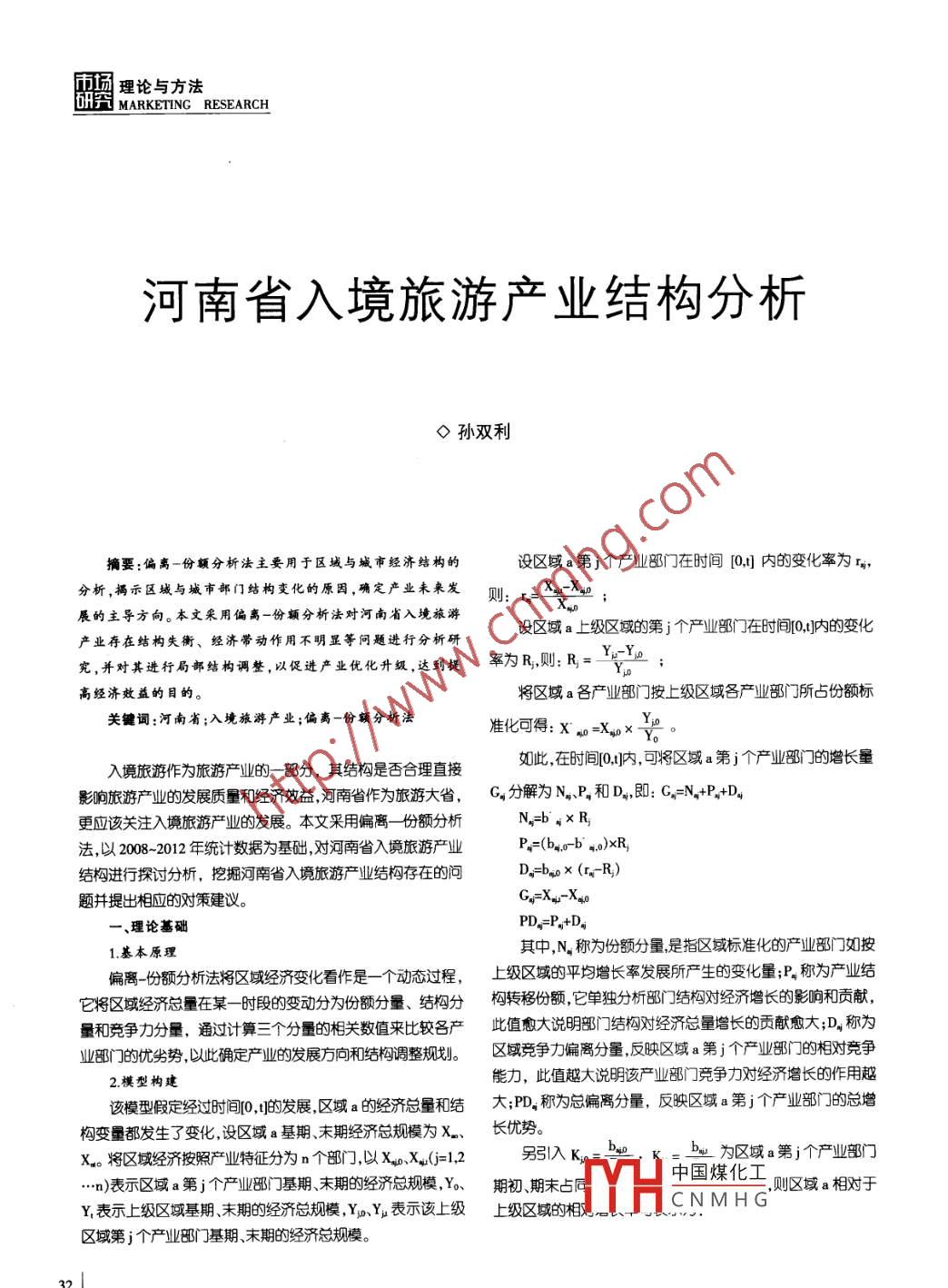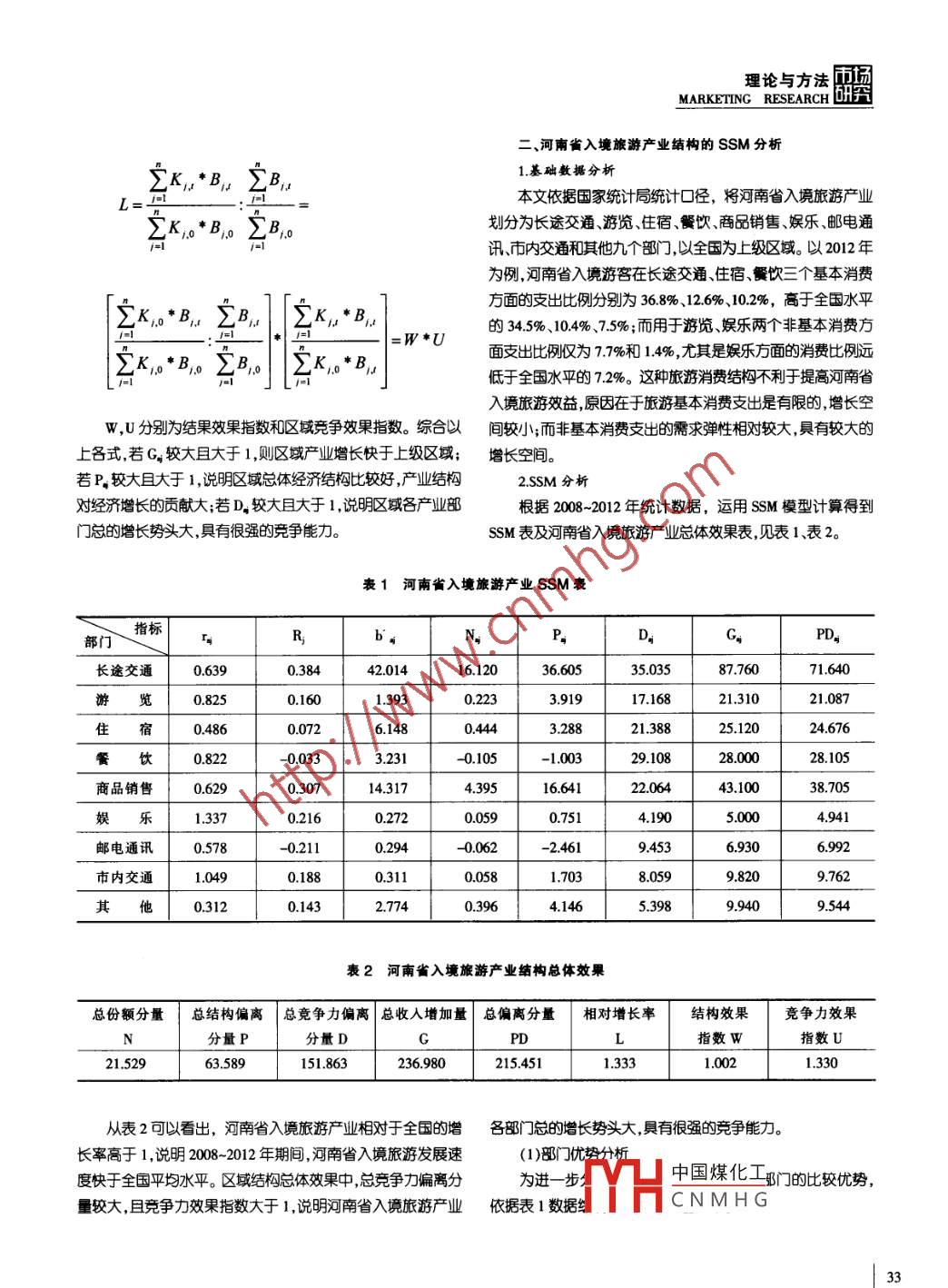 勵(lì)貸理論與方法研究MARKETING RESEARCH河南省入境旅游產(chǎn)業(yè)結(jié)構(gòu)分析<>孫雙利.摘要:偏離-份額分析法主要用于區(qū)域與城市經(jīng)濟(jì)結(jié)構(gòu)的設(shè)區(qū)域a第j個(gè)產(chǎn)業(yè)部門在時(shí)間[0,]內(nèi)的變化率為的,分析,揭示區(qū)城與城市部門結(jié)構(gòu)變化的原因,確定產(chǎn)業(yè)未來發(fā)則, r= xy_-Xxp ;展的主導(dǎo)方向。本文采用偏離-份額分析法對(duì)河南省入境旅游設(shè)區(qū)域a上級(jí)區(qū)域的第j個(gè)產(chǎn)業(yè)部門在時(shí)間[0,]內(nèi)的變化產(chǎn)業(yè)存在結(jié)構(gòu)失衡、經(jīng)濟(jì)帶動(dòng)作用不明顯等問題進(jìn)行分析研究,并對(duì)其進(jìn)行局部結(jié)構(gòu)調(diào)整,以促進(jìn)產(chǎn)業(yè)優(yōu)化升級(jí),達(dá)到提宰為R,則:R= YEYe ;高經(jīng)濟(jì)效益的目的。將區(qū)域a各產(chǎn)業(yè)部門按上級(jí)區(qū)域各產(chǎn)業(yè)部門所占份額標(biāo)關(guān)鍵詞:河南省;入境旅游產(chǎn)業(yè);偏離-份額分析法準(zhǔn)化可得:x no=Xwpx畢入境旅游作為旅游7業(yè)的一部分,其結(jié)構(gòu)是否合理直接如此,在時(shí)間[0,1]內(nèi),可將區(qū)域a第j個(gè)產(chǎn)業(yè)部門門的增長(zhǎng)量影響旅游產(chǎn)業(yè)的發(fā)展質(zhì)量和經(jīng)濟(jì)效益,河南省作為旅游大省,C,分解為N、P和D.,即0: C.=N+P,+tD2更應(yīng)該關(guān)注入境旅游產(chǎn)業(yè)的發(fā)展。本文采用偏離-份額分析N_=b',XR法,以208-202年統(tǒng)計(jì)數(shù)據(jù)為基礎(chǔ),對(duì)河南省入境旅游產(chǎn)業(yè)P=(by,o-b .)xR,結(jié)構(gòu)進(jìn)行探討分析,挖掘河南省入境旅游產(chǎn)業(yè)結(jié)構(gòu)存在的問D._=bsoX (r.-R)題并提出相應(yīng)的對(duì)策建議。Gg=Xy-Xxso-、理論基礎(chǔ)PD,=P+D,其中,N,稱為份額分量,是指區(qū)域標(biāo)準(zhǔn)化的產(chǎn)業(yè)部]如按1.基本原理偏離-份額分析法將區(qū)域經(jīng)濟(jì)變化看作是一-個(gè)動(dòng)態(tài)過程,上級(jí)區(qū)域的平均增長(zhǎng)率發(fā)展所產(chǎn)生的變化量;P稱為產(chǎn)業(yè)結(jié)它將區(qū)域經(jīng)濟(jì)總量在某- -時(shí)段的變動(dòng)分為份額分量、結(jié)構(gòu)分構(gòu)轉(zhuǎn)移份額,它單獨(dú)分析部[門結(jié)構(gòu)對(duì)經(jīng)濟(jì)增長(zhǎng)的影響和貢獻(xiàn),量和競(jìng)爭(zhēng)力分量,通過計(jì)算三個(gè)分量的相關(guān)數(shù)值來比較各產(chǎn)此值愈大說明部門結(jié)構(gòu)對(duì)經(jīng)濟(jì)總量增長(zhǎng)的貢獻(xiàn)愈大;D,稱為業(yè)部門的優(yōu)劣勢(shì),以此確定產(chǎn)業(yè)的發(fā)展方向和結(jié)構(gòu)調(diào)整規(guī)劃。區(qū)域競(jìng)爭(zhēng)力偏離分量,反映區(qū)域a第j個(gè)產(chǎn)業(yè)部門的相對(duì)競(jìng)爭(zhēng)2.模型構(gòu)建能力,此值越大說明該業(yè)部門競(jìng)爭(zhēng)力對(duì)經(jīng)濟(jì)增長(zhǎng)的作用越該模型假定經(jīng)過時(shí)間[0,1]的發(fā)展,區(qū)域a的經(jīng)濟(jì)總量和結(jié)大;PD,稱為總偏離分量,反映區(qū)域a第j個(gè)產(chǎn)業(yè)部門的總增構(gòu)變量都發(fā)生了變化,設(shè)區(qū)域a基期、末期經(jīng)濟(jì)總規(guī)模為X. .長(zhǎng)優(yōu)勢(shì)。X。將區(qū)域經(jīng)濟(jì)按照產(chǎn)業(yè)特征分為n個(gè)部門,以XxpxX(j=1,2另引入K_Dy. Kb業(yè)為區(qū)域a第j個(gè)產(chǎn)業(yè)部門..n)表示區(qū)域a第j個(gè)產(chǎn)業(yè)部[ ]基期、末期的經(jīng)濟(jì)總規(guī)模,Yo、期初、期末占同中國(guó)煤化工,則區(qū)域a相對(duì)于y,表示上級(jí)區(qū)域基期末期的經(jīng)濟(jì)總規(guī)模,YpYμ表示該上級(jí)上級(jí)區(qū)域的相JYHCNMH G'..區(qū)域第j個(gè)產(chǎn)業(yè)部門基期末期的經(jīng)濟(jì)總規(guī)模。32理論與方法雨換MARKETING RESEARCH 研究二、河南省入境旅游產(chǎn)業(yè)結(jié)構(gòu)的SSM分析1.基礎(chǔ)敷據(jù)分析之k,"B。SB,本文依據(jù)國(guó)家統(tǒng)計(jì)局統(tǒng)計(jì)口徑,將河南省入境旅游產(chǎn)業(yè)L:EK,o*B,o ZB,o劃分為長(zhǎng)途交通、游覽、住宿、餐飲、商品銷售、娛樂郵電通訊、市內(nèi)交通和其他九個(gè)部門,以全國(guó)為上級(jí)區(qū)域。以2012年為例,河南省入境游客在長(zhǎng)途交通、住宿、餐飲三個(gè)基本消費(fèi)方面的支出比例分別為36.8%、12.6%、10.2%,高于全國(guó)水平[m*B。的34.5%、10.4% .7.5% ;而用于游覽、娛樂兩個(gè)非基本消費(fèi)方=W*U面支出比例僅為7.7%和1.4% ,尤其是娛樂方面的消費(fèi)比例遠(yuǎn)之K。*B。o EB。SK,*B,低于全國(guó)水平的7.2%。這種旅游消費(fèi)結(jié)構(gòu)不利于提高河南省入境旅游效益,原因在于旅游基本消費(fèi)支出是有限的,增長(zhǎng)空w,U分別為結(jié)果效果指數(shù)和區(qū)域競(jìng)爭(zhēng)效果指數(shù)。綜合以間較小;而非基本消費(fèi)支出的需求彈性相對(duì)較大,具有較大的上各式,若G,較大且大于1,則區(qū)域業(yè)增長(zhǎng)快于上級(jí)區(qū)域;增長(zhǎng)空間。若P,較大且大于1,說明區(qū)域總體經(jīng)濟(jì)結(jié)構(gòu)比較好,產(chǎn)業(yè)結(jié)構(gòu)2.SSM分析對(duì)經(jīng)濟(jì)增長(zhǎng)的貢獻(xiàn)大;若D,較大且大于1,說明區(qū)域各產(chǎn)業(yè)部根據(jù)2008~2012年統(tǒng)計(jì)數(shù)據(jù),運(yùn)用SSM模型計(jì)算得到門