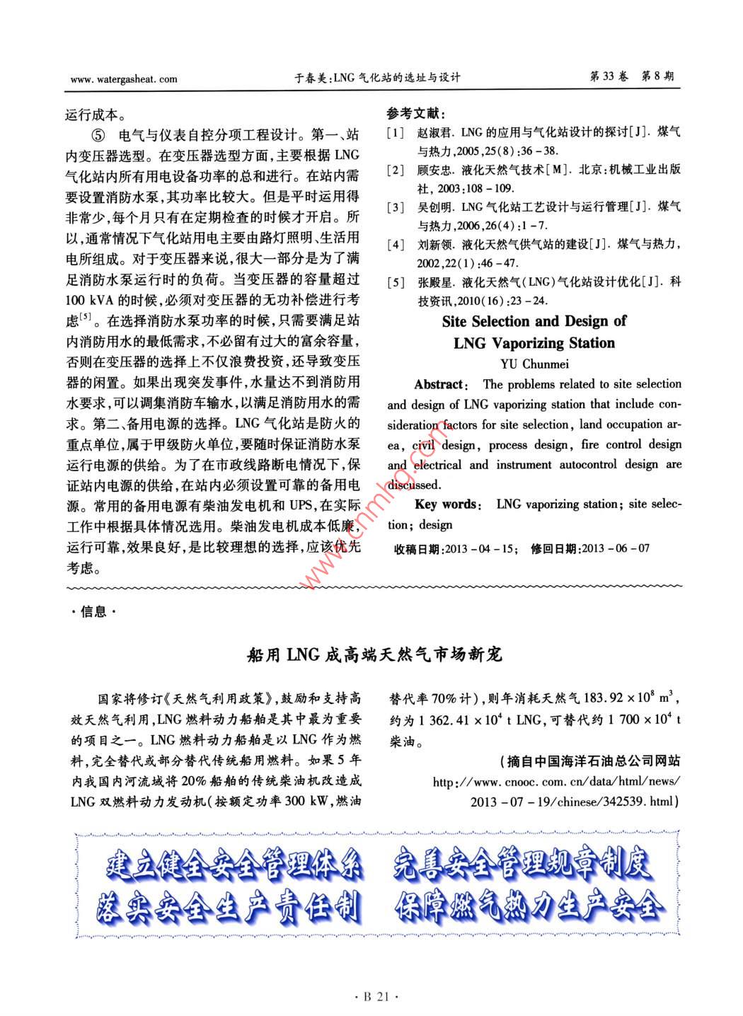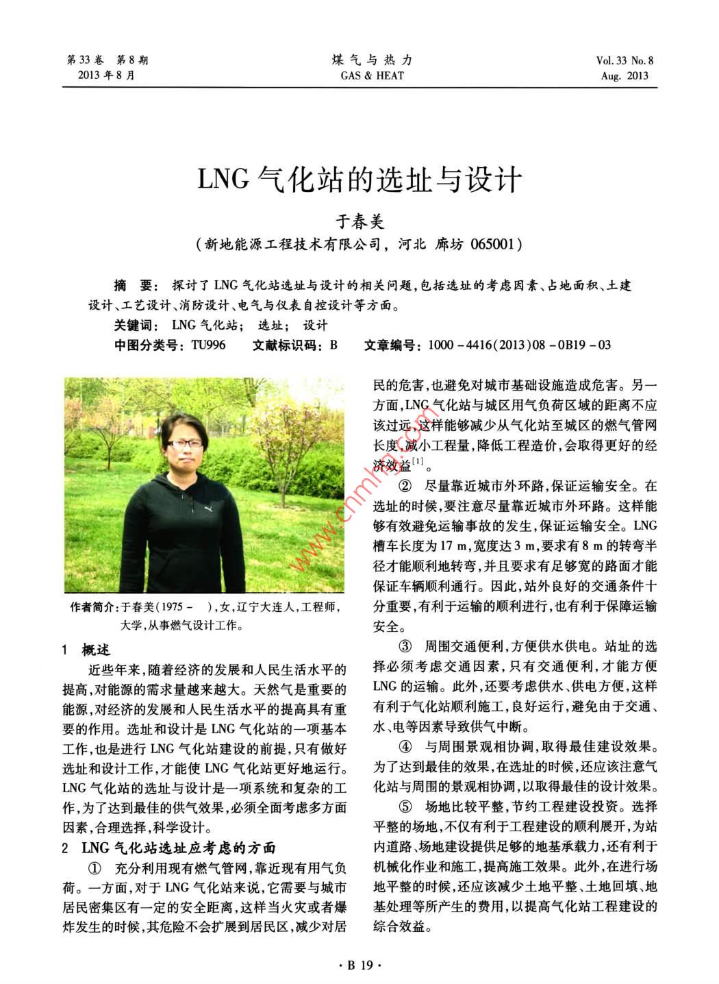 第33卷第8期煤氣與熱力Vol. 33 No.82013年8月GAS & HEATAug.2013LNG氣化站的選址與設(shè)計(jì)于春美(新地能源工程技術(shù)有限公司,河北廊坊065001)摘要:探討了LNG氣化站選址與設(shè)計(jì)的相關(guān)問題,包括選址的考慮因素、占地面積、土建設(shè)計(jì)、工藝設(shè)計(jì)、消防設(shè)計(jì)、電氣與儀表自控設(shè)計(jì)等方面。關(guān)鍵詞: LNG 氣化站;選址; 設(shè)計(jì)中圖分類號(hào): TU996文獻(xiàn)標(biāo)識(shí)碼: B文章編號(hào): 1000 -4416(2013)08 -0B19 -03民的危害,也避免對(duì)城市基礎(chǔ)設(shè)施造成危害。另一方面,LNG氣化站與城區(qū)用氣負(fù)荷區(qū)域的距離不應(yīng)該過遠(yuǎn),這樣能夠減少從氣化站至城區(qū)的燃?xì)夤芫W(wǎng)長度,減小工程量,降低工程造價(jià),會(huì)取得更好的經(jīng)濟(jì)效益”。②盡量靠近城市 外環(huán)路,保證運(yùn)輸安全。在選址的時(shí)候,要注意盡量靠近城市外環(huán)路。這樣能夠有效避免運(yùn)輸事故的發(fā)生,保證運(yùn)輸安全。LNG槽車長度為17 m,寬度達(dá)3 m,要求有8 m的轉(zhuǎn)彎半徑才能順利地轉(zhuǎn)彎,并且要求有足夠?qū)挼穆访娌拍鼙WC車輛順利通行。因此,站外良好的交通條件十作者簡介:于春美(1975- ),女 ,遼寧大連人,工程師,分重要,有利于運(yùn)輸?shù)捻樌M(jìn)行,也有利于保障運(yùn)輸大學(xué),從事燃?xì)庠O(shè)計(jì)工作。安全。1概述③周圍交通便利,方便供水供電。站址的選近些年來,隨著經(jīng)濟(jì)的發(fā)展和人民生活水平的擇必須考慮交通因素,只有交通便利,才能方便提高,對(duì)能源的需求量越來越大。天然氣是重要的LNG的運(yùn)輸。此外,還要考慮供水、供電方便,這樣能源,對(duì)經(jīng)濟(jì)的發(fā)展和人民生活水平的提高具有重有利于氣化站順利施工,良好運(yùn)行,避免由于交通、要的作用。選址和設(shè)計(jì)是LNG氣化站的一項(xiàng)基本水、電等因素導(dǎo)致供氣中斷。工作,也是進(jìn)行LNG氣化站建設(shè)的前提,只有做好④與周圍景觀相協(xié)調(diào),取得最佳建設(shè)效果。選址和設(shè)計(jì)工作,才能使LNG氣化站更好地運(yùn)行。為了達(dá)到最佳的效果,在選址的時(shí)候,還應(yīng)該注意氣LNG氣化站的選址與設(shè)計(jì)是-項(xiàng)系統(tǒng)和復(fù)雜的工化站與周圍的景觀相協(xié)調(diào),以取得最佳的設(shè)計(jì)效果。作,為了達(dá)到最佳的供氣效果,必須全面考慮多方面⑤場地比較平整, 節(jié)約工程建設(shè)投資。選擇因素,合理選擇,科學(xué)設(shè)計(jì)。平整的場地,不僅有利于工程建設(shè)的順利展開,為站2 LNG氣化站選址應(yīng)考慮的方面內(nèi)道路、場地建設(shè)提供足夠的地基承載力,還有利于①充分利用現(xiàn)有燃?xì)夤芫W(wǎng),靠近現(xiàn)有用氣負(fù).機(jī)械化作業(yè)和施工,提高施工效果。此外,在進(jìn)行場荷。一方面,對(duì)于LNG氣化站來說,它需要與城市地平整的時(shí)候,還應(yīng)該減少土地平整、土地回填、地居民密集區(qū)有-定的安全距離,這樣當(dāng)火災(zāi)或者爆基處理等所產(chǎn)生的費(fèi)用,以提高氣化站工程建設(shè)的炸發(fā)生的時(shí)候,其危險(xiǎn)不會(huì)擴(kuò)展到居民區(qū),減少對(duì)居綜合效益。.B19.第33卷第8期煤氣與熱力www. watergasheat. com3 LNG氣化站設(shè)計(jì)應(yīng)考慮的方面水封井后再排至市政雨水管網(wǎng)。①占地面積的選取。 合理確定氣化站占地面③工藝分項(xiàng)工程設(shè)計(jì)。第一、在設(shè)置方形補(bǔ)積是相當(dāng)關(guān)鍵的問題,一般在 選址的時(shí)候,著重需要償器的時(shí)候,需要水平設(shè)置,對(duì)于凸出的拱形部分,考慮以下兩方面的因素。第-、安全防火間距。安由于體積較大,應(yīng)該考慮對(duì)其他管道設(shè)置的影響。全是氣化站最為重要的條件,在LNG氣化站設(shè)計(jì)第二氣化區(qū)工藝管道標(biāo)高設(shè)計(jì)。對(duì)于管道標(biāo)高設(shè)時(shí),常采用的設(shè)計(jì)規(guī)范為:GB 50028- -2006《 城鎮(zhèn)燃計(jì),需要全面考慮工作人員的操作情況,以方便工作氣設(shè)計(jì)規(guī)范》、CB 50016- 2006《建筑設(shè)計(jì)防火規(guī)人員 的操作為原則。在氣化區(qū),管道閥門口徑較大,范》、GB 50183- -2004《石 油天然氣工程設(shè)計(jì)防火規(guī)閥門所處的位置比較高,一般應(yīng)該以閥門手輪頂面范》、美國NFPA- -59A《液化天然氣生產(chǎn)、儲(chǔ)存和裝距離地面1.2~1.4 m比較適宜,太高不利于操作,卸標(biāo)準(zhǔn)》。目前國內(nèi)LNG氣化站設(shè)計(jì)基本執(zhí)行GB太低會(huì)影響管道、相關(guān)設(shè)備、閥門的安裝和維修等。50028-2006<城鎮(zhèn)燃?xì)庠O(shè)計(jì)規(guī)范》,實(shí)踐證明安全④消防分項(xiàng)工程設(shè)計(jì)。 第一、總平面布置設(shè)可行2]。第二、考慮將來功能拓展用地。設(shè)計(jì)時(shí),計(jì)。按照消防管道布置方式不同, LNG氣化站內(nèi)消應(yīng)該綜合考慮氣化站所在地的經(jīng)濟(jì)發(fā)展情況,區(qū)域防 管網(wǎng)布置可以分為單純環(huán)狀管網(wǎng)布置和環(huán)狀管網(wǎng)不同,社會(huì)經(jīng)濟(jì)發(fā)展情況不同,對(duì)天然氣的需求也不與噴淋供水管 獨(dú)立布置兩種形式。前者工程量小,同。對(duì)于氣化站來說,除了提供