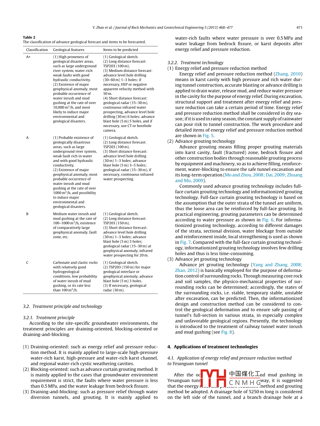 Journal of Rock Mechanics and Geotechnical Engineering 5 (2013) 468- 477Journal of Rock Mechanics and Geotechnical EngineeringRockMechanJournal of Rock Mechanics and Geotechnical。歲然。Engineering20CSRMEjournal homepage: www.rockgeotech.orgPrevention and treatment technologies of railway tunnel water inrush and mudgushing in ChinaYong Zhaoa,*, Pengfei Lib, Siming Tianaa Project Design and Approval Center of Ministry of Railways, Beijing 100844, Chinab College of Architecture and Civil Engineering, Beiing University of Technology, Beijing 100022, ChinaARTICLEINFOABSTRACTArticle history:Water inrush and mud gushing are one of the biggest hazards in tunnel construction. Unfavorable geo-logical sections can be observed in almost all railway tunnels under construction or to be constructed,Recevea n oecemper 0ine 2013and vary in extent. Furthermore, due to the different heights of mountains and the lengths of tunnels, theAccepted 24 July 2013locations of the unfavorable geological sections cannot be fully determined before construction, whichincreases the risk of water inrush and mud gushing. Based on numerous cases of water inrush and mudKeywords:gushing in railway tunnels, the paper tries to classify water inrush and mud gushing in railway tunnelsTunnel engineeringin view of the conditions of the surrounding rocks and meteorological factors associated with tunnelUnfavorable geological regionsWater inrush and mud gushingmechanisms are summarized, and site - specific treatment method is put forward. The treatment methodsPressure relief technologyAdvance grouting technologyinclude choosing a method of advance geological forecast according to risk degrees of different sec-Advance jet groutingtions in the tunnel, determining the items of predictions, and choosing the appropriate methods, i.e.draining-oriented method, blocking oriented method or draining- and-blocking method. The treatmenttechnologies of railway water inrush and mud gushing are also summarized, including energy relief andpressure relief technology. advance grouting technology. and advance jet grouting technology associatedwith their key technical features and applicable conditions. The resuits in terms of treatment methodscan provide reference to the prevention and treatment of tunnel water inrush and mud gushing.⑥2013 Institute of Rock and Soil Mechanics, Chinese Academy of Sciences. Production and hosting byElsevier B.V. All rights reserved.1. Introductionrium of surrounding rocks undergo drastic changes due to theexcavation of underground projects, which causes instant releaseUp to now, nearly ten thousand kilometers of railway tunnelsof the energy stored in underground water carrying mud and sandhave been built under a variety of complex geological conditions inthat gush to the tunnel face at a high speed (Lin and Song, 2012).China. In tuInnel construction, water inrush and mud gushing aren recentyears, morethan0 casesof watersh andthe challenging isues. They are characterized by the largest geolog-mud gushing have been observed in China, causing serious lossesical hazards and the potential risks (see Fig. 1). In this paper, waterof human life and economics and deterioration of constructioninrush and mud gushing in underground projects basically referto the dynamic destruction of structure in unfavorable geologicalunderground construction are involved. For drainage in large quan-sections. The hydrodynamic system and the dynamic equilib-tity over a long period of time is costly, the ecological environmentscan seriously be undermined, leading to the depletion of waterresources, death of vegetation and destruction of farmlands.Water inrush seriously threatens construction when the tunnel* Corresponding author. Tel: +86 13601 107599.goes through water-rich area, which frequently occurs in unfa-E-mail address: jdzxzhaoyong@sina.com (Y. Zhao).vorable geological sections. For examples, serious water inrushPeer review under responsibility of Instute of Rock and Soil Mechanics, Chineseand mud gushing occurred in the Yuanliang mountain tunnel ofAcademy ofSciences.Chongqing-Huaihua Railway. The peak duration of the water inrushlasted for roughly 051 with watar discharoa nf雷nr 1x 105 m:themud in the tunnel_value of mud wasESEVERI Production and hosting by EIsevierapproximately 1.5MHc N M H Gfwater irush andmud gushing of t1674-7755◎2013 Institute of Rock and Soil Mechanics, Chinese Academy oftain tunnel, accounting for economic losses over RMB 20 million.Sciences. Production and hosting by Elsevier B.V. All rights reserved.http://dx.doi.og/10.1016/jj.imge.2013.07.009In the Malujing tunnel of Yichang-Wanzhou Railway, water inrushY. Zhao et al. /Jourmal of Rock Mechanics and Geotechnical Engineering 5 (2013) 468- 477469Water inush andTable 1Types of water inrush and mud gushing.Landslide or largeClassification criteriaType9%" deformation45(1)Water inrush and mud gushingThe location of water inrush and mud at tunnel facegushing(2)Water inrush and mud gushing■Rockburstat tunnel vault(3) Water inrush and mud gushingat tunnel floor■Others(4)Water inrush and mud gushingat tunnel sidewallsFig. 1. Types of geological disasters in tunnels excavated by dill-and- blast method(1) Sudden burst of water inrushand their percentages.and mud gushing(2) Delayed water inrush and mudand mud gushing occurred in the“DK255 + 978" karst tunnels on(3) Sluggish water inrush and mud21 January 2006, with the value of water inrush of approximately7.2 x 105 m3 and the mud of about 7.0 x 104 m3. The water inrush(1) Super large scale water inrushand mud gushing flooded the 3152 m parallel heading and 2508 mThe quantity of water inrush and mud(2) Large- scale water inrush andmain tunnel in vicinity of exit, and caused the damages of a largenumber of equipment and machinery with economic losses over(3) Medium scale water inrush andRMB 10 million. After that, the treatments of this accident tookmud gushingfor 3 years. In the Yesanguan tunnel of Yichang-Wanz