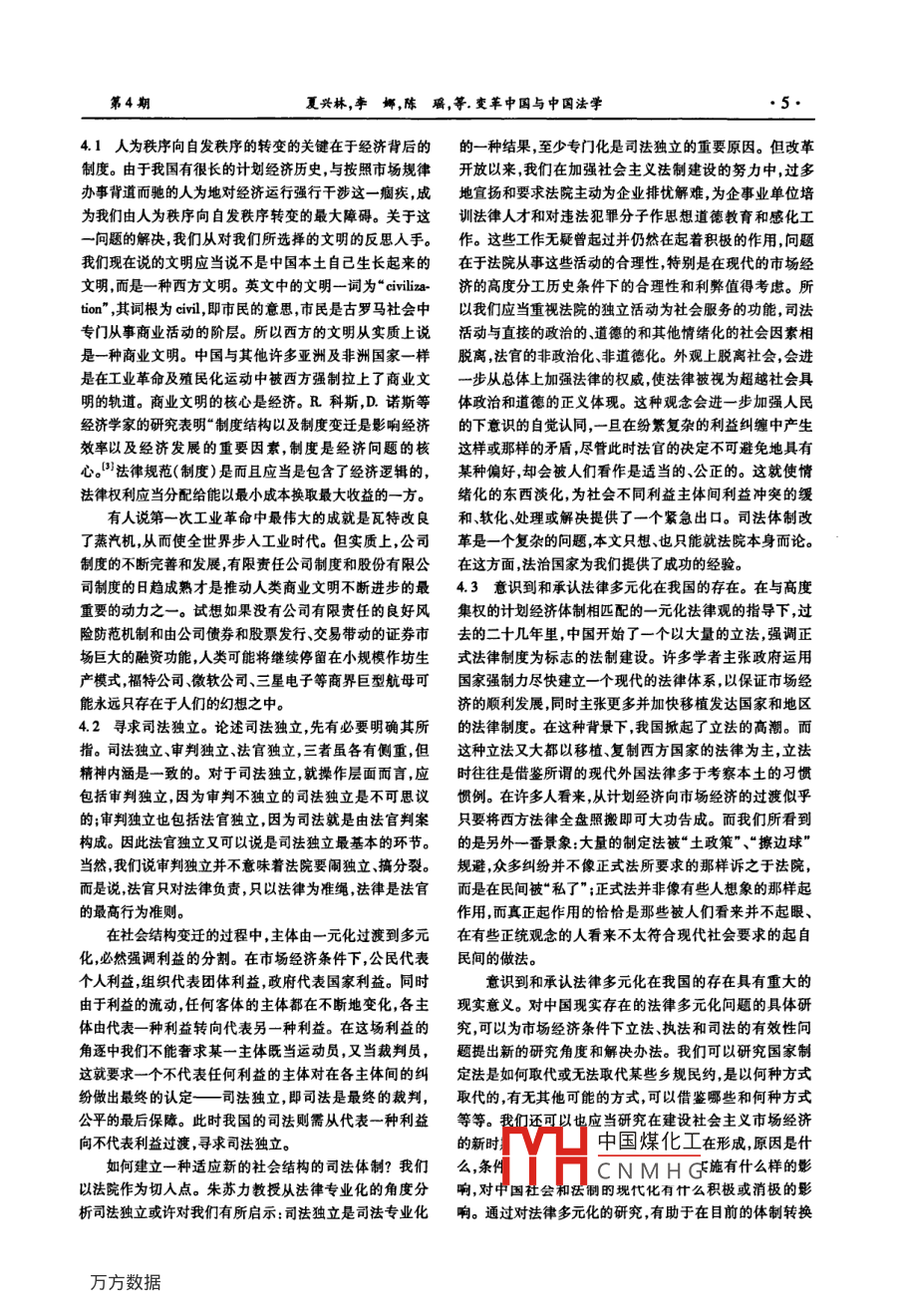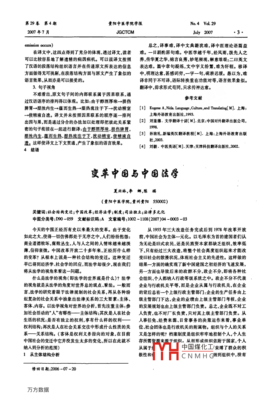 第29卷第4期貴陽(yáng)中醫(yī)學(xué)院學(xué)報(bào)No 4 VoL 292007年7月JGCTCMJuly 20073emission occurs)總之,譯事難,譯中文典籍猶難,譯中醫(yī)理論語(yǔ)篇益在譯文中,這四點(diǎn)得到了充分的體現(xiàn)透過(guò)譯文讀者難。一日斟酌原句難。中醫(yī)學(xué)越千年,經(jīng)風(fēng)雨汲先人之可以比較容易地了解遺精的病因病機(jī)。可以說(shuō)譯文按照養(yǎng)傳華夏之華錦言良莠妙筆頻現(xiàn)解意維艱;二日英文了漢語(yǔ)的段落結(jié)構(gòu)組織語(yǔ)言并在傳遞原文所表達(dá)的信息表達(dá)難。篇中章句凝練,文中字義紛繁難為軒輊。移譯方面做得無(wú)可挑剔在段落結(jié)構(gòu)方面與原文產(chǎn)生了象似的中明理達(dá)意甚感詞窮,一字一句硯耕遲緩。愚以為難語(yǔ)言效果,從而亦是可以接受的。譯非同于不可譯,語(yǔ)際轉(zhuǎn)換重在功能對(duì)等,語(yǔ)言效果象似。3.句子視角翻譯中,毋求形式茍同,只求傳神達(dá)意不難看出原文句子間的內(nèi)部聯(lián)系屬于因果聯(lián)系,通過(guò)漢語(yǔ)語(yǔ)序的排列得以體現(xiàn)。比如:由于醇酒厚味→損傷參考文獻(xiàn)脾胃→濕濁內(nèi)生→蘊(yùn)而生熱→濕熱流注于下→擾動(dòng)精室[1] Eugene A, Nida. Languag, Culture, and Translating[ M]上海使精液自遺。譯文并未按照因果聯(lián)系的順序逐一排列上海外語(yǔ)教育出版社,1993出因與果而是通過(guò)分合的辦法加以處理即把彼此關(guān)系緊2]劉重德,文學(xué)翻譯十講[M]北京中國(guó)對(duì)外翻譯出版公司,密的句子銜接在一起進(jìn)行翻譯:由于醇酒厚味損傷脾胃濕濁內(nèi)生蘊(yùn)而生熱濕熱流注于下擾動(dòng)精室使精液自[3]孫致禮新編英漢翻譯教程[M].上海:上海外語(yǔ)教育出版遺。這樣使譯文上下文貫通,產(chǎn)生了象似的語(yǔ)言效果。社,2003[4]劉毅,中醫(yī)英語(yǔ)[M]天津:天津科技翻譯出版社,200.4結(jié)語(yǔ)變革中因與中國(guó)法學(xué)夏興林,李娜陳瑤(貴陽(yáng)中醫(yī)學(xué)院,責(zé)州貴陽(yáng)55000)關(guān)鍵詞:杜社會(huì)結(jié)構(gòu)變遷;中國(guó)改革;經(jīng)濟(jì)法學(xué);制度;司法獨(dú)立;法律多元化中圖分類號(hào):D0-059文獻(xiàn)標(biāo)識(shí)碼:A文章編號(hào):1002-1108(2007)04-0003-03今天的中國(guó)正經(jīng)歷有史以來(lái)最大的變革。由于變化從1955年三大改造任務(wù)完成后到1978年改革開(kāi)放如此之大使得一切仿佛都處于無(wú)序之中,人們紛紛抱怨:前,中國(guó)社會(huì)為主體一元化。以毛澤東為首的建國(guó)者們認(rèn)商業(yè)道德敗壞腐敗叢生,人與人之間的人情味越來(lái)越淡為無(wú)論是舊式農(nóng)民還是民族資本家都缺乏組織,效率低薄,信仰衰微。中國(guó)改革開(kāi)放二十多年來(lái),正經(jīng)歷什么樣下,只有經(jīng)過(guò)三大改造將整個(gè)社會(huì)高度組織起來(lái)才能改的變革?從根本上說(shuō)是一種社會(huì)結(jié)構(gòu)的變遷。這種變遷變舊社會(huì)的散漫狀況體現(xiàn)社會(huì)主義的先進(jìn)性。這樣做的早已得到經(jīng)濟(jì)學(xué)社會(huì)學(xué)的回應(yīng),而法學(xué)卻很少,現(xiàn)在我們結(jié)果一方面的確實(shí)現(xiàn)了新中國(guó)建國(guó)之初經(jīng)濟(jì)的飛速發(fā)展將從法學(xué)的視角來(lái)看這一問(wèn)題。另一方面也導(dǎo)致后來(lái)的政群不分,政企不分,即將各種社什么是法學(xué)的視角(即法學(xué)的世界觀是什么)?法學(xué)會(huì)組織、個(gè)人都納入行政等級(jí)系統(tǒng)之中。政企不分不代表的視角就是從法學(xué)的角度對(duì)世界總的觀點(diǎn)看法。一般而企業(yè)與行政機(jī)關(guān)平等,而是企業(yè)從屬與行政機(jī)關(guān)在企業(yè)言法學(xué)的研究著眼于法律規(guī)制的社會(huì)關(guān)系,再?gòu)母鞣N紛的背后總有一個(gè)上級(jí)行政主管部門:企業(yè)的生產(chǎn)任務(wù)由上紜復(fù)雜的社會(huì)關(guān)系中抽象出法律關(guān)系的三大要素:主體、級(jí)主管部門下達(dá),企業(yè)的業(yè)績(jī)由上級(jí)主管部門考核企業(yè)客體、內(nèi)容。以法學(xué)視角對(duì)世界的分析首先注重主體:參的發(fā)展規(guī)劃也由上級(jí)主管部門負(fù)責(zé)??傊?企業(yè)既不對(duì)工加社會(huì)活動(dòng)的“人”有哪些—主體結(jié)構(gòu);其次是人在社會(huì)人負(fù)責(zé),也不對(duì)廠長(zhǎng)負(fù)責(zé),只對(duì)其上級(jí)主管部門負(fù)責(zé)。從生活的狀況是否有獨(dú)立的權(quán)利,享有什么樣的權(quán)利人事任免、經(jīng)費(fèi)來(lái)源、日常事務(wù)的決策運(yùn)作來(lái)看,事業(yè)單權(quán)利結(jié)構(gòu);再次是人在社會(huì)關(guān)系交往中形成什么性質(zhì)的關(guān)位社會(huì)團(tuán)體也是行政機(jī)關(guān)的附屬物。組織與個(gè)人的關(guān)系系——關(guān)系結(jié)構(gòu)。(客體是權(quán)利義務(wù)指向的對(duì)象,在目前又是怎樣的呢?檔案制度是組織牢牢地控制個(gè)人,個(gè)人生中國(guó)社會(huì)的變遷中它并沒(méi)發(fā)生太多的變化所以在此就不存所需資源來(lái)源干組織。從而形成組織依附于國(guó)家個(gè)人納入到分析的范圍)從屬中國(guó)煤化工:束縛了群眾的積1從主體結(jié)構(gòu)分析極性和CNMHG納到組織中沒(méi)有修回日期貴陽(yáng)中醫(yī)學(xué)
