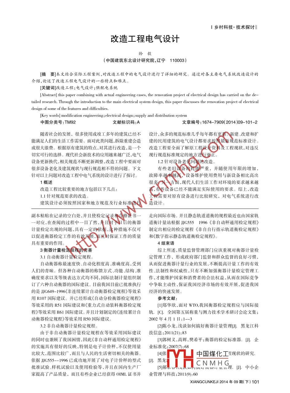 鄉(xiāng)村科技·技術(shù)探討‖改造工程電氣設計中國建筑東北設計研究院,遼寧110003)[摘要]本文結(jié)合實際工程案例,對改造工程中的電氣設計進行了詳細的研究。通過對各主要電氣系統(tǒng)改造設計的介紹,論述了改造工程電氣設計的一些特點和難點[關(guān)鍵詞]改造工程;電氣設計;供配電系統(tǒng)Abstract] this paper combining with actual engineering cases, the renovation project of electrical design has carried on the de-tailed research. Through the introduction to the main electrical system design, this paper discusses the renovation project of electricallesign of some of the features and difficulties.[Key words] modification engineering; electrical design; supply and distribution system中圖分類號:TM92文獻標識碼:A文章編號:1674-7909(2014)09-101-2隨著社會的發(fā)展,很多使用或竣工多年的建筑已經(jīng)不設計,眾多的規(guī)范標準幾乎每年都有更新。新建、改建和擴能滿足人們的生活工作需要。面對此類問題,拆除重建會造建的民用建筑的電氣設計都要求按照最新規(guī)范標準設計。成很大浪費。根據(jù)原有建筑的特點,對其進行改造,是一個改造工程要全面了解原工程設計資料及工程現(xiàn)狀,對違反切實可行的選擇?,F(xiàn)代社會新技術(shù)的應用越來越廣泛,電氣現(xiàn)行規(guī)范標準規(guī)定的地方進行更正。設備更新?lián)Q代,相關(guān)規(guī)范不斷更新調(diào)整,改造工程中要面對12針對設備老化問題的改造很多設備老化及建筑現(xiàn)狀與現(xiàn)行規(guī)范相不符的問題。下文有些老舊設備的耗能嚴重,并隨使用年限的增加,針對以上問題對改造工程中電氣系統(tǒng)的設計進行了探討。故障率越來越高,設備維護使用費用與新設備相比高出1概述很多。另一方面,現(xiàn)代人們生活工作對環(huán)境的要求越來越改造工程比較重要的地方包括以下幾點高,有些設備已經(jīng)不能滿足實際使用的要求。綜上,改造1.1針對規(guī)范要求的改造工程需要對原有設備進行比較研究,對電氣系統(tǒng)進行改建筑設計必須按照國家和地方規(guī)范及行業(yè)標準進行造設計。副本粘貼在記錄的空白處,并且使檢定記錄和合格證走向國際市場。并且靜態(tài)軌道道衡的規(guī)程最近也由國家軌對應,在査閱的過程中一目了然,并且對于日后的衡器道衡計量站根據(jù)J65551996《非自動秤通用檢定規(guī)程》計量檢定岀現(xiàn)的問題,具有一定的依據(jù),這種措施不僅可制定出相應的檢定規(guī)程《非自自行指示軌道衡檢定規(guī)程》以促進衡器檢定工作的有效開展,而且對保證工作的質(zhì)量和《數(shù)字指示靜態(tài)軌道衡檢定規(guī)程》具有重要的作用。4結(jié)束語3衡器計量檢定規(guī)程的完善綜上所述,質(zhì)量監(jiān)督管理部門應該重視對衡器計量檢3.1自動衡器計量檢定規(guī)程定管理工作,形成政府部門監(jiān)督和群眾監(jiān)督的良好習慣自動衡器稱最速度快、自動化程度高、準確度高,受到從而促進衡器計量行業(yè)的發(fā)展,不斷提高計量工作的有效們的青昧。但各種自動衡器的稱饋方式、功能、結(jié)構(gòu)、準性、法制性和權(quán)威性,只有不斷加強衡器計量檢定管理工確度要求以及等級表達方式均不同,國際法制計量組織制作,才能維護國家和消費者的合法杈益,從而在國際競爭訂了六種自動衡器的國際建議。目前我國目前已批準執(zhí)行中爭取主動性,保證我國經(jīng)濟市場的有效開展,促進我國的是JC649-1996《非連續(xù)累計自動衡器檢定規(guī)程》等效采經(jīng)濟的快速發(fā)展用R107國際建議。并已經(jīng)形成《自動分檢衡器檢定規(guī)程》參考文獻等效采用的R51國際建議和《重力式自動裝料衡器檢定規(guī)]鄭華欣,面對wTO我國衡器檢定規(guī)程應與國際接程》等效采用R61國際建議。并且計劃制定的《連續(xù)累軌.[C]全國第五屆稱重與測力技術(shù)學術(shù)研討會論文集動衡器檢定規(guī)程》等效采用R50國際建議。2002年4月1日:1-33.2非自動衡器計量檢定規(guī)程2陳小龍,淺談如何搞好衡器計量管理J黑龍江科由于非自動衡器計量檢定規(guī)程在等效采用國際建議技信息;2011(21)的同時也兼顧了我國困情,因此《非自動秤通用檢定規(guī)程》3郭樹義,高輝,樊希平;衡器的檢定標準器..企實施具有很好的反映,特別是電子計價秤,不僅使用量業(yè)標準化;2007(7):68較大,范圍比較廣,而且與人民的生活密切相關(guān)的衡器[4]張H中國煤化工現(xiàn)狀的研究依據(jù)J555-1996已成功地開展了對電子計價秤的型式[J.黑龍CNMHG批準試驗、樣機試驗以及使用檢驗等,并且在國內(nèi)生產(chǎn)廠5]郝輛為mH里理.中小企家提高了產(chǎn)品質(zhì)量,而且有些企業(yè)已經(jīng)獲得OIML證書并業(yè)管理與科技;2011(9):60XIANGCUNKEJ2014年09期(下)10鄉(xiāng)村13針對業(yè)主要求的改造。租戶用電由干線接至層配電間后,各租戶在配電間內(nèi)因原有建筑功能與業(yè)主的要求一般都會差別較大,要設置電能計量表,待租戶確認后,電纜沿層電纜橋架由計與業(yè)主進行必要的溝通,確定改造方案,在滿足規(guī)范標準量箱引至租戶區(qū)域。原空調(diào)主機已運行十年以上,一臺已〔造設計不能使用,另外兩臺也時有故障。本次改造更換一臺空調(diào)工程案例介紹主機,其余維修,總用電量沒有太大改變。其余各設備機房本