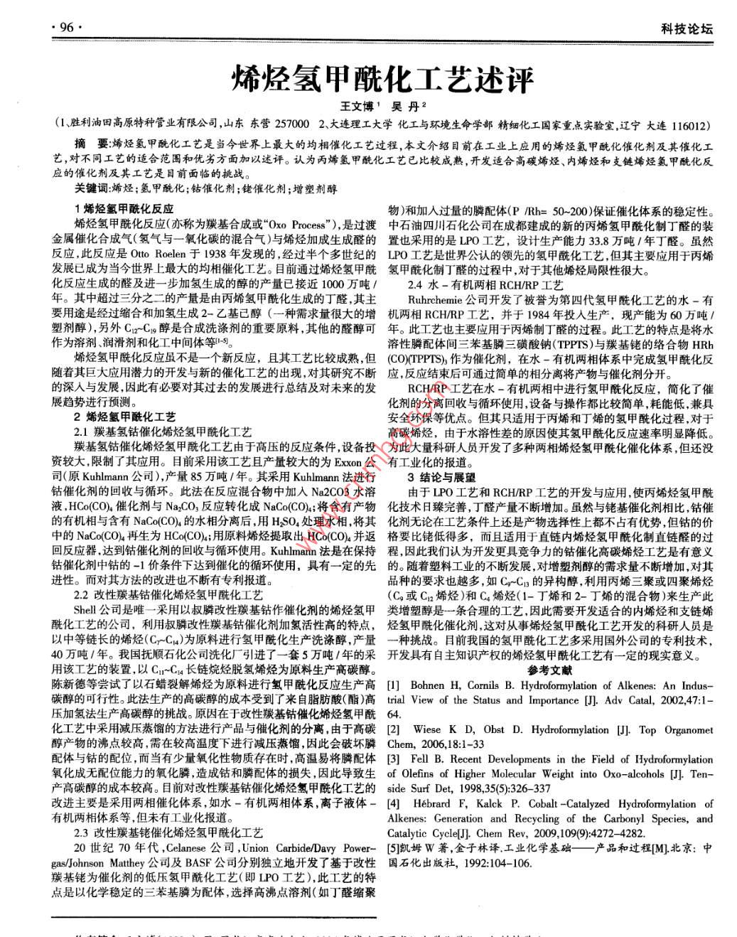 ●96●科技論壇烯烴氫甲?;に囀鲈u(píng)王文博’吳丹2(1、勝利油田高原特種管業(yè)有限公司,山東東營(yíng)257000 2、大連理工大學(xué) 化工與環(huán)境生命學(xué)部精細(xì)化工國(guó)家重點(diǎn)實(shí)驗(yàn)室,遼寧大連116012)摘要:烯烴氫甲?;に囀?當(dāng)今世界上最大的均相催化工藝過(guò)程,本文介紹目前在工業(yè)上應(yīng)用的烯烴氨甲?;呋瘎┘捌浯呋?藝,對(duì)不同工藝的適合范圍和優(yōu)劣方面加以述評(píng)。認(rèn)為丙烯氫甲酰化工藝已比較成熟,開(kāi)發(fā)適合高碳烯烴、內(nèi)烯烴和支鏈烯烴氫甲?;磻?yīng)的催化劑及其工藝是目前面臨的挑戰(zhàn)。關(guān)鍵詞:烯烴;氫甲酰化;鈷催化劑;銠催化劑;增塑劑醇1烯烴氫甲酰化反應(yīng)物)和加入過(guò)量的膦配體(P /Rh= 50-200)保證催化體系的穩(wěn)定性。烯烴氫甲?;磻?yīng)(亦稱為羰基合成或“Oxo Process" ),是過(guò)渡中石 油四川石化公司在成都建成的新的丙烯氫甲?;贫∪┑难b金屬催化合成氣(氫氣與一氧化碳的混合氣)與烯烴加成生成醛的置也采用的是 LPO工藝,設(shè)計(jì)生產(chǎn)能力33.8萬(wàn)噸1年丁醛。雖然反應(yīng),此反應(yīng)是Otto Roelen 于1938 年發(fā)現(xiàn)的,經(jīng)過(guò)半個(gè)多世紀(jì)的LPO 工藝是世界公認(rèn)的領(lǐng)先的氫甲酰化工藝,但其主要應(yīng)用于丙烯發(fā)展已成為當(dāng)今世界上最大的均相催化工藝。目前通過(guò)烯烴氫甲酰氫甲?;芓醛的過(guò)程中,對(duì)于其他烯烴局限性很大?;磻?yīng)生成的醛及進(jìn)-步加氫生成的醇的產(chǎn)量已接近1000萬(wàn)噸12.4水-有機(jī)兩相RCHRP工藝年。其中超過(guò)三分之二的產(chǎn)量是由丙烯氫甲?;傻亩∪?其主Ruhrchemie 公司開(kāi)發(fā)了被譽(yù)為第四代氫甲?;に嚨乃?有要用途是經(jīng)過(guò)縮合和加氫生成2-乙基己醇(一種需求量很大的增機(jī)兩相 RCH/RP工藝,并于1984年投入生產(chǎn),現(xiàn)產(chǎn)能為60萬(wàn)噸I塑劑醇),另外CIr-Cy醇是合成洗滌劑的重要原料,其他的醛醇可年。 此工藝也主要應(yīng)用于丙烯制丁醛的過(guò)程。此工藝的特點(diǎn)是將水作為溶劑、潤(rùn)滑劑和化工中間體等19。溶性膦配體間三苯基膦三磺酸鈉(TPPTS)與羰基銠的絡(luò)合物HRh烯烴氫甲?;磻?yīng)雖不是一一個(gè)新反應(yīng),且其工藝比較成熟,但(CO)CIPPTS) 作為催化劑,在水-有機(jī)兩相體系中完成氫甲?;措S著其巨大應(yīng)用潛力的開(kāi)發(fā)與新的催化工藝的出現(xiàn),對(duì)其研究不斷應(yīng),反應(yīng)結(jié)束后可通過(guò)簡(jiǎn)單的相分離將產(chǎn)物與催化劑分開(kāi)。的深人與發(fā)展,因此有必要對(duì)其過(guò)去的發(fā)展進(jìn)行總結(jié)及對(duì)未來(lái)的發(fā)RCH/RP工藝在水-有機(jī)兩相中進(jìn)行氫甲?;磻?yīng),簡(jiǎn)化了催展趨勢(shì)進(jìn)行預(yù)測(cè)。化劑的分離回收與循環(huán)使用,設(shè)備與操作都比較簡(jiǎn)單,耗能低,兼具2烯烴氫甲?;に嚢踩h(huán)保等優(yōu)點(diǎn)。但其只適用于丙烯和丁烯的氫甲酰化過(guò)程,對(duì)于2.1羰基氫鈷催化烯烴氫甲?;に嚫咛枷N,由于水溶性差的原因使其氫甲?;磻?yīng)速率明顯降低。羰基氫鈷催化烯烴氫甲?;に囉捎诟邏旱姆磻?yīng)條件,設(shè)備投為此大量科研人員開(kāi)發(fā) 了多種兩相烯烴氫甲?;呋w系,但還沒(méi)資較大,限制了其應(yīng)用。目前采用該工藝且產(chǎn)量較大的為Exxon公有工業(yè)化的報(bào)道。司(原Kuhlmann公司),產(chǎn)量85萬(wàn)噸/年。其采用Kuhlmann法進(jìn)行3結(jié)論與展望鈷催化劑的回收與循環(huán)。此法在反應(yīng)混合物中加人Na2CO3水溶由于LPO工藝和RCH/RP工藝的開(kāi)發(fā)與應(yīng)用,使丙烯烴氫甲酰液,HCo(CO)。催化劑與Na,CO,反應(yīng)轉(zhuǎn)化成NaC(C0);將含有產(chǎn)物化技術(shù)日臻完善 ,丁醛產(chǎn)量不斷增加。雖然與銠基催化劑相比,鈷催的有機(jī)相與含有NaCoCO),的水相分離后,用HSO.處理水相,將其化劑無(wú)論在 工藝條件上還是產(chǎn)物選擇性上都不占有優(yōu)勢(shì),但鈷的價(jià)中的NaCo(CO)4再生為HCo(CO)a;用原料烯烴提取出HCo(CO),并返格要 比銠低得多,而且適用于直鏈內(nèi)烯烴氫甲?;浦辨溔┑倪^(guò)回反應(yīng)器,達(dá)到鈷催化劑的回收與循環(huán)使用。Kuhlmann 法是在保持程,因此我們認(rèn)為開(kāi)發(fā)更具競(jìng)爭(zhēng)力的鈷催化高碳烯烴工藝是有意義鈷催化劑中鈷的-1價(jià)條件下達(dá)到催化的循環(huán)使用,具有- -定的先的。 隨著塑料工業(yè)的不斷發(fā)展,對(duì)增塑劑醇的需求量不斷增加,對(duì)其進(jìn)性。而對(duì)其方法的改進(jìn)也不斷有專利報(bào)道。品種的要求也越多,如Cr-Ci3的異構(gòu)醇,利用丙烯三聚或四聚烯烴2.2改性羰基鈷催化烯烴氫甲?;に?C?;駽n烯烴)和C4烯烴(1-丁烯和2-丁烯的混合物)來(lái)生產(chǎn)此Shell公司是唯一采用以叔膦改性羰 基鈷作催化劑的烯烴氫甲類增 塑醇是一條合理的工藝,因此需要開(kāi)發(fā)適合的內(nèi)烯烴和支鏈烯?;に嚨墓?,利用叔膦改性羰基鈷催化劑加氫活性高的特點(diǎn),烴氫甲?;呋瘎?這對(duì)從事烯烴氫甲?;に囬_(kāi)發(fā)的科研人員是以中等鏈長(zhǎng)的烯烴(Cr-Cu)為原料進(jìn)行氫甲酰化生產(chǎn)洗滌醇,產(chǎn)量-種挑戰(zhàn)。 目