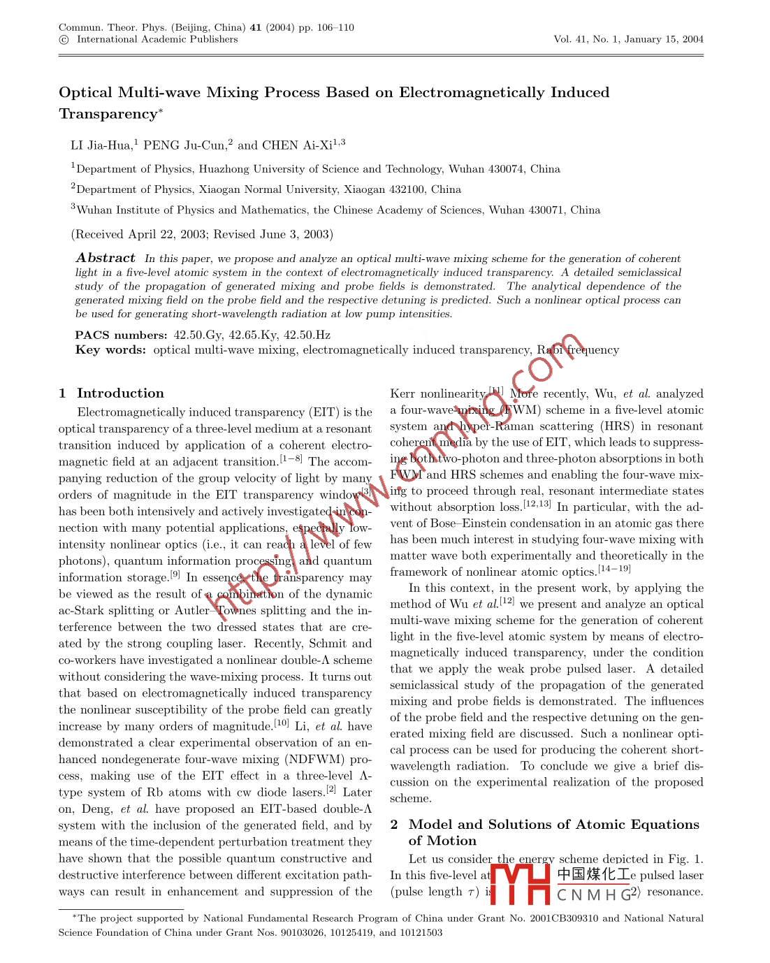Commun, Theor. Phys. (Beijing, China) 41 (2004) pp.106- 110@ International Academic PublishersVol. 41, No. 1, January 15, 2004Optical Multi-wave Mixing Process Based on Electromagnetically InducedTransparency*LI Jia-Hua,1 PENG Ju-Cun,2 and CHEN Ai-Xi131 Department of Physics, Huazhong University of Science and Technology, Wuhan 430074, China2Department of Physics, Xiaogan Normal University, Xiaogan 432100, China3Wuhan Institute of Physics and Mathematics, the Chinese Academy of Sciences, Wuhan 430071, China(Received April 22, 2003; Revised June 3, 2003)Abstract In this paper, we propose and analyze an optical multi-wave mixing scheme for the generation of coherentlight in a five-level atomic system in the context of electromagnetically induced transparency. A detailed semiclassicalstudy of the propagation of generated mixing and probe fields is demonstrated. The analytical dependence of thegenerated mixing field on the probe field and the respective detuning is predicted. Such a nonlinear optical process canbe used for generating short-wavelength radiation at low pump intensities.PACS numbers: 42.50.Gy, 42.65.Ky, 42.50.HzKey words: optical multi wave mixing, electromagnetically induced transparency, Rabi frequency1 IntroductionKerr nonlinearity. More recently, Wu, et al. analyzedElectromagnetically induced transparencya four-wave-mixing (FWM) scheme in a five-level atomicoptical transparency of a three-level medium at a resonantsystem and hyper-Raman scattering (HRS) in resonanttransition induced by application of a coherent electro-coherent media by the use of EIT, which leads to suppress-ing both two-photon and three-photon absorptions in bothpanying reduction of the group velocity of light by many FWM and HRS schemes and enabling the four-wave mix-orders of magnitude in the EIT transparenrcy windowlB) ing to proceed through real, reonant intermediate stateswithout absorption loss. [12,13] In particular, with the ad-nection with many potential aplications, espeiaily low- vent of Bose Einstein condensation in an atomie gas thereintensity nonlinear optics (i.e, it can reach a level of fewhas been much interest in studying four-wave mixing withmatter wave both experimentally and theoretically in theinformation storage.9] In essence, the transparency mayframework of nonlinear atomic optics.I14- -19]In this context, in the present work, by applying thebe viewed as the result of a combination of the dynamicmethodof Wu et al.l 1 2] we present and analyze an opticalterference between the two dressed states that are cIe-multi-wave mixing scheme for the generation of coherentated by the strong coupling laser. Recently, Schmit andlight in the five-level atomic system by means of electro-magnetically induced transparency, under the conditionwithout considering the wave-mixing process. It turns outthat we apply the weak probe pulsed laser. A detailedthat based on electromagnetically induced transparencymixing and probe fields is demonstrated. The infuencesthe nonlinear susceptibility of the probe field can greatlyof the probe field and the respective detuning on the gen-increase by many orders of magnitude.10] Li, et al. haveerated mixing field are discussed. Such a nonlinear opti-demonstrated a clear experimental observation of an en-cal process can be used for producing the coherent short-hanced nondegenerate four-wave mixing (NDFWM) pro-wavelength radiation. To conclude we give a brief dis-cess, making use of the EIT effect in a threelevel Acussion on the experimental realization of the proposedtype system of Rb atoms with cw diode lasers.21 Laterscheme.on, Deng, et al. have proposed an EIT-based double-Asystem with the inclusion of the generated field, and by 2 Model and Solutions of Atomic Equationsmeans of the time-dependent perturbation treatment theyof Motionhave shown that the possible quantum constructive andLet us considerthe, energy scheme depicted in Fig. 1.destructive interference between different excitation path- In this five-level at中國(guó)煤化工e pulsed laserways can result in enhancement and suppression of the (pulse length r) isMHCNMH G2) resonance.*The project supported by National Fundamental Research Program of China under Grant No. 2001CB309310 and National NaturalScience Foundation of China under Grant Nos. 90103026, 10125419, and 10121503No.1Optical Multi-wave Mixing Process Based on Electromagnetically Induced Transparency107One of the two lower levels is coupled to the upper level (assumingh = 1),(|1) →|2)) by a strongly coherent coupling laser to cre-|4 >m-ate an Autler -Townes doublet and two sign laser fieldsare tuned to the transition |1) →|3)> and |3> →|4), re-w。spectively. To avoid significant group velocity mismatch|3 >and for mathematical simplicity, we will assume that allthe involving fields are continuous single-frequency laser|wm(cw laser) with the exception of the probe field. It shouldwsbe noted, however, that the transition |1> - + |3) is dipole-12 >forbidden in line with the well-known selection rule, yet wecan choose sufficiently strong laser field to stimulate elec-v。|wtric quadrupole transitions, which still leads to observed11 >emission and absorption.In the present analysis the semiclassical Hamiltonian.10>describing the atom -field interaction for the system underconsideration can be written as in the Schrodinger pictureFig. 1 EIT-based five-level atomic diagram for analysis.H= εj|i>(i|+ (S2p ei0|2><0| + h.c.) + (Sc ei0|2><1| +h.c)+ (2o1 ei91|3><1|+ h.c)j=0+ (S2s2ei02|4><3| + h.c.) + (S2mei0m|4><0| + h.c.),(1)where On = kin .r- wnt corresponds to the positive-frequency part of the respective field, Sn(n = C,P, s1, s2,m)are one-half Rabi frequencies for the corresponding transtions, i.e, hp = D2oE(wp)/(2h), Sc = D21 E(wc)/(2h),S2s1 = D31 E(ws1)/(2h), S2s2 = D43E(ws2)/(2h), Sm = D4oE(wm)/(2n), with Dku denoting the dipole moment for thetransition between levels |k^> and |l), and Ej = hwj is the energy of the atomic state |j). For si