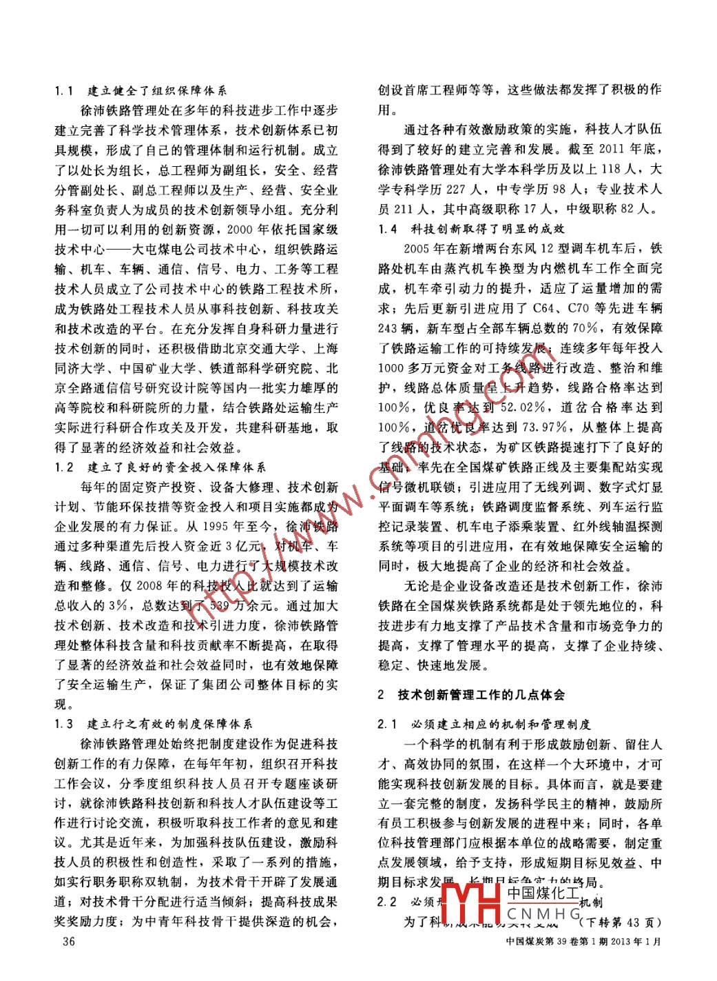 ★經(jīng)濟管理★煤炭自營鐵路科技管理初探劉波(上海大屯能源股份有限公司徐沛鐵路管理處,江蘇省徐州市,221611)摘要從組織保障體系、資金投入保障體系、制度保障體系等方面,介紹了徐沛鐵路的科技管理經(jīng)驗和所取得的成果。關鍵詞科技管理自營鐵路 煤炭企業(yè) .中圖分類號TD- 9文獻標識碼Probing into sci-tech management of self-supportingrailway of coal enterpriseLiu Bo(Xupei Railway Management Office, Shanghai Datun Energy Co.,Ltd. ,Xuzhou, Jiangsu 221611, China)Abstract From the aspects of organization guarantee system, investment support system,institution security system and so on, the paper introduces the scientific and technological man-agement experience and achievements obtained of Xupei Railway Management Office.Key words sci-tech management, self- supporting railway, coal enterprise下,克服運輸資源量受限、國鐵配空車不均衡等多1煤炭自營 鐵路科技管理現(xiàn)狀重困難,及時抓住路企直通這一歷史機遇,全體干徐沛鐵路管理處隸屬于中煤集團大屯公司,始群上下齊心,以科學發(fā)展觀為指導,以經(jīng)濟效益為建于1970年11月,1976年10月全線通車運營,中心,以安全生產(chǎn)為重點,以為民謀福為己任,以鋪軌全長180 km,正線總長72.46 km,共有14尋求發(fā)展為動力,嚴格安全、質(zhì)量標準化管理,強條專用線、道岔186組,年設計運量600萬t;擁化班組管理和安全文化建設,圓滿完成了各項任務有內(nèi)燃機車8臺,自備車輛257輛,全線共設8個指標,2011年,實現(xiàn)了貨運量1400萬t、運輸收客貨運站,擔負大屯公司4礦、2廠、1庫和徐礦人2.6億元,取得了近5年來的最好成績,截至集團3礦及沛城礦的車輛取送和地方物資的到發(fā)業(yè)2011年12月31日,實現(xiàn)無一般B類及以上事故務;每天開行自沛屯至徐州的兩對旅客列車。9721天,無- -般C類及以上事故5910天,無人身在組織機構(gòu)上,徐沛鐵路管理處按照鐵道部鐵輕傷及以上事故2467天。獲得了全國安康杯優(yōu)勝路技術(shù)管理規(guī)程實行二級管理,目前共設10個管企業(yè)、全國煤炭鐵路運輸一流企業(yè)、中國煤礦康居理部門和機務段、車務段、工務段、電務段、車輛建設小康處、國資委中央企業(yè)法制宣傳教育先進單段、機車車輛修廠等生產(chǎn)單位,共有職工1400余位、上海市職工最滿意企業(yè)、江蘇省文明單位、中人。運輸生產(chǎn)完全執(zhí)行國鐵行規(guī)、技規(guī)和上海鐵路煤集團安全生產(chǎn)先進單位等榮譽稱號。旅客列車被局的有關規(guī)定。貨物運輸直通全國各運營車站,客命名為全國青年文明號列車。運列人國家鐵路運行圖。在三十多年的發(fā)展歷程多年來,徐沛鐵路管理處注重搭建良好的科技中,逐步形成了機車工電輛門類齊全、制度相對完創(chuàng)新平臺,健全完善科技創(chuàng)新體系.不斷挖掘和提中國煤化工善的煤炭自營鐵路。高鐵路運促進了全處科多年來,徐沛鐵路管理處在上級部門的領導技創(chuàng)新工作MHCNMHG31.1建立健全 了組織保障體系.創(chuàng)設首席工程師等等,這些做法都發(fā)揮了積極的作徐沛鐵路管理處在多年的科技進步工作中逐步用。建立完善了科學技術(shù)管理體系,技術(shù)創(chuàng)新體系已初通過各種有效激勵政策的實施,科技人才隊伍具規(guī)模,形成了自己的管理體制和運行機制。成立得到了較好的建立完善和發(fā)展。截至2011年底,了以處長為組長,總工程師為副組長,安全、經(jīng)營徐沛鐵路管理處有大學本科學歷及以上118人,大分管副處長、副總工程師以及生產(chǎn)、經(jīng)營、安全業(yè)學??茖W歷227人,中專學歷98人;專業(yè)技術(shù)人務科室負責人為成員的技術(shù)創(chuàng)新領導小組。充分利員211人,其中高級職稱17人,中級職稱82人。用一切可以利用的創(chuàng)新資源,2000年依托國家級1.4 科技創(chuàng)新取得了明顯的成效技術(shù)中心一大屯煤電公 司技術(shù)中心,組織鐵路運2005年在新增兩臺東風12型調(diào)車機車后,鐵輸、機車、車輛、通信、信號、電力、工務等工程路處機車由蒸汽機車換型為內(nèi)燃機車工作全面完技術(shù)人員成立了公司技術(shù)中心的鐵路工程技術(shù)所,成,機車牽引動力的提升,適應了運量增加的需成為鐵路處工程技術(shù)人員從事科技創(chuàng)新、科技攻關求;先后更新引進應用了C64、C70 等先進車輛和技術(shù)改造的平臺。在充分發(fā)揮自身科研力量進行243輛,新車型占全部車輛總數(shù)的70%,有效保障技術(shù)創(chuàng)新的同時,還積極借助北京交通大學、上海了鐵路運輸工作的可持續(xù)發(fā)展;連續(xù)多年每年投入同濟大學、中國礦業(yè)大學、鐵道部科學研究院、北1000多萬元資金對工務線路進行改造、整治和維京全路通信信號研究設計院等國內(nèi)一批實力雄厚的護,線路總體質(zhì)量呈上升趨勢,線路合格率達到高等院校和科研院所的力量,結(jié)合鐵路處運輸生產(chǎn)100%,優(yōu)良率達到52. 02%,道岔合格率達到實際進行科研合作攻關及開發(fā),共建科研基地,取100%,道岔優(yōu)良率達到73.97%,從整體上提高得了顯著的經(jīng)濟效益和社會效益。了線路的技術(shù)狀態(tài),為礦區(qū)鐵路提速打下了良好的1.2 建立了良好的資金投入保障體系基礎;率先在全國煤礦鐵路正線及主要集配站實現(xiàn).每年的固定資產(chǎn)投資、設備大修理、技術(shù)創(chuàng)新信號