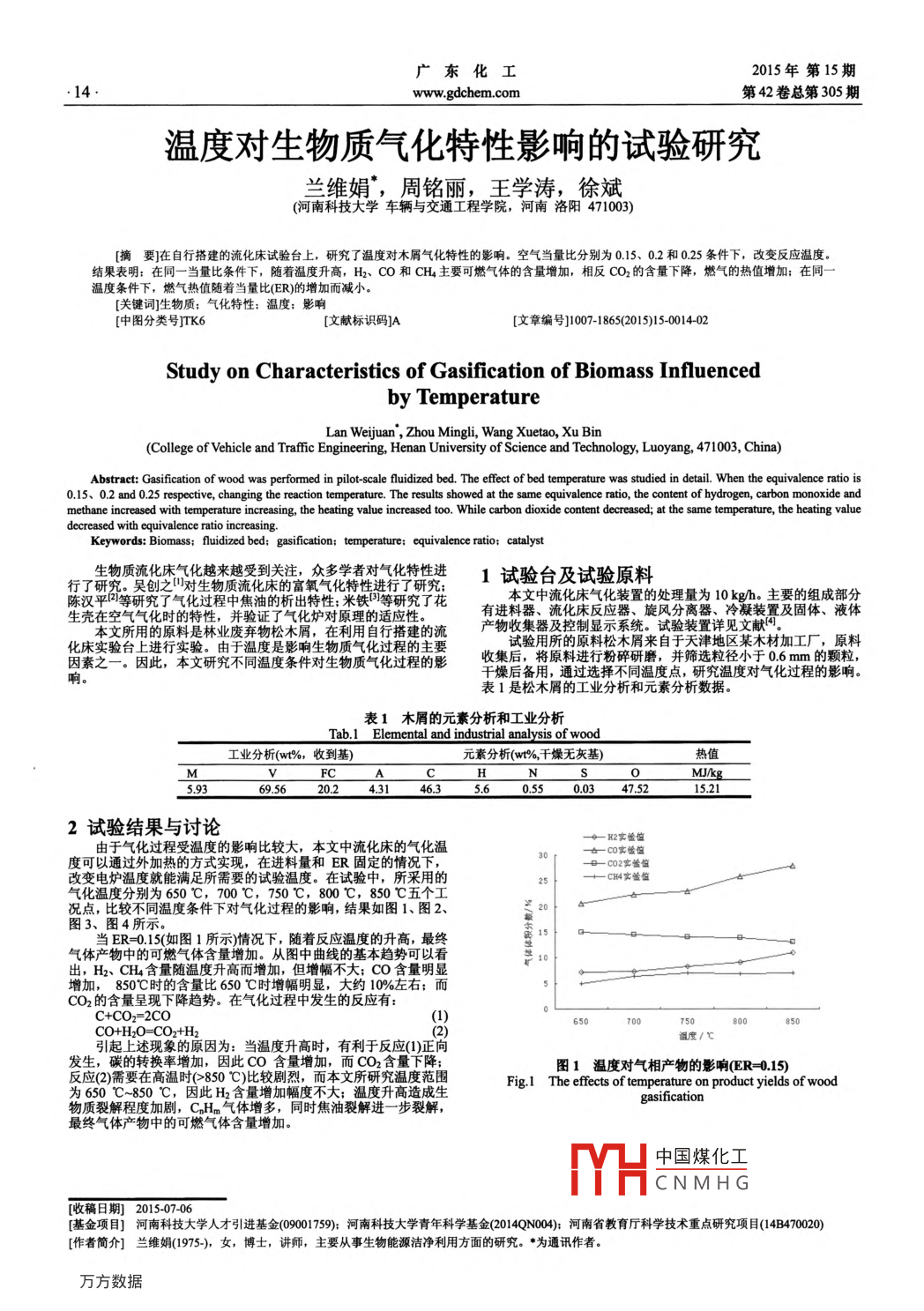 廣東化工2015年第15期14www.gdchem.com第42卷總第305期溫度對(duì)生物質(zhì)氣化特性影響的試驗(yàn)研究蘭維娟,周銘麗,王學(xué)濤,徐斌河南科技大學(xué)車輛與交通工程學(xué)院,河南洛陽(yáng)471003摘要]在自行搭建的流化床試驗(yàn)臺(tái)上,研究了溫度對(duì)木屑?xì)饣匦缘挠绊憽?諝猱?dāng)量比分別為0.15、02和025條件下,改變反應(yīng)溫度結(jié)果表明:在同一當(dāng)量比條件下,隨著溫度升高,H2、CO和CH主要可燃?xì)怏w的含量增加,相反CO2的含量下降,燃?xì)獾臒嶂翟黾?在同一溫度條件下,燃?xì)鉄嶂惦S著當(dāng)量比(ER)的增加而減小[關(guān)鍵詞]生物質(zhì);氣化特性:溫度;影響[中圖分類號(hào)]TK6[文獻(xiàn)標(biāo)識(shí)碼]A[文章編號(hào)]1007-1865(2015)150014-02Study on Characteristics of Gasification of Biomass Influencedby TemperatureLan Weijuan, Zhou Mingli, Wang Xuetao, Xu Bin(College of Vehicle and Traffic Engineering, Henan University of Science and Technology, Luoyang, 471003, China)Abstract: Gasification of wood was performed in pilot-scale fluidized bed, The effect of bed temperature was studied in detail. When the equivalence ratio is0.15, 0.2 and 0.25 respective, changing the reaction temperature. The results showed at the same equivalence ratio, the content of hydrogen, carbon monoxide andnethane increased with temperature increasing, the heating value increased too. While carbon dioxide content decreased; at the same temperature, the heating valuith equivalence ratio increasingKeywords: Biomass: fluidized bed; gasification: temperature: equivalence ratio: catalyst行了研究。吳創(chuàng)之對(duì)生物質(zhì)流化床的富氧氣化特性進(jìn)行了研究:1試驗(yàn)臺(tái)及試驗(yàn)原料中焦油的析本文中流化床氣化裝置的處理量為10kg/h。主要的組成部分生殼在空氣氣化時(shí)的特性,并驗(yàn)證了氣化爐對(duì)原理的適應(yīng)性有進(jìn)料器、流化床反應(yīng)器、旋風(fēng)分離器、冷凝裝置及固體、液體文所用的原料是林業(yè)廢棄物松木屑,在利用自行搭建的流產(chǎn)物收集器及控制顯示系統(tǒng)。試驗(yàn)裝置詳見(jiàn)文獻(xiàn)化床實(shí)驗(yàn)臺(tái)上進(jìn)行實(shí)驗(yàn)。由于溫度是影響生物質(zhì)氣化過(guò)程的主要試驗(yàn)用所的原料松木屑來(lái)自于天津地區(qū)某木材加工廠,原料因素之一。因此,本文研究不同溫度條件對(duì)生物質(zhì)氣化過(guò)程的影收集后,將原料進(jìn)行粉碎研磨,并篩選粒徑小于0.6mm的顆粒,干燥后備用,通過(guò)選擇不同溫度點(diǎn),研究溫度對(duì)氣化過(guò)程的影響。表1是松木屑的工業(yè)分析和元素分析數(shù)據(jù)。表1木屑的元素分析和工業(yè)分析Tab 1 Elemental and industrial analysis of wood工業(yè)分析(wt%,收到基)元素分析(w%干燥無(wú)灰基)熱值H2試驗(yàn)結(jié)果與討論一一H2實(shí)驗(yàn)位由于氣化過(guò)程受溫度的影響比較大,本文中流化床的氣化溫一C0實(shí)驗(yàn)位度可以通過(guò)外加熱的方式實(shí)現(xiàn),在進(jìn)料量和ER固定的情況下c02實(shí)驗(yàn)值改變電爐溫度就能滿足所需要的試驗(yàn)溫度。在試驗(yàn)中,所采用的25+cH4實(shí)謐信氣化溫度分別為650℃,700℃,750℃,800℃,850℃五個(gè)工況點(diǎn),比較不同溫度條件下對(duì)氣化過(guò)程的影響,結(jié)果如圖1、圖2圖3、圖4所示當(dāng)ER=015(如圖1所示)情況下,隨著反應(yīng)溫度的升高,最終氣體產(chǎn)物中的可燃?xì)怏w含量增加。從圖中曲線的基本趨勢(shì)可以看出,H2、CH4含量隨溫度升高而增加,但增幅不大;CO含量明顯CO2的含量呈現(xiàn)下降趨勢(shì)。在氣化過(guò)程中發(fā)生的反應(yīng)有:C+CO2=2CO(1)引起上述現(xiàn)象的原因?yàn)?當(dāng)溫度升高時(shí),有利于反應(yīng)()正向溫度/℃發(fā)生,碳的轉(zhuǎn)換率增加,因此CO含量增加,而CO2含量下降圖1溫度對(duì)氣相產(chǎn)物的影響(ER015)反應(yīng)(2)需要在高溫時(shí)(>850℃)比較劇烈,而本文所研究溫度范圍為650℃~850℃,因此H2含量增加幅度不大;溫度升高造成生Fig. 1 The effects of temperature on product yields of wood物質(zhì)裂解程度加劇,CnHn氣體增多,同時(shí)焦油裂解進(jìn)一步裂解,最終氣體產(chǎn)物中的可燃?xì)怏w含量增加。中國(guó)煤化工CNMHG收稿日期」20150706[基金項(xiàng)目]河南科技大學(xué)人才引進(jìn)基金(0900759);河南科技大學(xué)青年科學(xué)基金(2014QN004);河南省教育廳科學(xué)技術(shù)重點(diǎn)研究項(xiàng)目(l4B470020[作者簡(jiǎn)介]蘭維娟(1975-),女,博士,講師,主要從事生物能源潔凈利用方面的研究?!橥ㄓ嵶髡摺?015年第15期廣東化工第42卷總第305期www.gdchem.com最爾蘭ER=0.152ER=0.2ER=0.25圖4在不同反應(yīng)溫度下產(chǎn)氣熱值的曲線關(guān)系溫度/℃Fig 4 The effects of temperature on product yields of wood圖2溫度對(duì)氣相產(chǎn)物的影響(ER=0.2)gasificationFig. 2 The effects of temperature on product yields of wood由圖4可知,對(duì)應(yīng)同一溫度點(diǎn)時(shí),ER越大,氣體熱值越低在同一ER情況下,氣體熱值隨溫度變化總體趨勢(shì)是當(dāng)溫度的升高時(shí),最終氣體產(chǎn)物熱值增加。造成這種現(xiàn)象的可能原因有兩個(gè)一2實(shí)驗(yàn)方面,溫度升高,有利于上述氣化反應(yīng)向正反應(yīng)方向進(jìn)一c0實(shí)戎的CO和H2增加,因此最終氣體熱值增加。另一方面c02實(shí)驗(yàn)信cH4實(shí)位進(jìn)焦油的進(jìn)一步焦油裂解程度加