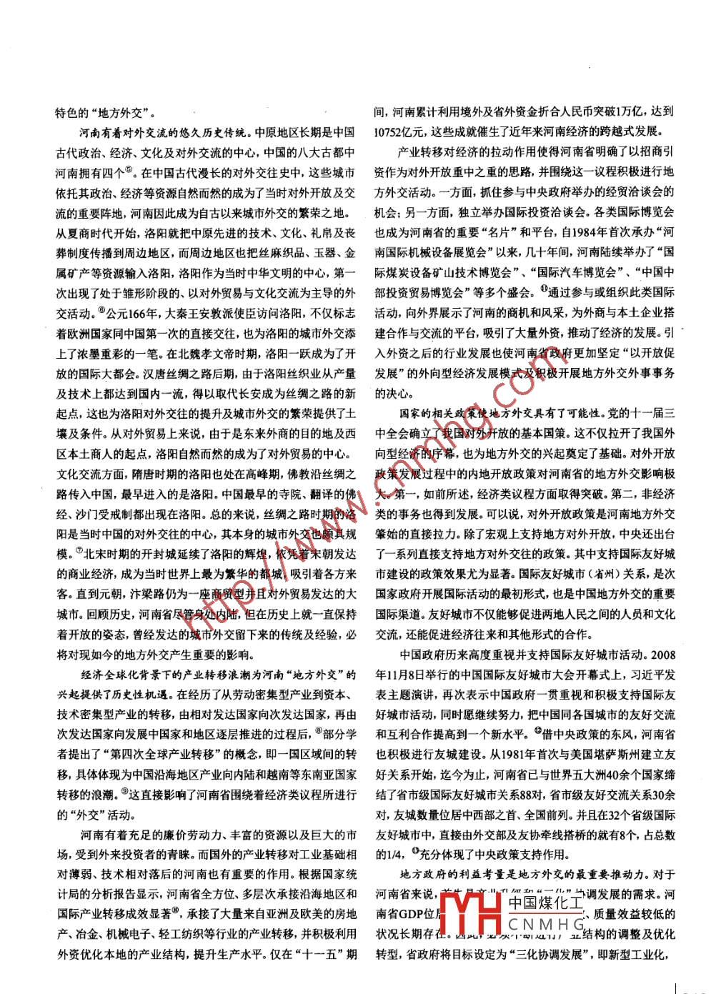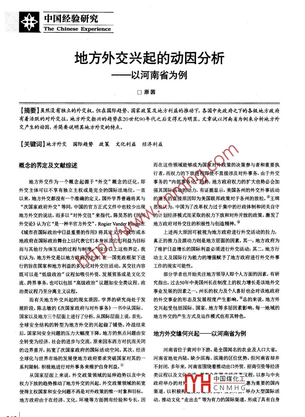 中國經(jīng)驗(yàn)研究The Chinese Experience地方外交興起的動因分析一以河 南省為例口原茵[摘要]雖然沒有獨(dú)立的外交權(quán),但在國際趨勢、國家政策及地方利益的推動下,各國中央政府之下的各級地方政府有著活躍的對外交往,地方外交勃興的趨勢在20世紀(jì)90年代之后變得尤為明顯。文章試以河南省為例來分析地方外交產(chǎn)生的動因,并簡要說明其地方外交的特點(diǎn)。[關(guān)鍵詞]地方外交國際趨勢 政策文化利益 經(jīng)濟(jì)利益概念的界定及文獻(xiàn)綜述而在這些領(lǐng)域能夠成為國家對外政策的決策參與者和重要執(zhí)行者。而權(quán)力的下放進(jìn)程即使不直接涉及對外事務(wù),由于外交地方外交作為一個概念起源于“外交”概念的泛化,即事務(wù)的“內(nèi)部事務(wù)化”趨勢,地方政府權(quán)力的擴(kuò)大也勢必會加外交主體可以不享有獨(dú)立主權(quán)或是完全的國際法地位。一直強(qiáng)其國際活動的動力,有證據(jù)顯示,美國各州的外交外事活動以來,地方外交都沒有一個準(zhǔn)確的定義。國外學(xué)界普遍將其與的增長的直接原因即為美國聯(lián)邦政策對于各州的放松?!巴蹙儭按螄艺饨弧钡韧?中國的官方正式文件中也較少出現(xiàn)思也認(rèn)為,中國為了改革權(quán)力過于集中的行政體制和閉關(guān)自守地方外交的說法,而多以“對外交往”來指代。陳昊蘇的《民間的計(jì)劃經(jīng)濟(jì)模式而采取的權(quán)力下放和對外開放的政策,激發(fā)了外交論》認(rèn)為它“是- -種 半官方外交”, Rogier Vander Plujm在地方政府對外交往的積極性與創(chuàng)造精神。國《城市在國際政治中日益重要的作用》將其定義為“城市或本上述兩大原因可被視為地方政府進(jìn)行外交活動的拉力, .地政府在國際政治舞臺上以代表它們本身以及它們利益為目標(biāo)真正的推力及源動力則是地方層面的因素。其一,地方政府為而與其他行為體互動的過程與制度。”綜合以上這些界定,我了 維護(hù)日益增長的國際利益必須進(jìn)行外交活動;其二,地方行們認(rèn)為,地方外交是以地方政府為主體,在-國憲政框架下進(jìn)動主義及國際行為能力的增強(qiáng)賦予了地方政府進(jìn)行外交外事行的旨在國家和地方利益的多元化對外交往活動。其交往內(nèi)容工作的現(xiàn)實(shí)可能性。既可以是“低級政治”議程如吸引外資、發(fā)展貿(mào)易或是文化交部分學(xué)者也開始關(guān)注地方領(lǐng)導(dǎo)人即個人方面的因素。有研流、跨界事務(wù),也可以包括“高級政治”議題如安全類議程、政究指出,過去50年中美國州長在制度上的權(quán)力增長是該地外交治類議程乃至分離主,義議程。事業(yè)發(fā)展的因素之- -。州長的權(quán)力及個人喜好也會對該地政府而有關(guān)地方外交興起的現(xiàn)實(shí)原因,學(xué)界的研究尚處于發(fā)的外交事業(yè)的形態(tài)及發(fā)展程度產(chǎn)生影響。用總的來說,地方外展階段。陳志敏的《次國家政府與對外事務(wù)》一書中從國際、交興起 受包括國際、國家、地方等多層因素影響,每一地域的國家以及地方三個層面上進(jìn)行了分析。從國際層面上說,首先,地方外交的產(chǎn)生方式及運(yùn)作 模式也有其特色。全球安全結(jié)構(gòu)的轉(zhuǎn)型為地方外交的興起做了鋪墊.冷戰(zhàn)結(jié)束后,國家間安全問題的壓力大幅度下降,地方的焦點(diǎn)問題由安地方外交緣何興起一以河南省為例全轉(zhuǎn)變?yōu)榻?jīng)濟(jì)、社會的進(jìn)步與交流。原來因東西方對抗而關(guān)閉的邊界重開,拓寬了次國家政府的國際活動空間。其次,經(jīng)濟(jì)河南省位于黃河中下游,是全國聞名的農(nóng)業(yè)及人口大省。全球化與世界市場的發(fā)展使地方政府要求突破國家對其的一河南省地處內(nèi)陸,缺少濱海、濱港的區(qū)位優(yōu)勢。但河南省卻并系列限制,積極地進(jìn)行對外事務(wù)來維護(hù)自身利益。①不封閉,多年來,河南省圍繞著推動出口外貿(mào)、招商引資等經(jīng)濟(jì)從國家層面上來說,外交政策領(lǐng)域的延伸趨勢以及中央類議程以及文化育節(jié)都女^工管公忙蘭義程,以參與中央權(quán)力下放的趨勢推動了地方外交的興起。外交政策領(lǐng)域的拓寬政府舉辦的對中國煤化工惠為重要的國內(nèi)使得主權(quán)國家和安全問題不再是對外政策的惟-對象和目標(biāo)。渠道,以積極構(gòu)YHCNMH G?舉辦大型國際活地方政府由于在經(jīng)濟(jì)、文化、環(huán)境等方面擁有經(jīng)驗(yàn)和專長,因動、推動文化“走出去”等為有力的國際渠道,形成了具有自身218人防拐數(shù)腿LE'S TRIBUNE特色的“地方外交”。間,河南累計(jì)利用境外及省外資金折合人民幣突破1萬億,達(dá)到河南有著對外交流的悠久歷史傳統(tǒng)。中原地區(qū)長期是中國10752億元, 這些成就催生了近年來河南經(jīng)濟(jì)的跨越式發(fā)展。古代政治、經(jīng)濟(jì)、文化及對外交流的中心,中國的八大古都中產(chǎn)業(yè)轉(zhuǎn)移對經(jīng)濟(jì)的拉動作用使得河南省明確了以招商引河南擁有四個四。在中國古代漫長的對外交往史中,這些城市資作 為對外開放重中之重的思路,并圍繞這一-議程積極進(jìn)行地依托其政治、經(jīng)濟(jì)等資源自然而然的成為了當(d
