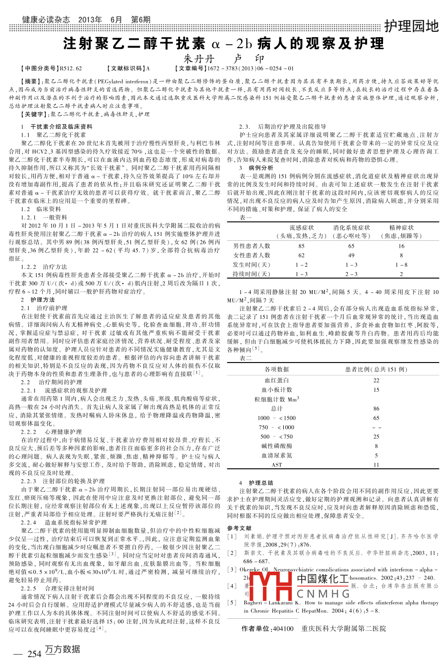 健康必讀雜志2013年 6月第6期..t護理園地注射聚乙二醇干擾素a-2b病人的觀察及護理朱丹丹.盧印[中圖分類號]R512.62[文獻標識碼]A[文章編號1]1672 - 3783(2013)06 -0254 -01[摘要]:聚乙二醇化干擾素(PEGyated iteferon)是一種由聚乙二醇修飾的蛋白質(zhì),聚乙二醇干擾素因為其具有半褒期長,用藥方便,持久應(yīng)答效果好等優(yōu)點,因而成為當前治療病毒性肝炎的首選藥物。但聚乙二醇化干擾素與其他干擾素一樣,具有用藥時間較長、不良反應(yīng)多等特點,在較長的治療過程中存在著各種副作用以及潛在的不利于治療的影響因素,因此本文通過選取重慶醫(yī)科大學附屬二院感染科151例接受聚乙二醇干擾素的患者實施整體護理,通過觀察分析,總結(jié)護理注射聚乙二醇干擾素病人時應(yīng)注意事項,[關(guān)鍵字]:聚乙二醇化干擾素,病毒性肝炎,護理1干擾素介紹及 臨床資料2.3.后期治療護理及出院指導1.1聚乙二醇化干擾素護士應(yīng)向患者及其家屬詳細說明聚乙二醇干擾素適宜貯藏地點、注射方聚乙二醇化干擾素在20世紀末首先被用于治療慢性丙型肝炎.與利巴韋林式 ,注射時間等注意事項。認真告知使用干擾素會帶來的- -定的異常反應(yīng)及應(yīng)合用,對HCV2.3基因型感染的持久療效接近70%,這也是一個突破性的數(shù)據(jù)。對方法。鼓勵患者進食及充分的睡眠,同時做好患者恩想護理及心理咨詢工聚乙二醇化干擾素半壽期長,可以在血液內(nèi)達到血藥穩(wěn)態(tài)濃度,形成對病毒的作,告知病人來院復查時間,消除患者對疾病和藥物的恐懼心理。持久抑制作用,所以又稱其為“長效干擾素"。同時聚乙二醇干擾素用藥間隔相3病例分析對較長,用藥方便,相對于普通a-干擾素,持久應(yīng)答效果提高了10%左右卻并表一是觀測的151例病例分別在流感癥狀,消化道癥狀及精神癥狀出現(xiàn)異沒有增加毒副作用,提高了患者的依從性;并且臨床研究還證明聚乙二醇干擾常的比例及發(fā)生時間和持續(xù)時間。由表可知上述癥狀-般發(fā)生在注射干擾素素對普通a-干擾素治療無效的患者可以獲得療效。就干擾素而言,聚乙二醇后就開始出現(xiàn),因此在剛注射干擾索的這段時間內(nèi),應(yīng)該密切觀察病人的反應(yīng)干擾素在臨床上的應(yīng)用是一個重要的里程碑。情況,對出現(xiàn)不良反應(yīng)的病人應(yīng)及時告知產(chǎn)生原因,消除病人顧慮.并分別采用臨床資料不同的措施、對策和護理,保證了病人的安全1.2.1一般資料對2012年10月1日- 2013年5月1日對重慶醫(yī)科大學附屬二院收治的病.流感癥狀消化系統(tǒng)癥狀精神癥狀毒性肝炎使用注射聚乙二醇干擾素a-2b治療的病人151例實施整體護理并進(頭痛,發(fā)熱,乏力) (惡心嘔吐等) ( 焦慮,煩躁等)行觀察總結(jié)。其中男89例(38例丙型肝炎,51例乙型肝炎),女62例(26例丙男性患者人數(shù)8565型肝炎,36例乙型肝炎),年齡22~62(平均45.7)歲,全部符合抗病毒治療女性患者人數(shù)5219指征1.2.2治療 方法發(fā)生時間(天)-21 -31 -8本文151例病毒性肝炎患者全部接受聚乙二醇干擾素a-2b治療,開始時_持續(xù)時間(天)1-32-3 _干擾素300萬U/(次●d)或500萬U/(次. d)肌內(nèi)注射,2周后改為隔日1次,療程6~12個月,同時輔以一般護肝藥物對癥治療。1-4周采用靜脈注射20 MU/M2,間隔5天。4-40周采用皮下注射102護理方法 ,MU/M2,間隔7天2.1 治療前護理注射聚乙二醇干擾素后2-4周后,會有部分病人出現(xiàn)造血系統(tǒng)指標異常,在注射使干擾素前首先應(yīng)通過主治醫(yī)生了解患者的適應(yīng)癥及患者的其他表二記錄了151例患者在注射干擾索-一個月后血常規(guī)異常的統(tǒng)計,當出現(xiàn)造血病情。詳細詢問病人有無精神病史心臟病史等,化驗查血細胞.腎功、肝功情 系統(tǒng)異常時,可在飲食上指導患者要加強營養(yǎng),多食補血食物如紅棗、阿膠等,況,掌握適應(yīng)癥與禁忌癥,對干擾素過敏或有其他嚴重疾病不能耐受干擾素必要時可以通過藥物補血,如利血生、峰齡膠囊等升白藥物。患者用藥后均能副作用者禁用。同時應(yīng)評估患者家庭經(jīng)濟情況、營養(yǎng)狀況、耐受程度、患者及家緩解,但由于白細胞減少可使機體抵抗力下降.因此要加強觀察繼發(fā)性感染的屬對藥物的認知度。護理人員應(yīng)針對患者的不同情況實施健康教育,尤其是文各種傾向[5].化程度低.對健康的重視程度較差的患者。根據(jù)評估的內(nèi)容向患者講解干擾素表二的相關(guān)知識,特別是不良反應(yīng)的表現(xiàn),因為藥物不良反應(yīng)對人體的損傷不僅取各項數(shù)據(jù)患者比例(總共151例)決于藥物本身的性質(zhì)和患者生理條件,也與患者的心理影響有直接聯(lián)[1]。2.2 治療期間的護理血紅蛋白222.2. 1流感癥 狀的觀察及護理血小板計數(shù)1S通常在用藥第1周內(nèi),病人會出現(xiàn)乏力發(fā)熱、頭痛.寒戰(zhàn)、肌肉酸痛等癥狀,粒細胞計數(shù)Mm3高熱一般在24小時內(nèi)消失。首先讓病人及家屬了解出現(xiàn)高熱是機體的正常反總計80應(yīng),消除其緊張情緒。發(fā)熱時囑病人臥床休息,給子物理降溫或藥物降溫,密00-<1500切觀察體溫變化。2.2. 2心理 健康護理500 - <7502:在治療過程中,由于病情易反復、干擾素治療費用相對較昂貴、療程長,不良反應(yīng)大預(yù)后差等多種因素的影響.患者往往面臨更多的社會壓力,