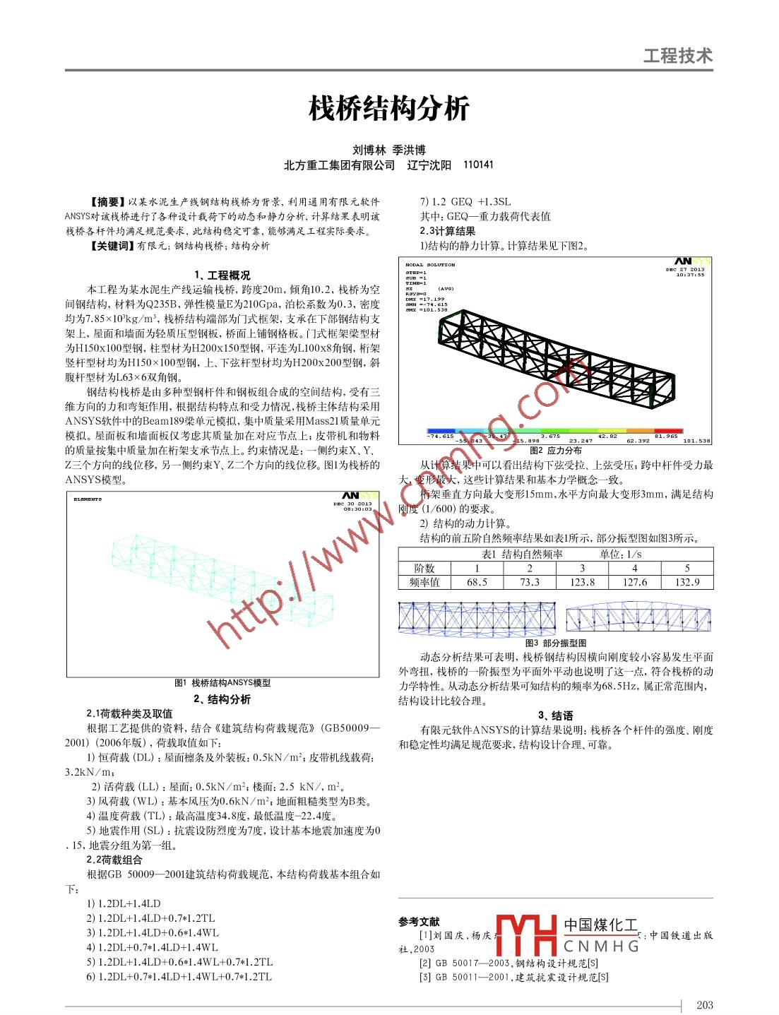 工程技術棧橋結(jié)構(gòu)分析劉博林季洪博北方重工集團有限公司遼寧沈陽 110141[摘要]以某水泥生產(chǎn)線鋼結(jié)構(gòu)棧橋為背景,利用通用有限元軟件7)1.2 GEQ +1.3SLANSYS對該棧橋進行了各種設計載荷下的動態(tài)和靜力分析,計算結(jié)果表明該其中: GEQ-重力載荷代表值棧橋各桿件均滿足規(guī)范要求,此結(jié)構(gòu)穩(wěn)定可靠,能夠滿足工程實際要求。2.3計算結(jié)果[關鍵詞]有限元;鋼結(jié)構(gòu)棧橋;結(jié)構(gòu)分析1)結(jié)構(gòu)的靜力計算。計算結(jié)果見下圖2。AN1.工程概況312?.201310:37:55本工程為某水泥生產(chǎn)線運輸棧橋,跨度20m,傾角10.2,棧橋為空, (AVS)間鋼結(jié)構(gòu),材料為Q235B,彈性模量E為210Gpa,泊松系數(shù)為0.3,密度均為7.85 x 10'kg/m',棧橋結(jié)構(gòu)端部為[ ]式框架,支承在下部鋼結(jié)構(gòu)支架上,屋面和墻面為輕質(zhì)壓型鋼板,橋面上鋪鋼格板。I]式框架梁型材為H150x 100型鋼,柱型材為H200x150型鋼,平連為L100x8角鋼,桁架豎桿型材均為H150x 100型鋼,上下弦桿型材均為H200x200型鋼,斜腹桿型材為L63x 6雙角鋼。鋼結(jié)構(gòu)棧橋是由多種型鋼桿件和鋼板組合成的空間結(jié)構(gòu),受有三維方向的力和彎矩作用,根據(jù)結(jié)構(gòu)特點和受力情況,棧橋主體結(jié)構(gòu)采用ANSYS軟件中的Beam189梁單元模擬,集中質(zhì)量采用Mass21質(zhì)量單元模擬。屋面板和墻面板僅考慮其質(zhì)量加在對應節(jié)點上;皮帶機和物料-58.043 15.0023.247 62.392101.530的質(zhì)量按集中質(zhì)量加在桁架支承節(jié)點上。約束情況是:一側(cè)約束X、Y、Z三個方向的線位移,另- .側(cè)約束Y. Z二個方向的線位移。圖1為棧橋的從計算結(jié)果中可以看出結(jié)構(gòu)下弦受拉上弦受壓;跨中桿件受力最ANSYS模型。大,變形最大,這些計算結(jié)果和基本力學概念-致。AN。桁架垂直方向最大變形15mm,水平方向最大變形3mm,滿足結(jié)構(gòu)DB2: 2003剛度(1/600)的要求。2)結(jié)構(gòu)的動力計算。結(jié)構(gòu)的前五階自然頻率結(jié)果如表1所示,部分振型圖如圖3所示。表1結(jié)構(gòu)自然頻率單位:1/s二頻率值68.573.3123.8127.6132.9圖3部分振型圖動態(tài)分析結(jié)果可表明,棧橋鋼結(jié)構(gòu)因橫向剛度較小容易發(fā)生平面外彎扭,棧橋的一階振型為平面外平動也說明了這一點, 符合棧橋的動圖1棧橋結(jié)構(gòu)ANSYS模型力學特性。從動態(tài)分析結(jié)果可知結(jié)構(gòu)的頻率為68.5Hz,屬正常范圍內(nèi),2.結(jié)構(gòu)分析結(jié)構(gòu)設計比較合理。2.1荷載種類及取值3.結(jié)語根據(jù)工藝提供的資料,結(jié)合《建筑結(jié)構(gòu)荷載規(guī)范》(GB50009-有限元軟件ANSYS的計算結(jié)果說明:棧橋各個桿件的強度、剛度2001) (2006年版) ,荷載取值如下:和穩(wěn)定性均滿足規(guī)范要求,結(jié)構(gòu)設計合理、可靠。1)恒荷載(DL) :屋面檁條及外裝板: 0.5kN/ m2;皮帶機線載荷:3.2kN/m;2)活荷載(LL):屋面: 0.5kN/m2;樓面:2.5 kN/, m2。3)風荷載(WL) :基本風壓為0.6kN/m2;地面粗糙類型為B類。4)溫度荷載(TL) :最高溫度34.8度,最低溫度-22.4度。5)地震作用(SL) :抗震設防烈度為7度,設計基本地震加速度為0, 15,地震分組為第-組。2.2荷載組合根據(jù)GB50009--2001建筑結(jié)構(gòu)荷載規(guī)范,本結(jié)構(gòu)荷載基本組合如下:1) 1.2DL+1.4LD2) 1.2DL+1.4LD+0.7*1.2TL參考文獻.中國煤化工3) 1.2DL+1.4LD+0.6*1.4WL1]劉國慶, 楊慶:中國鐵道出版4) 1.2DL.+0.71.4LD+1.4WL社,2003IYHCNMHG5) 1.2DL+1.4LD+0.6*1.4WL+0.7*1.2TL[2] GB 50017- -2003, 鋼結(jié)構(gòu)設計規(guī)范[S]6) 1.2DL+0.7*1.4LD+1.4WL+0.7*1.2TL[3] GB 50011- 2001,建筑抗震設計規(guī)范[S]203