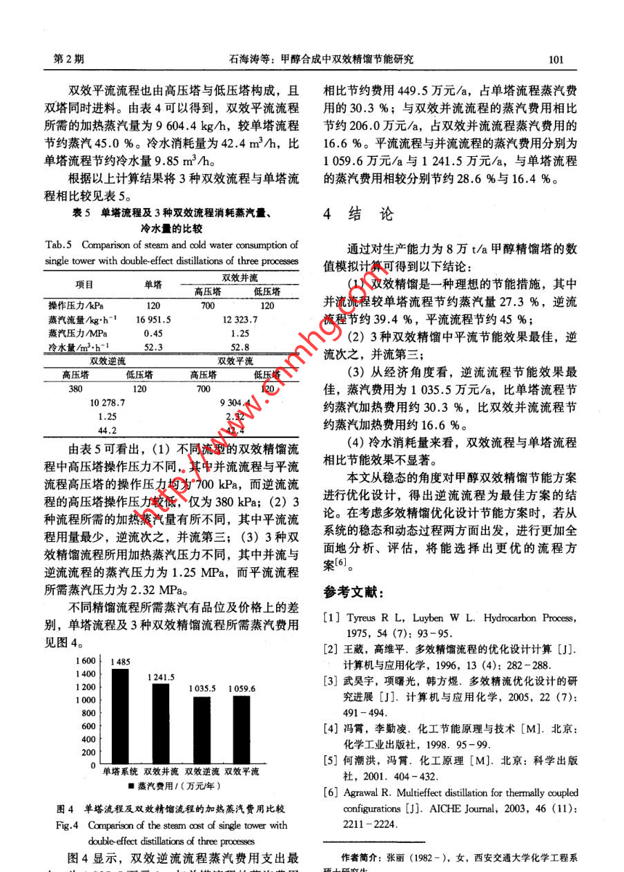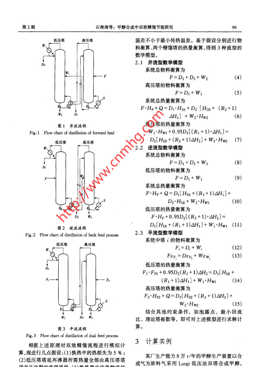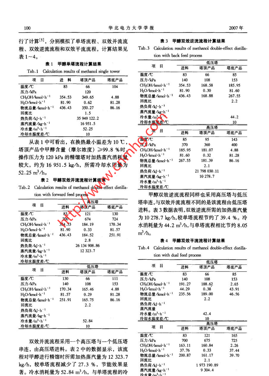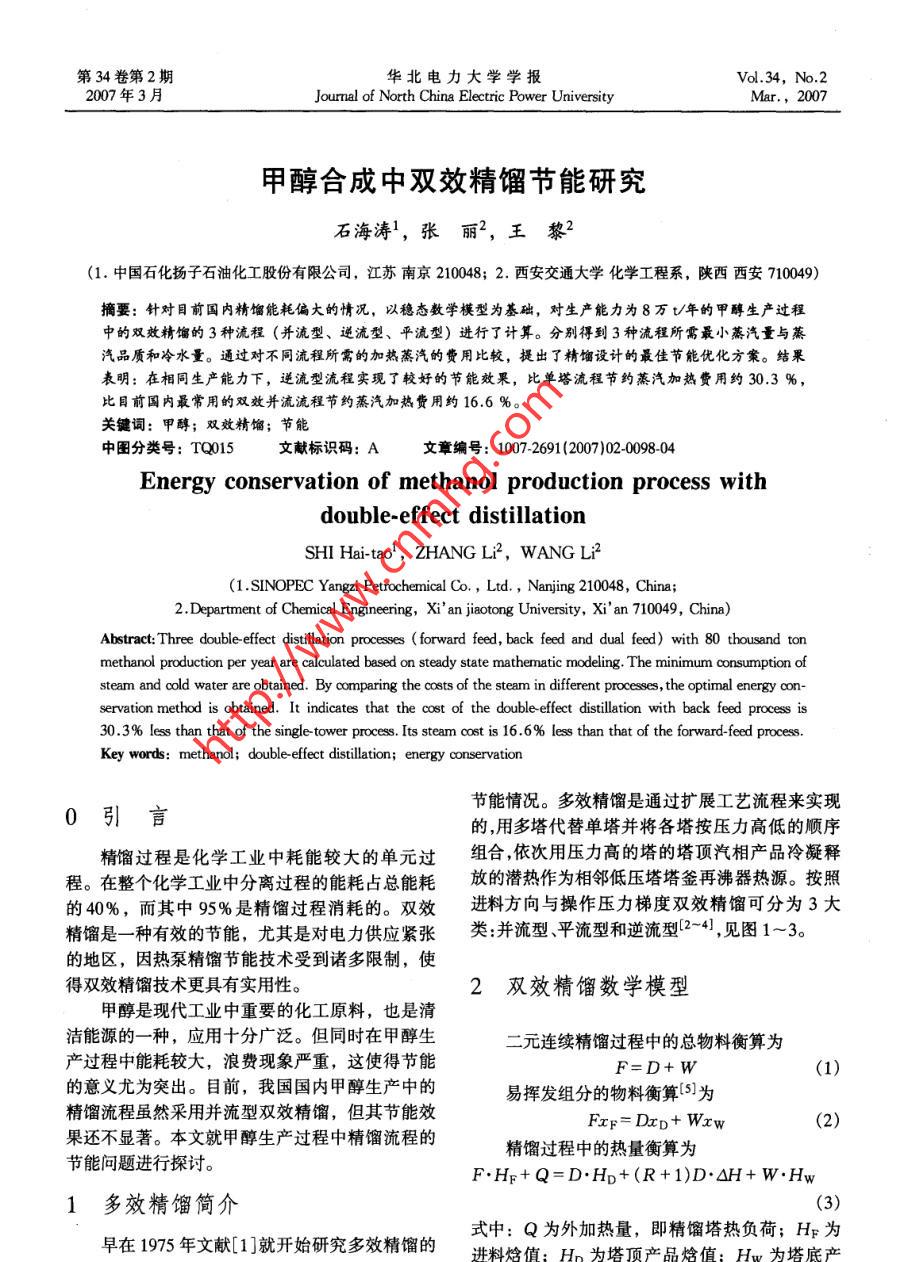第34卷第2期華北電力大學學報Vol.34, No.22007年3月Journal of North China Electric Power UniversityMar., 2007甲醇合成中雙效精餾節(jié)能研究石海濤,張麗2,王黎2(1.中國石化揚子石油化工股份有限公司,江蘇南京210048; 2. 西安交通大學化學工程系,陜西西安710049)摘要:針對目前國內精餾能耗偏大的情況,以穩(wěn)態(tài)數(shù)學模型為基礎,對生產能力為8萬t/年的甲醇生產過程中的雙效精餾的3種流程(并流型、逆流型、平流型)進行了計算。分別得到3種流程所需最小蒸汽量與蒸汽品質和冷水量。通過對不同流程所需的加熱蒸汽的費用比較,提出了精餾設計的最佳節(jié)能優(yōu)化方案。結果表明:在相同生產能力下,逆流型流程實現(xiàn)了較好的節(jié)能效果,比單塔流程節(jié)約蒸汽加熱費用約30.3 %,比目前國內最常用的雙效并流流程節(jié)約蒸汽加熱費用約16.6 %。關鍵詞:甲醇;雙效精餾;節(jié)能中圖分類號: TQ015文獻標識碼: A文章編號: 1007-2691 (2007)02-0098-04Energy conservation of methanol production process withdouble-effect distillationSHI Hai-tao', ZHANG LR, WANG L;2(1.SINOPEC Yangzi Petrochemical Co.,Ltd. , Nanjing 210048, China;2.Department of Chemical Engineering, Xi' an jiaotong University, Xi' an 710049, China)Abstract: Three double-effect disilation processes (forward feed, back feed and dual feed) with 80 thousand tonmethanol production per year are calculated based on steady state mathematic modeling. The minimum consumption ofsteam and cold water are obtained. By comparing the costs of the steam in different processes, the optimal energy con-servation method is obtained. It indicates that the cost of the double efet dilltion with back feed process is30.3% less than that of the singletowver process. Its steam cost is 16.6% less than that of the forward-feed process.Key words: methanol; double effect disillation; energy conservation節(jié)能情況。多效精餾是通過擴展工藝流程來實現(xiàn)0引言的,用多塔代替單塔并將各塔按壓力高低的順序精餾過程是化學工業(yè)中耗能較大的單元過組合,依次用壓力高的塔的塔頂汽相產品冷凝釋程。在整個化學工業(yè)中分離過程的能耗占總能耗放的潛熱作為相鄰低壓塔塔釜再沸器熱源。按照的40%,而其中95%是精餾過程消耗的。雙效進料方向與操作壓力梯度雙效精餾可分為3大精餾是- -種有效的節(jié)能,尤其是對電力供應緊張類:并流型、平流型和逆流型[2~41 ,見圖1~3。的地區(qū),因熱泵精餾節(jié)能技術受到諸多限制,使得雙效精餾技術更具有實用性。2雙效精餾數(shù)學模型甲醇是現(xiàn)代工業(yè)中重要的化工原料,也是清潔能源的- -種,應用十分廣泛。但同時在甲醇生二元連續(xù)精餾過程中的總物料衡算為產過程中能耗較大,浪費現(xiàn)象嚴重,這使得節(jié)能F=D+ w(1)的意義尤為突出。目前,我國國內甲醇生產中的易揮發(fā)組分的物料衡算[5]為精餾流程雖然采用并流型雙效精餾,但其節(jié)能效Fxp= Dxp+ Wxw(2)果還不顯著。本文就甲醇生產過程中精餾流程的精餾過程中的熱量衡算為節(jié)能問題進行探討。F.Hp+Q= D.Hp+(R +1)D.0H+ W.Hw1多效精餾簡介(3)早在1975年文獻[1]就開始研究多效精餾的式中: Q為外加熱量,即精餾塔熱負荷; Hp 為進料焓值; Hp為塔頂產品焓值; Hw為塔底產收稿月朔數(shù)糖09-30.品焓值; 0H為塔頂產品的氣化潛熱。第2期石海濤等:甲醇合成中雙效精餾節(jié)能研究99低壓塔高壓塔溫差不小于最小傳熱溫差?;诩僭O分別進行物w、料衡算、兩個精餾塔的熱量衡算,得到3種流型的數(shù)學模型。D2.1并流型數(shù)學模型系統(tǒng)總物料衡算為1F=D1+ D2+ W2(4)高壓塔的物料衡算為F=D1+ W1(5)系統(tǒng)總熱量衡算為F.Hp+Q=D1.Hpr+D2 [Hn2+ (R2+1)W0H2] + W2* Hwz(6)困1并流流程低壓塔的熱量衡算為Fig.1 Flow chart of distllation of forward feedW:.Hwn +0.95D[(R1 + 1).0H;]=D2[Hp2+ (R2+ 1)0H2]+ W2:Hw2 (7)2.2逆 流型數(shù)學模型F=D1+D2+ W2(8)低壓塔的物料衡算為(9)F.Hp+ Q= DI[Hp1 +(R1+ 1)0H]+D2:Hpe+ W2* Hw2(10)D2 WF.Hp+ 0.9SD2[(R2 + 1).0H2]=D[Hp +(R1+ 1)0H]+ W:.HwI (11)日2 逆流流程2.3平 流型數(shù)學模型Fig.2 Flow chart of disillation of back feed process系統(tǒng)中塔i的物料衡算為低壓堵F;=D;+ W;(12)W、Fxp,= Dxp,+ Wxw,(13)FA.Fr +0.95D2(R2+ 1)AH2= D[Hpr+一F(R1+ 1)0H]+ W. Hwn(14)高壓塔的熱量衡算為F2.Hn+ Q= D2[Ho2+ (R2 + 1)0H2]+W2* Hw2(15)EEL結合其他約束條件,如泡露點、最小回流D2 Wz比、理論塔板數(shù)等,即可對上述模型進行求解計困3平 流流程算。Fig.3 Flow chart of disillation of dual feed process根據(jù)上述原理對雙效精餾流程進行模擬計3計算實例算,現(xiàn)進行幾點假設:(1)換熱中的熱損失為5 %;某廠生產能力8萬t/年的甲醇生產裝置以合(2)低壓塔塔底再沸器所需熱量全部由高壓塔塔成氣為原料氣采用Lurgi低壓法雙塔合成甲醇。頂產品冷凝的熱量提供;(3)換熱器中冷熱物流的運用上述數(shù)學模型對其生產過程中的精餾流程進100華北電力大學學報2007年行了計算[5],分別模擬了單塔流程、雙效并流流表3甲醇雙效逆流流程計算結果程、雙效逆流流程和雙效平流流程,計算結果見Tab.3 Calculation results of methanol double effect distilla-表1~4。tion with back feed process表1甲醇單塔流程計算結果低壓塔項目進料塔頂產品塔底產品Tab.1 Calculation results of methanol single tower溫度心5685進米塔頂產品.壓力AkPa140108溫度/C866104CHOH/kmol:h-1354.53168.58185.95120H2OAkmol:h-'81 .900.3081.60CH2OHAkxmol.h-1349.654.88物流總量Akmolh~1 436.43168.88 .267.55H20/kmol.h-I81.900.6281.28回流比2.2物