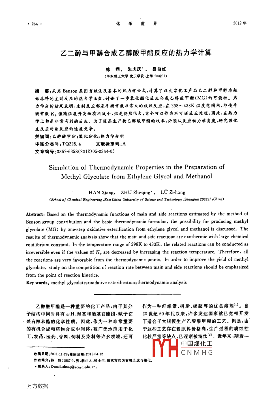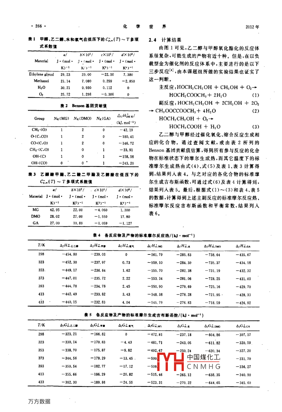 乙二醇與甲醇合成乙醇酸甲酯反應的熱力學計算