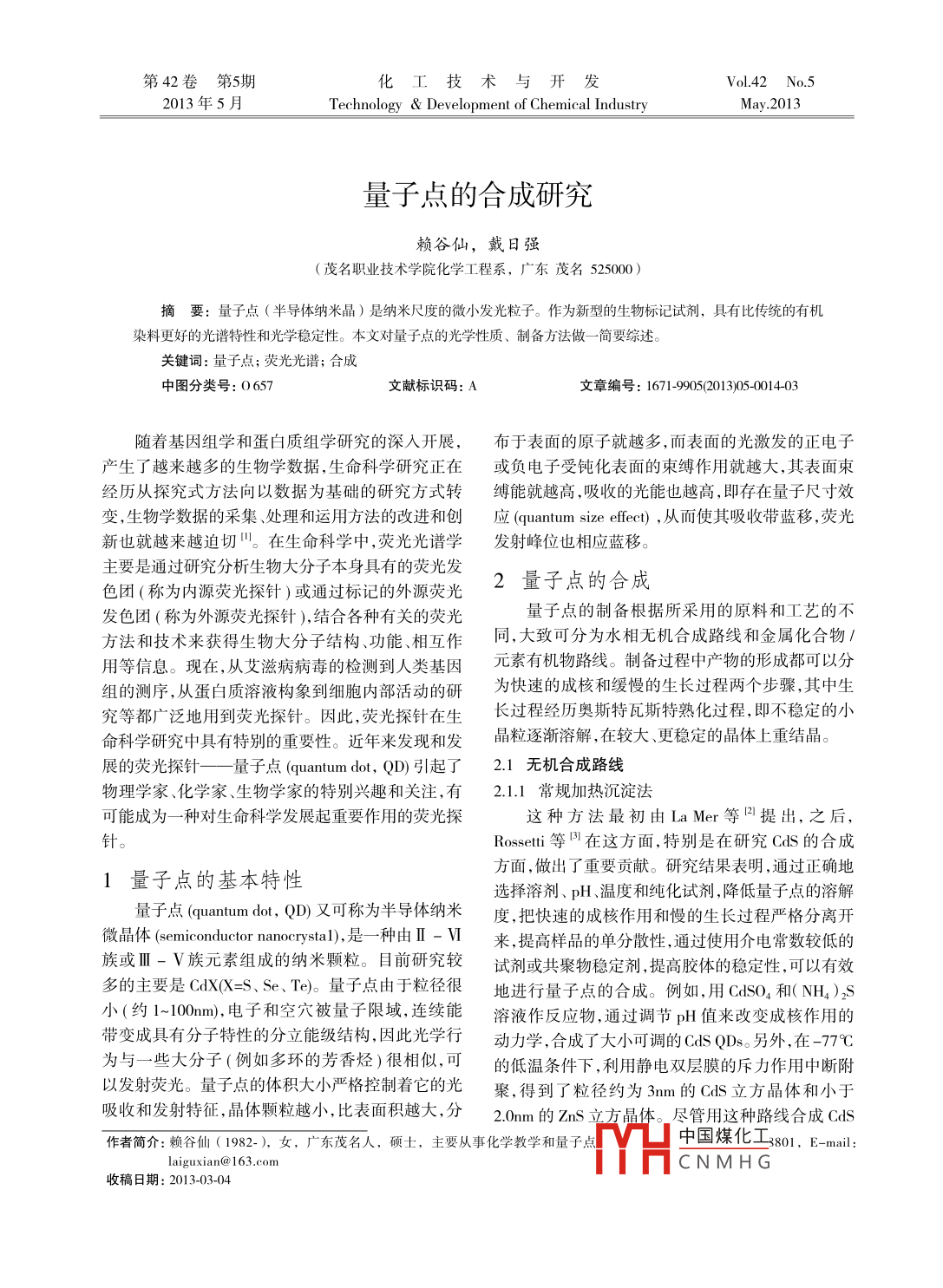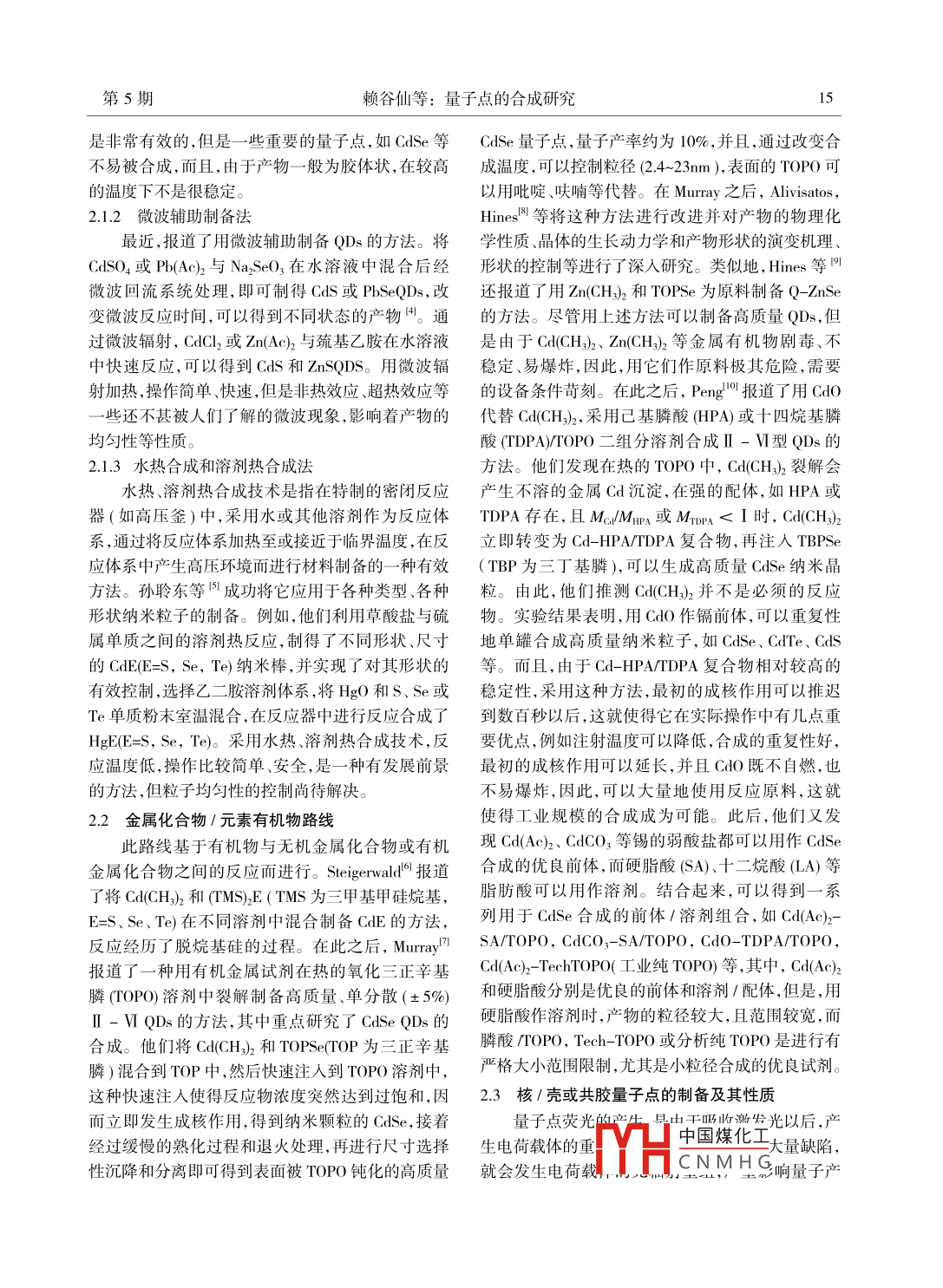 第42卷第5期化工技術(shù)與開(kāi)發(fā)Vol.42 No.52013年5月Technology & Development of Chemical IndustryMay.2013量子點(diǎn)的合成研究賴谷仙,戴日強(qiáng)(茂名職業(yè)技術(shù)學(xué)院化學(xué)工程系,廣東茂名525000)摘要: 量子點(diǎn)(半導(dǎo)體納米晶)是納米尺度的微小發(fā)光粒子。作為新型的生物標(biāo)記試劑,具有比傳統(tǒng)的有機(jī)染料更好的光譜特性和光學(xué)穩(wěn)定性。本文對(duì)量子點(diǎn)的光學(xué)性質(zhì)、制備方法做一-簡(jiǎn) 要綜述。關(guān)鍵詞:量子點(diǎn);熒光光譜;合成中圖分類號(hào): 0657文獻(xiàn)標(biāo)識(shí)碼: A文章編號(hào): 199052013)05-0014-03隨著基因組學(xué)和蛋白質(zhì)組學(xué)研究的深入開(kāi)展,布于表面的原子就越多,而表面的光激發(fā)的正電子產(chǎn)生了越來(lái)越多的生物學(xué)數(shù)據(jù),生命科學(xué)研究正在或負(fù)電子受鈍化表面的束縛作用就越大,其表面束經(jīng)歷從探究式方法向以數(shù)據(jù)為基礎(chǔ)的研究方式轉(zhuǎn)縛能就越高,吸收的光能也越高,即存在量子尺寸效變,生物學(xué)數(shù)據(jù)的采集、處理和運(yùn)用方法的改進(jìn)和創(chuàng)應(yīng)(quantum size effect) ,從而使其吸收帶藍(lán)移,熒光新也就越來(lái)越迫切"。在生命科學(xué)中,熒光光譜學(xué)發(fā)射峰位也相應(yīng)藍(lán)移。主要是通過(guò)研究分析生物大分子本身具有的熒光發(fā)2量子點(diǎn)的合成色團(tuán)(稱為內(nèi)源熒光探針)或通過(guò)標(biāo)記的外源熒光發(fā)色團(tuán)(稱為外源熒光探針),結(jié)合各種有關(guān)的熒光量子點(diǎn)的制備根據(jù)所采用的原料和工藝的不方法和技術(shù)來(lái)獲得生物大分子結(jié)構(gòu)、功能相互作同,大致可分為水相無(wú)機(jī)合成路線和金屬化合物1用等信息。現(xiàn)在,從艾滋病病毒的檢測(cè)到人類基因元素有機(jī)物路線。制備過(guò)程中產(chǎn)物的形成都可以分組的測(cè)序,從蛋白質(zhì)溶液構(gòu)象到細(xì)胞內(nèi)部活動(dòng)的研為快速的成核和緩慢的生長(zhǎng)過(guò)程兩個(gè)步驟,其中生究等都廣泛地用到熒光探針。因此,熒光探針在生長(zhǎng)過(guò)程經(jīng)歷奧斯特瓦斯特熟化過(guò)程,即不穩(wěn)定的小.命科學(xué)研究中具有特別的重要性。近年來(lái)發(fā)現(xiàn)和發(fā)晶粒逐漸溶解,在較大、更穩(wěn)定的晶體上重結(jié)晶。展的熒光探針一-量子點(diǎn)(quantumdot,QD)引起了2.1無(wú)機(jī)合成路線物理學(xué)家、化學(xué)家、生物學(xué)家的特別興趣和關(guān)注,有2.1.1常規(guī)加熱沉淀法可能成為一種對(duì)生命科學(xué)發(fā)展起重要作用的熒光探.這種方法最初由La Mer等21提出,之后,針Rossetti 等[3I 在這方面,特別是在研究CdS的合成方面,做出了重要貢獻(xiàn)。研究結(jié)果表明,通過(guò)正確地1量子點(diǎn)的基本特性.選擇溶劑、pH、溫度和純化試劑,降低量子點(diǎn)的溶解量子點(diǎn)(quantum dot, QD)又可稱為半導(dǎo)體納米度,把快速的成核作用和慢的生長(zhǎng)過(guò)程嚴(yán)格分離開(kāi)微晶體(semiconductor nanocrysta1),是一-種由II - VI來(lái),提高樣品的單分散性,通過(guò)使用介電常數(shù)較低的族或II-V族元素組成的納米顆粒。目前研究較試劑或共聚物穩(wěn)定劑,提高膠體的穩(wěn)定性,可以有效多的主要是CdX(X=S、Se、Te)。量子點(diǎn)由于粒徑很地進(jìn)行量子點(diǎn)的合成。例如,用CdSO4和( NH4)2S小(約1~100nm),電子和空穴被量子限域,連續(xù)能溶液作反應(yīng)物,通過(guò)調(diào)節(jié)pH值來(lái)改變成核作用的帶變成具有分子特性的分立能級(jí)結(jié)構(gòu),因此光學(xué)行動(dòng)力學(xué),合成了大小可調(diào)的CdS QDs。另外,在-77C為與-些大分子(例如多環(huán)的芳香烴)很相似,可的低溫條件下,利用靜電雙層膜的斥力作用中斷附以發(fā)射熒光。量子點(diǎn)的體積大小嚴(yán)格控制著它的光聚,得到了粒徑約為3nm的Cds立方晶體和小于吸收和發(fā)射特征,晶體顆粒越小,比表面積越大,分2.0nm的ZnS立方晶體。盡管用這種路線合成CdS作者簡(jiǎn)介:賴谷仙( 1982-), 女,廣東茂名人,碩士,主要從事化學(xué)教學(xué)和量子點(diǎn)中國(guó)煤化工8801, E-mail:laiguxian@ 163.com十個(gè) HCNMHG收稿日期: 2013-03-04第5期賴谷仙等:量子點(diǎn)的合成研究15是非常有效的,但是一些重要的量子點(diǎn),如CdSe等CdSe量子點(diǎn),量子產(chǎn)率約為10% ,并且,通過(guò)改變合不易被合成,而且,由于產(chǎn)物一般為膠體狀,在較高成溫度,可以控制粒徑(2.4~23nm ),表面的TOP0可的溫度下不是很穩(wěn)定。以用吡啶、呋喃等代替。在Murray之后, Alivisatos,2.1.2微波輔助制備法Hines8l等將這種方法進(jìn)行改進(jìn)并對(duì)產(chǎn)物的物理化最近,報(bào)道了用微波輔助制備QDs的方法。將學(xué)性質(zhì)、晶體的生長(zhǎng)動(dòng)力學(xué)和產(chǎn)物形狀的演變機(jī)理、CdSO4或Pb(Ac)與Na2SeO3在水溶液中混合后經(jīng)形狀的控制等進(jìn)行了深入研究。類似地,Hines等(9微波回流系統(tǒng)處理,即可制得CdS或PbSeQDs,改還報(bào)道了用Zn(CH)2和TOPSe為原料制備Q-ZnSe變微波反應(yīng)時(shí)間,可以得到不同狀態(tài)的產(chǎn)物用。通的方法。盡管用上述方法可以制備高質(zhì)量QDs,但過(guò)微波輻射, CdCl2或Zn(Ac)2與巰基乙胺在水溶液是