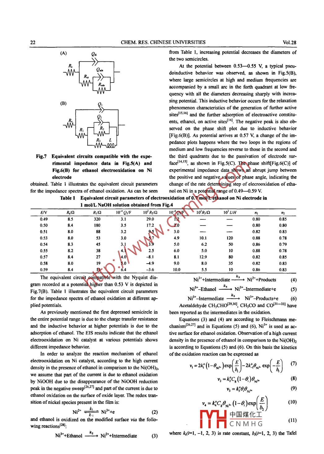 CHEM. RES CHINESE UNTVERSITTES 2012, 28(1), 19--25Electrochemical Impedance of Ethanol Oxidation inAlkaline mediaDANAEE Iman, JAFARIAN Majid, GOBAL Fereydoon, SHARAFI Mahboobeh' andMAHJANI Mohammad-ghasemL Abadan Faculty of Petroleum Engineering, Petroleum University of Technology, Abadan 63165-619, Iran;2. Department of Chemistry, K. N. Toosi University of Technology, Tehran 15875-4416, iran3. Department of Chemistry, Sharif University of Technology, Tehran 11365-9516, iranAbstract Nickel modified Niooh electrodes were used for the electrocatalytic oxidation of ethanol in alkalinelutions. The electro-oxidation of ethanol in a 1 molL Naoh solution at different concentrations of ethanol was stu-died by ac impedance spectroscopy. Electrooxidation of ethanol on Ni shows negative resistance on impedance plotsThe impedance shows different patterns at different applied anodic potential. The influence of the electrode potentialon impedance was studied and a quantitative explanation for the impedance of ethanol oxidation was given by meansof a proposed mathematical model. At potentials higher than 0.52 V(vs. Ag/AgCI), a pseudoinductive behavior wasobserved, but at those higher than 0.57 V, impedance pattems were reversed to the second and third quadrants. Theconditions required for the reversing of impedance pattern were delineated with the impedance modelKeywords Impedance; Equivalent circuit; Ethanol; Electrocatalytic; NickelArticle ID10059040(2012)-01-019071 Introductiontials, aiming at the elucidation of its reaction mechanism. Theanalysis of the theoretical impedance function provides imporIn the last decade, researches on the electrooxidation of tant information on the kinetic parameters. This informationsmall organic molecules have attracted considerable attentionallows the ElS spectrum simulation and therefore, predicts thedue to the development of direct liquid fuel cells, which re- system behavior with regard to the variation of the overpotenquires highly reactive fuels with high energy density and lowtoxicity]one of the most promising fuels due to its low toxicity, high 2 Methods and Materialsenergy density, biocompatibility and abundant availability)The major challenge for the utilization of ethanol as fuel is itsSodium hydroxide and ethanol used in this work werelow reactivity in the temperature range technically feasible forMerck products of analytical grade and were used without further purification. Doubly distilled water was used throughout.Some of the data on ethanol oxidation in an alkaline elec-Electrochemical studies were carried out in a conventionaltrolyte on platinum have been presented in the work!l in three electrode cell powered by an electrochemical systemwhich the authors observed the strong passivation of platinum comprising of an EG&G model 273 potentiostat/galvanostatand came to the conclusion about the necessity of developingand a Solartron model 1255 frequency response analyzer. Themore acceptable catalyst than platinum. In the furthsystem was run by a personal computer(PC)through M270 andwork(, 13). ethanol oxidation was studied in I mol/L KOHM389 commercial softwares via a general purpose interfacetitanium promoted by Ruo,/Ni system and glassy carbon bus(GPIB)interface. A frequency range of 100 kHz to 15 MHzcoated by RuNi nanoparticles. The activity of these catalystsand a modulation amplitude of 5 mv were employed for im-was low, and the starting potential of alcohol oxidation was pedance measurement. Fitting of experimental impedanceclose to 0.9V vs the reversible hydrogen electrode(RHE)spectroscopy data to the proposed equivalent circuit was doneElectrochemical impedance spectroscopy(EIS)is a good by means of home written least square software based on thetool to analyze the kinetics of electrode reactions. The advan- Marquardt method for the optimization of functions and Mac-tage of EIS over direct current(DC) techniques is that this donald weighting for the real and imaginary parts of the imsteady-state technique is capable of probing relaxation pheno-pedance 20 I. A dual Ag/AgCl-saturated KCl, a Pt wire and amena over a wide frequency range!+9)ni- ckel disk electrode were used as the reference, counter andThe purpose of this work is the analysis of impedanceorking electrodes, respectively. All the studies were carriedcharacteristics of electrooxidation of ethanol on Ni electrode in out at (298+2)Kelectrode was a pure nickel rod中國煤化工nt, the surfaceNaOH solution at different ethanol concentrations and poterCNMHG*Corresponding author. E-mail: mjafarian @kntu ac irReceived April 21, 2011; accepted August 30, 2011CHEM. RES CHINESE UNTVERSITIESVol 28pretreatment of working electrode was performed by hand poli-shing of the electrode surface with 0.05 mm alumina powder on目04a polishing microcloth and rinsed thoroughly with doubly dis-0tilled water prior to modification.0.1030.53 Results and discussionFig. I presents the consecutive cyclic voltammograms(Cv)of a nickel electrode in 1 mol/L Naoh solution recorded at a0potential sweep rate of 100 mV/s. In the first sweep, a pair ofredox peaks appeared at 492 and 429 mV vs. Ag/AgCl that areassigned to the Ni"/Ni redox couple according toFig2 Cyclie voltammograms of Ni electrode inNi(OHh+OHNiOOH+H2O+eI mol/L NaOH solution in the absence(a)In the subsequent cycles, both the anodiand presence(b)of 0.7 mol/L ethanolaks shifted negatively, stably pointing to higher ener.The potential sweep rate was 10 mV/s and the insetgies(potential)required for the nucleation of NiooH in the firstis the initial potential of ethanol oxidationcycle. The enhanced base line current of the first cycle wasThe electrocatalytic oxidation of ethanol occured not onlyassociated with the oxidation of Ni to Niin the anodic half cycle but also continued in the initial stage ofthe cathodic half cycle. Ethanol molecules adsorbed on the nispecies were oxidized at higher potentials, which was parallelto the oxidation of Nito Ni*species. The l