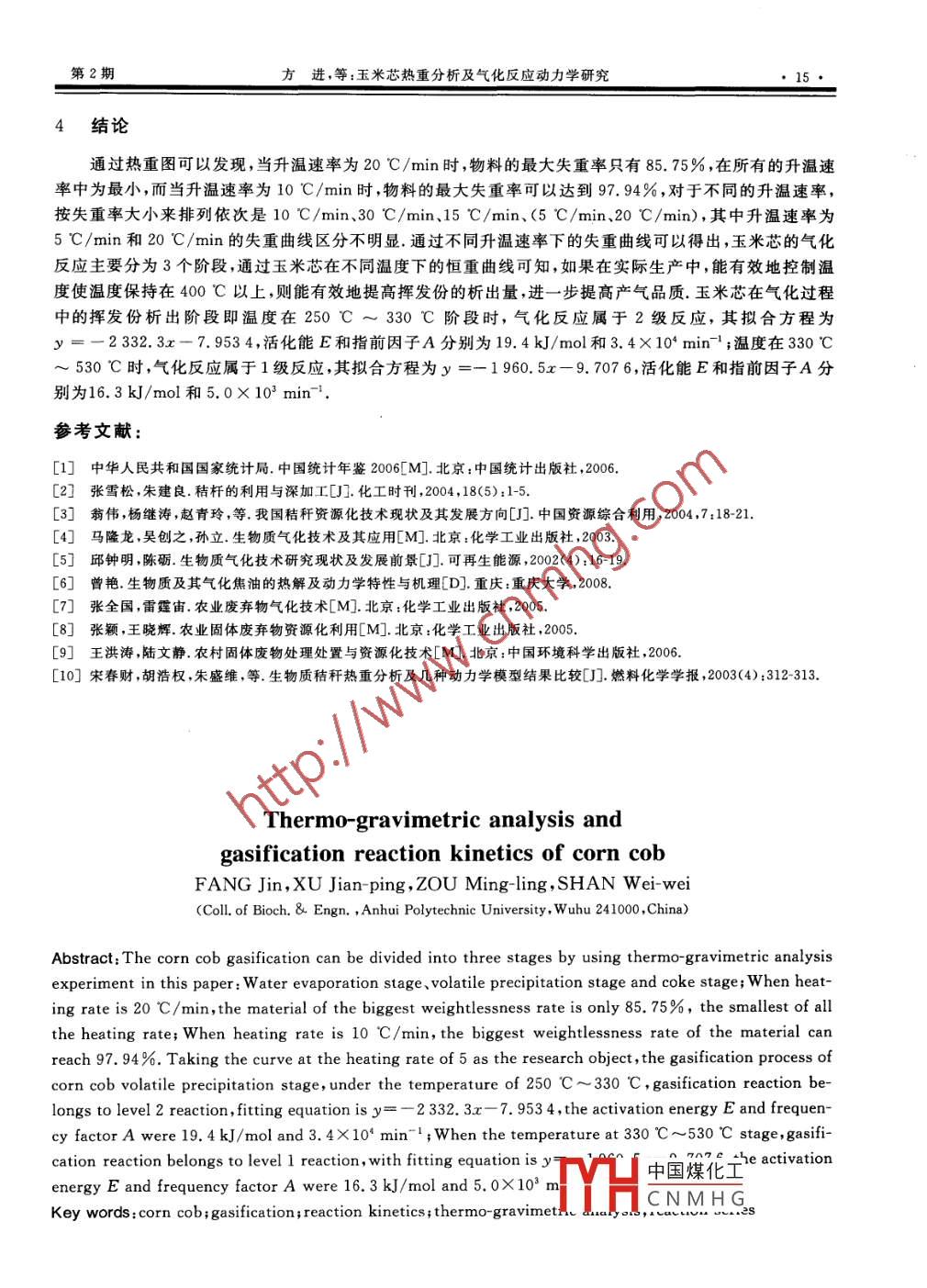 第27卷第2期安徽工程大學(xué)學(xué)報(bào)Vol 27. No. 22012年6月Journal of Anhui Polytechnic UniversityJun.,2012文章編號:16722-477(2012)020012-04玉米芯熱重分析及氣化反應(yīng)動(dòng)力學(xué)研究方進(jìn),徐建平,鄒明玲,單為為(安徽工程大學(xué)生物與化學(xué)工程學(xué)院,安徽蕪湖241000摘要:利用熱重分析實(shí)驗(yàn)得出玉米芯氣化可大致分為3個(gè)階段:水分蒸發(fā)、揮發(fā)分析出和焦炭階段研究表明,當(dāng)升溫速率為20℃/min時(shí),物料的最大失重率只有85.75%,在所有的升溫速率中最小;當(dāng)升溫速率為10℃/min時(shí),物料的最大失重率可達(dá)到97.94%.以升溫速率為5℃/min的熱重曲線研究玉米芯氣化過程中的揮發(fā)分析狀況,當(dāng)溫度在250℃~330℃時(shí),氣化反應(yīng)屬于2級反應(yīng),其擬合方程y=-2332.3x-7.9534,活化能E和指前因子A分別為19.4kJ/mol和3.4×104min-;溫度在330℃-530℃時(shí),氣化反應(yīng)屬于1級反應(yīng),其擬合方程y=-1960.5x-9.7076,活化能E和指前因子A分別為16.3kJ/mol和5.0×10min1關(guān)鍵詞:玉米芯;氣化;反應(yīng)動(dòng)力學(xué);熱重分析;反應(yīng)級數(shù)中圖分類號:X712文獻(xiàn)標(biāo)識(shí)碼:A據(jù)統(tǒng)計(jì)全世界年產(chǎn)農(nóng)作物秸稈約1000~2000億噸,我國每年達(dá)8億噸以上.除用于畜牧飼料、還田、工業(yè)原料和直接燃燒用于炊事外,還有大量的剩余,未利用的農(nóng)作物秸稈廢棄于田間、地頭,不僅占用大量土地,浪費(fèi)資源,造成環(huán)境嚴(yán)重污染,還成為農(nóng)村火災(zāi)的一大隱患3.生物質(zhì)氣化技術(shù)是一種熱化學(xué)處理技術(shù),通過氣化爐將固態(tài)生物質(zhì)轉(zhuǎn)換為使用方便且清潔的可燃?xì)怏w,用作燃料或生產(chǎn)動(dòng)力45.因此,對農(nóng)作物秸稈資源的有效開發(fā)利用,不僅能緩解能源短缺的現(xiàn)狀,節(jié)約大量的化石燃料,而且,對我國能源結(jié)構(gòu)的改善、促進(jìn)社會(huì)經(jīng)濟(jì)的可持續(xù)發(fā)展和生態(tài)環(huán)境保護(hù)具有重大意義.本文對玉米芯進(jìn)行熱重分析6,實(shí)驗(yàn)并進(jìn)一步研究其反應(yīng)動(dòng)力學(xué)模型,求出熱分解過程的反應(yīng)活化能E及指前因子A.1實(shí)驗(yàn)部分1.1實(shí)驗(yàn)材料由于玉米芯的產(chǎn)量比較大,其氣化后的熱值非常高.故本實(shí)驗(yàn)所選用的實(shí)驗(yàn)材料是經(jīng)自然風(fēng)干的玉米芯(含水率為13.26%),如表1所示,通過粉碎機(jī)將其粉碎,用24目和60目篩子過篩,取24~60目部分為測試樣品(保證樣品粒徑相同)表1玉米芯的主要元素成分79C/%H/%O/%N/%s/%46.3~47.15.6~5.837.8~38.30.57~0.590.12~0.151.2儀器及實(shí)驗(yàn)條件熱重分析儀:DSC/ DTA-TGA同步熱分析儀,SDTQ600;所有樣品的實(shí)驗(yàn)氣氛都采用純度為99%的N2,其保護(hù)氣流量為10mL/min、吹哨氣流量為50mL/min.熱重實(shí)驗(yàn)主要有2個(gè)部分:(1)線性升溫將玉米芯分別以5℃/min、10℃/min、15℃/min、20℃/min、30℃/min,加熱到1000℃,得出熱重分析圖;(2)恒溫升溫將玉米芯分別在200℃、250℃、300℃、350℃、400℃下恒溫4h,觀察熱重分析圖2結(jié)果與討論2.1不同升溫速率下的失重曲線將玉米芯在以5℃/min、10C/min、15C/min、20℃/min30℃/min加熱到1000℃,得到其在不同升溫速率下的熱失重曲線(見圖1).由圖1可知,對于不同升溫速率,物料的熱解過程一般都分為3個(gè)階段,物料隨著熱解溫度的上升,物料內(nèi)的自由水開始慢慢失去.收稿日期:2011-10-20TH中國煤化工水蒸發(fā)趨勢開CNMHG作者簡介:方進(jìn)(1986-),男,安慶樅陽人,碩士研究生通訊作者:徐建平(1957-),男,江蘇如皋人,教授,碩導(dǎo)第2期方進(jìn),等:玉米芯熱重分析及氣化反應(yīng)動(dòng)力學(xué)研究13始放緩,當(dāng)溫度達(dá)到250℃時(shí),物料內(nèi)的自由水基本蒸發(fā)完全.隨著物料溫度的進(jìn)一步上升,物料內(nèi)的揮發(fā)份開始析出20℃/min在250℃~330℃范圍內(nèi),物料的揮發(fā)份析出速率非???隨著溫度的進(jìn)一步上升,物料的揮發(fā)份析出速率開始放緩,放緩區(qū)間在330℃~530℃.當(dāng)溫度達(dá)到530℃后,揮發(fā)份基本6008001000溫度T℃完全析出,剩下的部分是碳.對于不同的升溫速率來說,物料圖1玉米芯在不同升溫速率下的失重曲線的熱重曲線整體趨勢基本相同,物料內(nèi)的自由水蒸發(fā)部分基本相同,而揮發(fā)份的析出部分有一些差別.由圖1可知,當(dāng)升溫速率為20℃/min時(shí),物料的最大失重率只有85.75%,在所有的升溫速率中為最小,而當(dāng)升溫速率為10℃/min時(shí),物料的最大失重率可以達(dá)到97.94%.在以后的生產(chǎn)實(shí)踐中,我們可以通過控制物料的升溫速率為10℃/min,以使得物料能析出最大的揮發(fā)份,大大提高可燃?xì)獾馁|(zhì)量般情況下,隨著升溫速率的增大,試樣失重曲線將向高溫側(cè)移動(dòng),這是因?yàn)樯郎厮俾什煌?熱量由外向內(nèi)傳遞的速度就不同.升溫速率慢,試樣有充分的時(shí)間接收熱量;升溫速率快試樣來不及吸收熱量使得其熱解溫度將向高溫區(qū)移動(dòng).在本實(shí)驗(yàn)中,由于試樣的量非常少,其傳熱基本在一瞬間完成.另外,由于實(shí)驗(yàn)和儀器誤差,故上述規(guī)律沒有在本實(shí)驗(yàn)中反映出來2.2不同溫度下的恒重曲線100200℃將玉米芯在200℃、250℃、300℃、350℃、400℃下恒溫0℃400℃4h,得到恒溫?zé)嶂貓D(