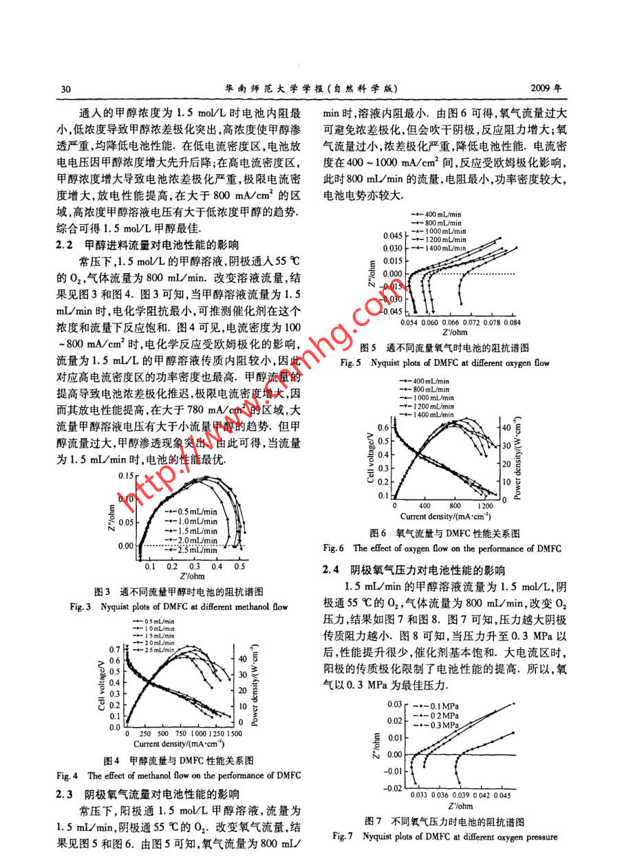 華南師范大學(xué)學(xué)報(bào)(自然科學(xué)版)2009年11月JOURNAL OF SOUTH CHINA NORMAL UNIVERSITY第28屆全國(guó)化學(xué)與物理電源Nov. 2009(NATURAL SCIENCE EDITION)學(xué)術(shù)年會(huì)論文選.上(增刊)文章編號(hào): 1000 - 5463(2009)S1 -0029 -04直接甲醇燃料電池運(yùn)行參數(shù)的研究劉桂成,王同濤,馬傲冬,王新東,葉鋒(北京科技大學(xué)治金與生態(tài)工程學(xué)院,北京10083)摘要:以載量均為4 mg/cm2的Pt- Ru黑和Pt黑分別為陽(yáng)極、陰極催化劑,以碳布為擴(kuò)散層,以Naficn115為質(zhì)子交換膜,制備膜電極,組裝直接甲醇燃料電池并通過(guò)恒電位法和交流阻抗法分別測(cè)試性能和阻抗.研究考察了各種工藝參數(shù)對(duì)電池電化學(xué)性能的影響,得出55 C下最佳工藝參數(shù)為:甲醇濃度為1.5 mol/L、流量為1. 5mL/min時(shí)陽(yáng)極反應(yīng)達(dá)到最優(yōu),氧氣壓力在0.3 MPa.流量在800 mL/min時(shí)陰極反應(yīng)達(dá)到最佳.關(guān)鍵詞:直接甲醇燃料電池;電化學(xué)性能;膜電極中圖分類號(hào):TM11.4文獻(xiàn)標(biāo)識(shí)碼:A直接甲醇燃料電池(DMFC)是一種通過(guò)甲醇和氧氣在兩極發(fā)生氧化還原反應(yīng)產(chǎn)生電能的裝置.2結(jié)果與討論因優(yōu)點(diǎn)顯著,其商業(yè)化備受關(guān)注[1-21.本文制備出2.1甲醇進(jìn)料濃 度對(duì)電池性能的影響在較低溫度(55 C)下運(yùn)行的DMFC,考察了各種運(yùn)反應(yīng)物為甲醇和氧氣,氣體流量暫定800行參數(shù).mL/min,甲醇溶液流量暫定1. 0 mL/min.改變進(jìn)料濃度,結(jié)果見(jiàn)圖1和圖2.1實(shí)驗(yàn).015p -- 1.0mol/L0.010- -- 1.5 mol/L1.1膜電極( MEA)的制備0.005-- 2 0 mol/L以載量均為4 mg/cm' 的Pt - Ru黑( Johnson0.000Matthey公司)和Pt黑(Johnson Matthey 公司)分別N -0.005-0.010為陽(yáng)、陰極催化劑,加入正丙醇和w( Nafion) =5%的溶液( Aldrich化學(xué)有限公司)制成漿料.以Nafion-0.010.051 0.054 0.057 0.060 0.063Z'/ohm115膜(杜邦公司)為質(zhì)子交換膜,以PTFE膜為轉(zhuǎn)圖1通不同濃 度甲醉時(shí)電池的阻抗介質(zhì),在135 C 7.2 MPa熱轉(zhuǎn)壓150 s,制成CatalystFig.1 Nyquist plots of DMFC at dferent methanol concentation- Coated Membrane. 以碳布(Toray公司)為擴(kuò)散層,- L.0mol/L陰極擴(kuò)散層使用PTFE溶液疏水處理,熱壓制成0.6-- 1.5 mol/L+40室i -- 2.0mol/LMEAI.弓0.5H30P 0.41.2電池的組裝 、活化和測(cè)試-20g 0.3-將MEA密封在兩塊有效面積為5 cm2的石墨元0.2-流場(chǎng)板中央.流場(chǎng)板兩側(cè)分別依次加上集流板、絕. 0.1緣片和端板,夾緊,組裝成電池.通入低濃度甲醇水0.,0 200 400 600 800 0002000Current density/(mA^cm)溶液,小電流放電活化9 h后,在VMP2型電化學(xué)綜合測(cè)試系統(tǒng)(普林斯頓公司)上分別采用恒電位穩(wěn)圖2甲醇濃度與DMFC性能關(guān)系圖態(tài)極化法和交流阻抗法測(cè)試55C下電池的性能和Fig.2 The efect of methanol concentation on the performance阻抗of DMFC收稿日期: 2009-10-19基金資助:國(guó)家863計(jì)劃資助項(xiàng)目(2007 AA05Z150) ;國(guó)家自然科學(xué)基金資助項(xiàng)目(50528404)作者簡(jiǎn)介:劉桂成(1983 - ) ,男,河北人,北京科技大學(xué)博士研究生,主要研究方向:直接甲醇燃料電池, Email:!og67@ 163. com.30華南師范大學(xué)學(xué)報(bào)(自然科學(xué)版)2009年通人的甲醇濃度為1.5 mol/L時(shí)電池內(nèi)阻最min時(shí),溶液內(nèi)阻最小,由圖6可得,氧氣流量過(guò)大小,低濃度導(dǎo)致甲醇濃差極化突出,高濃度使甲醇滲可避免濃差極化,但會(huì)吹千陰極,反應(yīng)阻力增大;氧透嚴(yán)重,均降低電池性能.在低電流密度區(qū),電池放氣流量過(guò)小,濃差極化嚴(yán)重,降低電池性能.電流密電電壓因甲醇濃度增大先升后降;在高電流密度區(qū),度在400~1000mA/em2間,反應(yīng)受歐姆極化影響,甲醇濃度增大導(dǎo)致電池濃差極化嚴(yán)重,極限電流密此時(shí)800 mL/min的流量,電阻最小,功率密度較大,度增大,放電性能提高,在大于800 mA/cm2的區(qū)電池電勢(shì)亦較大.域,高濃度甲醇溶液電壓有大于低濃度甲醇的趨勢(shì).-- 400 mL/min綜合可得1. 5 mol/L甲醇最佳.0.045卜- 1200mLUmin2.2甲醇進(jìn)料流量對(duì)電池性能的影響0.030 t -←- 1400mL/mn常壓下,1.5 mol/L的甲醇溶液,陰極通人55 C0.015的02 ,氣體流量為800 mL/min.改變?nèi)芤毫髁?結(jié)N -0.015果見(jiàn)圖3和圖4.圖3可知,當(dāng)甲醇溶液流量為1.5-0.030mL/min時(shí),電化學(xué)阻抗最小,可推測(cè)催化劑在這個(gè)-0.0450.054 0.060 0.066 0.072 0.078 0.084濃度和流量下反應(yīng)飽和.圖4可見(jiàn),電流密度為100~800mA/cm2*時(shí),電化學(xué)反應(yīng)受歐姆極化的影響,圖5通不同流量氧 氣時(shí)電池的阻抗譜圖流量為1.5mL/L的甲醇溶液傳質(zhì)內(nèi)阻較小,因此Fig.5 Nyquist plots of DMFC at diferent oaxygen flov對(duì)應(yīng)高電流密度區(qū)的功率密度也最高.甲醇流量的-- 400mL/min提高導(dǎo)致電池濃差極化推遲,極限電流密度增大,因-- 800 mL/min-- 1000 mUmin而其放電性能提高,在大于780 mA/cm2的區(qū)域,大-- I 200 mL/min流量甲醇溶液電壓有大于小流量甲醇的趨勢(shì).但甲0.640號(hào)醇流量過(guò)大,甲醇滲透現(xiàn)象突出。由此可得,當(dāng)流量為1.5mL/min時(shí),電池的性能最優(yōu)03-0.2-10復(fù)0.10-1- 0.5 mL/minCurent density/(mA.cm)員0.05+- 1.0mLmin1.5 mL/min圖6氧氣流量與DMFC性能關(guān)系圖一2.0mL/min0.00 ------.3“--“-Fig.6 The efet of oxygen flow on the performance of DMFC0.1 0.2_ 0.3