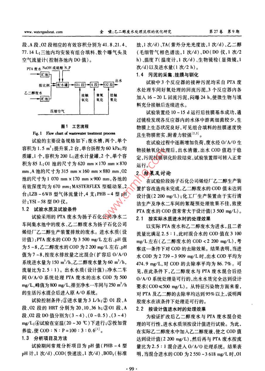 第27卷第9期中國給水排水Vol 27 No 920l年5月CHINA WatER WASTEWATERMay 2011乙二醇廢水處理流程的優(yōu)化研究金嘯(揚子石化HSE部環(huán)境保護研究所,江蘇南京210048)摘要:對揚子石化水廠乙二醇廢水的處理流程進行優(yōu)化試驗,研究了乙二醇廢水與PTA廢水混合處理的可行性。結(jié)果表明,無論是按實際水質(zhì)混合進水還是按設計值混合進水,采用O′№/O系統(tǒng)處理PTA廢水與乙二醇廢水的混合水是可行的,出水水質(zhì)完全達到設計要求(COD≤500mg/L),而且乙二醇廢水的混入并未對系統(tǒng)處理門TA廢水產(chǎn)生較大影響。此外,通過試驗還發(fā)現(xiàn)0/AO系統(tǒng)具有良妤的抗乙二醇負荷沖擊能力,乙二醇廢水具有較好的可生化性。關鍵詞:乙二醇廢水;PTA廢水;處理流程優(yōu)化中圖分類號:X703文獻標識碼:C文章編號:1000-4602(2011)09-0098-03Study on Optimization of Glycol Wastewater Treatment ProcessJⅠNXiaEnvironmental Protection Research Institute of HSE Department, SINOPEC YangziPetrochemical Co. Ld, Nanjing 210048, ChinaAbstract: The optimization experiment of glycol wastewater treatment process of YpC was per-formed, and the feasibility of treating the mixture of glycol wastewater and purified terephthalic acid(PTA)wastewater was studied. The results show that it is feasible to use the O/A/0 system for treatingthe mixture of glycol wastewater and PTA wastewater, regardless of mixing the influent according to theactual wastewater quality or the design value. The effluent COD is equal to or less than 500 mg/L, meeting the design requirements. Moreover, the mixed glycol wastewater does not affect the treatment of PTAwastewater greatly. In addition, the experiment also shows that the O/A/O system has better resistance toglycol load shock, and the glycol wastewater has better biodegradability.Key words: glycol wastewater; PTA wastewater: optimization of treatment process揚子石化公司凈水一車間主要掃負著處理各生PTA廢水混合處理,以避免乙二醇廢水對凈水一車產(chǎn)裝置排放的低濃度廢水(COD≤650mg/L)的任間的沖擊使公司整個廢水處理系統(tǒng)平穩(wěn)、合理地運務由于受到乙二醇廢水(COD值高達2200mg/L行,提高出水水質(zhì)減少廢水超標排放量。左右)的沖擊,導致出水水質(zhì)不達標,給生產(chǎn)操作及試驗裝置及方法管理帶來不便。乙二醇裝置擴改后,廢水排放量將1.1試驗裝置有所增加,使上述問題更加突出。凈水二車間是處模擬揚子石化公司水廠凈水二車間擴容改造后理化工廠FTA、醋酸、乙醛這3套生產(chǎn)裝置排放的高的PA廢水處理流程(見圖1),TA廢水和乙二醇濃度廢水的車間。本著清污分流、高濃度廢水相對廢水按一定的流量比進行混合。試驗采用O/AO集中處理的原則,合理地利用現(xiàn)有廢水處理裝置優(yōu)法處理PTA廢水及乙二醇廢水,O1段與A段的容化揚子石化公司廢水處理流程,充分發(fā)揮其處理潛積比為2:1;O1段、A段和02段的水力停留時間力,擬利用凈水二車間現(xiàn)有各裝置將乙二醇廢水與(HRT)分別為20、10和36h;進水規(guī)模為3L/h,Olwww.watergasheat.com金嘯:乙二醇廢水處理流程的優(yōu)化研究第27卷第9期段、A段、02段相應的有效容積分別為41.8、21.4、法,1次/d)、TA(紫外分光光度法,1次/d)、乙二醇77.14L;三池內(nèi)均安裝有組合填料數(shù)個曝氣頭及(毛細管氣相色譜法,1次/d)、DO(DO儀,1次/2空氣流量計(控制各池內(nèi)DO值)。h)、溫度T(溫度計,1次/d)、生物鏡檢(顯微鏡,1PTA廢水NOH或硫根NP次/d)以及進水量(1次/2h)1貯池1.4污泥的釆集、掛膜與馴化出水按比例下配水罐}一段段段試驗中3個反應器的接種污泥均采自PTA廢乙二醇廢水水處理車間好氧處理的回流污泥,3個反應器內(nèi)各池接觸襲氧接觸氧化氧化氧化加入16~20L回流污泥,悶曝24h,使微生物與填料充分接觸后連續(xù)進水。壓縮空氣試驗裝置經(jīng)10~15d運行后掛膜基本成功通過鏡檢發(fā)現(xiàn)各反應器內(nèi)的水體中游離細菌較少,生圖1工藝流程物膜上生態(tài)狀況良好,可見組合填料的掛膜速度快Fig. 1 Flow chart of wastewater treatment process且生物膜密實、附著力較強23。試驗的主要設備規(guī)格如下:廢水槽,兩個,單個在試驗過程中逐漸增加負荷,廢水經(jīng)O/MO生容積為1.5m;提升泵,2臺,單臺揚程為6P;均物接觸氧化處理后,出水清澈,出水COD值趨于穩(wěn)質(zhì)罐,個,容積為20L;進水計量罐2個,單個容定,污泥掛膜馴化階段結(jié)束,試驗裝置即可轉(zhuǎn)入正常積為851;01池的尺寸為620mmx170mmx870運行mmA池的尺寸為315mm×160m×80mm、022結(jié)果及討論池的尺寸為1070mmx170mmx900mm,各池的在試驗階段揚子石化公司烯烴廠乙二醇生產(chǎn)裝有效深度均為670mm; MASTERFLEX型蠕動泵,2置擴容改造尚未完成,乙二醇廢水的COD值未達到臺LZB-6WB型氣體流量計4支;PHB-4型pH設計值(2200mg/);化工廠生產(chǎn)裝置由于實行清計;YSI-58型DO儀。潔生產(chǎn)及凈水二車間的絮凝預處理效果不佳,致使1.2試驗水質(zhì)及試驗條件PTA廢水的COD值常常大于設計值(3500mg/L)。試驗采用的PA廢水為揚子石化公司凈水二21按實際水質(zhì)進水時的處理效果車間集水池中的廢水、乙二醇廢水為揚子石化公司以實際PTA廢水和乙二醇廢水為進水,且二者烯烴廠乙二醇生產(chǎn)裝置排放的廢水。進水水質(zhì)(設流量比滿足2.5:1,此時混合水的COD值在3100計值):PTA廢水的COD為3500mL左右pH值mg/L左右(乙二醇廢水的COD<20mg/L),考為5-8,乙二醇廢水的COD為2200mg/L左右察這一條件下對COD的去除效果。結(