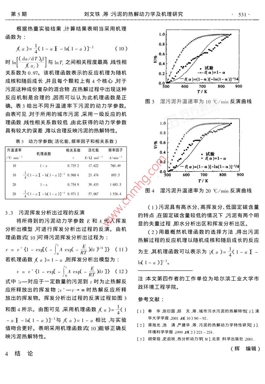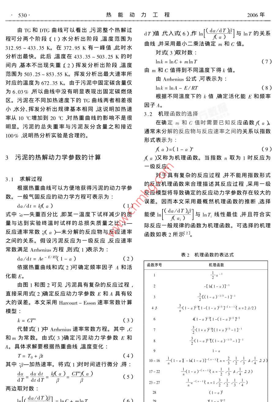 第21卷第5期熱能程ol. 21 No. 52006年9月JOURNAL OF ENGINEERING FOR THERMAL ENERGY AND POWERSep.,2006文章編號(hào)1001-2060(200605-0529-03污泥的熱解動(dòng)力學(xué)及機(jī)理研究劉文鐵王淑彥陸慧林崔崇威〔哈爾濱工業(yè)大學(xué)能源科學(xué)與工程學(xué)院黑龍江哈爾濱150000摘要利用綜合熱分析儀對(duì)污水處理廠原始污泥進(jìn)行了熱因此與煤燃燒不同的是在污泥的燃燒過(guò)程中其分析實(shí)驗(yàn)獲得了不同升溫速率下污泥的TG和DrG曲線(xiàn)。高水分和高揮發(fā)分將對(duì)燃燒起主要作用而固定碳實(shí)驗(yàn)結(jié)果表明采用一級(jí)反應(yīng)模型預(yù)測(cè)污泥熱解特性具有一的影響較小。定的局限性。利用熱分析動(dòng)力學(xué)采用最概然機(jī)理函數(shù)選擇法提出了污泥熱解的機(jī)理函數(shù)為∫a)=(1-aI-l(1表1污泥的工業(yè)分析干燥基)α)]34分析獲得的污泥活化能E和指前因子A并給出了揮發(fā)分固定碳灰分結(jié)合水發(fā)熱量污泥熱解動(dòng)力學(xué)計(jì)算模型。AJ/% M,/% Q,/MJ kg40.8110.23關(guān)鍵詞污泥熱解機(jī)理函數(shù)中圖分類(lèi)號(hào):TK121文獻(xiàn)標(biāo)識(shí)碼:A2.2污泥的熱分析前言采用ZRY-2P型熱分析儀進(jìn)行熱重法(TG)和微商熱重法(DTG)分析試驗(yàn)采用10℃/min及20污泥的熱分解過(guò)程是污泥在氣化和燃燒過(guò)程中℃mn不同的加熱速率。典型的熱重曲線(xiàn)分別見(jiàn)的初始階段對(duì)污泥穩(wěn)定著火和燃燒過(guò)程有著重大圖1和圖2的影響。因此深入研究污泥的熱分解將增進(jìn)對(duì)污泥的各種轉(zhuǎn)換過(guò)程的理解對(duì)完善污泥的氣化和燃0燒過(guò)程的控制和設(shè)計(jì)有著一定的現(xiàn)實(shí)意義。DTG由于污泥的熱解過(guò)程非常復(fù)雜整個(gè)熱解過(guò)程2既有化學(xué)變化也包括各種物理現(xiàn)象和岀現(xiàn)許多物理化學(xué)過(guò)程的改變。盡管人們對(duì)污泥熱解做了大量的研究工作但是在熱解反應(yīng)機(jī)理方面仍然存在著許多模糊不清之處。已有對(duì)污泥熱解動(dòng)力學(xué)參數(shù)研008001000究時(shí)假設(shè)反應(yīng)過(guò)程為一級(jí)反應(yīng)研究污泥的熱解特T/K性-2。然而污泥是一種非均質(zhì)的復(fù)雜有機(jī)物物質(zhì)圖1污泥熱重分析曲線(xiàn)(10℃/min)的組合體其熱解特性是許多相互竟?fàn)幓蚱叫蟹磻?yīng)的綜合反映污泥的熱解過(guò)程及其化學(xué)動(dòng)力學(xué)參數(shù)必然與許多因素有關(guān)。所以,尋找這些影響因素與熱解動(dòng)力學(xué)之間的關(guān)系就顯得特別重要。DTG402污泥熱解特性的實(shí)驗(yàn)研究2.1污泥的靜態(tài)特性實(shí)驗(yàn)所用試樣取自大慶城市污水處理廠。污泥6008001000的工業(yè)分析結(jié)果表明水分含量為82.10%,其干燥基工業(yè)分析數(shù)據(jù)如表1所示。由表可見(jiàn)污泥具有圖2污泥熱重分析曲線(xiàn)(20℃/min)高水分,干基揮發(fā)分較高而固定碳含量較低的特點(diǎn)。收稿日期2003-12-29;修訂日期2006530·熱能動(dòng)力工程2006年由TG和DrG曲線(xiàn)可以看出,污泥整個(gè)熱解過(guò)程可分兩個(gè)階段〔1)水分析出階段,溫度范圍為dT雁值代入式(6)作ln(dodT21與mT的關(guān)系312.954335K。在372.95K有一峰值,此時(shí)水曲線(xiàn)并采用最小二乘法確定m和C值。分析出最快。此后溫度在433.35~503.25K的時(shí)對(duì)式(3取對(duì)數(shù)間內(nèi)基本不出現(xiàn)失重〔2)揮發(fā)分析出階段,溫度Ink= InC+ mIn T(7)范圍為503,25~853.55K。揮發(fā)分析出最大速率所田m和C值得到不同溫度下得k值。對(duì)應(yīng)的溫度為672.35K。由于污泥中固定碳含量?jī)H由 Arrhenius公式可表示為為6.03%所以曲線(xiàn)中沒(méi)有明顯表現(xiàn)出固定碳燃燒Ink=InA-E/RT區(qū)。污泥在不同加熱速度下的TG曲線(xiàn)兩者相差很根據(jù)不同溫度下的k值確定活化能E和頻率小水分、揮發(fā)分析出規(guī)律基本相同這說(shuō)明加熱速因子A。率從10℃增加到20℃,對(duì)熱重曲線(xiàn)的影響不是很3.2機(jī)理函數(shù)的選擇明顯。污泥的總失重率與污泥灰分含量之和接近在確定m和C值時(shí)需要已知反應(yīng)函數(shù)f(ab100%說(shuō)明熱分析實(shí)驗(yàn)是合理的。通常未分解的反應(yīng)物與反應(yīng)速率之間的關(guān)系以指數(shù)形式表示為f a)=(l-a y3污泥的熱解動(dòng)力學(xué)參數(shù)的計(jì)算a)又稱(chēng)為機(jī)理函數(shù)。當(dāng)指數(shù)n取為1時(shí)反應(yīng)為級(jí)反應(yīng)3.1求解過(guò)程對(duì)于具有復(fù)雜的反應(yīng)過(guò)程并不能用指數(shù)形式根據(jù)熱重曲線(xiàn)可以方便地獲得污泥的動(dòng)力學(xué)參的反應(yīng)機(jī)理函數(shù)來(lái)合理描述其反應(yīng)過(guò)程采用一級(jí)數(shù)。一般氣固反應(yīng)的動(dòng)力學(xué)方程可表示為反應(yīng)模型將導(dǎo)致確定的反應(yīng)動(dòng)力學(xué)參數(shù)存在較大的da/dt=kf a)(1)誤差。因而本文采用最概然機(jī)理函數(shù)的推斷選擇式中一失重百分比即某一溫度下試樣減少的質(zhì)能使(①)]與x線(xiàn)性最佳并且符合實(shí)量與達(dá)到實(shí)驗(yàn)終溫時(shí)試樣的總損失質(zhì)量之比;一際反應(yīng)一般規(guī)律的函數(shù)為機(jī)理函數(shù)??蛇x擇的機(jī)理反應(yīng)速率常數(shù)a)末分解的反應(yīng)物與反應(yīng)速率