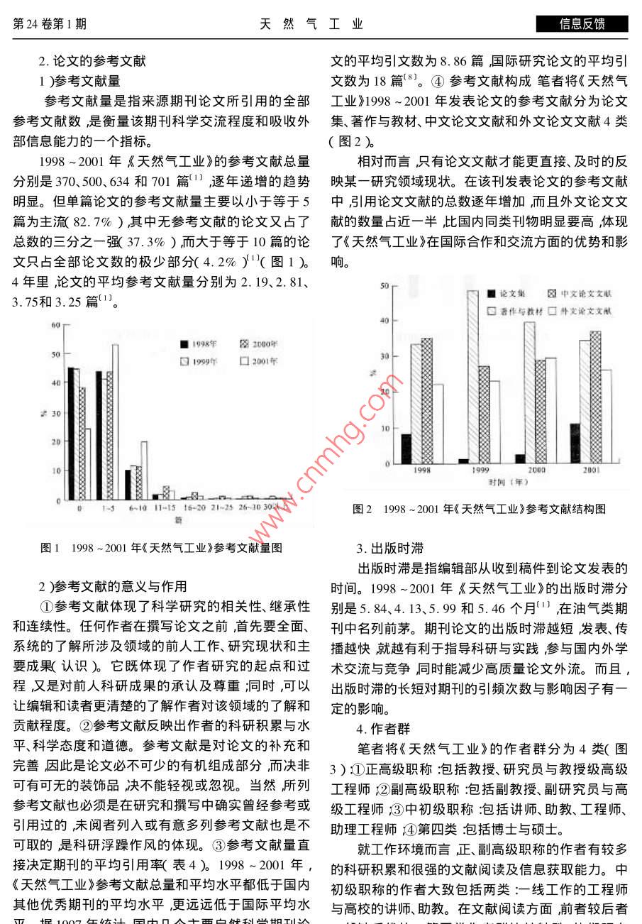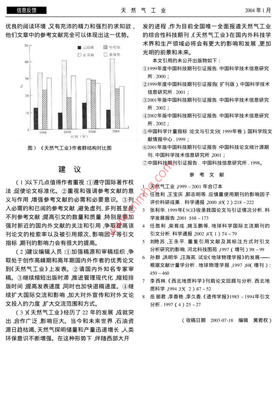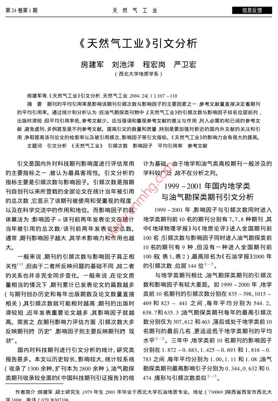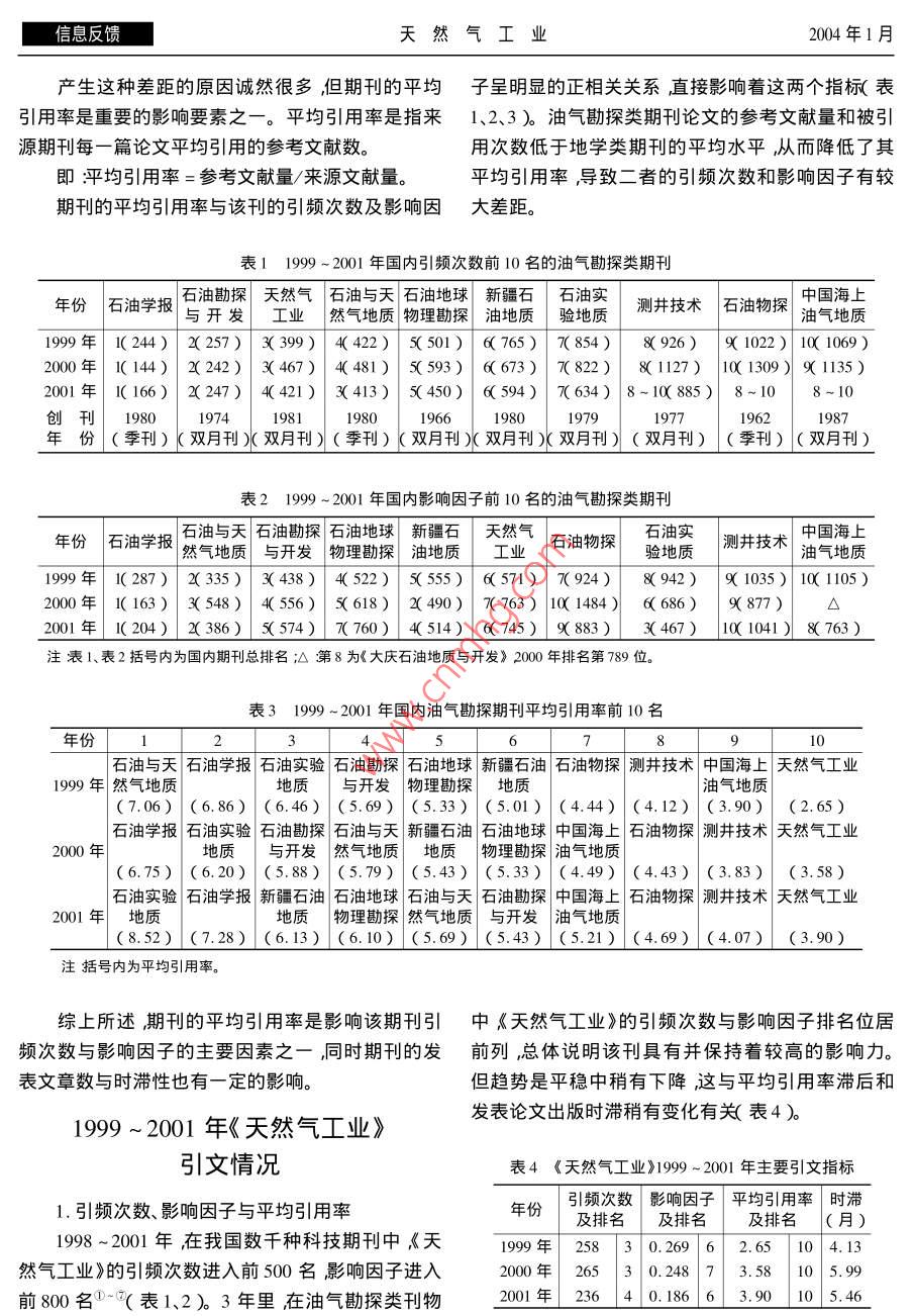 第24卷第1期天然氣工業(yè)信息反饋《天然氣工業(yè)》引文分析房建軍劉池洋程宏崗嚴(yán)衛(wèi)宏(西北大學(xué)地質(zhì)學(xué)系)房建軍等.《天然氣工業(yè)》引文分析.天然氣工業(yè)2004 24( 1 ):107-110摘要期刊的平均引用率是影響該期刊引頻次數(shù)與影響因子的主要因素之一參考文獻(xiàn)量直接決定著期刊的平均引用率。通過(guò)統(tǒng)計(jì)和分析認(rèn)為在油氣勘探類(lèi)刊物中《天然氣工業(yè)》的引頻次數(shù)與影響因子排名位居前列,出版時(shí)滯短;但平均引用率低、參考文獻(xiàn)少。應(yīng)當(dāng)強(qiáng)調(diào)和重視參考文獻(xiàn)的意義與作用列入必需的和已閱的參考文獻(xiàn)避免虛列、多例甚至是不列參考文獻(xiàn)。提高引文的數(shù)量和質(zhì)量特別是要加強(qiáng)對(duì)新近的國(guó)內(nèi)外文獻(xiàn)的關(guān)注和引用爭(zhēng)取提高該刊論文的檢索率以及被引用頻次、影響因子等引文指標(biāo)?!短烊粴夤I(yè)》的影響力會(huì)有很大的提高。主題詞引文分析 《天然氣工業(yè)》 引頻次數(shù)影響因子平均引用率參考文獻(xiàn)引文是國(guó)內(nèi)外對(duì)科技期刊影響度進(jìn)行評(píng)估常用計(jì)為基礎(chǔ)。由于地學(xué)和油氣類(lèi)高校期刊一般涉及的的主要指標(biāo)之一被認(rèn)為最具客觀性。引文分析的學(xué)科較廣泛故不在分析之列。指標(biāo)主要是引頻次數(shù)與影響因子。引頻次數(shù)是指期1999 ~ 2001年國(guó)內(nèi)地學(xué)類(lèi)刊自創(chuàng)刊以來(lái)所登載的全部論文在統(tǒng)計(jì)當(dāng)年被引用的總次數(shù),它顯示了該期刊被使用和受重視的程度,與油氣勘探類(lèi)期刊引文分析以及在科學(xué)交流中的作用和地位。而影響因子的具1999 ~ 2001年,影響因子與引頻次數(shù)同時(shí)進(jìn)入體算法為:影響因子=該刊前兩年發(fā)表論文在統(tǒng)計(jì)地學(xué)類(lèi) 期刊前10名的期刊分別有7、7.8種期刊其當(dāng)年被引用的總次數(shù)/該刊前兩年發(fā)表論文總數(shù)。.中《地球物理學(xué)報(bào)》與《地質(zhì)論評(píng)》進(jìn)入全國(guó)期刊前通常期刊影響因子越大其學(xué)術(shù)影響力和作用也越100 名引頻次數(shù)與影響因子同時(shí)進(jìn)入油氣勘探類(lèi)前大。10名的期刊有9種,但沒(méi)有一種進(jìn)入全國(guó)期刊前一般來(lái)說(shuō)期刊的引頻次數(shù)與影響因子具正相100名( 表1、表2 ) ,最高排名為《石油學(xué)報(bào)》2000年關(guān)性'3)但由于二者所反映問(wèn)題的基礎(chǔ)不同故二者的引頻次數(shù) 位居144位° :。.的關(guān)系也并非完全同步變化。一般來(lái)說(shuō) ,在論文質(zhì)與地學(xué)類(lèi)期刊相比,油氣勘探類(lèi)期刊的引頻次量相當(dāng)?shù)那闆r下期刊累計(jì)已發(fā)表論文的篇數(shù)越多數(shù)和影響因子 有較大差距。如1999 ~2000年地學(xué)(與期刊創(chuàng)辦歷史和每年出版期數(shù)及論文數(shù)量直接類(lèi) 前10名期刊的引頻次數(shù)分別在835 ~ 398、1015 ~相關(guān))其引頻次數(shù)就可能相對(duì)越高;期刊的出版時(shí)469和823~441之間,每年平均分別為544.2、滯較短,近年發(fā)表重要論文越多,其影響因子就越658.7和635.3油氣勘探類(lèi)期刊每年的最高引頻次高。簡(jiǎn)言之在期刊影響力評(píng)估方面引頻次數(shù)大多數(shù)分別僅為 307、612和463落后或處于地學(xué)類(lèi)前10反映期刊的歷史”影響因子則主要反映期刊的現(xiàn)名期刊的最后幾名,更遠(yuǎn)遠(yuǎn)低于地學(xué)類(lèi)期刊的平均狀”。水平0一。三年中地學(xué)類(lèi)前10名期刊的影響因子國(guó)內(nèi)對(duì)科技期刊進(jìn)行引文分析的統(tǒng)計(jì)、研究類(lèi)分別在1. 872 ~0. 683、1. 425 ~0.693和1.816 ~0. .報(bào)告甚多。本文以歷史較長(zhǎng)、影響較大、統(tǒng)計(jì)較系統(tǒng)783之間每年平均分別為1.00、1.11和1.08油氣(收錄了1300余種、擴(kuò)刊本為2800余種)油氣勘探勘探類(lèi)期刊最高影響引子分別為0.344、0.632和0.類(lèi)期刊收錄較全面的《中國(guó)科技期刊引證報(bào)告》的統(tǒng)474情形與引頻次數(shù)類(lèi)似①-⑦。作者簡(jiǎn)介:房建軍碩士研究生,1979 年生2001 年畢業(yè)于西北大學(xué)石油地質(zhì)專(zhuān)業(yè)。地址( 710069 )陜西省西安市西北大學(xué)160#1由話( 009 8307 106信息反饋天然氣工業(yè)2004年1月產(chǎn)生這種差距的原因誠(chéng)然很多,但期刊的平均子呈明顯的正相關(guān)關(guān)系,直接影響著這兩個(gè)指標(biāo)(表引用率是重要的影響要素之一。平均引用率是指來(lái)1、2、3 )。油氣勘探類(lèi)期刊論文的參考文獻(xiàn)量和被引源期刊每一篇論文平均引用的參考文獻(xiàn)數(shù)。用次數(shù)低于地學(xué)類(lèi)期刊的平均水平,從而降低了其即:平均引用率=參考文獻(xiàn)量/來(lái)源文獻(xiàn)量。平均引用率,導(dǎo)致二者的引頻次數(shù)和影響因子有較期刊的平均引用率與該刊的引頻次數(shù)及影響因大差距。表1 1999 ~ 2001年國(guó)內(nèi)引頻次數(shù)前10名的油氣勘探類(lèi)期刊石油勘探天然氣石油與天石油地球新疆石|石油實(shí)中國(guó)海上年份| 石油學(xué)報(bào)|與開(kāi)發(fā)工業(yè)然氣地質(zhì)|物理勘探油地質(zhì)驗(yàn)地質(zhì)測(cè)井技術(shù)石油物探油氣地