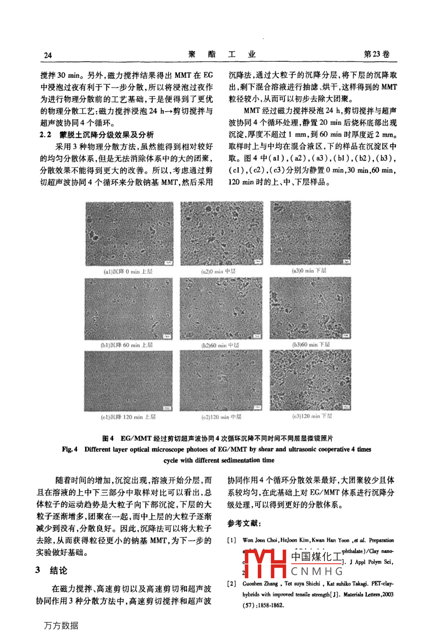 第23卷第1期聚酯工業(yè)Vol 23 No. 1201001yester IndustryJan.2010doi:10.3969/f.in.10088261.2010.01.006蒙脫土在乙二醇中的分散性研究史君,郝翔2,聶聰2,王小群(1北京化工大學(xué)理學(xué)院,北京100013;2.北京航空航天大學(xué)材料學(xué)院,北京100083)摘要:以乙二醇(EG)為分散介質(zhì)研究了不同分散及處理方法對蒙脫土(MMT)在乙二醇中分散性的影響用激光粒度儀和光學(xué)顯微鏡對分散效果進(jìn)行表征。結(jié)果表明采用高速剪切攪拌與超聲波分散結(jié)合的方法有助于形成蒙脫土粒徑相對小而分散均勻的EG/MMT分散體系。在此基礎(chǔ)上對EC/MMr分散體系進(jìn)行沉降分級可以有效除去難于分散的MMT大團(tuán)聚粒子。關(guān)鍵詞:袋脫土,乙二醇分散中圖分類號:TQ223.162文獻(xiàn)標(biāo)識碼:A文章編號:10088261(2010)014002105聚對苯二甲酸乙二醇酯(PET)具有剛性和強(qiáng)京東方康明科技開發(fā)有限公司。度大、抗蠕變和尺寸穩(wěn)定性好等優(yōu)點(diǎn),廣泛應(yīng)用于纖1.3實驗步驟維薄膜和包裝瓶等工程塑料領(lǐng)域12,采用納米蒙1.31MMT在EG中的分散脫土(MMT)改性的PET復(fù)合材料具有更好的耐熱室溫下將一定量的MMT和EC配制成質(zhì)量比阻隔和阻燃性能。然而納米MMT由于粒徑小、為1:15的混合液,采用磁力攪拌高速剪切以及超表面能大,具有自發(fā)團(tuán)聚的趨勢,而且其層間親聲波分散等方法分散一定時間待用。水極性大在極性較小的乙二醇中不易分散,團(tuán)聚1.3.2MMT的沉降分級體的存在將大大影響納米MMT在PET復(fù)合材料中室溫下將MMT在磁力攪拌條件下浸泡24h,高發(fā)揮作用。速剪切攪拌與超聲波協(xié)同作用4個周期(剪切分散本課題前期研究發(fā)現(xiàn)通過原位聚合法制備10mn,超聲波5min為1個周期)后靜置沉降不同PET/MMT復(fù)合材料,MMT在組分乙二醇(EG)中的時間待用分散好壞對MMT在 PET/MMT復(fù)合材料的分散以1.4表征及測試及該復(fù)合材料的性能有重要影響。因此,將MMT1.4.1激光粒度儀以較小粒徑均勻分散在EG中是至關(guān)重要的用 Mastersizer2000型激光粒度儀測量分散液中國內(nèi)研究者有將納米AT00,納米SO2(以及MMT的粒徑大小。將分散液稀釋到一定比例攪拌微細(xì)Cu粉體等用不同處理方法分散在乙二醇轉(zhuǎn)速為1700r/min中通過原位聚合法改性PET的研究,但關(guān)于MMT1.4.2光學(xué)顯微鏡在EG中的分散性研究鮮有報道。本文報告MMT將分散液取樣滴在載玻片上,用蓋玻片壓緊,用分散在EG中的研究,不同的分散及處理方法對 Motic Ba300型光學(xué)顯微鏡(放大倍數(shù)為400)觀察MMT在EG中分散效果的影響。MMT在EG中的分散形態(tài)。光學(xué)顯微鏡分辨率低1實驗部分能觀察到的顆粒大小有限并且取樣代表性較差但是對于分散性不很好的 EG/MMT體系,可以大致1.1實驗原料及試劑觀察MMT的分散形態(tài),并且是一種快速在線觀察鈉基MMT,工業(yè)級,浙江豐虹粘土化工有限公分散效果的方法,避免了分散液中溶劑揮發(fā)造成的司,陽離子交換容量為100mmo/100g;EC,工業(yè)表面張力影響級,中石油遼陽化纖分公司。12設(shè)備2結(jié)果及討論CL3型恒溫加熱磁力攪拌器,鞏義市予華儀器2.1不同分散方法對MMT在EG中分散效果作用有限責(zé)任公司;實驗室高剪切分散乳化機(jī)FSLI,上2.1.1中國煤化工海法孚萊機(jī)電科技發(fā)展有限公司;超聲波均化器,北由CNMHG相對較小MMT收稿日期:20091021作者簡介:史君(1967-),女,遼寧黑山人,高級工程師博士在讀從事石油化工領(lǐng)域研究工作。聚酯第23卷不能很好地分散在EG中。本實驗采用在磁力攪拌表2不同剪切轉(zhuǎn)速和時間下MMT在EG中的粒徑分布下浸泡的方式對MMT進(jìn)行預(yù)處理,期望使MMT在Ta2 Particle stze distribution of MMT in EG withEG中溶脹,更多EG吸附到MMT片層。圖1所示為different shear rate and time磁力攪拌2h,1d后體系的顯微鏡照片。剪切轉(zhuǎn)速/剪切時間′D(0.1)/D(0.5)/D(0.9)/(r.min")從圖1中可以看出,磁力攪拌時間為1d,相比未攪拌3.500.3335.32攪拌2h分散效果要好,但是仍有大的團(tuán)聚。磁力3.179.5932.26攪拌2d時,粒子的分散效果并沒有明顯的改善,磁2.968,9127.34力攪拌能一定程度上使分散的更均勻,但由于其攪30.65拌速率限制,不能使大團(tuán)聚打開1000022.161000050012500a磁力攪拌2h(b)磁力攪拌1d圖1EG/MMT磁力攪拌不同時間分散效果光學(xué)顯微鏡照片(b)剪切攪拌30minFig. 1 Dispersion effect optical microscope photoes ofEG/MMT with different magnetic stirring time2.1.2高速剪切攪拌轉(zhuǎn)速和時間的作用對于高速剪切攪拌對MMT在EG中的分散效果,采用激光粒度儀測量不同剪切轉(zhuǎn)速和時間下MMT的粒徑大小,同時也用光學(xué)顯微鏡觀察了()剪切攪拌60minMMT的分散形態(tài)。其結(jié)果如表1,2所示。表1相同剪切時間不同轉(zhuǎn)速下MMT在EG中的粒徑分布Table 1 Particle size distribution of MMT in EG with圖2EG/MMT剪切攪拌不同時間分散效果光學(xué)顯微鏡照片same shear time and different shear ratFig. 2 Dispersion effect optical microscope photoeEG/MMT with different shear stirring time剪切轉(zhuǎn)速/剪切時間/D(0.1)′D(0.5)/D(0.9)/V凵中國煤化工拌時聞和轉(zhuǎn)速下32.26MMT2.858.1522.16CNMHG(0.1),D(0.5)和301250026.56D(0.9)分別代表累計分布百分?jǐn)?shù)達(dá)到10%,0%和15002.8590%時所對應(yīng)的粒徑值,其中D(0.9)為主要參考數(shù)值第1期史君,等:蒙脫土在乙二醇中的分散性研究由剪切分散和未剪切的粒徑比較