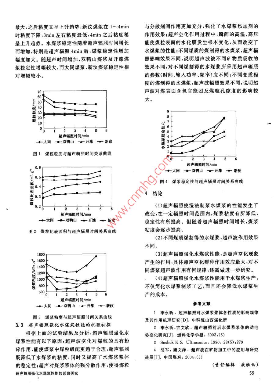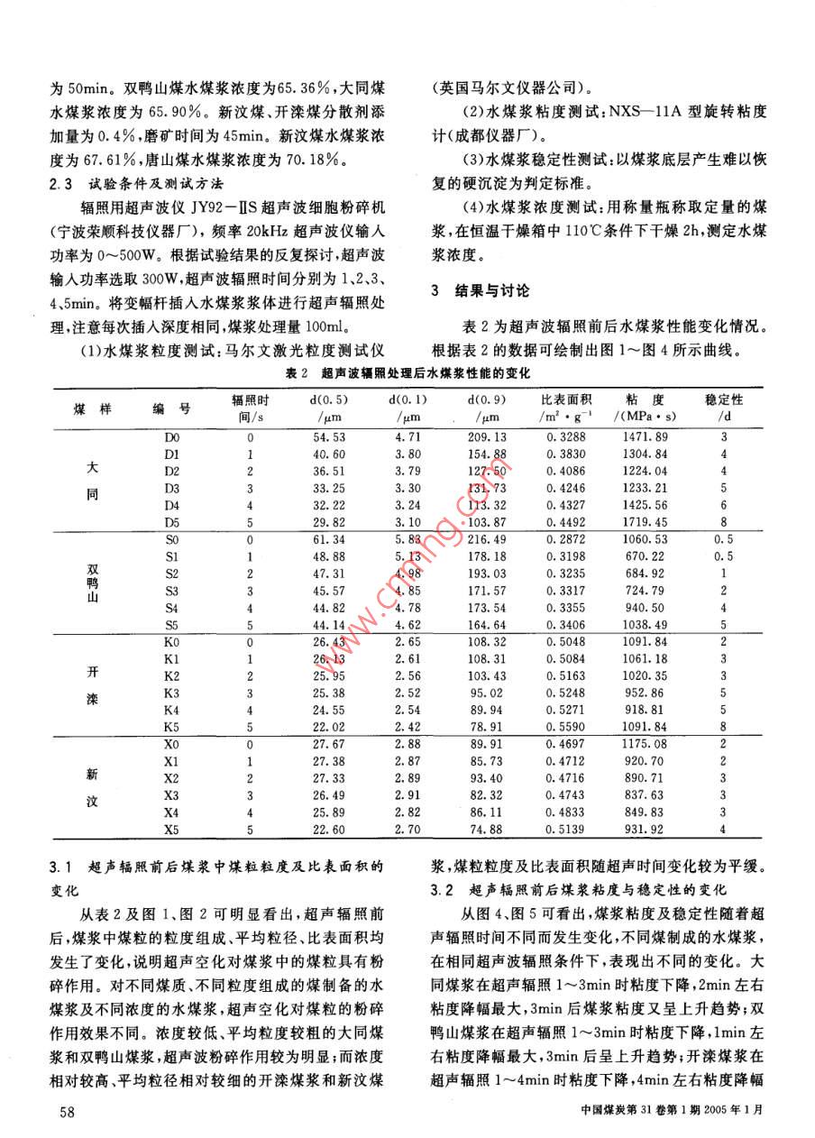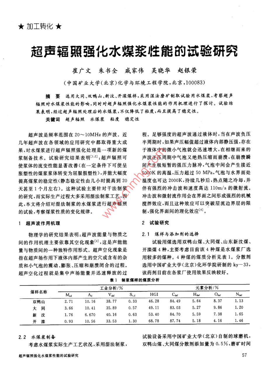 ★加工轉(zhuǎn)化★超聲輻照強化水煤漿性能的試驗研究崔廣文朱書全威家偉吳曉華趙銀榮(中國礦業(yè)大學(北京)化學與環(huán)境工程學院,北京,100083)摘要選用大同、雙鴨山、新汶、開灤煤樣,采用濕法磨礦制取試驗用水煤漿,考察超聲輻照對水煤漿性能的影響,同時對超聲輻照強化水煤漿性能的作用機理進行了探討。試驗結(jié)果表明,經(jīng)過超聲輻照處理后的水煤漿,不僅降低了粘度,而且提高了穩(wěn)定性。關(guān)鍵詞超聲輻照水煤漿粘度穩(wěn)定性超聲波是頻率范圍在20~10MHz的聲波。近程。足夠強度的超聲波通過液體時,當在聲波負壓幾年超聲波在各領(lǐng)域的應(yīng)用研究中都取得重大成半周期時,如果聲壓幅值超過液體內(nèi)部靜壓強,存在果,對水煤漿進行超聲輻照強化處理是一項新的煤于液體中的微小氣泡就會迅速增大,在相繼而來的漿制備技術(shù)。試驗研究結(jié)果表明:超聲輻照可聲波正壓周期中氣泡又絕熱壓縮而崩潰,在崩潰瞬使?jié){體的流變性能顯著改善(在一定條件下可使呈間產(chǎn)生極短暫的強壓力脈沖,氣泡中間會產(chǎn)生接近脹塑性的煤漿漿體轉(zhuǎn)變?yōu)榍偎苄?,并能大幅度500K的高溫壓力超過50MPa,氣泡與水界面處提高煤漿的穩(wěn)定性(靜態(tài)穩(wěn)定性由幾小時提高到20溫度也可達200X,持續(xù)幾秒后,熱點隨之冷卻,并天甚至1個月左右)。這種試驗主要針對干法制漿伴有強烈的沖擊波和速度高達110m/s的微射流。的研究,而實際生產(chǎn)過程大多采用濕法制漿工藝,因沖擊波和微射流作用會在界面之間形成強烈的機械此,本文將介紹對濕法制漿的水煤漿進行超聲輻照攪拌效應(yīng),而且這種效應(yīng)可以突破層流邊界層的限的試驗,考察煤漿性質(zhì)的變化規(guī)律。制,強化界面間的理化效應(yīng)1超聲波作用機理2試驗研究物理學的研究結(jié)果表明:超聲波能量與物質(zhì)之2.1煤樣與添加劑的選擇間的作用機理主要依靠其空化現(xiàn)象,這是聲能能試驗用煤選用雙鴨山煤、大同煤、山東新汶煤、量與物質(zhì)間的一種獨特作用形式。超聲空化現(xiàn)象是開灤煤4種,主要考慮目前該4種煤是水煤漿廠選指在超聲場作用下液體內(nèi)部產(chǎn)生的空穴或含有的雜用較多的煤種。4種煤的煤質(zhì)分析見表1。分散劑質(zhì)和小氣泡的震動膨脹、壓縮和崩潰閉合的過程。選用中國礦業(yè)大學(北京)化環(huán)學院研制的ky-33,超聲空化過程就是集中聲場能量并迅速釋放的過該藥劑目前在各漿廠使用效果反映較好表1制漿煤樣的煤質(zhì)分析元素分析/%煤樣名稱工業(yè)分析/%HGI雙鴨山2.7110.168.770.3346.28848.371.13大同3.6610.410.5749.111.766.67040.1610.5633.5368.784.161.462.2水煤漿制備試驗設(shè)備采用中國礦業(yè)大學(北京)自制的球磨機,考慮水煤漿實際生產(chǎn)工藝狀況,采用濕法制漿雙鴨山煤、大同煤分散劑添加量為0.5%,磨礦時間超聲輻照強化水煤漿性能的試驗研究57為50min。雙鴨山煤水煤漿濃度為65.36%,大同煤(英國馬爾文儀器公司)。水煤漿濃度為65.90%。新汶煤、開灤煤分散劑添(2)水煤漿粘度測試:NXS-11A型旋轉(zhuǎn)粘度加量為0.4%,磨礦時間為45mn。新汶煤水煤漿濃計(成都儀器廠度為67.61%,唐山煤水煤漿濃度為70.18%。(3)水煤漿穩(wěn)定性測試:以煤漿底層產(chǎn)生難以恢2.3試驗條件及測試方法復的硬沉淀為判定標準輻照用超聲波儀JY92-ⅡS超聲波細胞粉碎機(4)水煤漿濃度測試:用稱量瓶稱取定量的煤(寧波榮順科技儀器廠),頻率20kHz超聲波儀輸人漿,在恒溫干燥箱中110℃條件下干燥2h,測定水煤功率為0~500W。根據(jù)試驗結(jié)果的反復探討,超聲波漿濃度。輸入功率選取300W,超聲波輻照時間分別為1、2、3、3結(jié)果與討論4、5min。將變幅桿插入水煤漿漿體進行超聲輻照處理,注意每次插入深度相同,煤漿處理量100ml。表2為超聲波輻照前后水煤漿性能變化情況。(1)水煤漿粒度測試:馬爾文激光粒度測試儀根據(jù)表2的數(shù)據(jù)可繪制出圖1~圖4所示曲線°表2超聲波輻照處理后水煤漿性能的變化煤樣編號輻照時d(0.5)(0.1)d(0.9)比表面積粘度穩(wěn)定性/pm/m2·g1/(MPa:s)209.130.32881471.89154.880.38301304.84大36.51127.500.40861224.04D29s3333.253.30131.730.42461233.21345012113.320.43271425.5629.82103.870.44921719.456l.345.83216.490.28721060.5348.88178.180.3198670.22雙鴨山47.314.98193.030.3235684.9234456.5512445.57171.570.3317724.7944.82173.540.3355940.50S5544.144.62164.640.34061038.490.50481091.840.5084225.952.56103.430.51631020.3530,5248K424.55918.81K522.022.4278.910.55901091.841382.870.4712920.702227.332.890.4716890.7126.492.9182.320.4743837.6322.6074.880.513931超聲輻照前后煤漿中煤粒粒度及比表面積的漿,煤粒粒度及比表面積隨超聲時間變化較為平緩變亻3.2超聲輻照前后煤漿粘度與穩(wěn)定性的變化從表2及圖1、圖2可明顯看出,超聲輻照前從圖4、圖5可看出,煤漿粘度及穩(wěn)定性隨著超后,煤漿中煤粒的粒度組成、平均粒徑、比表面積均聲輻照時間不同而發(fā)生變化,不同煤制成的水煤漿,發(fā)生了變化,說明超聲空化對煤漿中的煤粒具有粉在相同超聲波輻照條件下,表現(xiàn)出不同的變化。大碎作用。對不同煤質(zhì)、不同粒度組成的煤制備的水同煤漿在超聲輻照1~3min時粘度下降,2min左右煤漿及不同濃度的水煤漿,超聲空化對煤粒的粉碎粘度降幅最大,3min后煤漿粘度又呈上升趨勢;雙作用效果不同。濃度較低、平均粒度