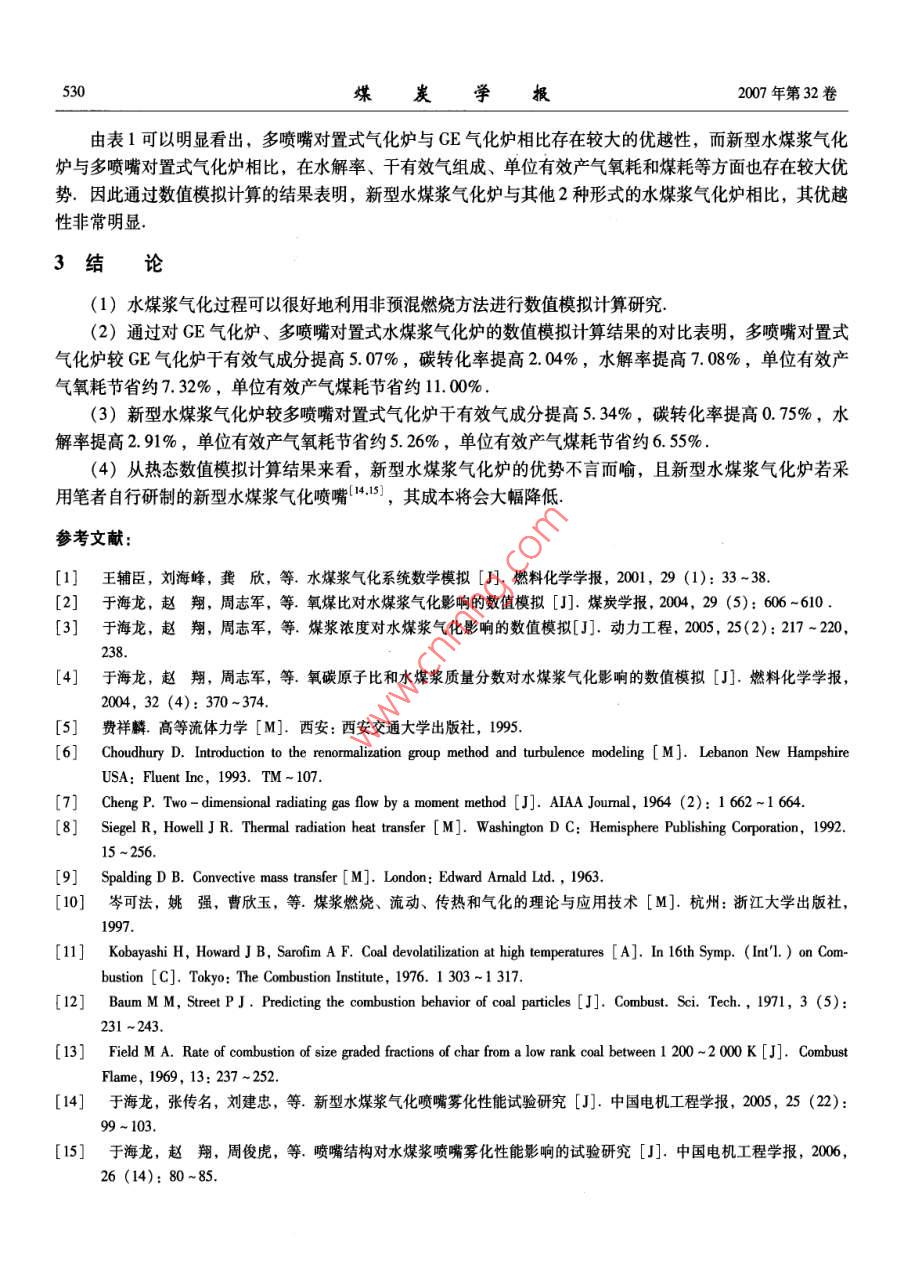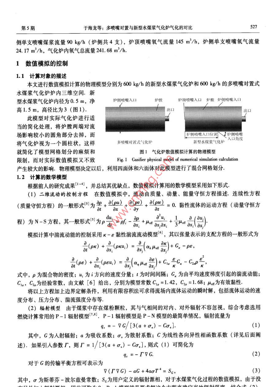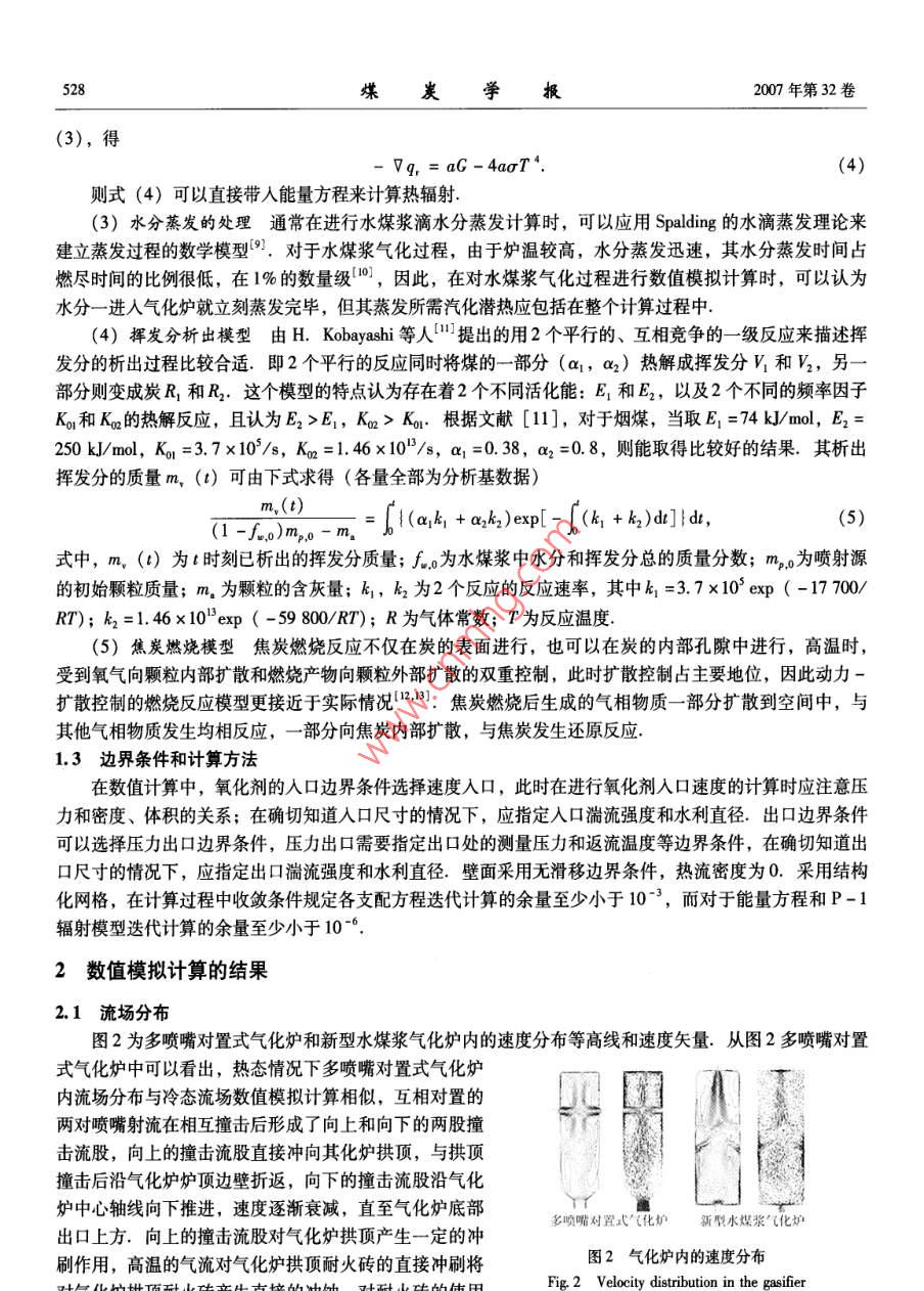 第32卷第5期煤炭學Vol.32 No. 52007年5 月JOURNAL OF CHINA COAL SOCIETYMay2007文章編號:0253 - 993(2007 )05 - 0526 -05多噴嘴對置與新型水煤漿氣化爐氣化的對比于海龍',劉建忠,張超",岑可法”(1.中原工學院能源與環(huán)境學院,河南鄭州450007; 2.浙江大學能源清潔利用國家重點實驗室,浙江杭州310027)摘要:為了考察新型水煤漿氣化爐與多噴嘴對置式水煤漿氣化爐的對比,應用數(shù)值模擬的方法,對該新型水煤漿氣化爐與多噴嘴對置式水煤漿氣化爐的氣化進行了熱態(tài)數(shù)值模擬研究。結果表明,新型水煤漿氣化爐在爐內氣化流場的組織和產(chǎn)出的有效氣成分上均優(yōu)于多噴嘴對置式水煤漿氣化爐,在相同容量的氣化爐內,新型水煤漿氣化爐與多噴嘴對置式水煤漿氣化爐對比,碳轉化率高0.75%,水解率高近2.91%,干有效氣成分高5.34%,冷煤氣效率高7.09%,每產(chǎn)出1000 m'有效氣(CO+ H2) 可節(jié)省氧氣20m',節(jié)省煤36 kg.關鍵詞:水煤漿;氣化爐;氣化;數(shù)值模擬中圖分類號: TQ534.4文獻標識碼: AThe gasifying comparison between the multi-nozzle opposition gasifierand a new coal water slurry gasifierYU Hai-long' ,LIU Jian-zhong , ZHANG Chao' , CEN Ke-fa?(1. School of Energy & Enionment, Zhongyuan University of Technology, Zhengzhou 450007, China; 2. State Key Laboratory of Clean Energy Unilization, Zhejiang Unirersity, Hanghou 310027, China)Abstract: In order to compare the new gasifier and the multi- nozzle opposition gasifier ,the numerical simulationmethod at hot state was applied to study the gasifying process both of the new gasifier and the multi- nozzle opposi-tion gasifier. The simulated results show that compared with the multi-nozzle gasifir, the gasifying low field andthe effective gases in the new gasifier is superior. In the gasifier of same capacity, the eficiency of carbon conver-sion of the new gasifier is more about 0. 75%,and percent hydrolysis is more about 2. 91% , while dry efective ga-ses components are more about 5. 34%,and cold gas eficiency is more about 7. 09%,compared with the multi-nozzle opposition gasifier. 20 m' oxygen and 36 kg coal can be saved while 1 000 m' effective gases are produced.Key words: coal water slurry (CWS) ; gasifier; gasification; numerical simulation為說明新型水煤漿氣化爐的優(yōu)越性所在,對額定工況下的多噴嘴對置式氣化爐和新型水煤漿氣化爐的氣化過程進行了數(shù)值模擬計算,并將數(shù)值模擬計算結果進行了對比,從流場分布、溫度分布、粗煤氣組成、氣化爐內平均溫度、碳轉化率、水解率、顆粒平均停留時間、單位產(chǎn)氣氧耗等各個方面進行了詳細的對比說明.數(shù)值模擬計算中多噴嘴對置式氣化爐的運行工況為:氣化爐容量600 kg/h,氣化壓力4 MPa,煤漿濃度62%,氧碳原子比0.98,單支噴嘴煤漿流量150 kg/h (共4支),單支噴嘴氧氣流量61.74 m'/h,氣化爐內氧氣總流量246. 96 m/h.數(shù)值模擬計算中新型水煤漿氣化爐的運行工況為:氣化爐容量600 kg/h,氣化壓力4 MPa,煤漿濃度62%,氧碳原子比0.959,爐頂噴嘴煤漿流量240 kg/h,爐收稿日期: 2006-07-28責任編輯:柳玉柏基金項目:國家重點基礎研究發(fā)展計劃基金資助項目(2004CB217701)作者簡介:于海龍(1975-), 男,吉林鎮(zhèn)賚人,博士,副教授. Tel: 0371 - 62506050, E - mail: suningbory@ sohu. com第5期于海龍等:多噴嘴對置與新型水煤漿氣化爐氣化的對比527側單支噴嘴煤漿流量90 kg/h (爐側共4支),爐頂噴嘴氧氣流量145 m'/h,爐側單支噴嘴氧氣流量24. 17 m'/h,氣化爐內氧氣總流量241. 68 m'/h.1數(shù)值模擬的控制1.1計算對象的描述本文進行數(shù)值模擬計算的物理模型分別為600 kg/h的新型水煤漿氣化爐和600 kg/h的多噴嘴對置式水煤漿氣化爐爐內三維空間.新型水煤漿氣化爐內徑為0.5m,凈爐側噴嘴入口爐爐頂噴嘴入口爐膛 爐側噴嘴入口高1.5m,高徑比為3 (圖1).出口此模型對實際氣化爐進行適當?shù)暮喕幚?,將爐膛兩端對流場影響較小的圓角部分去掉,而護側噴嘴入口位置爐側噴嘴將氣化爐視為一個圓柱狀,這樣:多噴嘴對置式氣化爐新型水煤漿氣化爐入口角度就簡化了模型網(wǎng)格劃分的麻煩和圖1氣化爐數(shù)值模擬計算的物理模型限制,而對實際數(shù)值模擬又不致Fig 1 Gasifier physical model of numerical simulation calculation產(chǎn)生較大的影響.物理模型決定以后,利用四面體和六面體對此模型進行了混合網(wǎng)格劃分.1.2計算的數(shù)學模型根據(jù)前人的研究成果[1-4),并總結其優(yōu)缺點,數(shù)值模擬計算用的數(shù)學模型采用如下形式.(1)二維流動的控制方程 在數(shù)值模擬中,流動由質量、動量、能量守恒方程描述.連續(xù)性方程(質量守恒方程)的-般形式(51為+ d(pu) + (p) + d(puw)= 0.黏性流體的運動方程(動量守恒方”a3xadu;_ap.otu;。1.a (8u,)程)為N-S方程,其般形式為p本=pf.- a +Haxa, +藏就)0x模擬計算中湍流動能的控制采用K -ε黏性湍流流動模型[6),其以張量表示的支配方程的-般形式為(pk) +0(pru) = Caxμe dK)+G -ρε,x(ρe) +(peu) =:(a,ua明)+C, EG. -C20號,式中,p為混合物的密度; u, 為i方向的速度分量; l 為時間間隔; G為由平均速度梯度引起的湍流動能;Ce, C2。為經(jīng)驗常數(shù),由文獻[6]給出,分別為模型常數(shù)C1e =1.42,C2e =1.68; uen為有效黏性.將以上方程加上邊界定解條件,利用有限容積法可求得流場內流體運動的瞬時解,包括流體運動的速度分布、壓力分布、湍流強度分布等.(2)輻射模型由于煤漿中存 在煤粉顆粒,其與氣相間的對內、對外輻射不容忽視,綜合考慮選用燃燒計算常用的P-1輻射模