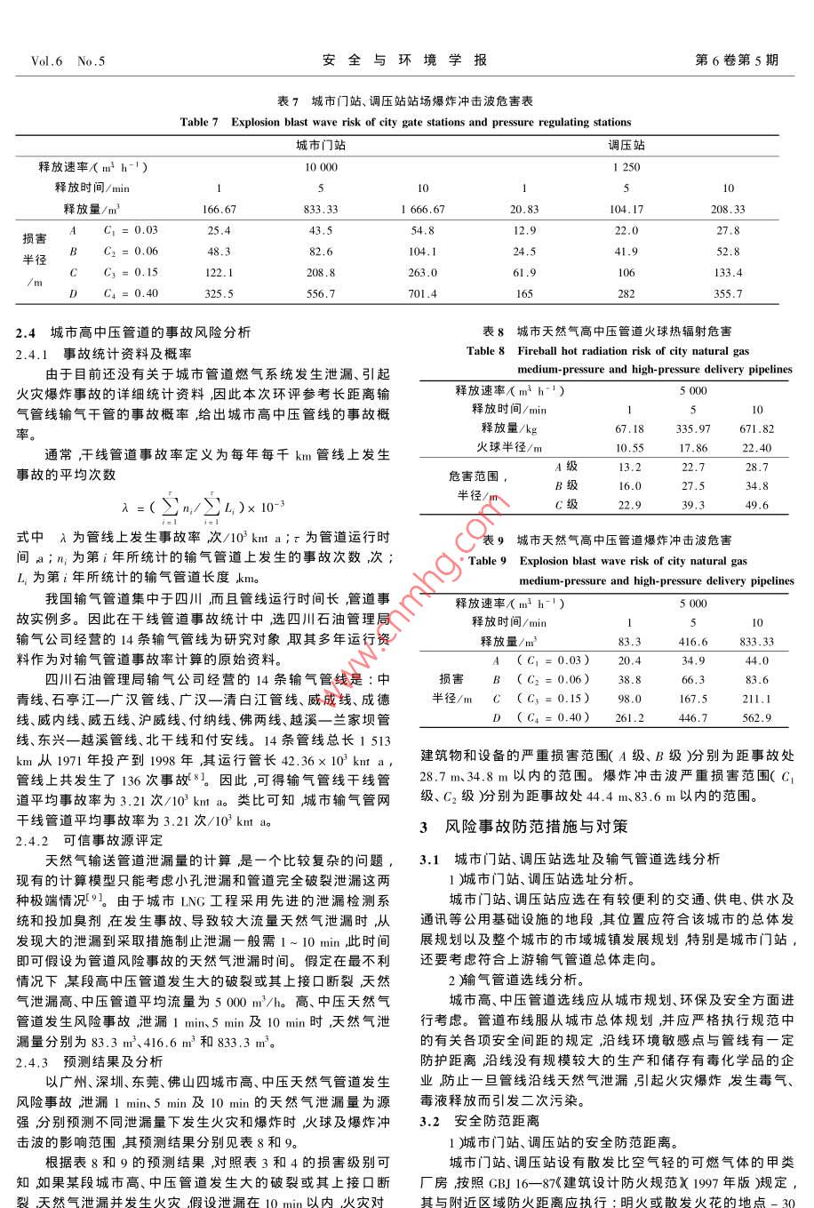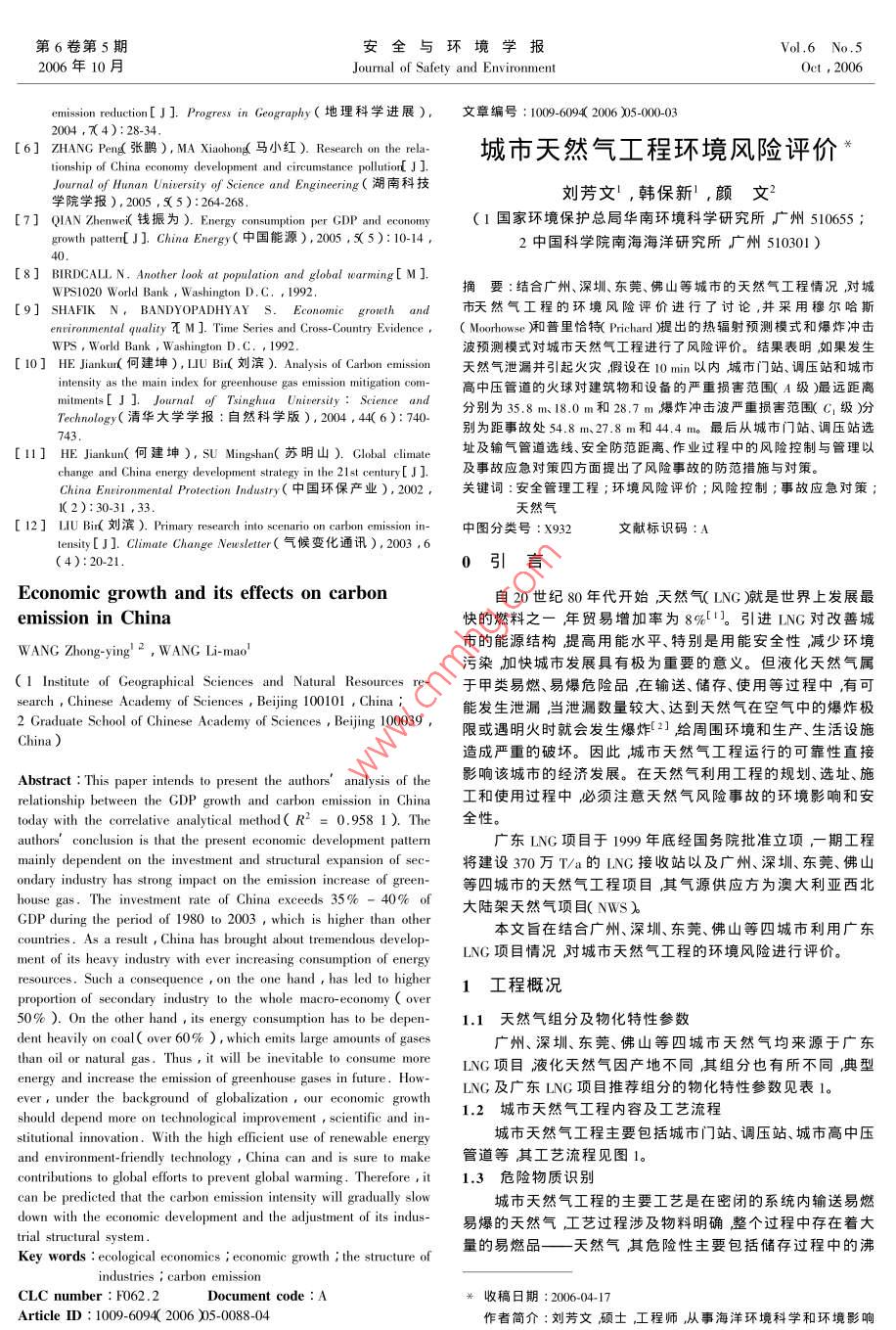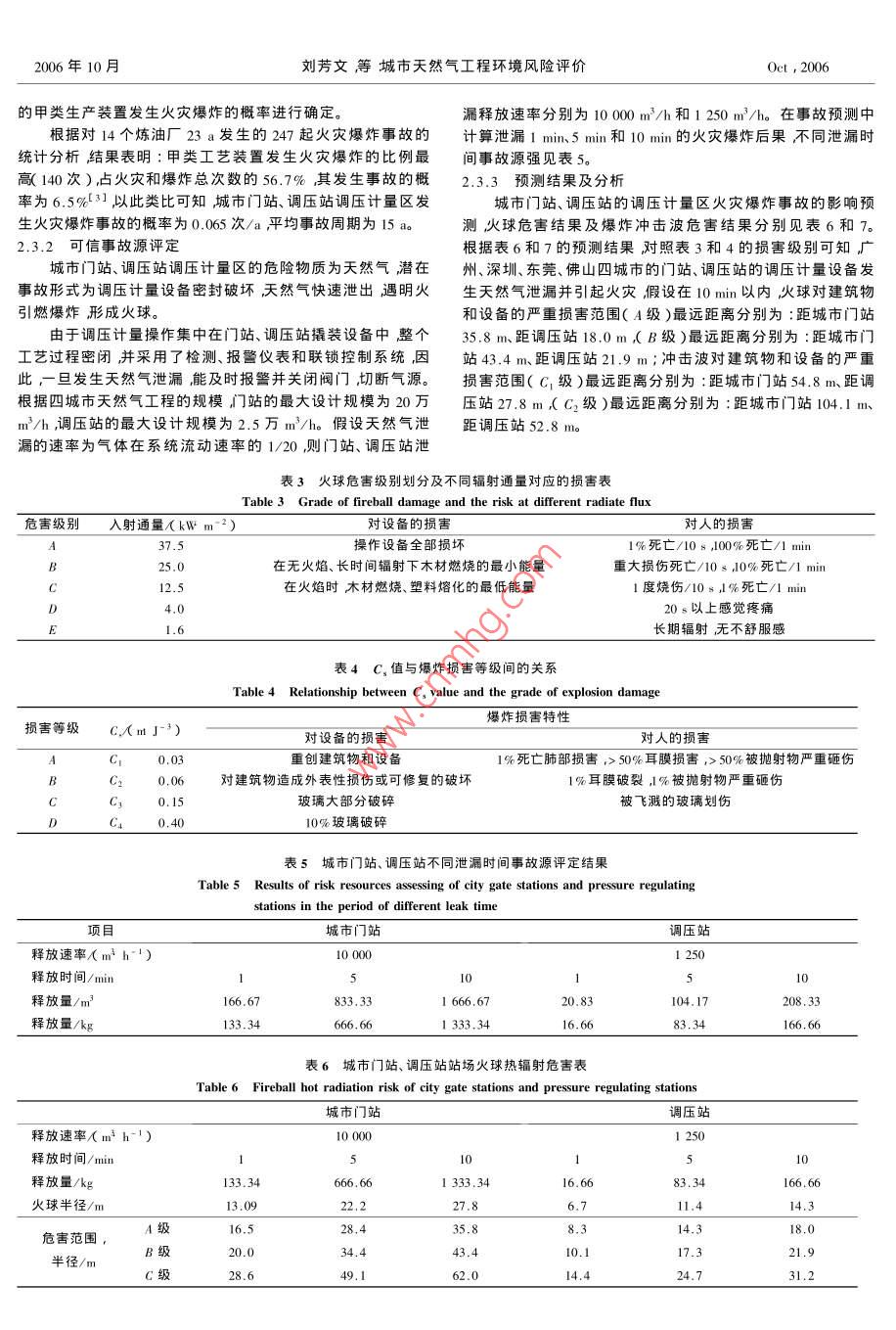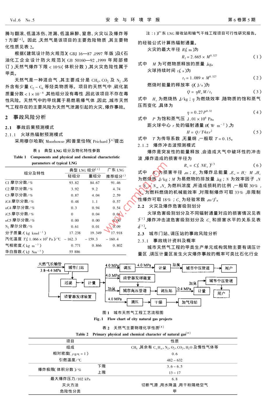 第6卷第5期安全與環(huán)境學(xué)報Vol 6 No 52006年10月Journal of safety and EnvironmentOct,2006reduction[J]. Progress in Geography(地理科學(xué)進(jìn)展),文章編號:1009-6094(2005002004,x4):28-34[6] ZHANG Peng(張鵬), MA Xiaohong馬小紅) Research on the rela城市天然氣工程環(huán)境風(fēng)險評價onship of China economy development and circumstance pollutior JJJournal of Hunan University of Science and Engineering(湖南科技學(xué)院學(xué)報),2005,孓5):264-268劉芳文,韓保新,顏文[7] QIAN Zhenwei(錢振為). Energy consumption per GDP and economy(I國家環(huán)境保護總局華南環(huán)境科學(xué)研究所廣州510655growth patter[ J]. China energy(中國能源),2005,5):10-142中國科學(xué)院南海海洋研究所廣州510301)[8] BIRDCALL N, Another look at population and global warming[MIWPS1020 World Bank, Washington D. C., 1992摘要:結(jié)合廣州、深圳、東莞、佛山等城市的天然氣工程情況,對城9] SHAFIK N, BANDYOPADHYAY S. Economic growth and市天然氣工程的環(huán)境風(fēng)險評價進(jìn)行了討論,并采用穆爾哈斯environmental quality ? M]. Time Series and Cross-Country Evidence,( Moorhouse廂和普里恰特 Prichard濃提出的熱輻射預(yù)測模式和爆炸沖擊WPS, World Bank, Washington D. C., 1992波預(yù)測模式對城市天然氣工程進(jìn)行了風(fēng)險評價。結(jié)果表明如果發(fā)生10] HE Jiankun(何建坤),LUBi(劉濱). Analysis of Carbon emission天然氣泄漏并引起火災(zāi)假設(shè)在10min以內(nèi)城市門站、調(diào)壓站和城市intensity as the main index for greenhouse gas emission mitigation commegaton com高中壓管道的火球?qū)ㄖ锖驮O(shè)備的嚴(yán)重?fù)p害范圍(A級)最遠(yuǎn)距離mitments[J]. Journal of Tsinghua University: Science and分別為35.8m、18.0m和28.7m爆炸沖擊波嚴(yán)重?fù)p害范圍C1級)分別為距事故處54.8m、27.8m和44.4m。最后從城市門站、調(diào)壓站選[] HE Jiankun(何建坤), SU Mingshan(蘇明山). Global climat址及輸氣管道選線、安全防范距離、作業(yè)過程中的風(fēng)險控制與管理以China Environmental Protection industry(9h214mn:[J.及事故應(yīng)急對策四方面提出了風(fēng)險事故的防范措施與對策。change and China energy development strategy in環(huán)保產(chǎn)業(yè)),2002,關(guān)鍵詞:安全管理工程;環(huán)境風(fēng)險評價;風(fēng)險控制;事故應(yīng)急對策I(2):30天然氣[12] LIU Bin(劉濱). Primary research into scenario on carbon emission in-中圖分類號:X932文獻(xiàn)標(biāo)識碼:Aensity[J. Climate Change Newsletter(氣候變化通訊),2003,6(4):20210引言Economic growth and its effects on carbon自20世紀(jì)80年代開始,天然氣(LNG〕就是世界上發(fā)emission in China快的燃料之一年貿(mào)易增加率為8%。引進(jìn)LNG對改善城WANG Zhong-ying, WAN市的能源結(jié)構(gòu)提高用能水平、特別是用能安全性減少環(huán)境Indo污染加快城市發(fā)展具有極為重要的意義。但液化天然氣屬1 Institute of Geographical Sciences and Natural Resources re-于甲類易燃、易爆危險品在輸送、儲存、使用等過程中有可search, Chinese Academy of Sciences, Beijing 100101, China能發(fā)生泄漏,當(dāng)泄漏數(shù)量較大、達(dá)到天然氣在空氣中的爆炸極2 Graduate School of Chinese Academy of Sciences, Beijing1000限或遇明火時就會發(fā)生爆炸2給周圍環(huán)境和生j造成嚴(yán)重的破壞。因此城市天然氣工程運行的可靠性直接Abstract: This paper intends to present the authors' analysis of the影響該城市的經(jīng)濟發(fā)展。在天然氣利用工程的規(guī)劃、選址、施relationship between the GDP growth and carbon emission in工和使用過程中必須注意天然氣風(fēng)險事故的環(huán)境影響和安oday with the correlative analytical method(R2=0.9581).The全性。oncnt pattert廣東LNG項目于1999年底經(jīng)國務(wù)院批準(zhǔn)立項,期工程mainly dependentvestment and structural expansion of sec-將建設(shè)370萬T/a的LNG接收站以及廣州、深圳、東莞、佛山ondary industry hasemission increase of green等四城市的天然氣工程項目其氣源供應(yīng)方為澳大利亞西北house gas. The investment rate of China exceeds35%-40%of大陸架天然氣項目(NWSGDP during the period of 1980 to 2003, which is higher than otherountries. As a result, China has brought about tremendous develop-本文旨在結(jié)合廣州、深圳、東莞、佛山等四城市利用廣東ment of its heavy industry with ever increasing consumption of energyLNG項目情況對城市天然氣工程的環(huán)境風(fēng)險進(jìn)行評價。resources.Such a consequence on the one hand has led to hig1工程概況proportion of secondary industry to the whole50%) On the other hand, its energy consumption has to be depen-1.1天然氣組分及物化特性參數(shù)dent heavily on coal( over 60%), which emits large amounts of gases廣州、深圳、東莞、佛山等四城市天然氣均來源于廣東han oil or natural gas.Thus, it will be inevitable to consume more LNG項目液化天然氣因產(chǎn)地不同其組分也有所不同典型energy and increase the emission of greenhouse gases in future. HowLNG及廣東LNG項目推薦組分的物化特性參數(shù)見表ever, under the background of globalization our economic growthshould depend more on technological improvement, scientific and in.1.2城市天然氣工程內(nèi)容及工藝流程stitutional innovation. With the high efficient use of renewable energy城市天然氣工程主要包括城市門站、調(diào)壓站、城市高中壓and environment-friendly technology, China can and is sure to make管道等其工藝流程見圖1。contributions to global efforts to prevent glo