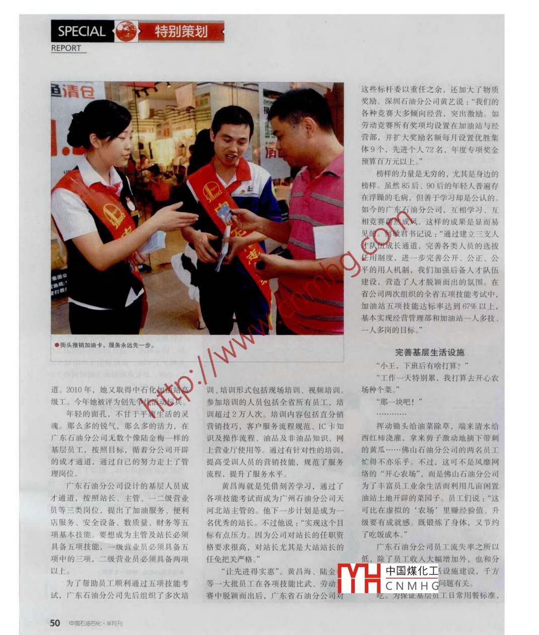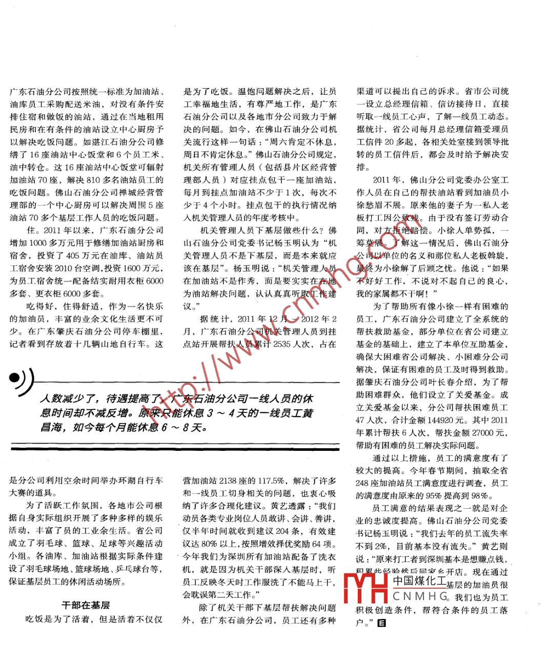 廣東石油分公司按照統(tǒng)--標(biāo)準(zhǔn)為加油站、是為了吃飯。溫飽問(wèn)題解決之后,讓員.渠道可以提出自己的訴求。省市公司統(tǒng)油庫(kù)員工采購(gòu)配送米油,對(duì)沒(méi)有條件安工幸福地生活,有尊嚴(yán)地工作,是廣東- 設(shè)立總經(jīng)理信箱、信訪接待日,直接排住宿和做飯的油站,通過(guò)在當(dāng)?shù)刈庥檬头止疽约案鞯厥蟹止局铝τ诮饴?tīng)取一線員工心聲,了解- -線員工動(dòng)態(tài)。民房和在有條件的油站設(shè)立中心廚房予決的問(wèn)題。如今,在佛山石油分公司機(jī)據(jù)統(tǒng)計(jì),省公司每月總經(jīng)理信箱受理員以解決吃飯問(wèn)題。如湛江石油分公司修關(guān)流行這樣- -句話:“周六肯定不休息,工信件20多起,各相關(guān)處室接到領(lǐng)導(dǎo)批繕了16座油站中心飯?zhí)煤?個(gè)員工米、周日不肯定休息?!狈鹕绞头止疽?guī)定,轉(zhuǎn)的員工信件后,都會(huì)及時(shí)給予解決安油中轉(zhuǎn)倉(cāng)。這16座油站中心飯?zhí)每奢椛錂C(jī)關(guān)所有管理人員(包括縣片區(qū)經(jīng)營(yíng)管非。加油站70座,解決810多名油站員工的理部人員)對(duì)應(yīng)掛點(diǎn)包干一座加油站,2011年,佛山分公司黨委辦公室工吃飯問(wèn)題。佛山石油分公司禪城經(jīng)營(yíng)管每月到掛點(diǎn)加油站不少于1次,每次不.作人員在自己的幫扶油站看到加油員小理部的一個(gè)中心廚房可以解決周?chē)?座少于4個(gè)小時(shí)。掛點(diǎn)包干的執(zhí)行情況納徐愁眉不展。原來(lái)他的妻子為-一私人老油站70多個(gè)基層工作人員的吃飯問(wèn)題。人機(jī)關(guān)管理人員的年度考核中。板打工因公致殘。由于沒(méi)有簽訂勞動(dòng)合住。2011年以來(lái),廣東石油分公司機(jī)關(guān)管理人員下基層做些什么?佛同,對(duì)方拒絕賠償。小徐人單勢(shì)孤,增加1000多萬(wàn)元用于修繕加油站廚房和山石油分公司黨委書(shū)記楊玉明認(rèn)為“機(jī)籌莫展。了解這一情況后,佛山石油分宿舍,投資了405萬(wàn)元在油庫(kù)、油站員關(guān)管理人員不是下基層,而是本來(lái)就應(yīng)公司以單位的名義和那位私人老板斡旋.工宿舍安裝2010臺(tái)空調(diào),投資1600萬(wàn)元,該在基層”。楊玉明說(shuō):“機(jī)關(guān)管理人員最終為小徐解了后顧之憂。他說(shuō):“如果為員工宿舍統(tǒng)一配備結(jié)實(shí)耐用衣柜6000在加油站不是作秀,而是要實(shí)實(shí)在在地不好好工作,不說(shuō)對(duì)不起自己的良心,多套、更衣柜6000多套。為油站解決問(wèn)題,認(rèn)認(rèn)真真聽(tīng)取工作建我的家屬都不干啊!吃得好,住得舒適,作為- -名快樂(lè)議。為了幫助所有像小徐--樣有困難的的加油員,豐富的業(yè)余文化生活更不可據(jù)統(tǒng)計(jì),2011年12月- 2012 年2員工,廣東石油分公司建立了全系統(tǒng)的少。在廣東肇慶石油分公司停車(chē)棚里,月,廣東石油分公司機(jī)關(guān)管理人員到掛幫扶救助基金,部分單位在省公司建立記者看到存放著十幾輛山地自行車(chē)。這點(diǎn)站開(kāi)展幫扶人員累計(jì)2535人次,占在基金的基礎(chǔ)上,建立了本單位互助基金,確保大困難省公司解決、小困難分公司解決,保證有困難的員工及時(shí)得到救助。據(jù)肇慶石油分公司葉長(zhǎng)春介紹,為了幫)人數(shù)減少了,待遇提高了,廣東石油分公司-線人員的休助困難群眾,他們?cè)O(shè)立了關(guān)愛(ài)基金。成息時(shí)間卻不減反增。原來(lái)只能休息3 ~ 4天的一線員工黃立關(guān)愛(ài)基金以來(lái),分公司幫扶困難員工47人次,合計(jì)金額144920元。其中2011昌海,如今每個(gè)月能休息6 ~ 8天。年累計(jì)幫扶6人次,幫扶金額27000元,幫助有困難的員工解決實(shí)際問(wèn)題。通過(guò)以上措施,員工的滿意度有了較大的提高。今年春節(jié)期間,抽取全省是分公司利用空余時(shí)間舉辦環(huán)湖自行車(chē)營(yíng)加油站2138座的117.5%,解決了許多248座加油站員工滿意度進(jìn)行調(diào)查,員工大賽的道具。和一線員工切身相關(guān)的問(wèn)題,也衷心吸的滿意度由原來(lái)的95%提高到98%。為了活躍工作氛圍,各地市公司根納了許多合理化建議。黃藝透露:“我們員工滿意的結(jié)果表現(xiàn)之一就 是對(duì)企據(jù)自身實(shí)際組織開(kāi)展了多種多樣的娛樂(lè)動(dòng)員各類(lèi)專(zhuān)業(yè)崗位人員敢講、會(huì)講.善講,業(yè)的忠誠(chéng)度提高。佛山石油分公司黨委活動(dòng),豐富了員的工業(yè)余生活。省公司僅半年時(shí)間就收到建議204條,有效建書(shū)記楊玉明說(shuō):“我們?nèi)ツ甑膯T工流失率成立了羽毛球、籃球、足球等興趣活動(dòng)議達(dá)80%以上,按照增效擇優(yōu)獎(jiǎng)勵(lì)64項(xiàng)。不到2%,目前基本沒(méi)有流失?!秉S藝則小組。各油庫(kù)、加油站根據(jù)實(shí)際條件建今年我們?yōu)樯钲谒屑佑驼九鋫淞讼匆抡f(shuō):“原來(lái)打工者到深圳基本是想賺點(diǎn)錢(qián),設(shè)了羽毛球場(chǎng)地、籃球場(chǎng)地、乒乓球臺(tái)等,機(jī),就是因?yàn)闄C(jī)關(guān)干部深人基層時(shí),聽(tīng),和界此經(jīng)瞼伏后回安鄉(xiāng)開(kāi)店?,F(xiàn)在通過(guò)保證基層員工的休閑活動(dòng)場(chǎng)所。員工反映冬天時(shí)工作服洗了不能馬上干,中國(guó)煤化化工基層