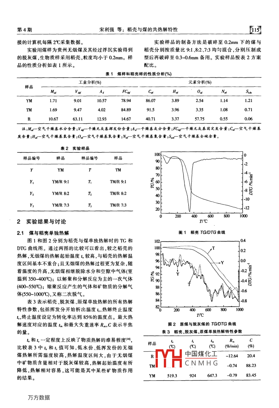 2011年第4期中國(guó)農(nóng)機(jī)化No.4,2011總第236期Chinese Agricultural MechanizationTotal No 236稻殼與煤的共熱解特性宋利強(qiáng)1,周敏1,孟磊2,胡長(zhǎng)娥',雷佳莉1,賀國(guó)章',魏江紅(1.中國(guó)礦業(yè)大學(xué)化工學(xué)院,江蘇徐州,22008;2.中國(guó)中煤能源股份有限公司新疆分公司,烏魯木齊市,83001)摘要:利用熱重分析儀,對(duì)煤(原煤、脫灰煤)和稻殼分別單獨(dú)及按不同比例混合熱解進(jìn)行了熱重實(shí)驗(yàn)。結(jié)果表明:稻殼對(duì)煤的熱解有一定的促進(jìn)作用,隨著稻殼添加量的增加,煤熱解高峰區(qū)向低溫區(qū)移動(dòng),但這種趨勢(shì)逐漸減小,且對(duì)原煤的促進(jìn)作用較脫灰煤明顯。通過(guò)相同配比時(shí)不同升溫速率的對(duì)比實(shí)驗(yàn),得出升溫速率增大會(huì)使熱解所需溫度升高和半焦產(chǎn)率增加。由于煤與稻殼熱解溫度區(qū)間基本不重疊,其共熱解時(shí)不存在協(xié)同效應(yīng)關(guān)鍵詞:煤;稻殼;協(xié)同效應(yīng);共熱解中圖分類(lèi)號(hào):S216文獻(xiàn)標(biāo)識(shí)碼:Adol:10.3969/sn.1006-7205.2011.04029宋利強(qiáng),周敏,孟磊,胡長(zhǎng)娥,雷佳莉,賀國(guó)章,魏江紅稻殼與煤的共熱解特性U中國(guó)農(nóng)機(jī)化,201,(4)=114-118SONG Li-qiang. ZHOU Min, MENG Lei, HU Chang-e, LEI Jia-li, HE Guo-zhang, WEI Jiang-hong Co-pyrolysis characteristicsof rice hall and coal [J]. Chinese Agricultural Mechanization, 2011, (4): 114-1180引言并沒(méi)有使生物質(zhì)的轉(zhuǎn)化率明顯提高;廖洪強(qiáng)等6在煤與焦?fàn)t氣共熱解體系中加人了少量廢塑料,結(jié)果隨著石油資源的日益短缺,能源在當(dāng)今世界發(fā)展表明廢塑料也能起到與富氫氣體相同的作用中的地位越來(lái)越重要,近年來(lái)世界各國(guó)都加大了對(duì)能“增油降水”。源研究開(kāi)發(fā)的力度。生物質(zhì)則是一種可再生能源,其每生物質(zhì)作為可再生資源,如果生物質(zhì)能作為煤年的產(chǎn)量十分可觀,對(duì)我國(guó)一次能源的貢獻(xiàn)約為熱解的供氫劑,則必將為煤與生物質(zhì)的高效清潔利33%。目前,生物質(zhì)的利用多是以農(nóng)村的直接燃燒方用帶來(lái)一場(chǎng)革命。世界各國(guó)針對(duì)煤與生物質(zhì)共熱解式為主,能量利用率極低,且對(duì)環(huán)境的污染較嚴(yán)重。為的研究較多,但研究結(jié)果與觀點(diǎn)并不一致,有些學(xué)此,使生物質(zhì)資源得到高效清潔利用成為各國(guó)學(xué)者研者認(rèn)為煤與生物質(zhì)共熱解時(shí)存在協(xié)同效應(yīng)90究的熱點(diǎn)有些學(xué)者的觀點(diǎn)則相反[1.。原因可能是實(shí)驗(yàn)由于煤結(jié)構(gòu)的復(fù)雜性,煤的熱解轉(zhuǎn)化率較低,熱原料和條件的不同,產(chǎn)生了不同的結(jié)論。本實(shí)驗(yàn)選解所得焦油量少,且其中重質(zhì)組分含量較高叫。因用貴州無(wú)煙煤(YM)及其經(jīng)過(guò)浮沉而得到的脫灰煤此,對(duì)煤的熱解的研究多是加氫熱解,李保慶的研(TM)和稻殼(R)為實(shí)驗(yàn)原料,通過(guò)其不同配比和不究表明,煤在氫氣氣氛下的熱解轉(zhuǎn)化率大大增加,焦同的升溫速率,研究其共熱解的影響因素和協(xié)同油收率及焦油中的BTX、PCX和萘類(lèi)含量均有明顯效應(yīng)。增加。廖洪強(qiáng)等闆的研究表明,煤在富含氫的焦?fàn)t氣氣氛下熱解,也能提高熱解轉(zhuǎn)化率,增加焦油及實(shí)驗(yàn)部分BTX、PCX和萘類(lèi)的收率,即若能在煤熱解的同時(shí)提實(shí)驗(yàn)采用 NETZSCH-STA409C型熱重分析儀供外部的氫源,將有利于煤的熱解。而李文等通過(guò)測(cè)試條件為:樣品質(zhì)量10±0.1mg,氮?dú)鈿夥?流速對(duì)生物質(zhì)在H2和N2氣氛下的熱解表明,加氫熱解100ml/min,以20°/min升溫至1000℃。通過(guò)與儀器鏈?zhǔn)崭迦掌?2010年12月13日修回日期:2011年3月8日宋利強(qiáng),男,1986年生,河北邯鄲人,中國(guó)礦業(yè)大學(xué)化工學(xué)院碩士研究生;研究方向?yàn)樯镔|(zhì)與煤的綜合利用周敏,男,1963年生安徽巢湖人,碩土,中國(guó)礦業(yè)大學(xué)教授碩土生導(dǎo)師;研孟磊,男,1983年生,安徽蕭縣人,碩士,中國(guó)礦業(yè)大學(xué);研究方向?yàn)槊禾哭D(zhuǎn)中國(guó)煤化工胡長(zhǎng)娥,女,1989年生,河南南陽(yáng)人,中國(guó)礦業(yè)大學(xué)碩士研究生;研究方向CNMHG雷佳莉,女,1986年生,河北冀州人,中國(guó)礦業(yè)大學(xué)碩士研究生;研究方向?yàn)槊河觅R國(guó)章,男,1987年生,湖南岳陽(yáng)人,中國(guó)礦業(yè)大學(xué)碩士研究生;研究方向?yàn)槊旱木C合潔凈利用。魏江紅,男,1985年生,內(nèi)蒙古烏蘭察布人,中國(guó)礦業(yè)大學(xué)碩士研究生;研究方向?yàn)槊旱木C合潔凈利用。第4期宋利強(qiáng)等:稻殼與煤的共熱解特性接的計(jì)算機(jī)每隔2℃采集數(shù)據(jù)。實(shí)驗(yàn)樣品的制備方法是破碎至02mm下的煤與實(shí)驗(yàn)用煤樣為貴州無(wú)煙煤及其經(jīng)過(guò)浮沉實(shí)驗(yàn)得到稻殼分別按質(zhì)量比9l8:2、7:3均勻混合,分別壓制成的脫灰煤,生物質(zhì)樣采用稻殼,粒度均小于02mm。樣型后再破碎至03-06mm備用。實(shí)驗(yàn)樣品按表2方案品的性質(zhì)分析如表1所示配比表1煤樣和稻殼樣的性質(zhì)分析%)元素分析樣品O10.5786072.541141219479153.350.716763.1129314.6740.713.3757.750.55注:M』空氣干燥基水分含量;v4干燥無(wú)灰基揮發(fā)