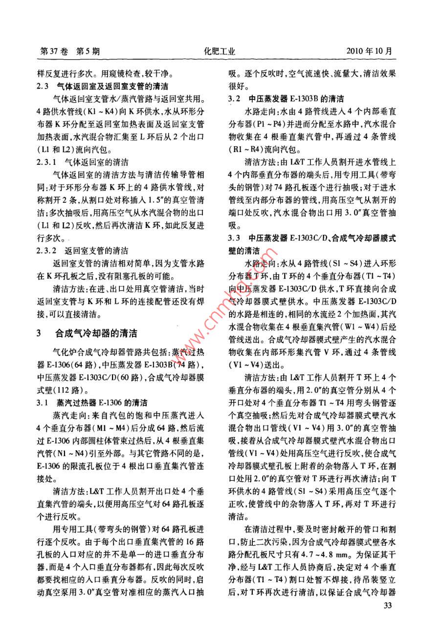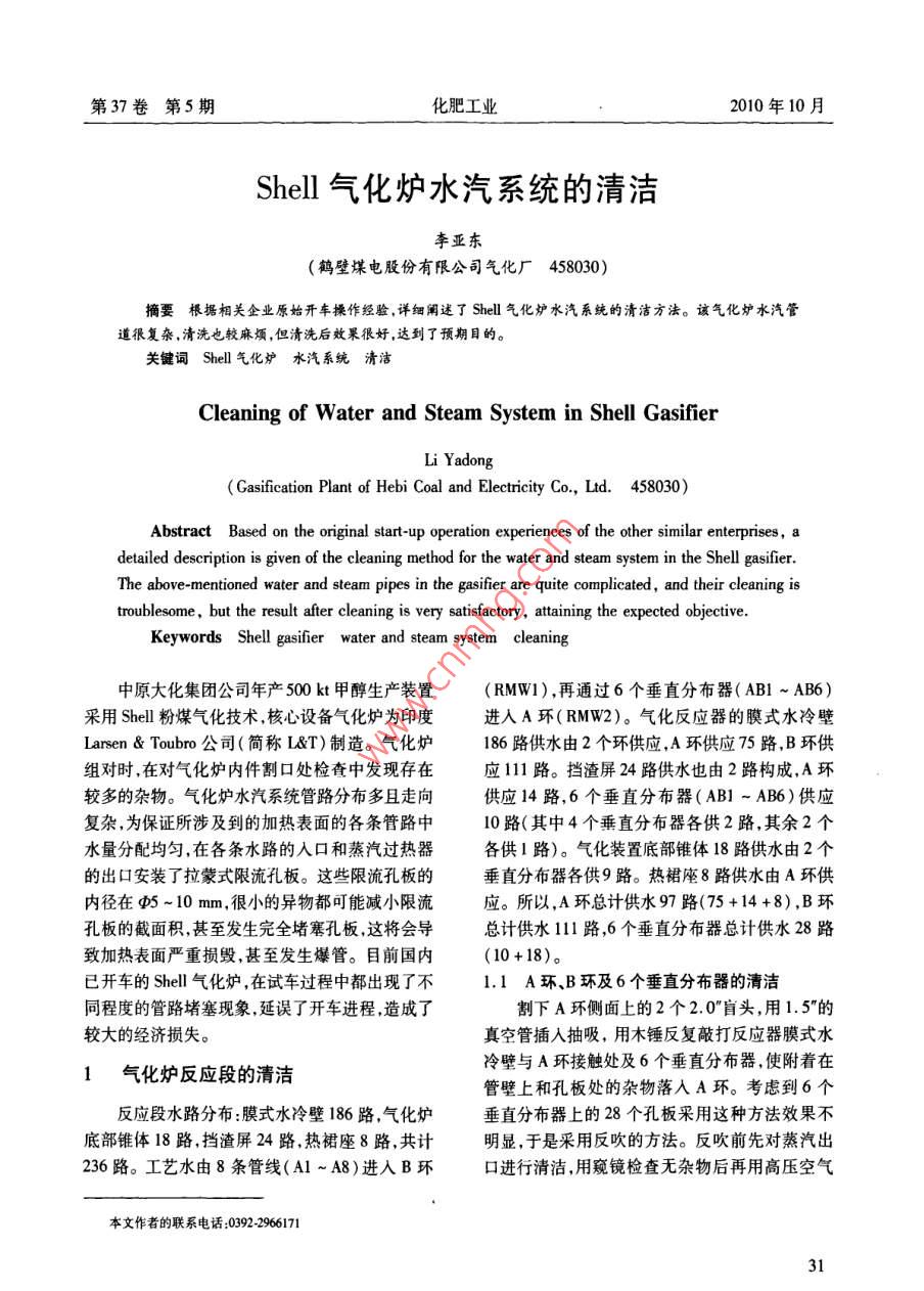 第37卷第5期化肥工業(yè)2010年10月Shell氣化爐水汽系統(tǒng)的清潔李亞?wèn)|(鶴壁煤電股份有限公司氣化廠458030)摘要根據(jù)相關(guān)企業(yè)原始開車操作經(jīng)驗(yàn),詳細(xì)闡述了Shell 氣化爐水汽系統(tǒng)的清潔方法。該氣化爐水汽管道很復(fù)雜,清洗也較麻煩,但清洗后效果很好,達(dá)到了預(yù)期目的。關(guān)鍵詞Shell 氣化爐水汽系統(tǒng) 清潔Cleaning of Water and Steam System in Shell GasiferLi Yadong(Gasification Plant of Hebi Coal and Eletricity Co., Ltd. 458030)Abstract Based on the original start-up operation experiences of the other similar enterprises, adetailed description is given of the cleaning method for the water and steam system in the Shell gasifier.The above-mentioned water and steam pipes in the gasifier are quite complicated, and their cleaning istroublesome , but the result after cleaning is very satisfactory, ataining the expected objective.Keywords Shell gasifer water and steam system cleaning中原大化集團(tuán)公司年產(chǎn)500 kt甲醇生產(chǎn)裝置(RMW1),再通過(guò)6個(gè)垂直分布器(ABI ~ AB6)采用Shell粉煤氣化技術(shù),核心設(shè)備氣化爐為印度進(jìn)入A環(huán)(RMW2)。氣化反應(yīng)器的膜式水冷壁Larsen & Toubro公司(簡(jiǎn)稱L&T)制造。氣化爐186路供水由2個(gè)環(huán)供應(yīng),A環(huán)供應(yīng)75路, B環(huán)供組對(duì)時(shí),在對(duì)氣化爐內(nèi)件割口處檢查中發(fā)現(xiàn)存在.應(yīng)111路。擋渣屏24路供水也由2路構(gòu)成,A環(huán).較多的雜物。氣化爐水汽系統(tǒng)管路分布多且走向供應(yīng)14路,6個(gè)垂直分布器(AB1 ~ AB6)供應(yīng)復(fù)雜,為保證所涉及到的加熱表面的各條管路中10路(其中4個(gè)垂直分布器各供2路,其余2個(gè)水量分配均勻,在各條水路的人口和蒸汽過(guò)熱器各供1路)。氣化裝置底部錐體18 路供水由2個(gè)的出口安裝了拉蒙式限流孔板。這些限流孔板的垂直分布器各供9路。熱裙座8路供水由A環(huán)供內(nèi)徑在φ5~10mm,很小的異物都可能減小限流應(yīng)。所以,A環(huán)總計(jì)供水97路(75 +14+8),B環(huán)孔板的截面積,甚至發(fā)生完全堵塞孔板,這將會(huì)導(dǎo)總計(jì)供水111路,6個(gè)垂直分布器總計(jì)供水28路致加熱表面嚴(yán)重?fù)p毀,甚至發(fā)生爆管。目前國(guó)內(nèi)(10+18)。已開車的Shell氣化爐,在試車過(guò)程中都出現(xiàn)了不1.1A環(huán)、B環(huán)及6個(gè)垂直分布器的清潔同程度的管路堵塞現(xiàn)象,延誤了開車進(jìn)程,造成了割下A環(huán)側(cè)面上的2個(gè)2.0"盲頭,用1.5”的較大的經(jīng)濟(jì)損失。真空管插入抽吸,用木錘反復(fù)敲打反應(yīng)器膜式水冷壁與A環(huán)接觸處及6個(gè)垂直分布器,使附著在1氣化爐 反應(yīng)段的清潔管壁上和孔板處的雜物落入A環(huán)。考慮到6個(gè)反應(yīng)段水路分布:膜式水冷壁186 路,氣化爐垂直分布器上的28個(gè)孔板采用這種方法效果不底部錐體18路,擋渣屏24路,熱裙座8路,共計(jì)明顯,于是采用反吹的方法。反吹前先對(duì)蒸汽出236路。工藝水由8條管線(A1 ~A8)進(jìn)入B環(huán)口進(jìn)行清潔,用窺鏡檢查無(wú)雜物后再用高壓空氣本文作者的聯(lián)系電話:0392 296617131第37卷第5期化肥工業(yè)2010年10月從2根水平段蒸汽集管(Z1和Z2)的開口處用專來(lái)相對(duì)容易,用1.5”的真空管對(duì)它們進(jìn)行逐根清用彎頭鋼管插人逐條反吹。2條水平集汽管收集理即可。了擋渣屏24路、氣化裝置底錐18路熱裙座8路2氣化爐急冷段、傳輸導(dǎo)管、氣體返回室共計(jì)50路蒸汽。用高壓空氣反吹,使垂直分布器及返回室支管的清潔上28個(gè)孔板處的雜物落人A環(huán),再?gòu)?個(gè)割開的盲端處清潔A環(huán)。用這種方法清潔垂直分布2.1急冷 段的清潔器28路孔板,經(jīng)檢查效果較好。水路分布:有4路管線(E1 ~E4)向環(huán)形分布對(duì)于B環(huán)建議印度L&T工作人員割開6個(gè)器E環(huán)供水,E環(huán)再向88路水路供水。4路管線垂直分布器的其中2個(gè),從割口處對(duì)B環(huán)進(jìn)行了(E1 ~E4)結(jié)構(gòu)為套簡(jiǎn)式,蒸汽集汽環(huán)F環(huán)上有清潔。由于開口在圓環(huán)下方,因此插入真空管較4個(gè)出口(F1 ~ F4)流向汽包。難,進(jìn)人距離不能太長(zhǎng),于是從2個(gè)開口處分別向根據(jù)清潔經(jīng)驗(yàn),要求L&T工作人員割開1條左右插入,從而達(dá)到環(huán)繞圓環(huán)1周的目的。分別水路人口套筒管線。由于人口是套簡(jiǎn)式結(jié)構(gòu),真用3.0" 2.0"和1.5"管進(jìn)行了多次清潔,用木錘反空管無(wú)法從入口管線兩端和割口(E5)處插人E復(fù)敲打反應(yīng)器膜式水冷壁與B環(huán)的接觸處,使附環(huán),于是又割開1個(gè)與E環(huán)連通的供水管線,在著在孔板處的雜物落入B環(huán)。割口處用2.0”和3.0”的真空管對(duì)E環(huán)及孔板進(jìn)考慮到8根進(jìn)水管和D環(huán)2條上水管線行清潔。隨后對(duì)4條蒸汽出口管線(F1~F4)用(BDI和BD2)的管壁上可能附著雜物,鑒于此時(shí)同樣的方法進(jìn)行了清潔。D環(huán)的2條上水管線與D環(huán)的連接處已割開,于多次清潔后,從E環(huán)割口處用高壓空氣吹是對(duì)8根進(jìn)水管及2條上水管線從割口處用高壓掃,其它3個(gè)套筒管口敞開,使套簡(jiǎn)式管線中的大空氣進(jìn)行反吹,使附著雜物落入B環(huán),最后再清量雜物被吹出。高壓空氣吹掃后,再次用真空管潔B