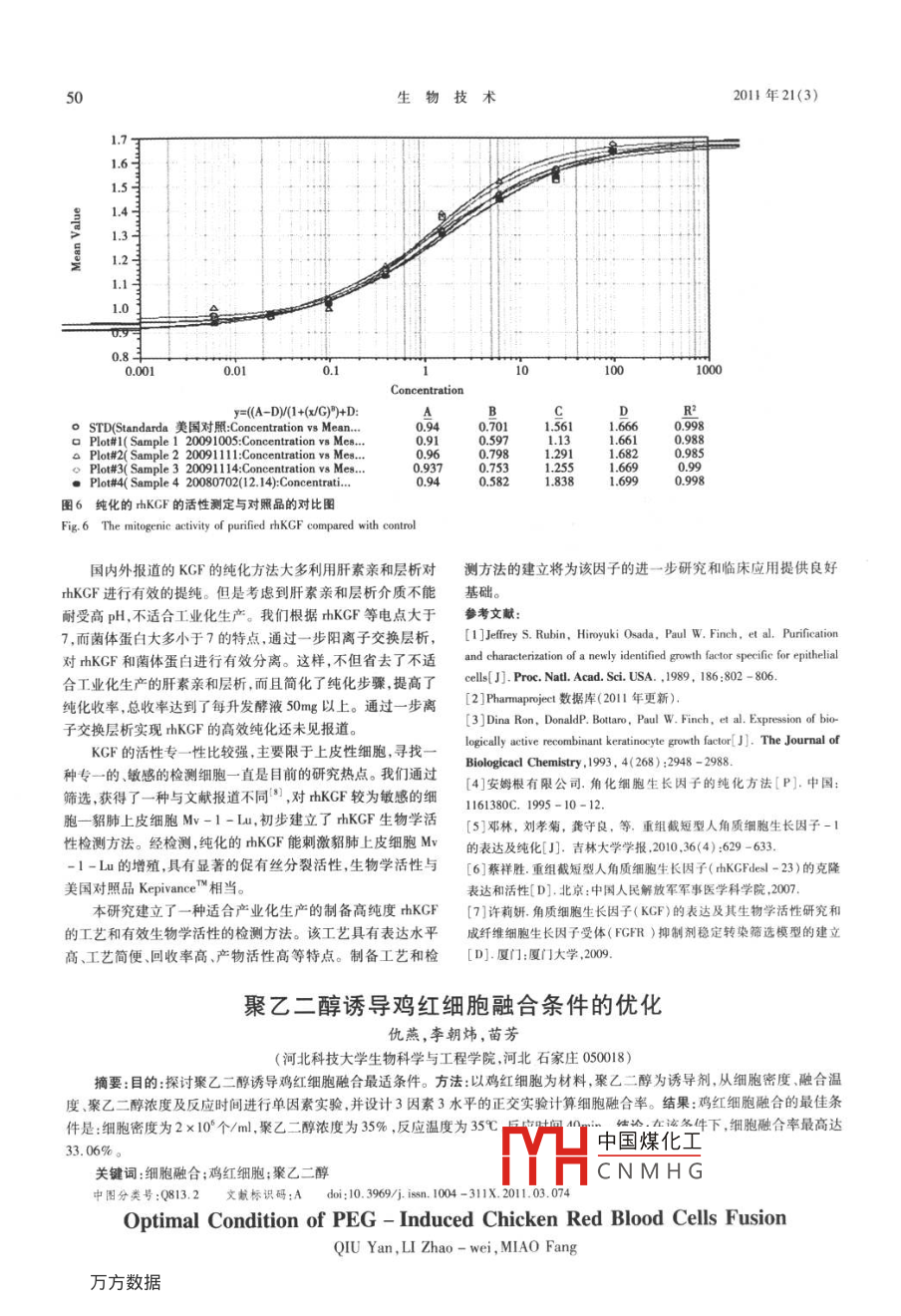 50生物技術(shù)2011年21(3)1.7 :1.61.5-1.4豐1.3-.2手1.1日1.0拿=0.0.8-0.0010.010.1i01001000Concentrationy=(A-DV(1+(/G)+D:ABCD。STD(Standarda 美國對(duì)照:Concentration vg Men...0.94 .0.7015611.6660.9980.910.5971.131.6610088。Plot#2( Sample 2 2091111:Concentration vs Me...0.9607591.2910.99。Plot#3( Sample 3 209111:Concentration vs Mes..0.940.5821 838團(tuán)6純化的 rhKCF的活性測(cè)定與對(duì)照品的對(duì)比圖Fig.6 The mitogenie activity of purified rKCF compared with control國內(nèi)外報(bào)道的KGF的純化方法大多利用肝素親和層析對(duì)測(cè)方法的建立將為該因子的進(jìn)一步研究和臨床應(yīng)用提供良好rhKGF進(jìn)行有效的提純。但是考慮到肝素親和層析介質(zhì)不能基礎(chǔ)。耐受高pH,不適合工業(yè)化生產(chǎn)。我們根據(jù)hKGF等電點(diǎn)大于參考文獻(xiàn):7.而菌體蛋白大多小于7的特點(diǎn),通過一步陽離子交換層析, [1]erey s. Rubin, Hioyuki Oad, Peul w. Finch, e al. Puifcationn對(duì)thKGF和菌體蛋白進(jìn)行有效分離。這樣,不但省去了不適and characteization of a newly idenified growth factor speeifie for epithelial合工業(yè)化生產(chǎn)的肝素親和層析,而且簡(jiǎn)化了純化步驟,提高了cells[ J]. Proc. Natl. Acad. Sci. USA. ,1989, 186 :802 - 806.純化收率,總收率達(dá)到了每升發(fā)酵液50mg以上。通過- -步離[2]harmaprojet數(shù)據(jù)庫(2011年更新).[3]Dina Ron, DonaldP. Botaro, Paul w. Finch, et al. Expression of bio-子交換層析實(shí)現(xiàn)rhKGF的高效純化還未見報(bào)道。KGF的活性專-性比較強(qiáng),主要限于上皮性細(xì)胞,尋找-logically acive recombinant keratinocyte growth factor[J]. The Journal of種專一的、敏感的檢測(cè)細(xì)胞一直是目前的研究熱點(diǎn)。我們通過Biologicacl Chemistry ,1993. 4(268) :2948 -2988.篩選,獲得了一種與文獻(xiàn)報(bào)道不同國,對(duì)rhKGF較為敏感的細(xì)[4]安姆根有限公司.角化細(xì)胞生長因子的純化方法[P].中國:1161380C. 1995 - 10-12.胞-貂肺上皮細(xì)胞Mv-1- lu,初步建立了hKGF生物學(xué)活[S]鄧林,劉孝菊,龔守良,等,重組截短型人角質(zhì)細(xì)胞生長因子-1性檢測(cè)方法。經(jīng)檢測(cè),純化的rhKGF能刺激貂肺上皮細(xì)胞Mv的表達(dá)及純化[J].吉林大學(xué)學(xué)報(bào),2010 ,36<4) :629 -633.-1 - Lu的增殖,具有顯著的促有絲分裂活性,生物學(xué)活性與[6]蔡祥勝.重組截短型人角質(zhì)細(xì)胞生長因子( rhKGFdesl -23)的克隆美國對(duì)照品Kepivance"相當(dāng)。表達(dá)和活性[ D].北京:中國人民解放軍軍事醫(yī)學(xué)科學(xué)院,007.本研究建立了一種適合產(chǎn)業(yè)化生產(chǎn)的制備高純度hKGF[7]許莉妍.角質(zhì)細(xì)胞生長因子(KGF)的表達(dá)及其生物學(xué)活性研究和的工藝和有效生物學(xué)活性的檢測(cè)方法。該工藝具有表達(dá)水平成纖維細(xì)胞生長因子受體(FCFR)抑制劑穩(wěn)定轉(zhuǎn)染篩選模型的建立高、工藝簡(jiǎn)便、回收率高、產(chǎn)物活性高等特點(diǎn)。制備工藝和檢[D].廈門:廈門大學(xué),2009.聚乙二醇誘導(dǎo)雞紅細(xì)胞融合條件的優(yōu)化仇燕,李朝煒,苗芳(河北科技大學(xué)生物科學(xué)與工程學(xué)院,河北石家莊050018)摘要:目的:探討聚乙二醇誘導(dǎo)雞紅細(xì)胞融合最適條件。方法:以雞紅細(xì)胞為材料,聚乙二醇為誘導(dǎo)劑,從細(xì)胞密度、融合溫度聚乙二醇濃度及反應(yīng)時(shí)間進(jìn)行單因素實(shí)驗(yàn),并設(shè)計(jì)3因素3水平的正交實(shí)驗(yàn)計(jì)算細(xì)胞融合率。結(jié)果:雞紅細(xì)胞融合的最佳條件是:細(xì)胞密度為2x 10°個(gè)/ml .聚乙二醇濃度為35% ,反應(yīng)溫度為35"C中國煤化工33. 06%。關(guān)鍵詞:細(xì)胞融合;雞紅細(xì)胞;聚乙二醇MHCNMHG中圖分類號(hào):0813.2文獻(xiàn)標(biāo)識(shí)碼:Adoi : 10.3969/j. issn. 1004 -311X. 2011. 03.074Optimal Condition of PEG - Induced Chicken Red Blood Cells FusionQIU Yan,LI Zhao - wei, MIAO Fang2011年21(3)生物技術(shù)51(College of Biological Science and Engineering, Hebei Univerity of Science and Technology ,hjiachuang 050018 ,China)Abstract:Objective:To find the optimal condition of chicken red blood cells fusion with PEG ( Mw= 4000) as the revulsant. Method:The effects of diferent cell density , fusion temperature, PEG concentration and reaction time on cell fusion rate were studied. Three fac-tors and three levels of orthogonal test were designed to attain the best cell fusion condition. Result: The most appropriate condition forcell fusion was cell density 2 x 10*/ml, 35% PEG, 35 centigrade and 40min. Conclusion: Under this condition, the highest cell fusionrate reached 33. 06%.Key words:cell fusion; chicken red blood clls; PEG細(xì)胞融合( cell fusion)又稱細(xì)胞雜交,是指用人工方法使1.2.2 細(xì)胞融合兩個(gè)或兩個(gè)以上的細(xì)胞融合成-一個(gè)異核體細(xì)胞的現(xiàn)象。細(xì)胞采用血球板計(jì)數(shù)法將已洗滌純化的雞紅血細(xì)胞懸浮液稀融合技術(shù)一方面為脊椎動(dòng)物肌生成.炎癥反應(yīng)"、抑制腫瘤[2)釋成不同的密度,取1ml細(xì)胞懸液于離心管,放人水浴鍋中預(yù)及基因定位['等理論領(lǐng)域研究提供有力的手段;另-方面也熱,同時(shí)將不同濃度 PEG溶液放人水浴鍋中預(yù)熱。待溫度恒是制備單克隆細(xì)胞株及動(dòng)植物遠(yuǎn)緣雜交育種方面的重要技定后 ,在1ml細(xì)胞懸液中慢慢逐滴加入0.5ml PEG溶液(慢慢術(shù)。依據(jù)融合過程采用的助溶劑的不同,細(xì)胞融合可分為:①