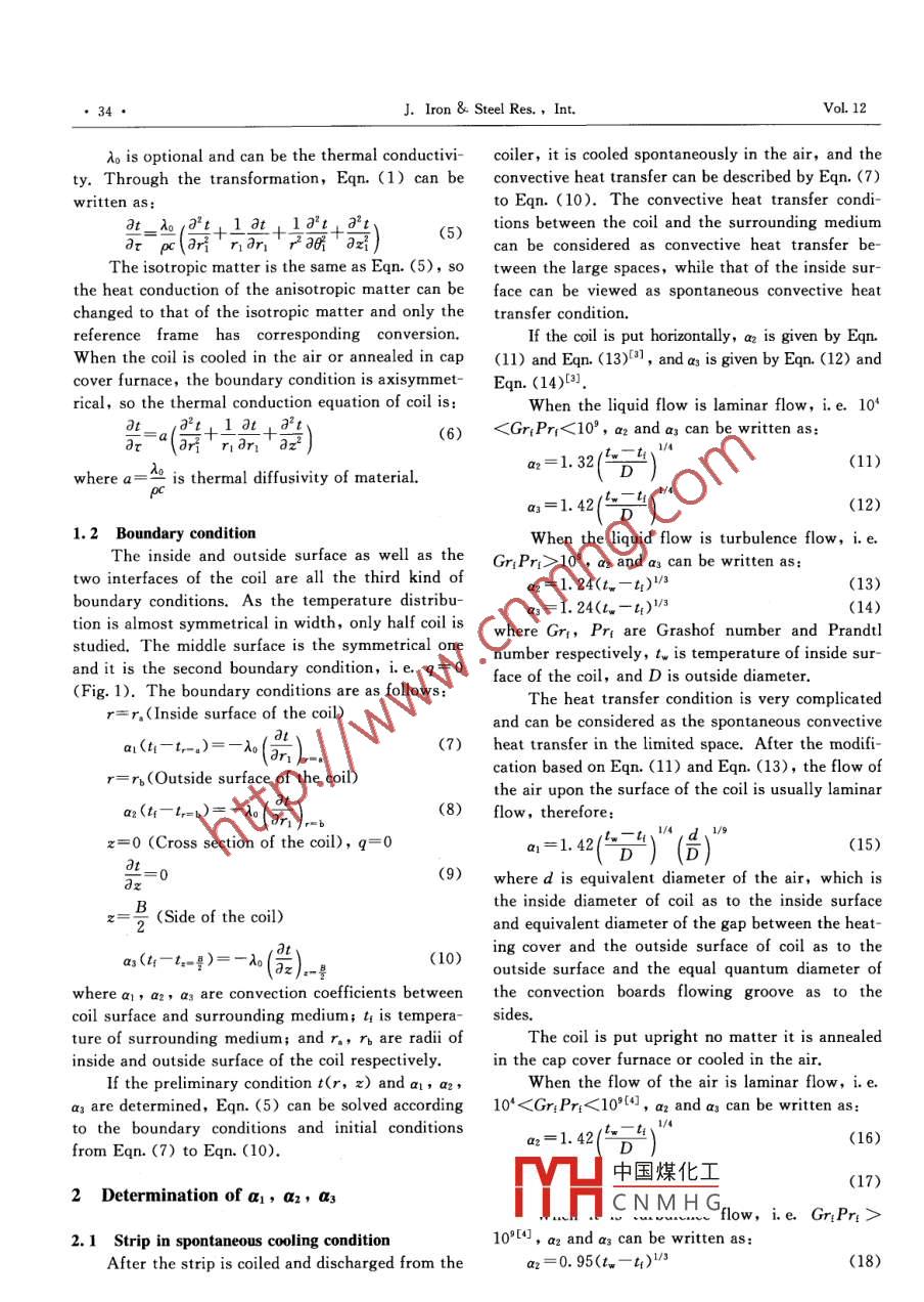 Vol. 12 No. 2J. Iron & Steel Res. , Int,Mar. 2005Mathematical Model for Temperature Field of Strip Coilin Cooling and Heating ProcessSUN Jji-quan',SUN Jing hong',WU Bin2 ,LIAN Jia- chuang(1. University of Science and Technology Beijing, Beijing 100083, China; 2. Baoshan Iron and Steel Group Co,Shanghai 201900, China; 3. Yanshan University, Qinbuangdao 066004, China)Abstract : The convection between the strip coil boundary and the surrounding medium was studied, and the math-ematical model and boundary conditions for the temperature field of anisotropic strip coil was proposed, and thetemperature field of strip coil were calculated by the analytic method,Key words: strip coil; anisotropy; temperature field; mathematical modelWith the development of the automobile indus-try and electric appliances, the requirement on stripz▲tgquality, especially on surface quality, becomes strin-T.gent. The variations of the temperature field duringcooling cannot be neglected, because asymmetricalatemperature field will result in the thermal stressand change the strip shape. Especially during annea-ling, the cold rolled strip coils will bring about cohe-sion between coil layers. Therefore, the tempera-ture field should be calculated for both hot and coldO=0rolled strip coils. It is also the prerequisite for thecomputation of the thermal stress. The heat transferbetween strip surface and surrounding medium wasFig. 1 Heat transfer model of strip coilstudied in this paper.With different coil compacting pressure, con-erential directions of the cylindrical reference frametact between layers differs and there will be somerespectively, thermal conductivities in these direc-surface thermal contact resistance, so the heattions are the principal thermal conductivities. So thetransfer is anisotropic. That is, the thermal conduc-heat conduction equation can be described as[1]:tivity in radial direction is different from that in axialand cutting directions, and depends on the coil com-t_?(r \+20+n. rt(1)pc-北rr(pacting pressure. The heat transfer model of stripwhere p is density of the strip; c is specific. heat ofcoil is shown in Fig. 1.the material; and τ is time.1 Basic FormulaSince the circumferential thermal conductivityof the coil is similar to the axial one, i.e. ,λo=λ:=1. 1 Heat conduction differential equation of coilλo,while the radial thermal conductivity differs fromAs to heat conduction, the coil should be homo-others, the transforms can be obtained as2;geneous and anisotropic. The thermal conductivitydistribution of anisotropic matter takes an ellipsoid.n=r/空,0二0號(hào),z=z√(2)The principal axes of this ellipsoidal surface ξ, η,ζare called the principal heat conductive axis, and the Let m,=A(3)thermal conductivity λe,入,, λ5 are the principal ther-Eqn. (2) can be changed to following form:mal conductivity. Because the principal heat conduc-tion axes accords with the axial, radial and circumf-中國(guó)煤化工(4)Biography; SUN Ji quan (1959-), Male, Doctor, Professor;E- mail: sjq19590MHCNMHGer2s,2003●34●J. lron& Steel Res.,Int.Vol. 12λo is optional and can be the thermal conductivi-coiler, it is cooled spontaneously in the air, and thety. Through the transformation, Eqn. (1) can beconvective heat transfer can be described by Eqn. (7)written as:to Eqn. (10). The convective heat transfer condi-at_0(ψ+1些+1+)tions between the coil and the surrounding mediuma pc(ri" ndn' r 30f' zijcan be considered as convective heat transfer be-The isotropic matter is the same as Eqn. (5),sotween the large spaces, while that of the inside sur-the heat conduction of the anisotropic matter can beface can be viewed as spontaneous convective heatchanged to that of the isotropic matter and only thetransfer condition.reference frame has corresponding conversion.If the coil is put horizontally, az is given by Eqn.When the coil is cooled in the air or annealed in cap(11) and Eqn. (13)[3], and as is given by Eqn. (12) andcover furnace, the boundary condition is axisymmet-Eqn. (14)[3]. .rical, so the thermal conduction equation of coil is: .When the liquid flow is laminar flow, i.e. 10*a=a(+1 +(6)< 10* , ar and as can be written as;two interfaces of the coil are all the third kind ofaz=1. 24(tw - - t)1/3(13)boundary conditions. As the temperature distribu-a3=1.24(2- - t)1/3(14)tion is almost symmetrical in width, only half coil is .where Gr,Pr: are Grashof number and Prandtlstudied. The middle surface is the symmetrical onenumber respectively, tw is temperature of inside sur-and it is the second boundary condition, i.e. q= 0face of the coil, and D is outside diameter.(Fig. 1). The boundary conditions are as follows:The heat transfer condition is very complicatedr= r。(Inside surface of the coil)and can be considered as the spontaneous convectivea(t-t,-.)=-2o(斯(7)heat transfer in the limited space. After the modifi-cation based on Eqn. (11) and Eqn. (13), the flow ofr=r,(Outside surface of the coil)the air upon the surface of the coil is usually laminara2(4-L=b)=-20(n ).(8)flow, therefore:z=0 (Cross section of the coil), q=0(15)at_a-1.2(")“(號(hào))“二=0(9)where d is equivalent diameter of the air, which isthe inside diameter of coil as to the inside surfacez= 5 (Side of the coil)and equivalent diameter of the gap between the heat-as(4-t.-2)=-20() )(10)ing cover and the outside surface of coil as to the :)-4outside surface and the equal quantum diameter ofwherea1, az, as are convection coefficients betweenthe convection boards flowing groove as to thecoil surface and surrounding medium; t is tempera-sides.ture of surrounding medium; and r。, r are radii ofThe coil is put upright no matter it is annealedinside and outside surface of the coil respectively.in the cap cover furnace or cooled in the air.If the preliminary condition t(r, x) anda1, a2,When the flow of the air is laminar flow, i. e.a3 are determined, Eqn. (5) can be solved according10* 2. 1 Strip in spontaneous cooling condition109[], 