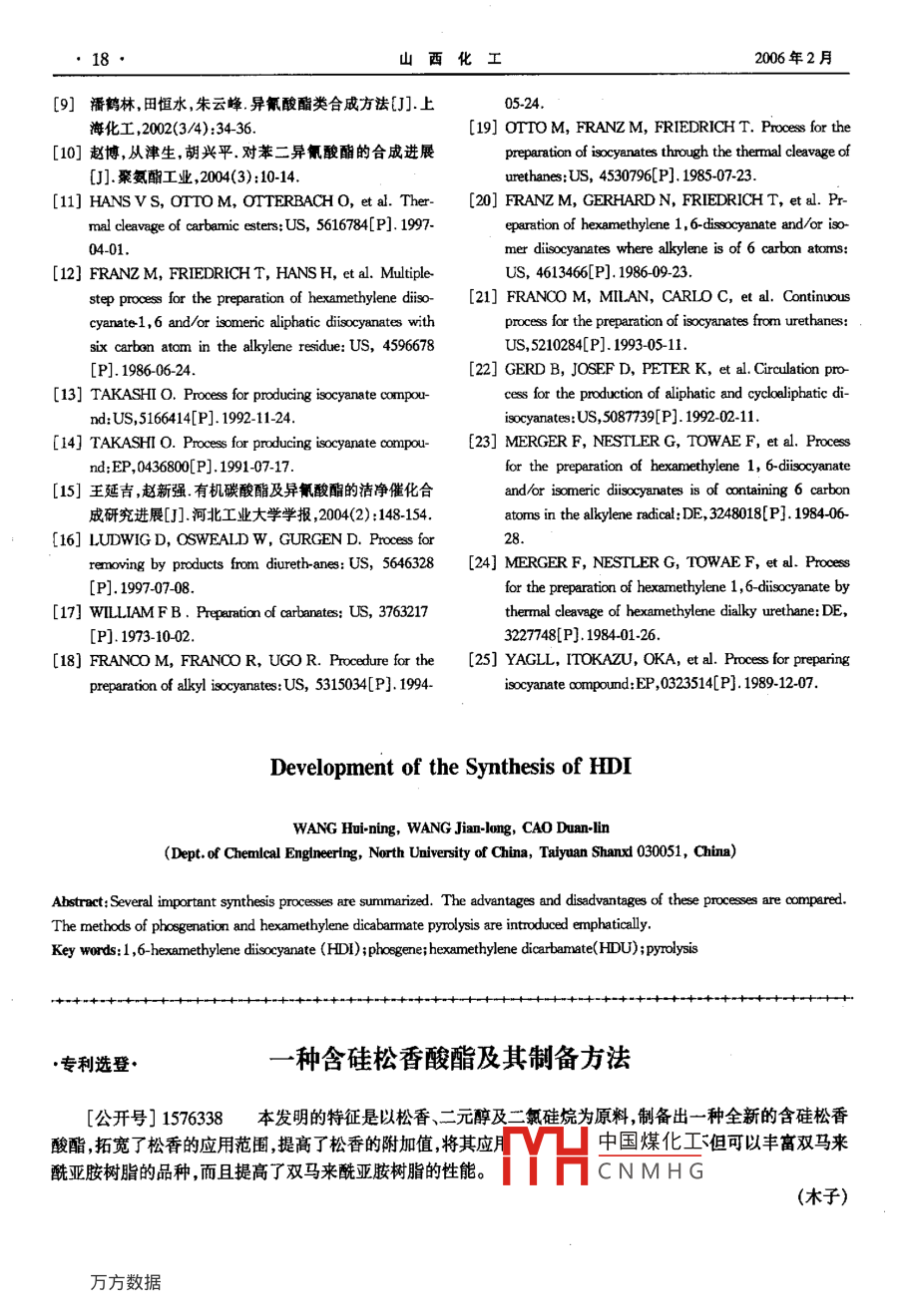 第26卷第1期山西化工Vol.26 No.12006年2月SHANXI CHEMICAL INDUSTRYFeb. 2006綿述與論壇HDI合成工藝進(jìn)展王慧寧,王建龍,曹 端林(中北大學(xué)化學(xué)工程系,山西太原030051)摘要:綜述了六亞甲基二異氰酸酯(HDI)的幾種主要合成工藝,并對(duì)其優(yōu)缺點(diǎn)進(jìn)行了分析,著重介紹了光氣法和六亞甲基二氨基甲酸甲酯(HDU)熱解法。關(guān)鍵詞:六亞甲基二異氰酸酯(HDI);光氣,六亞甲基二氨基甲酸甲酯(HDU);熱解中圖分類號(hào):0623.7文獻(xiàn)標(biāo)識(shí)碼:A文章編號(hào):1004-7050(2006)01-0014-05很多,大致可分為光氣法和非光氣法兩大類,本文對(duì)引盲其工藝進(jìn)行綜述。六亞甲基二異氰酸酯(HDI)為無(wú)色或淺黃色透1光氣法明液體,具有不泛黃的特點(diǎn)1,廣泛應(yīng)用于飛機(jī)制1.1 兩步光氣法.造、汽車工業(yè)建筑材料、工業(yè)設(shè)備管道和保溫絕熱由己二胺(HDA)光氣化法可生成HDI。過(guò)去材料以及與人民生活密切相關(guān)的輕工業(yè)產(chǎn)品,如制采用的- -步高溫光氣法,由于副產(chǎn)物多、收率低,因鞋、合成革、電冰箱的保溫材料及防水材料等。而發(fā)展為現(xiàn)在使用的兩步光氣法。兩步光氣法的第HDI目前只有法國(guó)德國(guó)和日本等國(guó)有工業(yè)化一步反應(yīng)溫度較低,第二步溫度較高,故該法又稱冷生產(chǎn)。我國(guó)尚未大批量生產(chǎn),基本上依靠進(jìn)口。合熱兩步反應(yīng)法?;瘜W(xué)反應(yīng)式如(1)~(7)[2~51。成異氰酸酯的方法有20多種,制備HDI的方法也NH2(CH2)6NH2 + 200C2一→CIC0NH(CH2)6NH0OCl + 2HCl(1)NH2(CH2)6NH2 + 2HCI一NH2(CH2)6NH2. 2HCl2)NH2(CH2)6NH2 + aI00NH(CH2)6NHCOC1一→NH2(CH2)6NH2 .2HCl + 0CN(CH2)6N0O(3NH2(CH2)6NH2 +OCN(CH2)6NOO一→NH2(CH2)6NHCONH(CH2)6NH2(4)CICONH(CH2)6NHOOCl- +0CN(CH2)6NCO+ 2HCl(5)NH(CH2)6NH2 .2HCl + 200C2一+0CN(CH2)6N0O+ 6HCI(6)CICONH(CH2)6NHCOCl+ NH(CH2)6NH2 - -→NH(CH2)6NHCONH(CH2)6NHCOCl+ 2HCl +焦油狀物質(zhì)(7)第一步反應(yīng)保持溫度在80 C以下,主要發(fā)生前第- -步,將HDA溶解在惰性溶劑中,保持溫度四個(gè)反應(yīng);第二步反應(yīng)保持溫度80 C以上,主要發(fā)在20C~80 C(通常為40 C),導(dǎo)人光氣,進(jìn)行低生后三個(gè)反應(yīng)。溫反:IDA的鹽酸鹽。如中國(guó)煤化工反應(yīng)步驟簡(jiǎn)述如下:果反江(5)進(jìn)行得較快,生成的.YHC NMH發(fā)應(yīng),生成脈,產(chǎn)物收收稿日期:2005-09-05作者簡(jiǎn)介:王慧寧,女, 1981年出生,中北大學(xué)2003級(jí)碩士研究生,率較低;但如果反應(yīng)溫度低于20 C ,則需要制冷設(shè)主要從事精細(xì)化學(xué)品的合成及應(yīng)用研究工作。2006年2月王慧寧籌,HDI合成工藝進(jìn)展15●備,不利于工業(yè)化。低溫反應(yīng)中, HDA與光氣以摩精制,即可得到HDI。爾比為1:1導(dǎo)人,能得到理想效果。造鹽光氣法分為碳酸鹽法和鹽酸鹽法兩種,又以第二步,將第一步生成的反應(yīng)液升溫,并保持在碳酸鹽法較好。這是因?yàn)辂}酸與胺的反應(yīng)速度快,晶130心~190 C ,繼續(xù)導(dǎo)人光氣進(jìn)行高溫反應(yīng),即二粒大小不易控制;易產(chǎn)生晶粒間包液,使成鹽率難以氨基甲酰氯脫氯化氫的反應(yīng)(5),生成HDI。低于控制;又易生成氨基多鹽酸鹽,使料液黏度增大7。120 C時(shí),反應(yīng)(3)速度慢,對(duì)工業(yè)生產(chǎn)不實(shí)用;超過(guò)與直接法相比,造鹽光氣化法雖可較好地抑制200C,容易發(fā)生聚合,生成分子量較高的物質(zhì),使副產(chǎn)物,但反應(yīng)時(shí)間長(zhǎng)。此外,在HDI鹽酸鹽的制HDI收率低。造中,HDA和氯化氫的反應(yīng)進(jìn)行得非???如果簡(jiǎn)待反應(yīng)液變透明,反應(yīng)結(jié)束,再用惰性氣體驅(qū)除單地把氯化氫氣體通人HDA的惰性溶劑中,在未反應(yīng)的光氣和氯化氫。脫溶劑后進(jìn)行蒸餾精制,HDA濃度較高的情況下,因HDA鹽酸鹽的析出,會(huì)得到HDI。導(dǎo)致溶液黏度上升。因混合不易均勻,易殘留未反從兩步光氣法的反應(yīng)過(guò)程中可以看出:生成的應(yīng)的HDA,故光氣化后會(huì)增加脲及單異氰酸酯氯化脲類化合物將進(jìn)-步消耗光氣并形成樹脂狀的焦油物等副產(chǎn)物的量?;衔?直接影響異氰酸酯的收率。為避免在第一2非光氣法步反應(yīng)過(guò)程中形成脲類化合物, -般是在光氣化前將HDA先與氯化氫或二氧化碳成鹽,即下面介紹光汽法制HDI是傳統(tǒng)的方法,生產(chǎn)過(guò)程包括光的造鹽光氣法。氣的合成、工藝的處理(冷凍液化、貯存、輸送等)、1.2造鹽光氣法[6] .光氣化反應(yīng)、光氣的脫除、產(chǎn)品的分離與精制和尾氣此法是目前HDI工業(yè)化生產(chǎn)的主要方法,它克的處理等。雖然目前光氣法是制備HDI的主要方服了直接光氣法的缺點(diǎn)。法,但在生產(chǎn)過(guò)程中存在諸多問(wèn)題:由于光氣是劇毒首先,將HDA溶解在惰性溶劑中,通人氯化氫氣體,生產(chǎn)過(guò)程的安全環(huán)保等一系列工程技 術(shù)問(wèn)題或二氧化碳?xì)怏w進(jìn)行造鹽反應(yīng),生成HDA的鹽酸難以徹底解決;如果吸收處理不完善,在光氣法中有鹽或碳酸鹽;然后再與光氣進(jìn)行反應(yīng),制備HDI。大量的副產(chǎn)物氯化氫會(huì)泄漏造成環(huán)境污染;副產(chǎn)物造鹽的目的是為了保護(hù)HDA的氨基,以免氨基與氯化氫對(duì)生產(chǎn)過(guò)程的設(shè)備腐蝕嚴(yán)重,因此對(duì)設(shè)備材光氣反應(yīng)產(chǎn)物氨基甲酰氯發(fā)生反應(yī