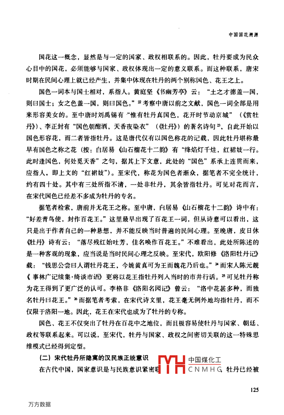 中國國花溯源扈耕田摘要:中國正式有國花,始于晚清。然而“國花”的名稱卻至遲在明代中期已經(jīng)出現(xiàn)。考察明清時期國花名稱的出現(xiàn)、指屬及演進(jìn),探尋其間所隱寓的民間心理,對我們理解民族心態(tài)、民族習(xí)俗均有重要意義。關(guān)鍵詞:國花溯源牡丹國花往往是一個國家民族精神、民族心態(tài)的典型體現(xiàn)。中國最早在何時出現(xiàn)國花這一名稱,最早的國花是指什么,她又是因何而被稱為國花,這無疑是關(guān)涉中華民族心態(tài)、民族精神的一個重要問題。1904年(一說1903年)清王朝曾敕立牡丹為國花,并在北京頤和園為牡丹建立國花臺,慈禧親命刻“國花臺”三字于石上。當(dāng)代學(xué)者大都以為此乃中國有國花的起始。如果從現(xiàn)代意義的國花概念來看,這自然是正確的。然而,如果認(rèn)真加以考察,我們就會發(fā)現(xiàn),在文獻(xiàn)記載中,中國早已有國花之名,而且可以確指的僅有牡丹。也就是說,牡丹被稱為國花,在欽定之前有著一個長期被民間認(rèn)可的過程。惜時至今日,這一問題尚未得到系統(tǒng)的梳理,故不揣淺陋,特加考索,并乞教于方家。、國花之稱的文獻(xiàn)考寨(一)明代中期“國花”一詞最早出現(xiàn)系指牡丹根據(jù)筆者的考索,在明代之前古籍中雖有“南國花”、“故國花”等記載,但“國花”并非一個獨立的詞。至明代“國花”作為一個詞始最早出現(xiàn)?,F(xiàn)存最早的記載為李夢陽丹盛開群友來看》一詩:中國煤化工吾家何處牡丹園,揚子崗西古宋原。忽有CNMHG駐江村。憐香中國國花溯源實怕青蘿掩,在野虛愁蔓草繁。碧草舂風(fēng)筵席罷,何人道有國花存。李夢陽(1473-1530),字獻(xiàn)吉,號空同。原籍慶陽(今屬甘肅),童年時徙居于河南開封,為明代前七子領(lǐng)袖。詩中所云“古宋原”即指開封一帶。據(jù)其卒年可知,牡丹最遲在嘉靖九年(1530)已經(jīng)有了國花之稱明代中期另有一處將釷丹稱為國花的記載。邵經(jīng)濟(jì)《柳亭賞牡丹和弘兄韻》有紅芳獨抱春心老,綠醑旋添夜色妍。自信國花來絕代,漫憑池草得新聯(lián)。香窺蜂蝶偏多恨,笑隔云沙亦可仙。勝賞百年拚共醉,繁華那更勝今年。2邵經(jīng)濟(jì)(1493-1558),字仲才,號泉臣,仁和(今浙江杭州)人。該詩雖寫作年代尚無法認(rèn)定,但自不晚于作者的卒年除此之外,明代中期黃省曾的《江南曲》三十首之二十七亦出現(xiàn)了國花一詞九逵擔(dān)雜英,朱門競相買。國花委青郊,零落無人采?!?黃省曾(1490-1540)字勉之,號五岳山人,明代吳縣(今江蘇蘇州)人。惜其詩中之國花所指,今已無法考實。二)晚明牡丹稱為國花者漸眾且出現(xiàn)國花臺建筑至晚明,文獻(xiàn)中將牡丹稱之為國花者漸眾。劉侗《帝京景物略》一書中有北京極樂寺因廣種牡丹而修建國花堂的記載,國花堂遂成為考察國花起源的一條重要線索。(帝京景物略》一書刊刻于崇禎八年(1635),故周士琦先生曾據(jù)此認(rèn)定國花堂的建立應(yīng)在1635年之前?!粐ㄌ媒⒌木唧w時間,周先生卻沒能予以詳考。其實袁中道《坷雪齋集》對此有明確記載極樂寺左有國花堂。前堂以牡丹得名。記癸卯夏,一中貴造此堂既成,招石洋與余飲。伶人演《白兔記》。座中中貴五六人皆哭欲絕,遂不成歡而別。這里明確提到了國花堂建立的時間為“癸卯夏”。袁中道(15701623),字小修,湖北公安人,為著名的公安派三袁之一。中國煤化了卯夏為明萬歷三十一年(1603)夏。這比周士琦先生提出的HHCNMHG121民俗研究20104在袁氏詩文中除“國花堂”之外,亦有單獨提到“國花”一詞者。萬歷四十四年(1616)楊鶴主盟,袁中道等人參與了海淀李威畹園舉行的一次文人雅集。其衠海淀李戚畹園大會》詩有云:“野鶴止同家鶩狎,國花長作圃蔬看?!?所謂李戚畹園乃明神宗朱翊鈞外祖父李偉所建,簡稱“李園”。又因李偉被封為武清侯,亦稱武清侯別業(yè)”,其正式名稱則為“清華園”。其故址位于今北京大學(xué)西墻外,方圓十里,在“都下為名園第一”。7袁中道詩中并未明確所謂的國花究系何指,但考察其園中花卉的種植情況,此一問題便不難解決。據(jù)記載,清華園“植物配置方面,花卉大片種植的比較多,而以牡丹和竹最負(fù)盛名于當(dāng)時,園中有牡丹千計,…園中牡丹有很多異種,以‘綠蝴蝶’為最,開時是稱花海。”8可見清華園之花以牡丹最負(fù)盛名,種植極多,且有花海之稱。袁中道詩中所云“國花長作圃蔬看”自是言牡丹種植之普遍、種植面積之大,故所稱“國花”仍然是指牡丹。與袁中道生活大約同時的一些文人,在其詩文中亦有將牡丹稱之為國花者。如著名詩人、浙江金壇王彥泓(1593-1642)侑有贈》詩云:“國花第一數(shù)姚黃,更共明珠字夜光?!薄阍娭械囊S為牡丹珍品,素有花王之稱。福建郭良翰(生卒年不詳有云:“人生若行路,前經(jīng)險阻,則后必通衢,亦似國花。葩艷獨先,則零落必早?!薄愦颂庪m未明言國花之所指,但文中將國花與葩艷花開之先后進(jìn)行對比,指出國花晚開,正與牡丹暮春始開的特點相吻合。因此結(jié)合當(dāng)時牡丹已經(jīng)被許多人稱為國花的事實,這里的國花指牡丹是無疑義的。除了以上數(shù)人,詩文中“國花”一詞在晚明文集中還出現(xiàn)過一次。沈德符《長至夜聽寒仙歌即席賦贈》云:“合閎添宮線,幃開見國花。顏溫初過酒,吻燥偶需