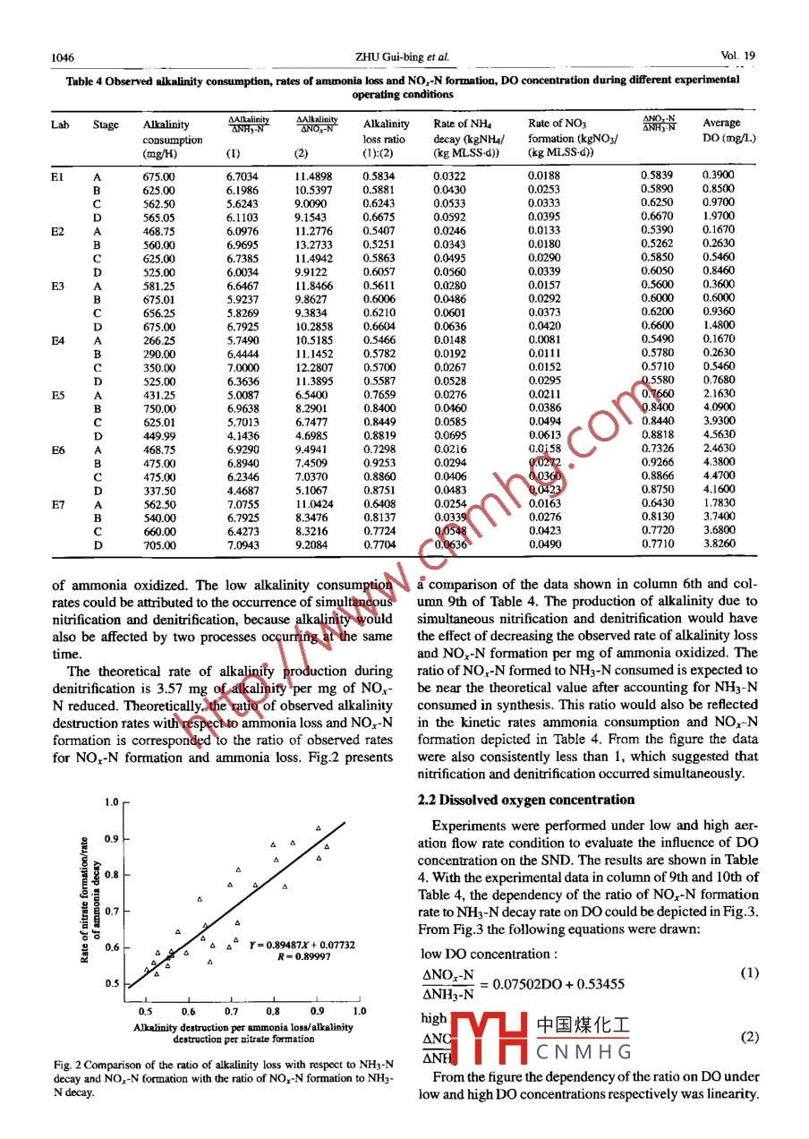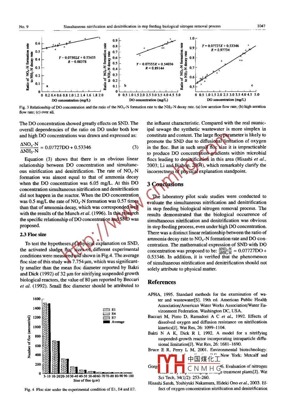 Available online at www.sciencedirect.comJOURNAL OFENVIRONMENTALScienceDirectSCIENCESISSN 1001-0742CN1-26291XEEJoumal of Enviomnenlal Sciences 19(2007) 1043 -1048www.ec. ac.cnSimultaneous nitrifcation and denitrification in step feeding biologicalnitrogen removal processZHU Gui-bing2, PENG Yong .zhen13., WU Shu-yun' , WANG Shu-ying', XU Shi-wei41. School of Municipal and Emironrmental Engineering, Harbin Institute of Technology, Harbin 150090, China2. Research Center for Eco- Environmental Sciences, Chinese Academry of Sciences, Bejing 100085, China. E-mail: gbzhu@rees.ac.cn3. Key Laboratory of Bejing Water Quality Science and Water Environment Recovery Engineering,Bejing University of Technology, Bejing 10022, China4. Beijing Drainage Group Co. Lld, Beijing 100038, ChinaReceived 9 October 2006; revised 6 December 2006; accepted 4 April 2007AbstractThe simultaneous nitrification and denitrifcation in step-feeding biological nitrogen removal process were investigated underdifferent infuent substrate concentrations and acration flow rates. Biological occurence of simultaneous nitrification and denitrifcationwas verified in the aspect of nitogen mass balance and alkalinity. The experimental results also showed that there was a distinct linearrelationship between simultaneous nitrifcation and denitification and DO concentration under the conditions of low and high aerationflow rate. In each experimental run the floc sizes of activated sludge were also measured and the results sbowed that simultaneousnitrification and denitrification could occur with very small size of foc.Key words: biological nitrogen removal; dissolved oxygen; floc size; simultaneous nitrifcation and denitrification; step feeding processIntroductionmicrobial flocs or biofilms due to difusional limitations.The biological explanations for SND are in contrast to theBecause of the stringent nutrient levels being requiredtraditional“engineering" conception of nitrification andin the effluents to protect lakes and other natural waterdenitrification. Microbiologists have reported the existencefrom eutrophication, removal of nitrogen from dischargedof aerobic denitrifers as well as beterotrophic nitrifierswastewater has been required in many wastewater treat- (Kim et al, 2005; Zhu et al, 2007b).ment plants. The step-feeding anoxic/aerobic biologicalPrevious researches showed that three principle fac-nitrogen removal process is characterized by high totaltors, carbon supply, oxygen concentration and foc size,nitrogen removal efficiency and unecessary intermal re-predominantly infuenced SND (Zhu et al, 2007b). Butcycle. During the last decade, many researchers have putthere were still some unresolved problems. The largemuch attention to this process and drawn many valu-loc parameter was likely to promote the SND due toable conclusions (Larrea et al, 2001; Zhu et al, 2005).difusional limitation of oxygen in the floc, whether smallMoreover, nitrogen loss and simultaneous nitrification andsize parameter is adverse to SND was still not reported.denitrification in step feeding process were also reportedIn addition, it has not been reported in literature thatby researchers (Gorgun et al, 1996; Zhu et al, 2007a).denitrification reaction could be accomplished under highSimultaneous nitrification and denitrification (SND)DO concentration condition and the relationship of DOimplies that nitrification and denitification occur concur-concentration and SND. In the article, the SND in steprently in the same reaction vessel under identical overall feeding process was investigated. The main objective wasoperating conditions. SND is of particular interest in sav-to explain the relationship of DO concentration and SND.ing anoxic volume and in treatment wastewaters with lowC:N ratio (Zhu et al, 2007b). The mechanism and explana-1 Material and methodstion for SND can be divided into two broad categories. Thephysical and conventional explanation is that SND occurs1.1F中國煤化工as a consequence of DO concentration gradients withinA1:MHC N M H Gjical nitrogen removalProject supported by the Key Inlermational Cooperative Program ofprocess made of plexiglass with a working volume ofNSFC (No. 50521140075), the Hi-Tech Research and Devclopment80L(800mmx220mmx500mm)wasusedinthisProgram (863) of China (No. 2004AA601020) and the Attached Projectsof“863" Project of Beijing Municipal Science and Technology (No,MAAOstudy (Fig.1). The volume of four stages was the same20005186040421). *Corresponding author. E mail: pyz@bjut.edu.cn.and the volume ratio of anoxic to oxic in each stageZHU Gui-bing es al.Vol. 19CD也1本11Fig. 1 Schematic diagram of step feoding biological nitogen removal process. (1) infuent tank; (2) check value; (3) feeding pump: (4) mechanicalmixer; (5) difuser; (6) air flow mcter; (7) air compressor; (8) secondary clarifer, (9) efuent; (10) returm sludge pump; (1 I) waste slodge.Table 2 Experimental operating procedurewas maintained at 1:3.5. A mechanical mixer was usedin anoxic zone to provide liquid mixed well. A number LabInfuentAerationof outlets for sample analysis were emplaced with theTKN (mg/L)COD (mg/L)flowrate (m2/h)distance of 20 cm from reactor bottom in each anoxic and402680.6aerobic zone. An air compressor with micropore difuser E234was used for aeration. An air flow meter was used for!272contolling the airflow rate. The type of final clarifier was551.46upright clarifer with a working volume of 30 L.3634012374501.2 Experimental operating procedureThe reactor feeding consisted of synthetic wastewaterwas measured using Liquid Particle Counting Systemwith characteristics similar to those of domestic wastew-Model 9703 (HIAC Royco) with the sensor HRLD .400.ater (Watnabe et al, 1995). It was prepared by using tapAll analyses were performed according to the Standardwater, dechlorinated by the use of sodium thiosulfate, andMethods (APHA, 1995).the addition of dosages of chemicals, as indicated in Table1. During the experimental peri