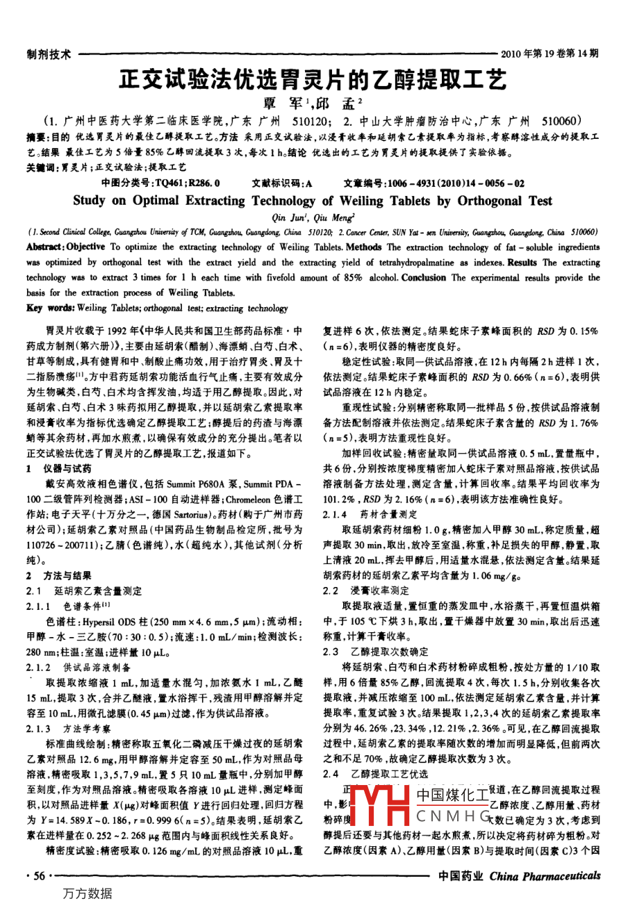 制劑技術(shù)2010年第19卷第14期正交試驗(yàn)法優(yōu)選胃靈片的乙醇提取工藝覃軍,邱孟(1.廣州中醫(yī)藥大學(xué)第二臨床醫(yī)學(xué)院,廣東廣州510120;2.中山大學(xué)腫瘤防治中心,廣東廣州510060)摘要:目的優(yōu)選胃靈片的最佳乙醇提取工藝。方法采用正交試驗(yàn)法,以浸膏收率和延胡索乙素提取率為指標(biāo),考察醇溶性成分的提取工藝結(jié)果最佳工芑為5倍量85%乙醇回流提取3次,每次1h結(jié)論優(yōu)選出的工藝為胃靈片的提取提供了實(shí)驗(yàn)依據(jù)。關(guān)鍵詞:胃靈片;正交試驗(yàn)法;提取工藝中圖分類號:TQ461;R2860文獻(xiàn)標(biāo)識碼:A文章編號:1006-4931(2010)14-0056-02Study on Optimal Extracting Technology of Weiling Tablets by Orthogonal TestQin Jun, Qiu MengL Second Clinical College, Guangahou Uniersity of TCM, Guangahou, Guangdong, China 510120 2. Cancer Center, SUN Yat-Kn Uninersity, Guanghou, Guangdong, China 510060)ctracting technology of Weiling Tablets. Methods The extraction technology of fat-soluble ingredierwas optimized by orthogonal test with the extract yield and the extracting yield of tetrahydropalmatine as indexes. Results The extractinghnology was to extract 3 times for 1 h each time with fivefold amount of 85% alcohol. Conclusion The experimental results provide thebasis for the extraction process of Weiling Tabletswords: Weiling Tablets; orthogonal test; extracting technology胃靈片收載于1992年《中華人民共和國衛(wèi)生部藥品標(biāo)準(zhǔn)·中復(fù)進(jìn)樣6次,依法測定。結(jié)果蛇床子素峰面積的RSD為0.15%藥成方制劑(第六冊)》,主要由延胡索(醋制)、海漂蛸、白芍、白術(shù)、(n=6),表明儀器的精密度良好。甘草等制成,具有健胃和中制酸止痛功效,用于治療胃炎、胃及十穩(wěn)定性試驗(yàn)取同一供試品溶液,在12h內(nèi)每隔2h進(jìn)樣1次二指腸潰瘍。方中君藥延胡索功能活血行氣止痛,主要有效成分依法測定。結(jié)果蛇床子素峰面積的RSD為0.66%(n=6),表明供為生物堿類白芍、白術(shù)均含揮發(fā)油,均適于用乙醇提取。因此,對試品溶液在12h內(nèi)穩(wěn)定。延胡索、白芍、白術(shù)3味藥擬用乙醇提取,并以延胡索乙素提取率重現(xiàn)性試驗(yàn):分別精密稱取同一批樣品5份按供試品溶液制和浸膏收率為指標(biāo)優(yōu)選確定乙醇提取工藝;醇提后的藥渣與海漂備方法配制溶液并依法測定。結(jié)果蛇床子素含量的RSD為1.76%蛸等其余藥材,再加水煎煮,以確保有效成分的充分提出。筆者以(n=5)表明方法重現(xiàn)性良好。正交試驗(yàn)法優(yōu)選了胃靈片的乙醇提取工藝,報(bào)道如下。加樣回收試驗(yàn):精密量取同一供試品溶液0.5mL,置量瓶中,1儀器與試藥共6份,分別按濃度梯度精密加入蛇床子素對照品溶液,按供試品戴安高效液相色譜儀,包括 Summit p680A泵, Summit PDa-溶液制備方法處理,測定含量,計(jì)算回收率。結(jié)果平均回收率為00二級管陣列檢測器;ASI-100自動進(jìn)樣器; Chromeleon色譜工101.2%,RSD為2.16%(n=6),表明該方法準(zhǔn)確性良好。作站;電子天平(十萬分之一,德國 Sartorius)。藥材(購于廣州市藥2.1.4藥材含量測定材公司);延胡索乙素對照品(中國藥品生物制品檢定所,批號為取延胡索藥材細(xì)粉1.0g精密加入甲醇30mL,稱定質(zhì)量超110726-200711);乙腈(色譜純),水(超純水),其他試劑(分析聲提取30min,取出,放冷至室溫,稱重補(bǔ)足損失的甲醇靜置取上清液20mL,揮去甲醇后,用適量水混懸,依法測定含量。結(jié)果延2方法與結(jié)果胡索藥材的延胡索乙素平均含量為1.06mg/g2.1延胡索乙素含量測定2.2浸膏收率測定2.1.1色譜條件1取提取液適量,置恒重的蒸發(fā)皿中,水浴蒸干,再置恒溫烘箱色譜柱: Hypersil ODS柱(250mmx4.6mm,5μm);流動相:中,于105℃下烘3h,取出,置干燥器中放置30min,取出后迅速甲醇-水-三乙胺(70:30:0.5);流速:1.0mL/min;檢測波長:稱重計(jì)算干膏收率。280mm;柱溫:室溫;進(jìn)樣量10μL。2.3乙醇提取次數(shù)確定2.1.2供試品溶液制備將延胡索、白芍和白術(shù)藥材粉碎成粗粉,按處方量的1/10取取提取濃縮液1mL,加適量水混勻,加濃氨水1mL,乙醚樣,用6倍量85%乙醇,回流提取4次,每次1.5h,分別收集各次15mL,提取3次,合并乙醚液,置水浴揮干,殘?jiān)眉状既芙獠⒍ㄌ崛∫?并減壓濃縮至100mL,依法測定延胡索乙素含量,并計(jì)算容至10mL,用微孔濾膜(045μm)過濾,作為供試品溶液。提取率,重復(fù)試驗(yàn)3次。結(jié)果提取1,2,3,4次的延胡索乙素提取率2.1.3方法學(xué)考察分別為46.26%,23.34%,12.21%,236%。可見,在乙醇回流提取標(biāo)準(zhǔn)曲線繪制:精密稱取五氧化二磷減壓干燥過夜的延胡索過程中,延胡索乙素的提取率隨次數(shù)的增加而明顯降低,但前兩次乙素對照品126mg,用甲醇溶解并定容至50mL,作為對照品母之和不足70%,故確定乙醇提取次數(shù)為3次。溶液精密吸取1,3,5,7,9mL,置5只10mL量瓶中,分別加甲醇2.4乙醇提取工藝優(yōu)選至刻度,作為對照品溶液。精密吸取各溶液10μL進(jìn)樣,測定峰面中國煤化工長道,在乙醇回流提取過程積以對照品進(jìn)樣量X(寓g)對峰面積值Y進(jìn)行回歸處理回歸方程中,影乙醇濃度、乙醇用量、藥材為Y=14.589X-0.186,r=0.9996(n=5)結(jié)果表明,延胡索乙粉碎HCNMHG數(shù)已確定為3次,考慮到素在進(jìn)樣量在0252~2.268范圍內(nèi)與峰面積線性關(guān)系良好。醇提后還要與其他藥材一起水煎煮所以決定將藥材碎為粗粉。對精密度試驗(yàn):精密吸取0126mg/m的