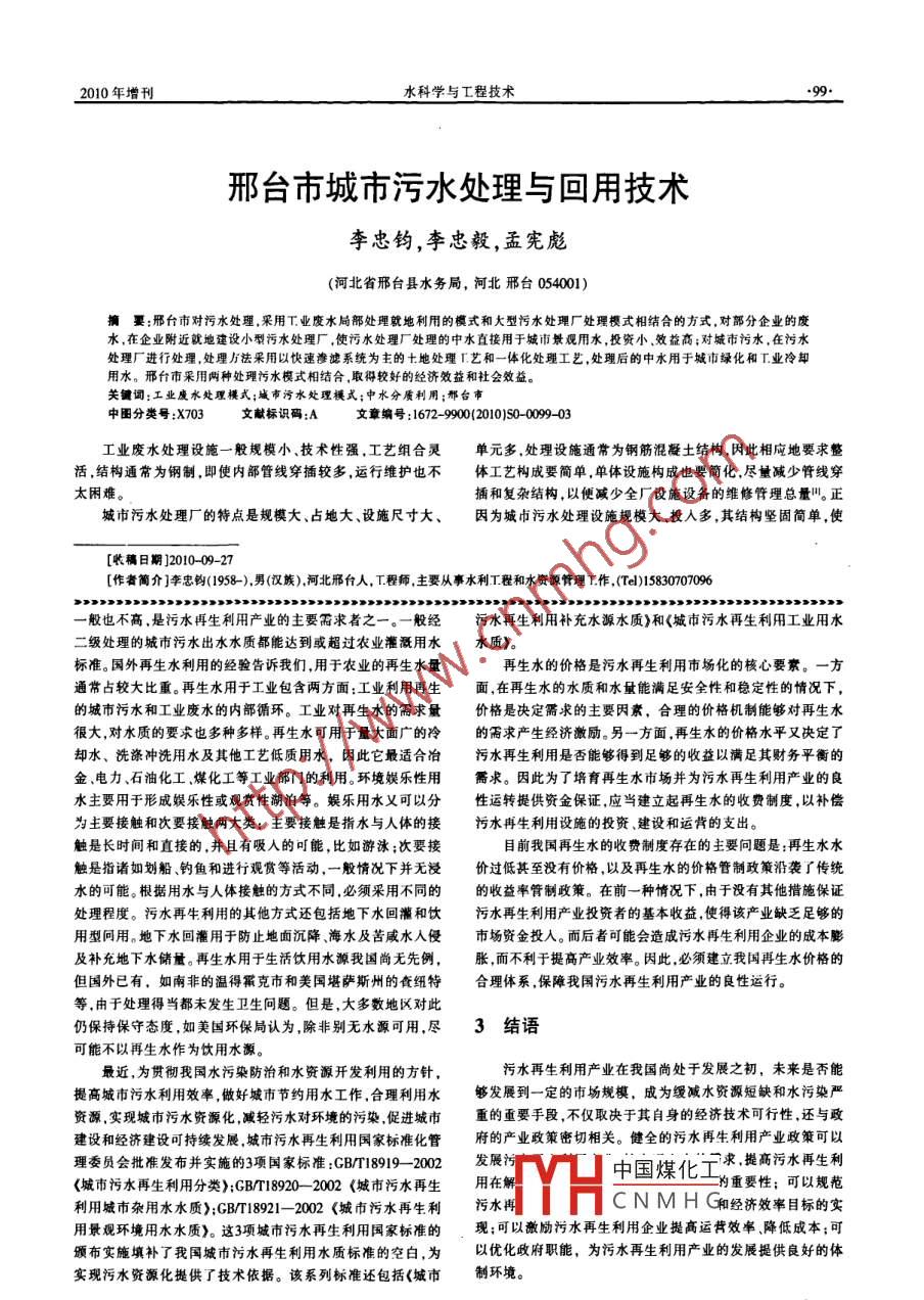 2010年增刊水科學(xué)與工程技術(shù).97.城市污水再生利用研究張愛哲(唐山市引灤工程管理局邱莊水庫樞紐管理處,河北豐潤064007)摘要:城市污水的再生利用是開源節(jié)流 減輕水體污染、改善生態(tài)環(huán)境解決城市缺水的有效途徑之一.也是科技惠民.改善人居環(huán)境的有效途徑之一,是民生水利與科技創(chuàng)新之舉.對實現(xiàn)可持續(xù)發(fā)展具有戰(zhàn)略意義。關(guān)鍵詞:城市污水;規(guī)劃;再生利用中國分類號:X703文獻(xiàn)標(biāo)識碼:A文章編號:1672- 90(2010)50 0097-031城市供水狀況跨流域調(diào)水作為傳統(tǒng)解決方案。在傳統(tǒng)方式之外,開發(fā)非傳統(tǒng)水源是解央水資源短缺的另- -條行之有效的途徑,在非傳統(tǒng)20世紀(jì)50年代中期到90年代末期,我國城市年總供水量水源中,污水再生利用具有廣闊的前景。從9.6億m2增加到470.5億m',其中工業(yè)生產(chǎn)用水289.4億m',占1.1 在未充分利用城市污水的水資源能力前,不應(yīng)61.5%;城市生活用水181.1億m',占38.5%。城市年總供水量已達(dá)實施長距離調(diào)水和海水淡化項目640億m',2000年底日供水能力達(dá)21.8億m',供水普及率達(dá)目前城市污水處理(二級處理)投資大約在900-140096.79% ,估計目前城市用水缺水率平均為10%。對城市缺水通常采用開發(fā)地表水.開采地下水資源,以及元/(m.d),在此基礎(chǔ)上的再生處理約400-600元/(m'd)。加上[收稿日期12010-09-27[作者簡介]張愛哲(1977-),女(漢族),河北景縣人,T程師,主要從事水利工程工作. (Tel)13933314781.水量等問題,還要考慮處理廠工藝污水水質(zhì)的特殊性等要求。部門應(yīng)做好宜傳,形成杜會輿論.特別是要加強(qiáng)f預(yù)和增強(qiáng)號3.2 合理提高排污費,加快企業(yè)廢污水處理及回用召力度.①要積極熱情支持污水資源化.并制定相應(yīng)的鼓勵揩建設(shè)污水處理系統(tǒng),是實現(xiàn)廢污水資源化的硬件基礎(chǔ)。而施;②應(yīng)把污水資源化作為政府的號召和規(guī)定,對不執(zhí)行的企要真正實現(xiàn)廢污水資源化,更為重要的是加強(qiáng)管理,提高環(huán)境污業(yè)或部門進(jìn)行相應(yīng)的處罰,這樣有利于推廣應(yīng)用,使廢污水資染成本,使廠家不敢直排污水,同時提高廢污水回用的積極性。源化進(jìn)入良性循環(huán)狀態(tài)。目前我市的環(huán)保部門對污染企業(yè)的管理手段主要為罰款4結(jié)語或收取排污費等,但數(shù)額較小(小于建設(shè)污水處理系統(tǒng)及污水處理系統(tǒng)運(yùn)行的費用),這就導(dǎo)致污染企業(yè)治理污染、回收利張家口地區(qū)水資源相對贗乏,廢污水排放量較大,且呈逐用廢污水的積極性和壓力不高。筆者認(rèn)為必須加大水污染排年上升趨勢,是潛在的巨大水資源。但廢污水水質(zhì)條件不好,污成本,即加大處罰力度.至少得大于或接近污水處理系統(tǒng)的多數(shù)排污口未能做到達(dá)標(biāo)排放,且城市改造造成的污水管路運(yùn)行費用,對無力承擔(dān)的中小型污染企業(yè)果斷進(jìn)行關(guān)?;蜣D(zhuǎn)合并排放的現(xiàn)象較明顯,給污水處理廠的出水水質(zhì)造成壓力。產(chǎn),這樣才能使廢污水的資源化進(jìn)入良性循環(huán),才能使廢污水為能做到廢污水資源化,在加大污水處理設(shè)施建設(shè)和污水處資源化成為可能。理技術(shù)引用的同時,應(yīng)加強(qiáng)水務(wù)管理,增加污水排放成本,提3.3合理引進(jìn)處理技術(shù), 加大廢污水回用力度高排污企業(yè)污水資源化的樂力和積極性。張家口地處河北省西北部,屬大陸性季風(fēng)氣候,四季分總之,張家口地區(qū)還處在廢污水資源化的起步階段,潛力明,雨熱同季,晝夜溫差大,冬季寒冷漫長,夏季涼爽短暫。這和壓力同時存在并且巨大,水行政主管部門和排污企業(yè)均應(yīng)些氣候特點對污水處理系統(tǒng)的運(yùn)行均有很大影響。在引進(jìn)污.做出積極努力,真正實現(xiàn)水資源的可持續(xù)利用,從而保護(hù)我們水處理技術(shù)時,應(yīng)考慮是否能滿足冬季穩(wěn)定運(yùn)行的要求。另外有限寶貴的水資源。應(yīng)考慮引進(jìn)效率比較高,能滿足污水回用要求的污水處理工參考文獻(xiàn):藝,這樣才能滿足廢污水資源化的要求。[1]張希衡.水污染控制T.程[M].北京:冶金T業(yè)出版社,1993.引進(jìn)廢污水處理技術(shù)時,應(yīng)重視污水的深度處理,強(qiáng)力推[2]宋中國煤化工及對策[].國土與自然行污水同用,實現(xiàn)污水資源化,這樣不僅減少了污染,也可緩3]李著資iYHCNMHG可持續(xù)利用[(].中國環(huán)解水荒問題。境管理千部學(xué)院學(xué)報,2006(3).3.4完善相關(guān)法律法規(guī), 增強(qiáng)政府號召力[4]日炳南.污水資源化是污水處理的發(fā)展方向[J].哈爾濱建筑大學(xué)污水資源化不僅是經(jīng)濟(jì)效益,更重要的是社會效益。政府學(xué)報,1996(10).=98*張愛哲:城市污水再生利用研究.2010年增刊管網(wǎng)配套總計600- 1000元/(m'd)。到“十五”末期形成40億m’或者即使可以安排再生水管逍也需要破路才能施工,這是推水源的投資在100億元。形成同樣規(guī)模的長距離引水,以大連廣城市污水再生利用的一個主要困難。引英入連為例,需600億元,海水淡化則需1000億元,可見污水2.22正確評價污水再生利用所具有的環(huán)境和公眾健康風(fēng)險回用在經(jīng)濟(jì)