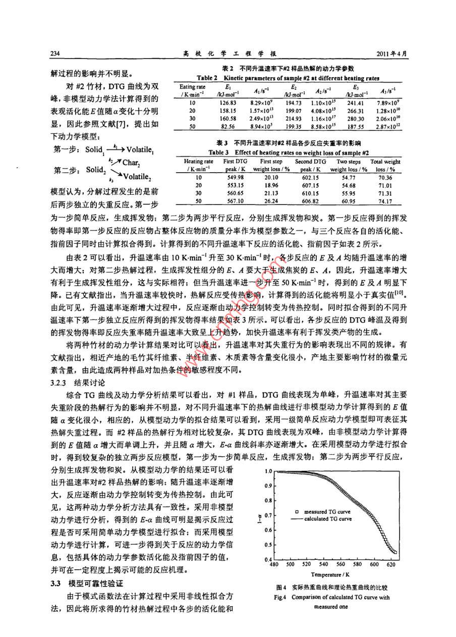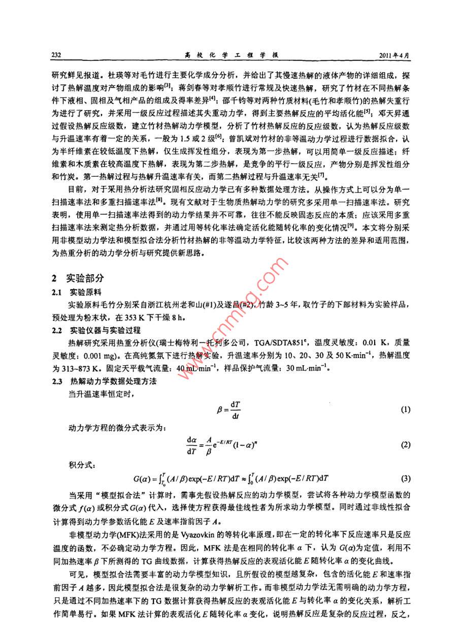 第25卷第2期高?;瘜W(xué)工程學(xué)報No.2 Vol.252011年4月Joumnal of Chemical Engineering of Chinese Universitiespr. 2011文章編號: 1003-90152011)02-0231-05竹材熱解失重動力學(xué)模型研究谷雙,陳紀(jì)忠(浙江大學(xué)化學(xué)工程與生物工程學(xué)系化學(xué)工程聯(lián)合國家重點實驗室,浙江杭州310027)摘要:采用熱重分析儀在溫度范圍313- 873K和N2氣流保護(hù)下,以不同升溫速率(10、20、30、 50 K min~)對兩種竹材(#1和#2)進(jìn)行了熱解失重動力學(xué)研究,并分別采用非模型動力學(xué)法(model-frce kinetics, MFK)和模型擬合法(nmodel-fitig method)分析了熱重分析結(jié)果,結(jié)果表明,#1 樣品在不同升溫速率下的DTG曲線表現(xiàn)為單峰,非模型動力學(xué)法計算獲得的表觀活化能E值隨樣品失重變化很小,說明#1樣品的熱解過程比較簡單,當(dāng)采用動力學(xué)模型進(jìn)行擬合時,一級簡單反應(yīng)動力學(xué)模型即可表征其熱解失重過程:而#2 樣品的熱解行為相對比較復(fù)雜,其DTG曲線表現(xiàn)為雙峰,由非模型動力學(xué)計算得到的E值隨a增大而單調(diào)上升,采用動力學(xué)模型擬合可得到較復(fù)雜的獨立兩步反應(yīng)模型,第一步為一步簡單反應(yīng),生成揮發(fā)物:第二步為兩步平行反應(yīng),分別生成揮發(fā)物和炭。關(guān)鍵詞:竹材;熱重分析:熱解:動力學(xué)中圖分類號: Q22.2; TQ013.2文獻(xiàn)標(biāo)識碼: AStudy on Pyrolysis Kinetics of BambooGU Shuang, CHEN Ji-zhong(State Key Laboratory of Chemical Engineering, Department of Chemical and Biological Engineering,Zhejiang University, Hangzhou 310027, China)Abstract: The pyrolysis of two different kinds of bamboo were carried out by thermogravimetry TG) atdifferent heating rates (10, 20, 30 and 50 K min~) within the temperate range of 313~873 K and under N2atmosphere; And the pyrolysis kinetics of bamboo were analyzed by both model-free-kinetics (MFK) andmodel-itting-method. The results show that pyrolysis of sample # 1 is a quite simple process with single DTGpeak, and the apparent activation energy E calculated by MFK varies lttle with the variation of conversion a.This means that the pyrolysis of sample # 1 is a simple reaction and can be explained as one step firstorderreaction by model-itting. method. The pytolysis of sample #2 is a more complex process with two distinct DTGpeaks; Value of E calculated by MFK increases monotonously with the increase of a According to themode-iting-method, the pyrolysis process of sample # 2 may be described as two independent steps. The firststep is quite simple and can be described by one-step simple reaction model, while the second step is more complexand can be explained as existing two parallel first-order reactions forming volatile matter and char separately.Key words: bamboo; thermogravimetry analysis; pyrolysis; kinetics1引言竹子是重要的森林資源之一。在我國,竹材分布廣,資源蘊藏量大,是一種理想的可再生資源!"。對竹材熱解過程進(jìn)行系統(tǒng)、深入的研究,并深入認(rèn)識竹材熱解的動力學(xué)規(guī)律,將有利于開發(fā)新型竹類產(chǎn)品,對產(chǎn)品加工工藝設(shè)計、優(yōu)化也是十分必要的,具有極大的經(jīng)濟(jì)價值和社會價值.但是,目前國內(nèi)關(guān)于竹產(chǎn)品研究和開發(fā)很少,竹類產(chǎn)品的生產(chǎn)也多停留在原始的初加工階段?,F(xiàn)有文獻(xiàn)對竹材熱解的研究多為竹醋液組分分析及竹炭性質(zhì)分析及應(yīng)用2等,對竹材熱解過程及其動力學(xué)的收稿日期: 2010-09.07; 修訂日期: 2010-10-25.作者簡介:谷雙(1982)。 女遼寧葫蘆島人,浙江大學(xué)博士生。通訊聯(lián)系人:陳紀(jì)忠,E-mal chejz@zju edu.cn2332高?;瘜W(xué)工程學(xué)報2011年4月研究鮮見報道。杜瑛等對毛竹進(jìn)行主要化學(xué)成分分析,并給出了其慢速熱解的液體產(chǎn)物的詳細(xì)組成,探討了熱解溫度對產(chǎn)物組成的影響則:蔣劍春等對孝順竹進(jìn)行常規(guī)及快速熱解,研究了竹材在不同熱解條件下液相、固相及氣相產(chǎn)品的組成及得率差異4:邵千鈞等對兩種竹質(zhì)材料(毛竹和孝順竹)的熱解失重行為進(jìn)行了研究,并采用-級反應(yīng)過程描述其失重動力學(xué),得到主要熱解反應(yīng)的平均活化能');鄧天異通過假設(shè)熱解反應(yīng)級數(shù),建立竹材熱解動力學(xué)模型,分析了竹材熱解反應(yīng)的反應(yīng)級數(shù),認(rèn)為熱解反應(yīng)級數(shù)與升溫速率有著一定的關(guān)系,一 般為 1.5或2級問:曾凱斌對竹材的非等溫動力學(xué)過程進(jìn)行數(shù)據(jù)擬合,認(rèn)為半纖維素在較低溫度下熱解,僅生成揮發(fā)性組分,表現(xiàn)為第一-步熱解, 可以用簡單一級反應(yīng)描述;纖維素和木質(zhì)素在較高溫度下熱解,表現(xiàn)為第二步熱解,是競爭的平行一級反應(yīng),產(chǎn)物分別是揮發(fā)性組分和竹炭。第- -熱解過程 與熱解升溫速率有關(guān),而第二熱解過程與升溫速率無關(guān)"。目前,對于采用熱分析法研究固相反應(yīng)動力學(xué)已有多種數(shù)據(jù)處理方法。從操作方式上可以分為單一掃描速率法和多重掃描速率法間?,F(xiàn)有文獻(xiàn)對于生物質(zhì)熱解動力學(xué)的研究多采用單一掃描速率法。研究表明,使用單一掃描速率法得到的動力學(xué)結(jié)果并不可靠,往往不能反映固態(tài)反應(yīng)的本質(zhì):應(yīng)該采用多重掃描速率法來測定熱分析數(shù)據(jù),并通過用等轉(zhuǎn)化率法確定活化能隨轉(zhuǎn)