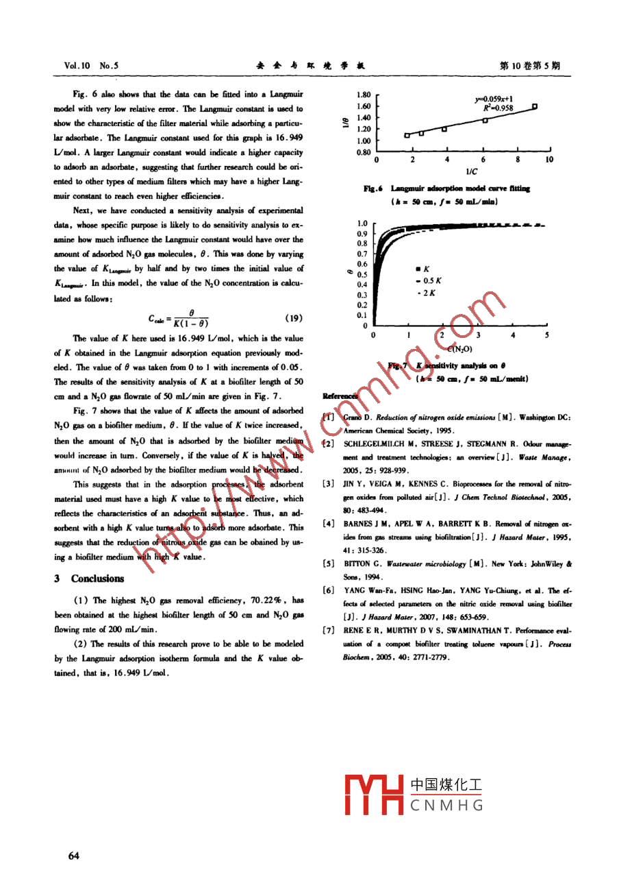 第10卷第5期妻食與環(huán)境爭(zhēng)圾Vol 10 No. 52010年10月Journal of Safety and Environmentoct,2010文章編號(hào):100946094(2010)05006104house gas contributor to overall global warming, behind carbon diox-ide methane and waterNitrous oxide gas removal by usingIn the past, traditional control technologies, such as selectivecompost-based biofilter mediumcatalytic reduction SCR )and selecti(SNCR), used to be applied to control NO, emissions in some indusTania Surya UTAMI, Heri HERMANSYAltries. However, these two methods required high temperatures andJosia SIMANJUNTAK, M. NASIKINthe use of catalysts, involving high installation andChemical Engineering Department, Faculty of Engineeringwell as generating a large quantity of secondary waste for which man-University of Indonesia Campus UI Depok, 16424, Indonesia)and technical constraints in SCR and SNCR methods motivated reAbstrac: This paper is aimed at introducing our research result in the effi. searchers to develop new, cost-efective processes to remove NO,cy in removing nitrous oxide gas(N20)by using compost as a medium fil. from flue gas. Biological No, treatment has been recognized to be ater,which is actually a kind ofderived from cow faeces at Kukusan promising altemative which helps to eliminate industrial waste and improve the current processing methods to come to the state emission despeaking, No is a major greenhouse ga, whose oontinuous presence in the mands. So far as we know, bio-Lreatment approach can be operatedunder ambient temperatures by using inexpensive microbial inoculacHiect just next to CO. In spite of its rather small concentration in the atmowpbere,it is the Number Four large greenhouse gas contrbutor to the over. system, the bio-filter, can be used as a kind of biochemical fixed bedall poba warming, behind carbon dioxide, methane and water vapour. The reactor wherein microorganisms would be clustered on the surface ofbiofiltration experiments we have conducted to explore its removing rate of n2 0 the filter medium and form a biofilm; with the airbome substancesabsorbed by the microorganisms. Biofilter treatment has now provedfar as we know, N20 gas has been fed from the top of the column. It was noworganic compounds(VOCsuch as benzene, styrene, phenols, and alkenesfor 6 hours, The data obtained iner prove to be in conformity with theA biofilter can be used to remove NO, not only by adsorption ofLangmuir adsorption model. The highest N,0 gas removing efficiency can be the filter medium but also bygm of the mi.made to be as high as 70. 22% at the highest biofilter length of 50 cm with theorganism. It is also known that the denitrification mechanism ingas flowing rale of 200 ml/min. The results d this research have finally been the biofilter to remove NO, can be made successfully adopted on remodeled by the Langmuir adsorption isotherm formula with its K value obtained liance of the activities of denitrifying organisms that are ubiquitous inbeing 16.949 1/ molnature. Moreover, denitrifiers proves to be able to reduce NO, underKey words: biofilter, compost, Langmuir adsorption isotherm, Nitrous axidethe limited oxygen conditions. The reductive process tends to takeplace in the following simplified order:No3→NO5→NO→N2ocLC number: X701 DDol:10.3969/j.in,10096094.2010.05.015Nz. In the denitrification process, organic carbons serve as th0 IntroductionNitrogen oxide(NO, is a product that has been emitted fromSeen from above, the present research, aimed at the exploita-tion of compost as a medium filter in removing N,0various industrial processes, transportation, and agricultural activiemove NO, has now successfully improved its removal efficiency at aties. It is difficult to collect NO, once it dispersed in the air, so mate of 95% of what it has to be removed after 40 days of operatiNO, can only be removed effectively before emission. One o the ni- under 120 cm of column length and 30 wh af gas flowrate. Pa.trogen oxide gases is nitrous oxide(N,0), which is commonly knownis more, it can be expected to achieve a high N20 removal efficiencyas laughing gas. Nitrous oxide, unlike other oxides(apart fromdioxide), is a major greenhouse gas. While its radiative warming culated gas flowrate in nature. Its result is also expected to be fittedct is substantially less serious than CO. Nitrous oxides contin-into a Langmuir adsorption model through necessary examination andued presence in the atmosphere, when considered over a 100 year perod, per unit of weight, has 310 times stronger impact on the gobalwarming than that per mass unit of carbon dioxide(C0,). Control of 1 Experimentwhich is part of the Kyoto Protocol. Despite its relatively small con- nated from the manure from the cow faeces at a farm called Kukusancentration in the atmosphere, nitrous oxide is the fourth largest greenKelun中國(guó)煤化工 uniformity in餐Rved:2010-04-14CNMH Gver two weeks in a mouthor::Tania Surya UTAMI, specializes in bioprocess technologytemperature with a relative humidity of 60%-72% with no exlemal61ol. 10 No. 5第10卷第5期trous oxide(N,0)and air with a nutrient supplement supplied to theer as the source of carbon( glucose)moisture.The nutrient solution(pH 8.0)here used should beof such components( in 1 L of H, 0)as k2 HPO(0. 4 g),NI(0.3 g), MSO4. 7H,0(0. 4 g), sodium acetate(2.93 g),and 2mL of trace element solution with( in 1 L of H, O)EDTA (50.0ZnSO4·7H2O(22g),CaCl2·2H2O(55g),MnC2·4H2O(5g), FeSO. 7H20(5.0 g), and CuSO. 5H, 0(1.57 g). The abovesaid inorganic substances were selected because they had been previ-Isly used tond now it is necessary to do some literature study first.Thenit is also necessary to design a biofilter apparatus. The schematic diaThe biofilter system should be made of the followinnents:Fig 1 Schematic diagram of bioflter system(1)N20 gas supply(Provided by PT Aneka Gas Indonesiayear 1997)2)Flow control DwyerFlowrate range: 0-200mL/menit)(3)Valve(On-off valve, stainless steel material)(4)B