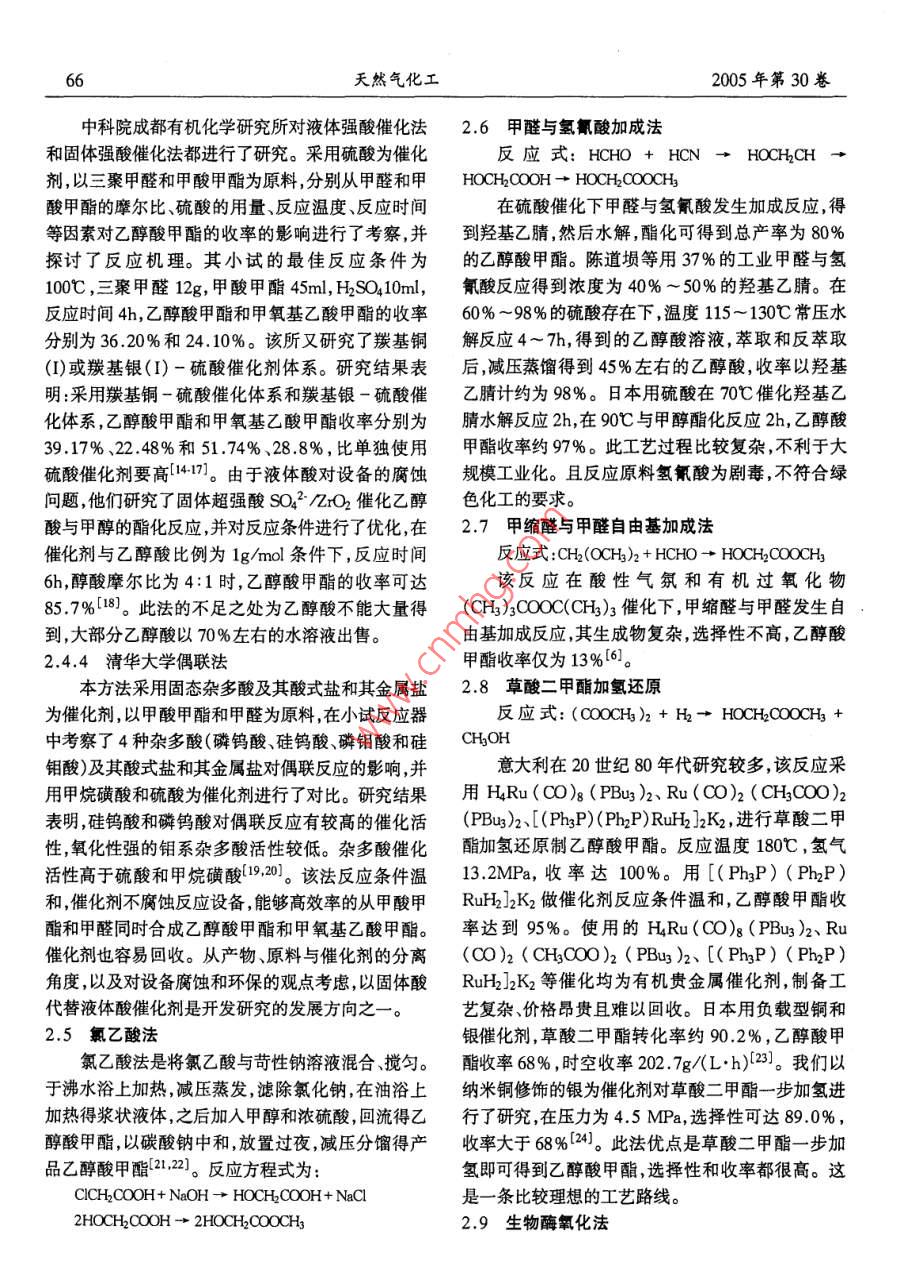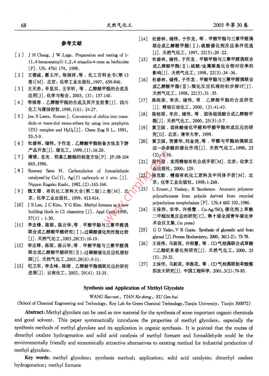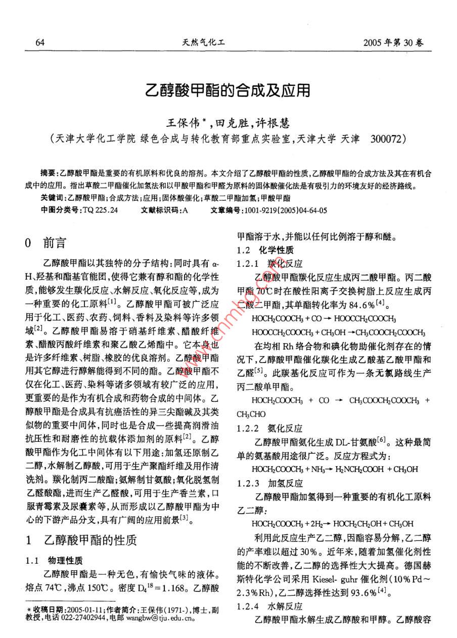 天然氣化工2005年第30卷乙醇酸甲酯的合成及應(yīng)用王保偉“,田克勝,許根慧(天津大學(xué)化工學(xué)院綠色合成與轉(zhuǎn)化教育部重點(diǎn)實(shí)驗(yàn)室,天津大學(xué)天津300072)摘要:乙醇酸甲酯是重要的有機(jī)原料和優(yōu)良的溶劑。本文介紹了乙醇酸甲酯的性質(zhì),乙醇酸甲酯的合成方法及其在有機(jī)合成中的應(yīng)用。指出草酸二甲酯催化加氫法和以甲酸甲酯和甲醛為原料的固體酸催化法是有吸引力的環(huán)境友好的經(jīng)濟(jì)路線。關(guān)鍵詞:乙醇酸甲酯;合成方法;應(yīng)用;固體酸催化;草酸二甲酯加氫;甲酸甲酯中圖分類號(hào):TQ225.24文獻(xiàn)標(biāo)識(shí)碼:A文章編號(hào):1001-9219(2005)0464050前言甲酯溶于水,并能以任何比例溶于醇和醚。1.2化學(xué)性質(zhì)乙醇酸甲酯以其獨(dú)特的分子結(jié)構(gòu):同時(shí)具有a1.2.1羰化反應(yīng)H羥基和酯基官能團(tuán),使得它兼有醇和酯的化學(xué)性乙醇酸甲酯羰化反應(yīng)生成丙二酸甲酯。丙二酸質(zhì),能夠發(fā)生羰化反應(yīng)、水解反應(yīng)、氧化反應(yīng)等,成為甲酯70℃時(shí)在酸性陽(yáng)離子交換樹脂上反應(yīng)生成丙一種重要的化工原料。乙醇酸甲酯可被廣泛應(yīng)二酸二甲酯,其單酯轉(zhuǎn)化率為84.6%(4。用于化工、醫(yī)藥、農(nóng)藥、飼料、香料及染料等許多領(lǐng)HOCH2COOCH3+CO-HOOCCH2 COOCH3域2)。乙醇酸甲酯易溶于硝基纖維素、醋酸纖維HOOCCH2COOCH3 CH3OH-CH3 COOCH2COOCH3素、醋酸丙酸纖維素和聚乙酸乙烯酯中。它本身也在均相Rh絡(luò)合物和碘化物助催化劑存在的情是許多纖維素、樹脂、橡膠的優(yōu)良溶劑。乙醇酸甲酯況下,乙醇酸甲酯催化羰化生成乙酸基乙酸甲酯和用其它醇進(jìn)行醇解能得到不同的酯。乙醇酸甲酯不乙醛S。此羰基化反應(yīng)可作為一條無氯路線生產(chǎn)僅在化工、醫(yī)藥染料等諸多領(lǐng)域有較廣泛的應(yīng)用,丙二酸單甲酯。更重要的是作為有機(jī)合成和藥物合成的中間體。乙HOCHyCOOCH3 t Co- CHaCOCCHCOCCH3+醇酸甲酯是合成具有抗癌活性的異三尖酯堿及其類CH3CHo似物的重要中間體,同時(shí)也是合成一些提高潤(rùn)滑油1.2.2氨化反應(yīng)抗壓性和耐磨性的抗載體添加劑的原料2。乙醇2醇酸甲酯氨化生成DL甘氨酸6。這種最簡(jiǎn)酸甲酯作為化工中間體有以下用途加氫還原制乙單的氨基酸用途很廣泛。反應(yīng)方程式為:二醇,水解制乙醇酸可用于生產(chǎn)聚酯纖維及用作清HOCHCOOCH3+NH3-+H2NCH2COOH CH3OH洗劑。羰化制丙二酸酯;氨解制甘氨酸;氧化脫氫制1.2.3加氫反應(yīng)乙醛酸酯,進(jìn)而生產(chǎn)乙醛酸,可用于生產(chǎn)香蘭素,口乙醇酸甲酯加氫得到一種重要的有機(jī)化工原料服青霉素及尿囊素等,從而形成以乙醇酸甲酯為中乙二醇:心的下游產(chǎn)品分支,具有廣闊的應(yīng)用前景3。HOCHCOOCH3+ 2H2+ HOCHCH2OH+ CH3OH1乙醇酸甲酯的性質(zhì)利用此反應(yīng)生產(chǎn)乙二醇因酯容易分解,乙二醇的產(chǎn)率難以超過30%。近年來,隨著加氫催化劑性1.1物理性質(zhì)能的不斷改善,乙二醇的選擇性大大提高。德國(guó)赫乙醇酸甲酯是一種無色,有愉快氣味的液體?!闼固鼗瘜W(xué)公司采用 Kiesel-guhr催化劑(10%Pd熔點(diǎn)74℃,沸點(diǎn)150℃。密度D4B8=1.168。乙醇酸2.3%Rh),乙二醇選擇性達(dá)到93.6%(4]米收稿日期:2005-0111;作者簡(jiǎn)介:王保偉(1971-)博士副1.2.4水解反應(yīng)教授,電話022-27402944,電郵 wangbi@ tju. edu. en乙醇酸甲酯水解生成乙醇酸和甲醇。乙醇酸容第4期王保偉等:乙醇酸甲酯的合成及應(yīng)用易自動(dòng)縮聚生成聚乙醇酸。聚乙醇酸是一種生物可美國(guó)德士古公司E.L. Yeakey等人采用降解物質(zhì),也是人體可吸收的醫(yī)用材料。(CH3O)2CH2(甲縮醛)和HOOH為原料,在一種HOCH2COOCH3+ H2O- HOCH2 COOH+ CH3OH有機(jī)過氧化物存在的情況下,并于非酸性條件下制nHOCH2OOOH→∈OCH2-OO)n+nH2O備乙醇酸烷基酯。例如,(CHO)2CH2、多聚甲醛和1.2.5氧化脫氫(CH3)2OOOC(CH3)3在反應(yīng)器中,于130℃時(shí)加熱乙醇酸甲酯氧化脫氫生成乙醛酸甲酯。在磷酸2h,然后在150℃下再加熱1h,反應(yīng)得到乙醇酸乙銅存在的情況下,后者水解生成乙醛酸。酯、乙醇酸甲酯和乙二醇。反應(yīng)產(chǎn)物均溶于乙二醇HOCH2COOCH3-+ CHOCOOCH3+H2中,但反應(yīng)產(chǎn)物難以分離CHOCOOCH3+H20-+ CHOCOOH+ CH2OH24偶聯(lián)法2合成工藝研究進(jìn)展此法主要采用甲酸甲酯與乙醛(或聚甲醛等)為原料,采用酸催化法合成乙醇酸甲酯。反應(yīng)方程式2.1乙二醛和甲醇一步合成為:該法由日本三井東亞化學(xué)株式會(huì)社開發(fā),采用HCOOCH+ HCHO+ HOCH2COOCH3乙二醛或它的縮醛和甲醇為原料,以A(NO3)3·2.4.1液體強(qiáng)酸催化劑偶聯(lián)法9HO為催化劑存,反應(yīng)溫度160℃,反應(yīng)30mn后該法以甲酸甲酯和多聚甲醛為原料,濃硫酸或可得到乙醇酸甲酯,乙二醛轉(zhuǎn)化率可達(dá)98%,乙醇有機(jī)磺酸作為催化劑,在常壓和90℃下合成乙醇酸酸甲酯的選擇性為97%7。反應(yīng)方程式為:甲酯。采用氯磺酸為催化劑,在105Pa和70HCOCOH+ CH3OH-HOCH2COOCH3+ HO200℃的反應(yīng)條件下,乙醇酸甲酯產(chǎn)率為24%此方法具有反應(yīng)條件溫和,反應(yīng)轉(zhuǎn)化率和選擇69%。反應(yīng)產(chǎn)物有乙醇酸甲酯,乙醇酸和甲酸甲性都較高的優(yōu)點(diǎn)。但是作為原料的乙二醛有毒性,酯0。昆明理工大學(xué)一