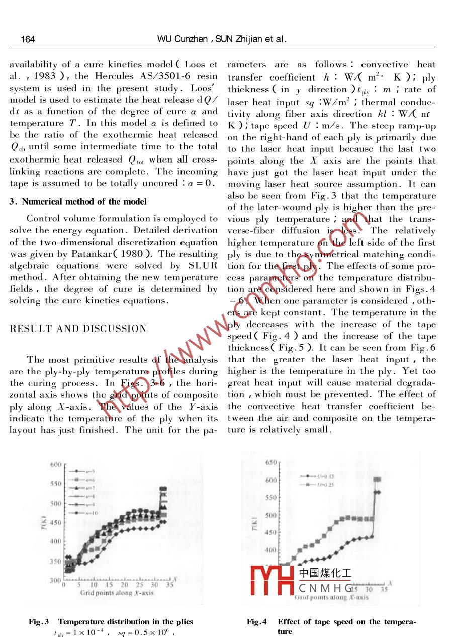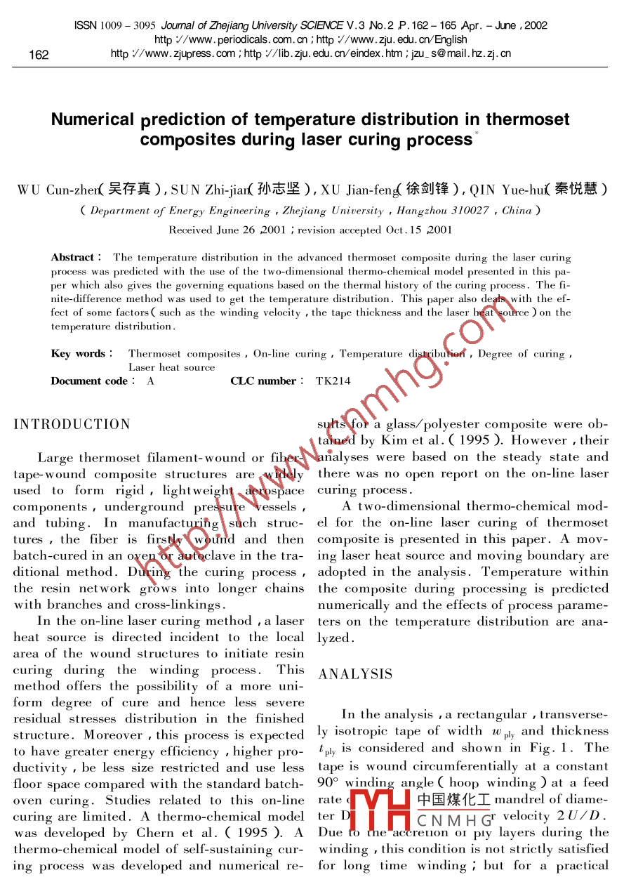 ISSN 1009 - 3095 Joumal of Zhejiang University SCIENCE V.3 No.2 P. 162 - 165 Apr. - June , 2002http ://www. periodicals. com. cn ; http ://www. zju. edu. cn/English162http :// www. zjupress. com ; http ://lib. zju. edu. cn/ eindex. htm ; jzu_ s@ mail.hz. zj. cnNumerical prediction of temperature distribution in thermosetcomposites during laser curing processW∪Cun-zhen( 吳存真), SUN Zhi-jiar(孫志堅), XU Jian-feng 徐劍鋒), QIN Yue-hu(秦悅慧)( Department of Energy Engineering , Zhejiang University , Hangzhou 310027,China )Received June 26 2001 ; revision accepted Oct. 15 2001Abstract : The temperature distribution in the advanced thermoset composite during the laser curingprocess was predicted with the use of the l wo-dimensional thermo-chemical model presented in this pa-per which also gives the governing equations based on the thermal history of the curing process. The fi-nite-difference method was used to get the temperature distribution. This paper also deals with the ef-fect of some factors( such as the w inding velocity , the tape thickness and the laser heat source ) on thetemperature ditribution.Key words: Thermoset composites ,On-line curing ,Temperature distribution ,Degree of curing ,Laser heat sourceDocument code : ACLC number : TK214INTRODUCTIONsults for a glass/ polyester composite were ob-tained by Kim et al.( 1995 ). However , theirLarge thermoset filament- wound or fiber-analyses were based on the steady state andtape- w ound composite structures are widely there was no open report on the on-line laserused to form rigid ,lightweight aerospacecuring process.components,underground pressure vessels ,A two-dimensional thermo- chemical mod-and tubing. In manufacturing such struc-el for the on-line laser curing of thermosettures , the fiber is firstly wound and thencomposite is presented in this paper. A mov-batch-cured in an oven or autoclave in the tra- ing laser heat source and moving boundary areditional method. During the curing process ,adopted in the analysis. Temperature withinthe resin network grows into longer chains the composite during processing is predictedwith branches and cross-lin kings .numerically and the effects of process parame-In the on-line laser curing method ,a laserters on the temperature distribution are ana-heat source is directed incident to the local lyzed .area of the w ound structures to initiate resincuring during the winding process. This ANALYSISmethod offers the possibility of a more uni-form degree of cure and hence less severeresidual stresses distribution in the finishedIn the analysis ,a rectangular,transverse-strueture. Moreover , this process is expected ly isotropic tape of width wply and thicknessto have greater energy ffciency , higher pro- 'ly is considered and shown in Fig.1. Theductivity , be less size restricted and use less tape is wound circumferentially at a constantfloor space compared with the standard batch- 90° winding angle( hoop winding ) at a feedoven curing. Studies related to this on-linerate中國煤化工mandrel of diame-curing are limited. A thermo-chemical modelerHCNMHG velocity 2U/D.was developed by Chern et al. ( 1995 ). A Due to me accreton oI ply layers during thethermo-chemical model of self-sustaining cur- winding ,this condition is not strictly satisfieding process w as developed and numerical re- for long time winding ; but for a practicalProje萬方熬據(jù), the cooperation programme of Nebraska University( U.S. A. ) and Zhejiang Universits( China ).Numerical prediction of temperature distribution in themoset composites163Laser heatposite is wound onto the mandrel ply by plysourceand the laser heat source movies with velocityrelative to the mandrel ,so the computationIncoming tape with velocity u| xMandrsldomain and the boundary condition changewith time.1. Energy equationU nder these assumptions , the governingequations are as follows.For the thermoset composites , the ener-gy equation is :Computationaldomain thickness HJTaT2Tρ.CeJt+ ρ.C.UdQFig.1 Physical geometry+ρe dt( 1)where ρ is mass density,C is specific heat,winding situation ,it is satisfied providedU is tape speed,h is thermal conductivity.2H/D≤1. A cylindrical-coordinate system Subscript represents thermoset composite, l( R ,θ,z )having its z-axis coincident withrepresents along fiber axis direction. The twothe mandrel' s axis is used to describe the terms on the left-hand side of Eq.( 1 )are themandrel and the composite geometry. Forunsteady term and the energy transport bytypical plies used in tape winding ,tply/ Wpl≤advection due to ply motion ,respectively .1 , so that variations in the axial( z ) directionThe first two terms on the right-hand side ofare negligible ; the problem is thereby reducedEq.( 1 ) are energy transport by thermal dif-to two dimensions : R and θ. The laser ener- fusion along the fiber and transverse fiber di-gy is assumed to be incident upon a given arc .rections , respectively. The last term on thelength of the cylinder' s periphery. All the ra- right-hand side of Eq.( 1 )is the rate of heatdiant energy deposition and primary heatreleased by chemical reaction .transfer are assumed to occur in a thin surfaceThe boundary conditions for Eq.( 1 ) arelayer of radial thickness H (《D/2 ) com-assumed as described below .prised of the n outermost plies. It is furtherSurfaces( 1 ) and (3 ) are connected toassumed that 2H/D≤1 ,so that the curva- each other ,so :ture of the surface layer can be neglected andAdiabatic condition of Surfaces ( 1 ) andthe annular physical domain can be simplified ( 3 ):into the rectangular computational domain( X, Y)( Fig.2 ). In the model,the com-x=0(2 )Convective condition of Surface( 2 ):Moving lasern the grid with laser heat input :heat sourceConvectiveSurface (2)heat losshe= -h( T- T.)+ sq (3)Ply"where sq is rate of laser heat input,h is con-Surface(1)(3)vective heat transfer coefficient .In the grid without laser heat input :中國煤化工一Tu)(4 )AdialPly2YHCN