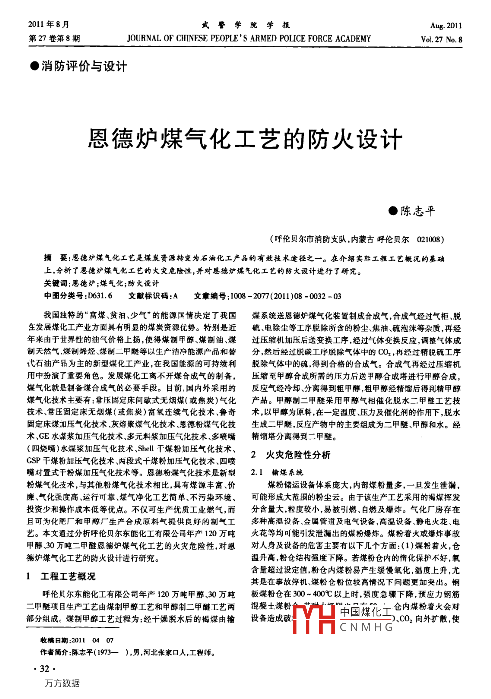 2011年8月武警學(xué)院學(xué)報Aug. 2011第27卷第8期JOURNAL OF CHINESE PEOPLE' S ARMED POLICE FORCE ACADEMYVol.27 No. 8●消防評價與設(shè)計恩德爐煤氣化工藝的防火設(shè)計●陳志平(呼倫貝爾市消防支隊(duì),內(nèi)蒙古呼倫貝爾021008)嘀要:恩德爐謀氣化工藝是煤炭資源轉(zhuǎn)變?yōu)槭突ぎa(chǎn)品的有效技術(shù)途徑之一。在介紹實(shí)際工程工藝概況的基礎(chǔ)上,分析了思德爐煤氣化工藝的火災(zāi)危險性,并對恩德爐煤氣化工藝的防火設(shè)計進(jìn)行了研究。關(guān)鍵詞:恩德爐;煤氣化;防火設(shè)計中圖分類號:D631.6文獻(xiàn)標(biāo)識碼:A文章編號:1008 -2077(2011)08 -0032 -03我國獨(dú)特的“富煤、貧油、少氣"的能源國情決定了我國煤系統(tǒng)送恩德爐煤氣化裝置制成合成氣,合成氣經(jīng)過氣柜、脫生發(fā)展煤化工產(chǎn)業(yè)方面具有明顯的煤炭資源優(yōu)勢。特別是近硫、電除塵等工序脫除所含的粉塵、焦油硫泡沫等雜質(zhì),再經(jīng)年來由于世界性的油氣價格上揚(yáng),使得煤制甲醇煤制油、煤過壓縮機(jī)加壓后送變換工序,經(jīng)過氣體變換反應(yīng),調(diào)整氣體成制天然氣煤制烯烴、煤制二甲醚等以生產(chǎn)潔凈能源產(chǎn)品和替分,然后經(jīng)過脫碳工序脫除氣體中的CO2 ,再經(jīng)過精脫硫工序代石油產(chǎn)品為主的新型煤化工產(chǎn)業(yè),在我國能源的可持續(xù)利脫除氣體中的硫,得到合格的合成氣。合成氣再經(jīng)過壓縮機(jī)用中扮演了重要角色。發(fā)展煤化工離不開煤合成氣的制備,壓縮至甲醇合成所需的壓力后送甲醇合成塔進(jìn)行甲醇合成,煤氣化就是制備煤合成氣的必要手段。目前,國內(nèi)外采用的反應(yīng)氣經(jīng)冷卻分離得到粗甲醇,粗甲醇經(jīng)精餾后得到精甲醇煤氣化技術(shù)主要有:常壓固定床間歇式無煙煤(或焦炭)氣化產(chǎn)品。甲醇制二甲醚采用甲醇?xì)庀啻呋撍酌压に嚰技夹g(shù)常壓固定床無煙煤(或焦炭)富氧連續(xù)氣化技術(shù)、魯奇術(shù),以甲醇為原料,在- -定溫度、壓力及催化劑的作用下,脫水固定床煤加壓氣化技術(shù)、灰熔聚煤氣化技術(shù)、恩德粉煤氣化技生成二甲醚,反應(yīng)產(chǎn)物中的主要組成為二甲醚甲醇和水。經(jīng).術(shù)、GE水煤漿加壓氣化技術(shù)、多元料漿加壓氣化技術(shù)、多噴嘴精餾塔分離得到二甲醚。(四燒嘴)水煤漿加壓氣化技術(shù)、Shell干煤粉加壓氣化技術(shù)、2火災(zāi)危險 性分析CSP干煤粉加壓氣化技術(shù)、兩段式干煤粉加壓氣化技術(shù)、四噴嘴對置式干粉煤加壓氣化技術(shù)等。恩德粉煤氣化技術(shù)是新型2.1 輸煤系統(tǒng)粉煤氣化技術(shù),與其他粉煤氣化技術(shù)相比,具有煤源豐富、價煤粉儲運(yùn)設(shè)備體系龐大,內(nèi)部煤粉量多,一旦發(fā)生泄漏,廉、氣化強(qiáng)度高、運(yùn)行可靠、煤氣凈化工藝簡單、不污染環(huán)境、可能形成大范圍的粉塵云。由于該生產(chǎn)工藝采用的褐煤揮發(fā)投資少和操作成本低等優(yōu)點(diǎn)。不僅可生產(chǎn)優(yōu)質(zhì)工業(yè)燃?xì)?而分含量大,粒度較小,易被引燃、自燃及爆炸。氣化廠房存在且可為化肥廠和甲醇廠生產(chǎn)合成原料氣提供良好的制氣工多種高溫設(shè)備、金屬管道及電氣設(shè)備,高溫設(shè)備靜電火花、電藝。本文通過分析呼倫貝爾東能化工有限公司年產(chǎn)120萬噸火花等均可能引發(fā)泄漏出的煤粉爆炸。煤粉著火或爆炸事故甲醇、30萬噸二甲醚恩德爐煤氣化工藝的火災(zāi)危險性,對恩對人身及設(shè)備的危害主要有以下幾個方面:(1)煤粉著火,倉德爐煤氣化工藝的防火設(shè)計進(jìn)行研究。溫升高,粉倉結(jié)構(gòu)強(qiáng)度下降。若煤粉倉內(nèi)的惰化保護(hù)不好,氧含量超過設(shè)定值,粉倉內(nèi)煤粉易產(chǎn)生緩慢氧化,溫度上升,尤1工程工藝概況其是在事故停機(jī)、煤粉倉粉位較高情況下問題更加突出。鋼呼倫貝爾東能化工有限公司年產(chǎn)120萬噸甲醇.30萬噸板煤粉倉在300 ~ 400以上時,強(qiáng)度急驟下降,預(yù)應(yīng)力鋼筋二甲醚項(xiàng)目生產(chǎn)工藝由煤制甲醇工藝和甲醇制二甲醚工藝兩混凝土煤粉中國煤化工倉內(nèi)煤粉著火會對部分組成。煤制甲醇工藝過程為:經(jīng)干燥脫水后的褐煤由輸設(shè)備造 成破YHCNMHG、CO,向外擴(kuò)散,使收稿日期:2011 -04-07作者簡介:陳志平(1973- ),男 ,河北張家口人,工程師。,32●陳志平:恩德爐煤氣化工藝的防火設(shè)計情化保護(hù),防止設(shè)備內(nèi)的煤粉發(fā)生自燃和爆炸,同時也可以降統(tǒng)、煤燒嘴緊急停車系統(tǒng)。為保證工藝安全措施的可靠性,防低煤粉泄漏發(fā)生爆炸的可能性。為控制系統(tǒng)惰性化,應(yīng)設(shè)置止事故漏報 ,在設(shè)計上還應(yīng)采用冗余設(shè)計、多參數(shù)測量及按最02、.Co濃度在線分析設(shè)備,以根據(jù)需要補(bǔ)充N2或CO2。不利情況設(shè)防等方式。為防止洗滌塔的液位超出正常范圍發(fā)3.2.5氣化廠 房內(nèi)應(yīng)設(shè)有氮?dú)鈨?在正常開車和停車時使生事 故,應(yīng)設(shè)計同時監(jiān)測設(shè)備內(nèi)液位、溫度、壓力以及進(jìn)水和用氮?dú)鈱饣瘡S房內(nèi)的所有設(shè)備和火炬進(jìn)行置換。發(fā)生重大排水速度。 為防止氣化爐發(fā)生事故,應(yīng)設(shè)計同時監(jiān)