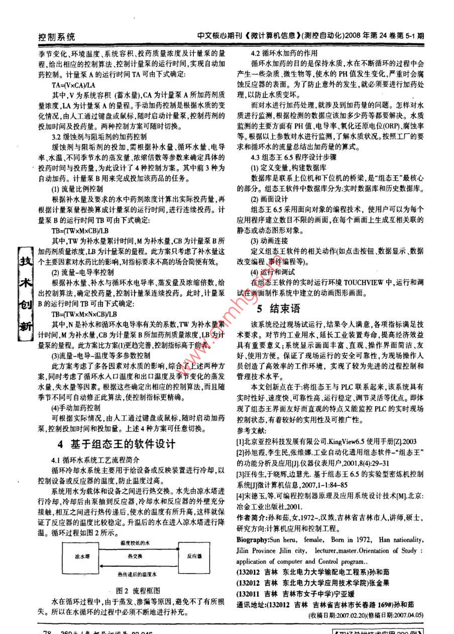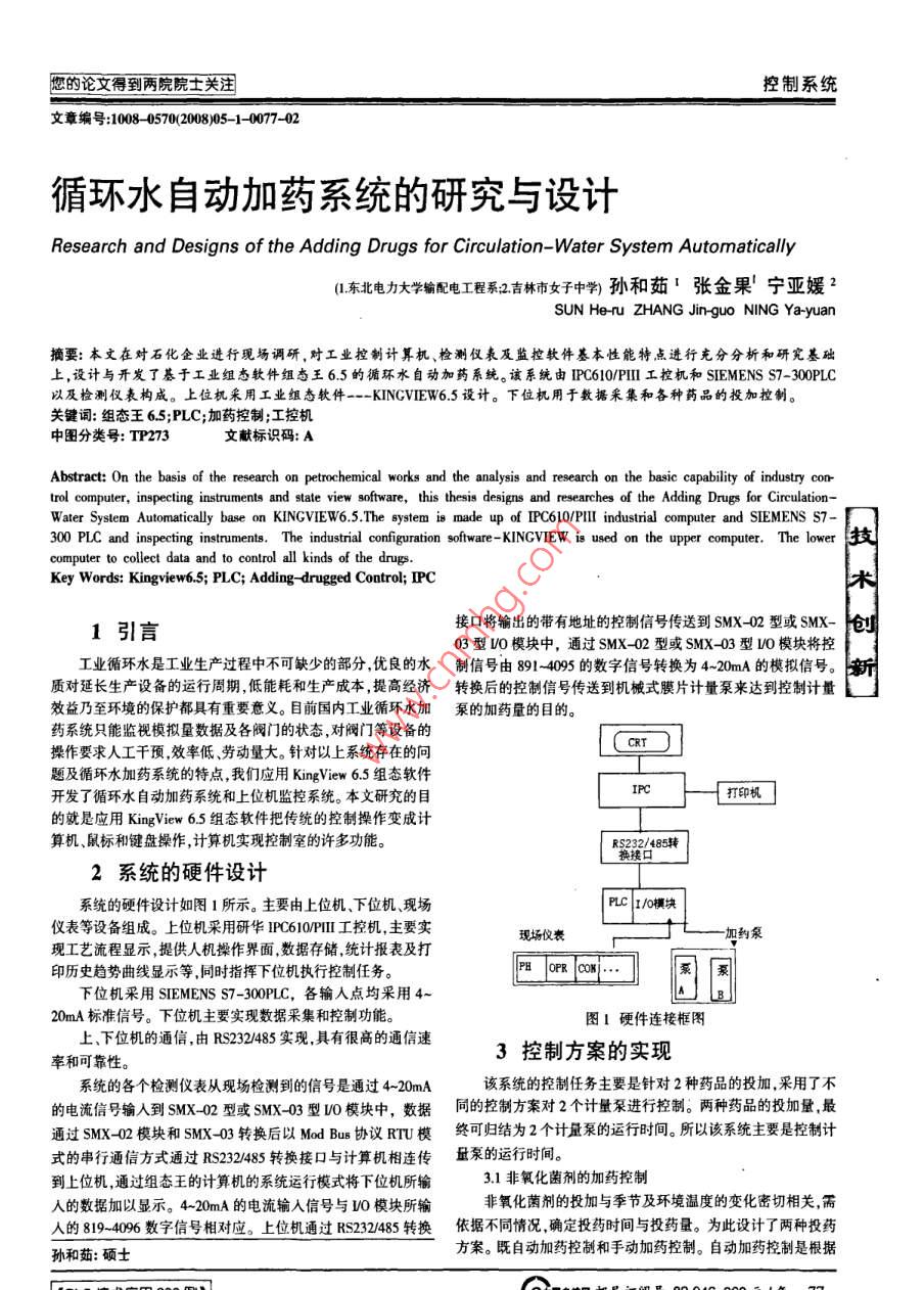 您的論文得到兩院院士關(guān)注控制系統(tǒng)文章編號(hào):1008-0570(200805-1-0077-02循環(huán)水自動(dòng)加藥系統(tǒng)的研究與設(shè)計(jì)Research and Designs of the Adding Drugs for Circulation-Water System Automatically1東北電力大學(xué)輸配電工程系江吉林市女子中學(xué)孫和茹張金果寧亞媛2SUN He-ru ZHANG Jin-guo NING Ya-yuan摘要:本文在對(duì)石化企業(yè)進(jìn)行現(xiàn)場(chǎng)調(diào)研,對(duì)工業(yè)控制計(jì)算機(jī)、檢測(cè)儀表及監(jiān)控軟件基本性能特點(diǎn)進(jìn)行充分分析和研究基礎(chǔ)上,設(shè)計(jì)與開(kāi)發(fā)了基于工業(yè)組態(tài)軟件組態(tài)王65的循環(huán)水自動(dòng)加藥系統(tǒng)。該系統(tǒng)由IPC610PⅢ工控機(jī)和 SIEMENS S7-300PLC以及檢測(cè)儀表構(gòu)成。上位機(jī)采用工業(yè)組態(tài)軟件-- KINGVIEW6.5設(shè)計(jì)。下位機(jī)用于數(shù)據(jù)采集和各種藥品的投加控制關(guān)鍵詞:組態(tài)王65;PLC;加藥控制;工控機(jī)中圖分類(lèi)號(hào):TP273文獻(xiàn)標(biāo)識(shí)碼:AAbstract: On the basis of the research on petrochemical works and the analysis and research on the basic capability of industrytrol computer inspecting instruments and state view software, this thesis designs and researches of the Adding Drugs for CirculationWater System Automatically base on KINGVIEW6 5 The system is made up of IPC610/PIll industrial computer and SIEMENS S7300 PLC and inspecting instruments. The industrial configuration software-KINGVIEW is used on the upper computer. The lower scomputer to collect data and to control all kinds of the drugsKey Words: Kingview65; PLC; Adding-drugged Control; IPC1引言接口將輸出的帶有地址的控制信號(hào)傳送到SMX02型或SMx-]創(chuàng)03型o模塊中,通過(guò)SMX-02型或SMX-03型VO模塊將控工業(yè)循環(huán)水是工業(yè)生產(chǎn)過(guò)程中不可缺少的部分優(yōu)良的水制信號(hào)由891495數(shù)字信號(hào)轉(zhuǎn)換為4-2mA的模擬信號(hào)。質(zhì)對(duì)延長(zhǎng)生產(chǎn)設(shè)備的運(yùn)行周期,低能耗和生產(chǎn)成本提高經(jīng)濟(jì)轉(zhuǎn)換后的控制信號(hào)傳送到機(jī)械式膜片計(jì)量泵來(lái)達(dá)到控制計(jì)量效益乃至環(huán)境的保護(hù)都具有重要意義。目前國(guó)內(nèi)工業(yè)循環(huán)水加泵的加藥量的目的。藥系統(tǒng)只能監(jiān)視模擬量數(shù)據(jù)及各閥門(mén)的狀態(tài),對(duì)閥門(mén)等設(shè)備的操作要求人工千預(yù)效率低勞動(dòng)量大。針對(duì)以上系統(tǒng)存在的問(wèn)題及循環(huán)水加藥系統(tǒng)的特點(diǎn),我們應(yīng)用 King view6.5組態(tài)軟件開(kāi)發(fā)了循環(huán)水自動(dòng)加藥系統(tǒng)和上位機(jī)監(jiān)控系統(tǒng)。本文研充的目的就是應(yīng)用 King view65組態(tài)軟件把傳統(tǒng)的控制操作變成計(jì)算機(jī)、鼠標(biāo)和鍵盤(pán)操作,計(jì)算機(jī)實(shí)現(xiàn)控制室的許多功能85轉(zhuǎn)2系統(tǒng)的硬件設(shè)計(jì)系統(tǒng)的硬件設(shè)計(jì)如圖1所示。主要由上位機(jī)、下位機(jī)、現(xiàn)場(chǎng)儀表等設(shè)備組成。上位機(jī)采用研華IPC60PI工控機(jī),主要實(shí)現(xiàn)場(chǎng)儀表加約泵現(xiàn)工藝流程顯示,提供人機(jī)操作界面數(shù)據(jù)存儲(chǔ)統(tǒng)計(jì)報(bào)表及打印歷史趨勢(shì)曲線顯示等,同時(shí)指揮下位機(jī)執(zhí)行控制任務(wù)。下位機(jī)采用 SIEMENS S7-300PLC,各輸入點(diǎn)均采用20mA標(biāo)準(zhǔn)信號(hào)。下位機(jī)主要實(shí)現(xiàn)數(shù)據(jù)采集和控制功能。圖1硬件連接框圖上、下位機(jī)的通信,由RS232485實(shí)現(xiàn),具有很高的通信速率和可靠性。3控制方案的實(shí)現(xiàn)系統(tǒng)的各個(gè)檢測(cè)儀表從現(xiàn)場(chǎng)檢測(cè)到的信號(hào)是通過(guò)4~20mA該系統(tǒng)的控制任務(wù)主要是針對(duì)2種藥品的投加,采用了不的電流信號(hào)輸入到SMX∽02型或SMX-03型0模塊中,數(shù)據(jù)同的控制方案對(duì)2個(gè)計(jì)量泵進(jìn)行控制。兩種藥品的投加量最通過(guò)SMX-02模塊和SMX-03轉(zhuǎn)換后以 Mod bus協(xié)議R模終可歸結(jié)為2個(gè)計(jì)量泵的運(yùn)行時(shí)間。所以該系統(tǒng)主要是控制計(jì)式的串行通信方式通過(guò)RS232485轉(zhuǎn)換接口與計(jì)算機(jī)相連傳量泉的運(yùn)行時(shí)間。到上位機(jī),通過(guò)組態(tài)王的計(jì)算機(jī)的系統(tǒng)運(yùn)行模式將下位機(jī)所輸31非氧化菌劑的加藥控制人的數(shù)據(jù)加以顯示。4-20mA的電流輸入信號(hào)與LO模塊所輸非氧化菌劑的投加與季節(jié)及環(huán)境溫度的變化密切相關(guān)需入的819-4096數(shù)字信號(hào)相對(duì)應(yīng)。上位機(jī)通過(guò)Rs32/485轉(zhuǎn)換依據(jù)不同情況確定投藥時(shí)間與投藥量。為此設(shè)計(jì)了兩種投藥孫和茹:碩士方案。既自動(dòng)加藥控制和手動(dòng)加藥控制。自動(dòng)加藥控制是根據(jù)控制系統(tǒng)中文核心期刊《微計(jì)算機(jī)信息》測(cè)控自動(dòng)化)2008年第24卷第51期季節(jié)變化、環(huán)境溫度、系統(tǒng)容積、投藥質(zhì)量濃度及計(jì)量泵的量42循環(huán)水加藥的作用程,給出相應(yīng)的控制算法控制計(jì)量泵的運(yùn)行時(shí)間,實(shí)現(xiàn)自動(dòng)加循環(huán)水加藥的目的是保持水質(zhì),水在不斷循環(huán)的過(guò)程中