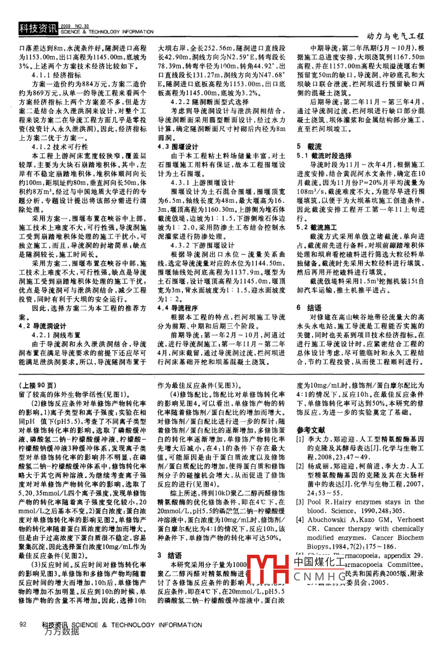 科技資訊200 NO.30SCIENCE & TECHNOU oev INFORMATION動力與電氣工程人|型精氨酸酶的聚乙二醇修飾條件探索郝德旺’梅丹2 劉慶洪(1.中國農(nóng)業(yè)大學(xué)農(nóng)學(xué)與生物技術(shù)學(xué)院北京 100193 2. 麗水職業(yè)技術(shù)學(xué)院環(huán)境工程分院園藝生物系浙江金華321 000 :3.中國農(nóng)業(yè)大學(xué)生物學(xué)院微生物系北京100193)摘要;精氨酸酶,叉名L-精氮酸尿素水解酶,是一種將精氮酸水解成鳥氦酸和尿素的水解酶,本身為內(nèi)源性蛋白酶在人體內(nèi)尿素楠環(huán)中起到重要作用。工業(yè)上可利用其水解活性以精氨酸生產(chǎn)烏氨酸。另外,精氨酸酶還有著顯著的抑制腫瘤細(xì)胞分裂的作用0一到。但是,在臨床應(yīng)用中,存在以下缺點(diǎn):體內(nèi)循環(huán)半表期短,易被循環(huán)系統(tǒng)清除,需要多次給藥等問題,給患者的日常生活帶來很大的不便。而聚乙二醇(Polyethylene Glyeol ,PEG)化學(xué)修飾能夠降低蛋白免疫原性以及有效延長藥物半表期,是解決上述問題的有效途徑之一團(tuán)。關(guān)鍵詞:人I型精氨酸酶聚乙二醇中圖分類號:06文獻(xiàn)標(biāo)識碼:A文章編號:1672-3791(2009)10(e)-0090-02自上個世紀(jì)80年代以來,FDA批準(zhǔn)了第來尋找最佳的修飾辦法,為進(jìn)一步考察其種因素 ,固定反應(yīng)溫度為4C ,探討了pH值一個PEG化藥物聚乙二醇修飾的酰苷脫氨酶特性奠定基礎(chǔ)。對單修飾產(chǎn)物體外活性保留的影響,以及(PEG-. ADA), PEG修飾技術(shù)在長效藥物的制離子類型.離子強(qiáng)度.蛋白質(zhì)濃度.修飾劑/備研究中已經(jīng)取得了很大的進(jìn)展,成為近年1 材料和方法蛋白質(zhì)配比、反應(yīng)時間等條件對修飾轉(zhuǎn)化來醫(yī)藥領(lǐng)域研究的熱點(diǎn)之- - 。目前,已經(jīng)上市(1)材料。原料:單甲氧基聚乙二醇丙醛事的影 響。的聚乙二醇藥物包括PEG化天冬酰胺酶(北京凱正生物),重組人精氨酸酶(Escheri-(1)在修飾劑類型、分子量固定的情況(PEG -L- asparaginase)4,以及重組人粒細(xì)胞集chia coli 表達(dá))。 主要試劑:牛血清白蛋白、下, 修飾反應(yīng)條件對單修飾產(chǎn)物體外活性落刺激因子(egfilgrastim)等蛋白質(zhì)藥物”。(SIGMA),丙烯酰胺(SIGMA),甲叉丙烯酰胺保 留的影響主要取決于修飾位點(diǎn)。只有修對于精氨酸酶的聚乙二醇修飾研究,(SIGMA),其余試劑均為國產(chǎn)分析純試劑。飾位點(diǎn)遠(yuǎn)離蛋白質(zhì)活性部位的時候,修飾已經(jīng)取得了很大成果和進(jìn)展。目前已有產(chǎn)(2)方法。修飾反應(yīng):在低溫4C ,將重組人精蛋白才 能得到較高的活性保留。不同氨基品完成了臨床前實(shí)驗,為5kD線形單甲氧基氨酸酶透析到所需緩沖溶液中。使用BCA法酸殘基 ,其pKa值不同,因而在不同的pH值聚乙二醇琥珀酰亞胺碳酸酯(NHS-mPEG)進(jìn)行蛋白濃度測定,調(diào)整蛋白濃度至實(shí)驗所條件下,其親核性有較大差別。因而溶液的修飾6,其體外活性保留為未修飾蛋白的需值,按照摩爾配比(修飾劑/蛋自質(zhì))加入pH值影響了蛋白質(zhì)的修飾位點(diǎn),是影響修50%,活性下降很多。修飾劑及還原劑,混合均勻,4C反應(yīng),結(jié)束飾產(chǎn)物活性的最主要要因素.圖1顯示了pH為了解決以上問題,本研究采用10kD后,使用甘氨酸終止。蛋白質(zhì)濃度的測定:使對單修飾產(chǎn)物活性保留的影響??梢钥闯?,單甲氧基聚乙二醇丙醛(mPEG- ALD)修飾用BCA法進(jìn)行蛋白質(zhì)濃度測定"。單修飾產(chǎn)物體外活性隨著pH值的增大先增劑對精氨酸酶進(jìn)行了修飾,通過控制反應(yīng)大后減小,在pHS. 5時單修飾產(chǎn)物活性最高。條件,希望能夠獲得半衰期更長的PEG化2結(jié)果與討論推測可能由于在pH=5.5的條件下,mPEG-精氨酸酶產(chǎn)物。通過考察不同的修飾條件為考察對單修飾產(chǎn)物轉(zhuǎn)化率影響的各ALD主要修飾在蛋白N端氨基酸上,從而保120%60%100%50%望80%丹40%車30%40%哥20%20%10%0% l0%4.555.566.51152pH蛋白濃度(mg/mI)圖1pH對單修飾產(chǎn)物活性的影響圖2蛋白濃度對單修飾辜 的影響30%0%‘020中國煤化工3反應(yīng)時間( h)YHCNMHG蛋白配比圖3反應(yīng)時間對單修飾率的影響圖4修飾配比對單修飾辜的影響(下轉(zhuǎn)92頁)9科技資訊SCIENCE & TECHNOLOGY INFORMATION科技資訊2009 NO.30SCIENCE & TECHNOLOGY INFOPRMATION動力與電氣工程口落差達(dá)到8m,水流條件好。隧洞進(jìn)口高程大壩右岸,全長252.56m,隧洞進(jìn)口直線段中期導(dǎo)流:第二年汛期(5月~ 10月),根為1153. 00m,出口高程為1145.00m,底坡為長42. .90m,洞線方向為N2.59" E,轉(zhuǎn)彎段長據(jù)施工,總進(jìn)度安排,大壩澆筑到1167.50m3%。.上述兩個方案技術(shù)經(jīng)濟(jì)比較如下。78.39m,轉(zhuǎn)彎半徑為100m,轉(zhuǎn)角44.92* ,出高程 ,并在1157.00m高程大壩溢流堰右側(cè)4.1.1經(jīng)濟(jì)指標(biāo).口直線段長131.27m,洞線方向為N47.68預(yù)留寬50m的缺口,導(dǎo)流洞、沖砂底孔和大方案-造價約為884萬元,方案二造價E。隧洞進(jìn)口底板高程為1153.00m,出口底壩缺口 聯(lián)合泄流,攔河壩進(jìn)行預(yù)留缺口兩約為869萬元,從單一的導(dǎo)流工程來看兩個板高程為1145.00m,底坡為3.2%。側(cè)的混凝土澆筑。方案經(jīng)濟(jì)指標(biāo)上兩個方案差不多,但是方4.2.2隧洞斷面型式選擇后期導(dǎo)流:第二年11月~第三年4月,案二是結(jié)合永久泄洪洞來設(shè)計,對整個工考慮到導(dǎo