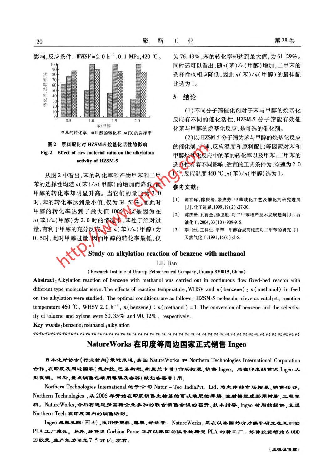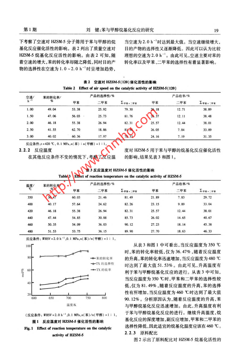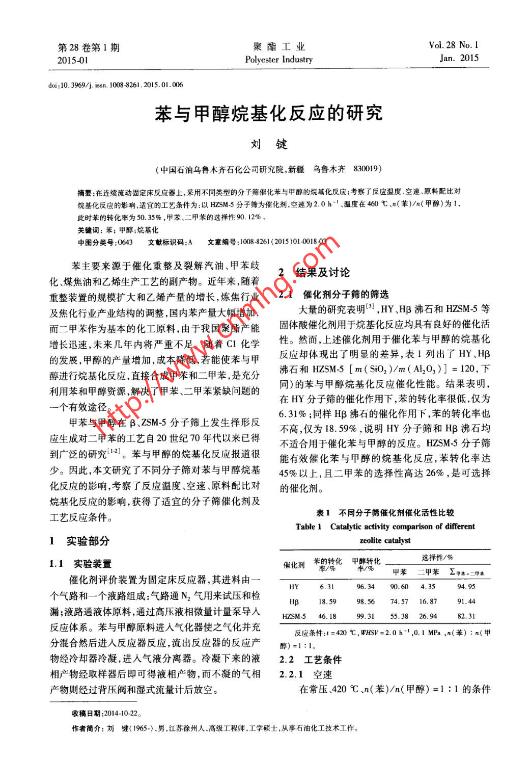 第28卷第1期聚酯工業(yè)Vol. 28 No.12015-01Polyester IndustryJan.2015doi;10. 3969/j. isns. 1008 8261. 2015.01.006苯與甲醇烷基化反應的研究劉鍵(中國石油烏魯木齊石化公司研究院,新疆烏魯木齊 83009)摘要:在連續(xù)流動固定床反應器上,采用不同類型的分子篩催化苯與甲醇的烷基化反應;考察了反應溫度、空速、原料配比對烷基化反應的影響,適宜的工藝條件為:以HZSM-5分子篩為催化劑,空速為2.0h-'、溫度在460 C .n(苯)/n(甲醇)為1.此時苯的轉(zhuǎn)化率為50. 35% ,甲苯、二甲苯的選擇性90.12%。關鍵詞:苯;甲醇;烷基化中圖分類號:0643文獻標識碼:A文章編號:1008 -8261 (2015 )01 0018-03苯主要來源于催化重整及裂解汽油、甲苯歧2結果及討論化、煤焦油和乙烯生產(chǎn)工藝的副產(chǎn)物。近年來,隨著重整裝置的規(guī)模擴大和乙烯產(chǎn)量的增長,煉焦行業(yè)2.1催化劑分子篩 的篩選及焦化行業(yè)產(chǎn)業(yè)結構的調(diào)整,國內(nèi)苯產(chǎn)量大幅增加,大量的研究表明(] , HY、Hβ沸石和HZSM-5等而二甲苯作為基本的化工原料,由于我國聚酯產(chǎn)能固體酸催化劑用于烷基化反應均具有良好的催化活增長迅速,未來幾年內(nèi)將嚴重不足。隨著C1化學性。然而,上述催化劑用于催化苯與甲醇的烷基化的發(fā)展,甲醇的產(chǎn)量增加,成本降低,若能使苯與甲反應卻體現(xiàn)出了明顯的差異,表1列出了HY、Hβ醇進行烷基化反應,直接合成甲苯和二甲苯,是充分沸石和HZSM-5 [m(Si02)/m(Al203)] = 120,下利用苯和甲醇資源,解決了甲苯、二甲苯緊缺問題的同)的苯與甲醇烷基化反應催化性能。結果表明,在HY分子篩的催化作用下,苯的轉(zhuǎn)化率很低,僅為一個有效途徑。甲苯與甲醇在β、ZSM-5分子篩上發(fā)生擇形反6.31% ;同樣Hβ沸石的催化作用下,苯的轉(zhuǎn)化率也不高,僅為18.59%,說明HY分子篩和Hβ沸石均應生成對二甲苯的工藝自20世紀70年代以來已得不適合用于催化苯與甲醇的反應。HZSM-5 分子篩到廣泛的研究[2]。苯與甲醇的烷基化反應報道很能有效催化苯與甲醇的烷基化反應,苯轉(zhuǎn)化率達少。因此,本文研究了不同分子篩對苯與甲醇烷基45%以上,且二甲苯的選擇性高達26% ,是可選擇化反應的影響,考察了反應溫度、空速、原料配比對的催化劑。.烷基化反應的影響,獲得了適宜的分子篩催化劑及工藝反應條件。表1不同分 子篩催化劑催化活性比較Table 1 Catalytic activity comparison of different1實驗部分zeolite catalyst選擇性/%1.1實驗裝置催化劑苯的轉(zhuǎn)化甲醇轉(zhuǎn)化率/%甲苯二甲苯 S甲米+二甲米催化劑評價裝置為固定床反應器,其進料由一H6.3196. 3490.60 4.3594. 95個氣路和一個液路組成: 氣路通N2氣用來試壓和檢18.5998.56 74.57 16. 8791.44漏;液路通液體原料,通過高壓液相微量計量泵導人HZSM-546.1899.3155.38 26. 9482.31反應體系。苯與甲醇原料進入氣化器使之氣化并充反應條件:1 =420 C, WHSV=2.0h-',0.1 MPa ,n(苯) :n(甲分混合然后進入反應器反應,流出反應器的反應產(chǎn)醇)=1:1。物經(jīng)冷卻器冷凝,進人氣液分離器。冷凝下來的液2.2工藝條件相產(chǎn)物經(jīng)取樣器后即可得液相產(chǎn)物,而不凝的氣相2.2.1空速產(chǎn)物則經(jīng)過背壓閥和濕式流量計后放空。在常壓.420 C .n(苯)/n(甲醇)=1 :1的條件收稿|日期:2014-10-22。作者簡介:劉鍵( 1965-) ,男.江蘇徐州人,高級工程師,工學碩士,從事石油化工技術工作。.第1期劉鍵:苯與甲醇烷基化反 應的研究9下考察了空速對HZSM-5分子篩用于苯與甲醇的烷當空速為2.0 h -1時達到最大值。當空速繼續(xù)增大,基化反應催化活性的影響。表2列出了質(zhì)量空速對目的產(chǎn)物的選擇性又逐漸降低。因此可以認為比較HZSM-5烷基化反應活性的影響。由表2可知,隨理想的空速為2.0h-'。由此可見,空速主要對苯的著空速的增大,苯的轉(zhuǎn)化率卻隨之降低,同時目的產(chǎn)轉(zhuǎn)化率以及甲苯、二甲苯的選擇性有著顯著影響。物的選擇性在空速為1.0~2. 0 h-'時呈增加趨勢,表2空速對 HZSM-5( 120)催化活性的影響Table2 Effect of air speed on the catalytic activity of HZSM-5(120)空速/苯的轉(zhuǎn)化率/產(chǎn)品的選擇性/%產(chǎn)品收率/%%二甲苯Z甲¥+二甲葦甲苯Z甲葦+ :甲苯1.0049.0453.3825.9279.3026. 1812.7138. 891.5047.0656.0325.7381. 7626. 3712.1138.482.0046. 18ss. 3826.9482.3112.4438.012.5041.55 .62. 7018.86 .81.5626.057.8433. 893.0040.0260.3617.9778.3324.167.1931.35反應條件:t=420 C,0.1 MPa,n(苯) :n(甲醇)=1:1。2.2.2反應溫度度對HZSM-5用于苯與甲醇的烷基化反應催化活性在其他反應條件不變的情況下,考察了反應溫的影響,結果見表3和圖1。表3反應溫度對HZSM-5催化活性的影響Table 3 Effect of reaction temperature on the catalytic activity of HZSM-5溫應Z甲策+二甲苯E甲苯+二甲苯5036.4760.0321.4681.4921. 897.8329.7240040.1757.6424. 6282.2623. 159.8933.04420s5. 3882. 3125.5712.44 .4047.4454. 8530.8885.7326.0214.6540.676050. 3554.0936.0390.1227.2318. 14.45. 388051.5353.7536. 1589. 9027.7018.63 .46.33反應條件: WHSV=2.0h-1 ,0.1 MPa,n(苯)/n(甲醇)=1: 1。100[從表3和圖1中可看出,當反應溫度為350C時,苯的轉(zhuǎn)化率較低,僅為36.47%,隨著反應溫度十苯的轉(zhuǎn)化率的升高,苯的轉(zhuǎn)化率迅速增加,當反應溫度為480 C女TX的選擇性時達到了最大值51.53%。由此可見,升高溫度有+ -TX的收率利于苯與甲醇烷基化反應的進行。從表3中可知,當反應溫度為350C時,甲苯和二甲苯的選擇性較0F低,僅為81.49%,隨著反應溫度的升高,苯的選擇2(_1