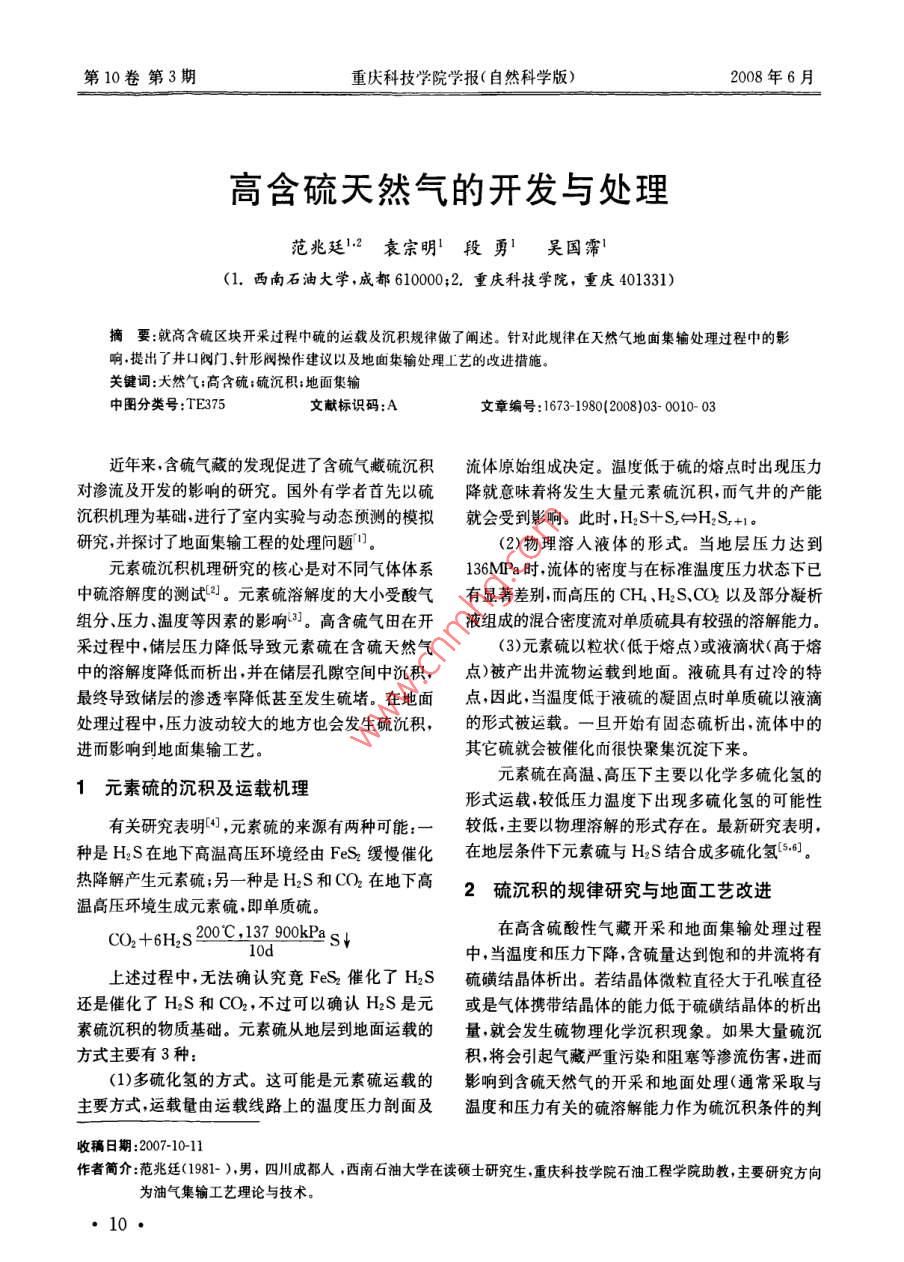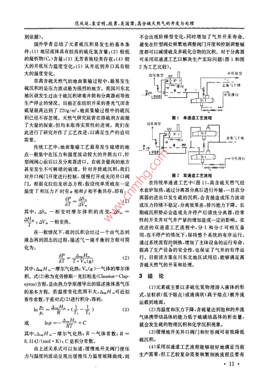 第10卷第3重慶科技學(xué)院學(xué)報(自然科學(xué)版)2008年6月高含硫天然氣的開發(fā)與處理范兆廷l2袁宗明段勇吳國霈(1.西南石油大學(xué),成都6100002,重慶科技學(xué)院,重慶401331)摘要:就高含硫區(qū)塊開采過程中硫的運載及沉積規(guī)律做了闡述。針對此規(guī)律在天然氣地面集輸處理過程中的影響提出了井口閥門針形閥操作建議以及地面集輸處理上藝的改進措施。關(guān)鍵詞:大然氣;高含硫;硫沉積;地面集輸中圖分類號:TE375文獻標(biāo)識碼:A文章編號:1673-1980(2008)03-0010-03年來含硫氣藏的發(fā)現(xiàn)促進了含硫氣藏硫沉積流體原始組成決定。溫度低于硫的熔點時出現(xiàn)壓力對滲流及開發(fā)的影響的研究。國外有學(xué)者首先以硫降就意味著將發(fā)生大量元素硫沉積,而氣井的產(chǎn)能沉積機理為基礎(chǔ),進行了室內(nèi)實驗與動態(tài)預(yù)測的模擬就會受到影響。此時,H2S+S,H2S,+1。研究,并探討了地面集輸工程的處理問題。2)物理溶入液體的形式。當(dāng)?shù)貙訅毫_到元素硫沉積機理研究的核心是對不同氣體體系136Ma時,流體的密度與在標(biāo)準(zhǔn)溫度壓力狀態(tài)下已中硫溶解度的測試2。元素硫溶解度的大小受酸氣有顯著差別而高壓的CH4、H2S,CO以及部分凝析組分、壓力溫度等因素的影響。高含硫氣田在開液組成的混合密度流對單質(zhì)硫具有較強的溶解能力采過程中,儲層壓力降低導(dǎo)致元素硫在含硫天然氣(3)元素硫以粒狀(低于熔點)或液滴狀(高于熔中的溶解度降低而析出并在儲層孔隙空間中沉積,點)被產(chǎn)出井流物運載到地面。液硫具有過冷的特最終導(dǎo)致儲層的滲透率降低甚至發(fā)生硫堵。在地面點因此當(dāng)溫度低于液硫的凝固點時單質(zhì)硫以液滴處理過程中,壓力波動較大的地方也會發(fā)生硫沉積,的形式被運載。一旦開始有固態(tài)硫析出,流體中的進而影響到地面集輸工藝其它硫就會被催化而很快聚集沉淀下來。1元素硫的沉積及運載機理元素硫在高溫、高壓下主要以化學(xué)多硫化氫的形式運載較低壓力溫度下出現(xiàn)多硫化氫的可能性有關(guān)研究表明,元素硫的來源有兩種可能:較低,主要以物理溶解的形式存在。最新研究表明種是H2S在地下高溫高壓環(huán)境經(jīng)由FeS2緩慢催化在地層條件下元素硫與H2S結(jié)合成多硫化氫降解產(chǎn)生元素硫;另一種是HS和C在地下高2硫沉積的規(guī)律研究與地面工藝改進溫高壓環(huán)境生成元素硫,即單質(zhì)硫。CO2+6H2s200c,137900kPaS↓在高含硫酸性氣藏開采和地面集輸處理過程中,當(dāng)溫度和壓力下降,含硫量達到飽和的井流將有上述過程中,無法確認究竟FeS2催化了H2S硫磺結(jié)晶體析出。若結(jié)晶體微粒直徑大于孔喉直徑還是催化了H2S和CO2,不過可以確認H2S是元或是氣體攜帶結(jié)晶體的能力低于硫磺結(jié)晶體的析出素硫沉積的物質(zhì)基礎(chǔ)。元素硫從地層到地面運載的量,就會發(fā)生硫物理化學(xué)沉積現(xiàn)象。如果大量硫沉方式主要有3種積將會引起氣藏嚴(yán)重污染和阻塞等滲流傷害進而(1)多硫化氫的方式。這可能是元素硫運載的影響到含硫天然氣的開采和地面處理(通常采取與主要方式,運載量由運載線路上的溫度壓力剖面及溫度和壓力有關(guān)的硫溶解能力作為硫沉積條件的判收稿日期:2007-1011作者簡介:范兆廷(91-),男,四川成都人,西南石油大學(xué)在讀碩土研究生重慶科技學(xué)院石油工程學(xué)院助教主要研究方向為油氣集輸工藝?yán)碚撆c技術(shù)范兆延,袁宗明,段勇,吳國霈:高含硫天然氣的開發(fā)與處理別依據(jù))不會出現(xiàn)階梯型變化,同時增加了氣井開采壽命國外學(xué)者總結(jié)了元素硫沉積易發(fā)生的基本條避免在針型閥處頻繁地調(diào)整閥門開度和控制調(diào)整幅件:(1)地層流體具有較高的硫化氫含量;(2)較低度都可以減緩硫及多硫化合物的沉積。對于分離器的凝析物(C3)含量;(3)無芳香族烴類存在;(4)較可采用雙通道工藝以解決生產(chǎn)實際問題(圖1和圖大的井底壓力溫度變化;(5)從井底到井口具有較2為工藝比較)。大的溫度變化。高壓放空屮壓放空在高含硫天然氣的地面集輸過程中,最易發(fā)生硫沉積的是壓力波動最為強烈的地方。我國川東北去集’(干線地區(qū)就發(fā)生過由于硫沉積堵塞井筒和分離器而導(dǎo)致中壓排污生產(chǎn)停止的情況。目前正在組織開采的普光氣田含硫量最高達到了220g/m3,地面集輸過程中的硫沉積已經(jīng)不容忽視。天然氣研究院曾在溶硫劑方面做圖1單通道工藝流程了大量的探索,但均未取得實質(zhì)性的進展。我們在高樂放空此進行了研究并作了工藝改進以滿足生產(chǎn)的迫切需要。去集氣干線傳統(tǒng)工藝中,地面集輸工藝最易發(fā)生硫堵的地{點一般集中在壓力和溫度波動較大的井筒出口、針型閥閥心前后以及分離器進口。在硫含量高的地方中壓排污甚至發(fā)生不可解堵的硫堵。針對井筒硫沉積,我們對井口閥門開度進行控制,緩慢打開或關(guān)閉井口閥圖2雙通道工藝流程門。根據(jù)克拉伯龍狀態(tài)方程,假設(shè)純單質(zhì)硫在一定在傳統(tǒng)單通道工藝中(圖1),高含硫天然氣經(jīng)溫度T和壓力F時有a相和B相平衡共存,即有:水套爐加熱,通過分離器分離后進行外輸,一旦在分=3(1)離器的進出口發(fā)生硫的沉積