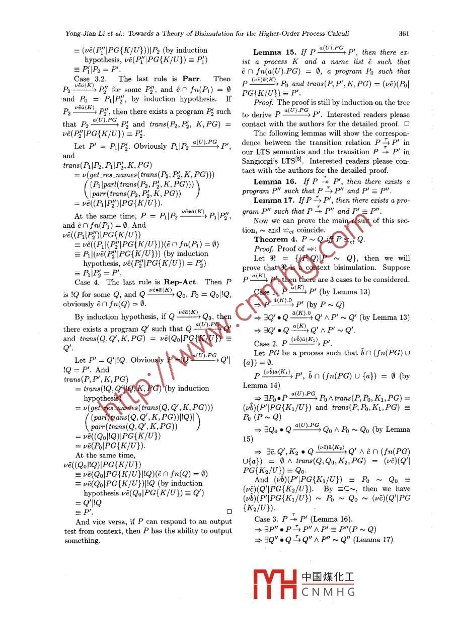 May 2004, Vol.19, No.3, pp.352- 363J. Comput. Sci. & Technol.Towards a Theory of Bisimulation for the Higher-Order ProcessCalculiYong-Jian Li and Xin-Xin LiuLaboratory of Computer Science, Institute of Software, The Chinese Academy of Sciences, Bcijing 100080P.R. China .E-mail: lyj238@ios.ac.cnReceived December 25, 2002; revised September 12, 2003.Abstract In this paper, a labelled transition semantics for higher-order process calculi is studied. The labelledtransition semantics is relatively clean and simple, and corresponding bisimulation equivalence can be easilyformulated based on it. And the congruence properties of the bisimulation equivalence can be proved easily.To show the correspondence between the proposed semantics and the well-established oncs, the bisimulation ischaracterized as a version of barbed equivalence and a version of context bisimulation.Keywords higher order process, labelled transition semantics, barbed bisimulation, context- bisimulation1 Introductioncated the definition of labelled transition relation.The second problem is the meaning of the label ofLabelled semantics achieved great success inhigher order output action in traditional LTS. Itearly studies of process calculi. Based on lblled only takes into account the object that the processsemantics, the idea of bisimulation was introduced emits, but not the context in which the emittedand formulated by Miner and Parkl,2 and has be- object is supposed to be used. For example, let uscome one of the most important notions in pro-consider an output action in HOπ's LTS[5].cess calculi. In mobility-free calculi such as cCsl3P v遠(yuǎn)(K), p'which has later become a blueprint for new processcalculi, a labeled transition system describes the where vca(K) represents the output object of P,operational behaviors of processes, and bisimula and P' represents the derivative of P. And thetion is defined on top of the labeled transition sys- whole transition rule does not contain any infor-tem (LTS) by imposing the following requirement: mation about the context in which emitted objecttwo processes are bisimilar if any action by one of is supposed to be used.ther can be matched by an equal action from theThis traditional higher order output transitionother in such a way that the resulting derivatives will cause the non naturalness problems in the def-are again bisimilar. Note that two matching actions inition of bisimulation. In more detail, when defin-must be syntactically identical. It is reasonable in ing some kind of bisimulation R of two examplefirst-order process calculus, because the effect of processes P, Q, we cannot use the traditional clausethe first-order object on the enviroument can be as below to define the matching of the higher-orderentirely represented by its syntax form.output actions of the two processes.When moving to more powerful process calculi●Whenever P與P', then Q' existss.t. Q牛Q'with mobility and higher order features, the tra- and P' RQ', where μ is a higher-order output ac-ditional labelled semantics become hard to work tion.(1with, and corresponding bisimulation formulationsUnlike first- order output action, the compari-are often much more elaborated, resulting in less son of labels of high order output action, for exam-satisfactory theories. It seems that two problems ple, processes, cannot be based on syntactic iden-have made traditional labelled semantics difficult tity in formulation of bisimulation, that would befor richer process calculi. The first is passing of too strong for any reasonable sernantic equivalence.local names out of the scope where they are deThomsen used bisimilarity instead of identity infined. The scope extrusion rule was introduced comparing labelslo), following earlier ideas of Aste-to cope with this4, but some delicate structure siano and Boudol[r別), but the resulting equivalencewas also introduced into the labels, which compli-is still too strong.*CorrespondenceThis work is Bupported by the National Natural Science Foundation of China under Grant No.60173020.中國煤化工MYHCNMHGYong-Jian Li et al: Towards a Theory of Bisimulation for the Higher Order Process Calculi353Sangiorgi had some very ilustrative examplesidea can be successfully applied to higher orderof the problems in his dissertationsl5. And heprocess calculi. In our labelled transition seman-pointed out that the separation between the ob-tics, there are three kinds of labels: T, a(U).q,ject part (i.e, the process emitted) and the con-a(K).0. As usual, P與P' represents internal com-text of a higher-order output prevents a satisfac-munication as traditional LTS. However p*OYp'tory treatment of the channels private to the two,and p4R2) P' represent that P can respond to theand then causes the problems of higher order bisim-ulation mentioned above. To avoid this separation tets a(V).Q and (K>.0 from context rspectivelyebetween object part and context of an output ac-and then becomes P'. We will show that our la-tion, he proposed a context bisimulation as belowbelled transition semantics are relatively clean andwhich explicitly takes into account the context inthe corresponding bisimulation equivalence can bewhich the emitted object is supposed to be used.easily obtained.To show the correctness and rationality of ourWhenever P IDOa\h14P', then Q' ex-semantics, we want to show the correspondenceists s.t.Q welakz+Q' and for all PG withbetween our labelled semantics and those well-fn(PG)n(6u2) = 0, (ub)(P'PG{K/U})R estabished. First, we want to relate our LTS with(ue)(Q'|PG{K2/U})-(2reduction semantics. And we will characterize ourBut this style of context bisimulation still seemsnew bisimulation in terms of a version of barbednon-natural and complex. First, the clauses of theequivalence. Second, we relate our LTS semanticsdefinition of bisimulation are not defined in a uni-to Sangorigi's LTS. And our new bisimulation willform style. The clause, which defines matching be-be characterized in terms 