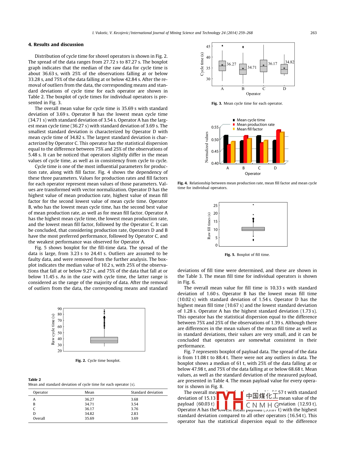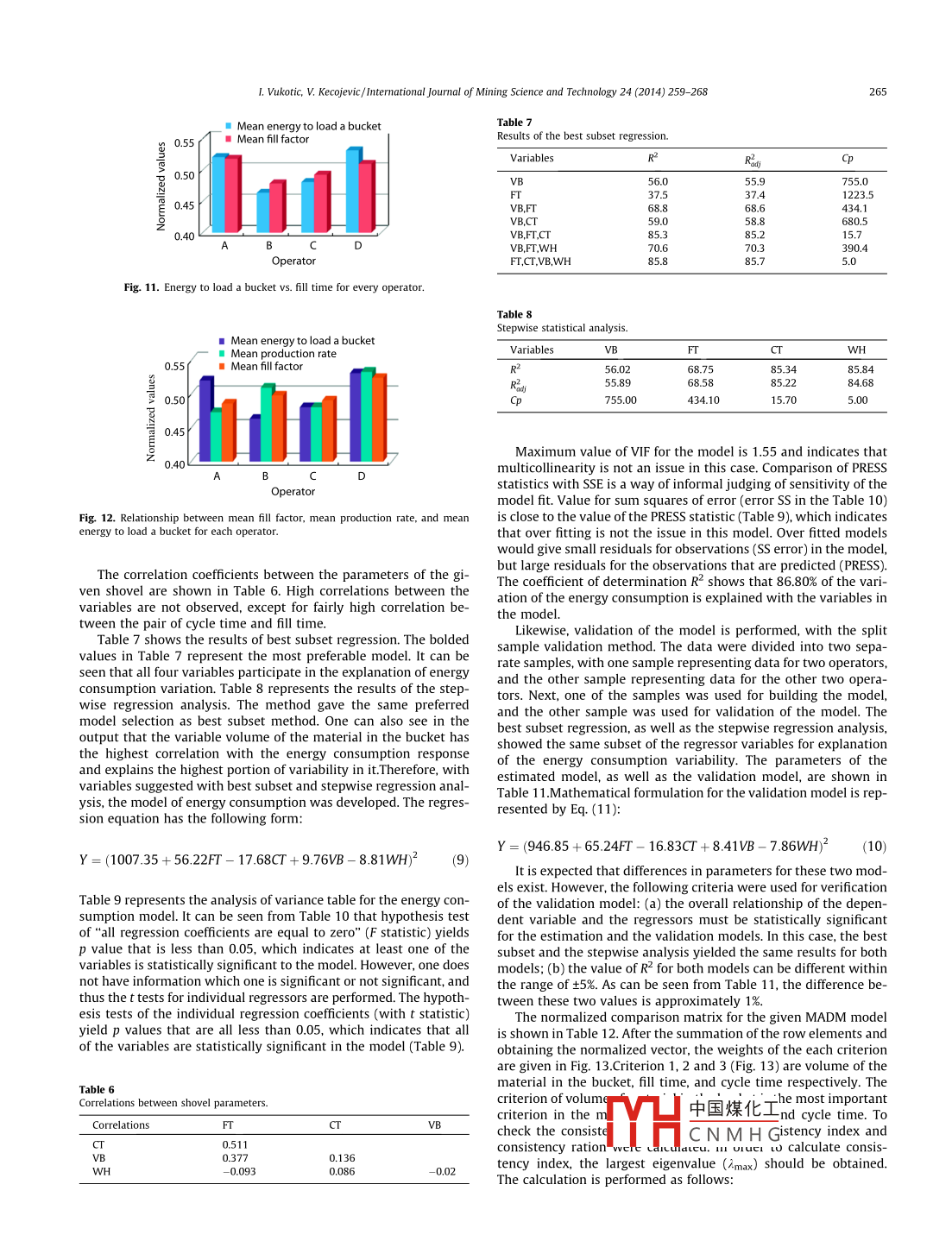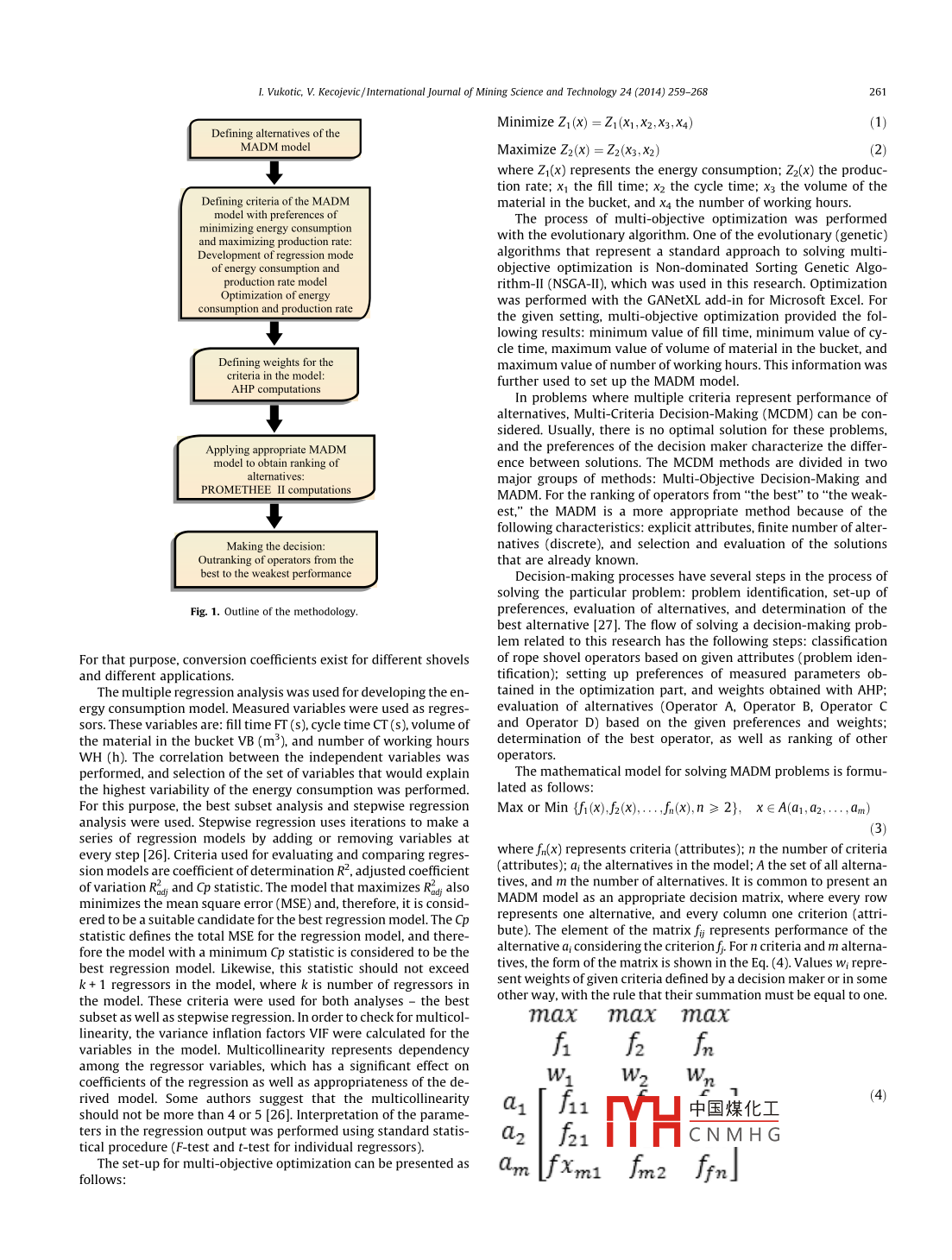 International Journal of Mining Science and Technology 24(2014)259-268Contents lists available at Science DirectInternational Journal of Mining Science and TechnologyELSEVIERurnalhomepagewww.elsevier.com/locate/ijmstEvaluation of rope shovel operators in surface coal miningusing a multi-Attribute Decision-Making modelVukotic Ivana, Kecojevic VladislavARTICLE INFOABSTRACTArticle historRope shovels are used to dig and load materials in surface mines. One of the main factors that influenceReceived 27 July 2013the production rate and energy consumption of rope shovels is the performance of the operator. ThReceived in revised form 26 August 2013aper presents a method for evaluating rope shovel operators using the Multi-Attribute Decision-MakingAccepted 21 September 2013Available online 12 February 2014(MADM)model Data used in this research were collected from an operating surface coal mine in thesouthern United States. The MADM model consists of attributes, their weights of importance, and alter-natives. Shovel operators are considered the alternatives. The energy consumption model was developedpe shovelwith multiple regression analysis, and its variables were included in the MADM model as attributesPreferences with respect to min/ max of the defined attributes were obtained with multi-objective optimization Multi-objective optimization was conducted with the overall goal of minimizing energy con-Imption and maximizing production rate. Weights of importance of the attributes were determinedAHPby the Analytical Hierarchy Process(AHP). The overall evaluation of operators was performed by oneof the MADM models, i.e., PROMETHEE IL. The research results presented here may be used by miningprofessionals to help evaluate the performance of rope shovel operators in surface miningo 2014 Published by Elsevier B V on behalf of China University of Mining Technology1 Introductionmotion are used to control the depth of the bucket penetrationPenetration that is too shallow will lead to longer hoist travel dRope shovels are used in large surface mining operations for the tance needed to fill the bucket, which will increase the fill time anddigging and loading of materials. Shovel productivity is highly influ- decrease the fill factor. However, applying excessive crowd motionenced by the skill and working practices of operators. Caterpillar will make the hoist motion slower The whole cycle time increasesdicates that one of the major factors for obtaining maximum pro- up to 50%, or even more, when the bucket is stalled in the bankductivity is a well-trained operator [1. According to Fiscor, better Therefore, to achieve an effective digging process, it is mandatoryoperator training and a consistent clean-up process around the load- for an operator to establish balance between the hoist and crowding area and face could save 20 min of cycle time per day [2. Several motion. In addition, unbalanced crowd and hoist forces lead toresearch studies have shown that mine operating conditions and jacking of the boom, which can cause serious damage to the shoveloperators'practices significantly affect energy consumption 3-71The swinging phase begins when the bucket is full of material,he most influential factors related to the overall working cycle and in this phase, the operator controls the movement of the bucketof the shovel that impact its productivity are cycle time and fillabil- though a defined swing path and dump height toward the haulle bucket. The basic rope shovel motions involve hoist, truck. An experienced operator can achieve smooth and continuouscrowd, swing, and propel. The shovel operating cycle consists of dig- acceleration, maximum speed, and deceleration Motion that is notging, swinging, dumping, returning, and positioning. Even though smooth can result in the increase of time and spillage, which canthese parts of the operation are operationally independent, the skill further damage the body of the truck. In addition the operator influ-and coordination of an operator is required for a smooth cycleences the propel function, or positioning of the shovel in order to getThe digging phase involves crowd motion of the bucket into the the highest number of filled buckets before moving again. Locatingbank, hoist motion to fill the bucket, and drawing from the bank the shovel too far from the bank can decrease available digging18. When the bucket is hoisted to the bank, crowd and retract power. Also, inappropriate shovel location leads to an increase in cy-cle time. Maximum efficiency is achieved when it is positioned closeto the toe of the bank. According to P&H Mine Pro Services, by savingcomes ponding wian tie icomailwy3ed2 min per operati中國(guó)煤化工 shovel could loadone additional 1CNMHGhttp://dx.doiorg/10.1016/j.ijmst.2014.01.0192095-2686 2014 Published by Elsevier B V on behalf of China University of Mining Technology50L. Vukotic, V. Kecojevic/ International Journal of Mining Science and Technology 24(2014)259-268Since operator performance significantly affects performance of techniques that operators practiced during the digging part ofthe shovel, it is important to analyze parts of the cycle that can be the cycle with respect to hoist/ crowd utilization widzyk-Capehartimproved. The evaluation of shovel operators will help mining pro- and Lever pointed out that the individual styles of operators have afessionals develop strategies for improving productivity and en- significant impact on shovel productivity, and the operator behavergy efficiency, and reducing the operating costior was examined through a real-time feedback system [ 5]. WeissThere is a lack of quantitative models to evaluate shovel opera- and Shanteau indicated that application of measurement instrutor performance. Particularly, there is a lack of models that con- ments eliminates inconsistencies related to fatigue and bias associ-[23 One of such examples would beenergy consumption, and the relationship between shovel operator usin