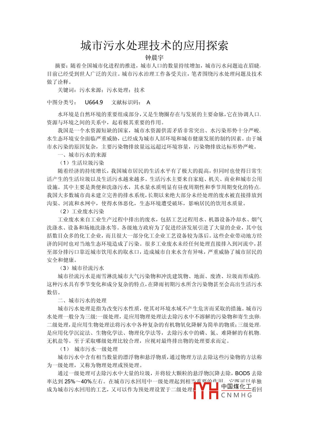 城市污水處理技術(shù)的應(yīng)用探索鐘晨宇摘要:隨著全國城市化進(jìn)程的推進(jìn),城市人口的數(shù)量持續(xù)增加,城市污水問題迫在眉睫,目前已經(jīng)受到世人廣泛的關(guān)注。城市污水治理工作備受關(guān)注,筆者圍繞污水處理問題及技術(shù)做了詮釋。關(guān)鍵詞:污水來源:污水處理;技術(shù).中圖分類號:U664.9文獻(xiàn)標(biāo)識碼: A水環(huán)境是自然環(huán)境的重要組成部分,又是生物圈存在與發(fā)展的主要命脈,它在協(xié)調(diào)人口、資源與環(huán)境之間的關(guān)系中,起著極其重要的作用。我國是一個水資源短缺的國家,城市水資源供需矛盾非常突出、水污染形勢十分嚴(yán)峻、水生態(tài)環(huán)境安全面臨嚴(yán)重威脅,已經(jīng)成為城市人居環(huán)境和城市健康發(fā)展的制約因素。由于城市水污染的原因復(fù)雜,主要污染物排放量遠(yuǎn)遠(yuǎn)超過環(huán)境容量,污染物排放達(dá)標(biāo)形勢嚴(yán)峻。一、城市污水的來源(1)生活垃圾污染隨著經(jīng)濟(jì)的持續(xù)增長,我國城市居民的生活水平有了極大的提高,但同時也使得日常生活產(chǎn)生的生活垃圾以及生活污水越來越多。生活污水主要來自家庭、機(jī)關(guān)、商業(yè)和城市公用設(shè)施。其中主要是糞便和洗滌污水,其水量水質(zhì)明顯有晝夜周期性和季節(jié)周期變化的特點(diǎn)。我國大多數(shù)城市尚未建立完善的排水系統(tǒng),長期以來絕大部分未經(jīng)處理的廢水被直接排放到溝渠、河流和水網(wǎng)中,使得水體惡化,生態(tài)環(huán)境遭受破壞,影響居民的飲用水質(zhì)量。(2)工業(yè)廢水污染工業(yè)廢水來自工業(yè)生產(chǎn)過程中排出的廢水,包括工藝過程用水、機(jī)器設(shè)備冷卻水、煙氣洗滌水、設(shè)備和場地洗滌水等。各級地方政府為了促進(jìn)經(jīng)濟(jì)發(fā)展引進(jìn)了大量的企業(yè),其中包括數(shù)目眾多的化工企業(yè),而且很大一部分化工企業(yè)工藝設(shè)備較為落后。這些企業(yè)帶動地方經(jīng)濟(jì)的同時也對當(dāng)?shù)厣鷳B(tài)環(huán)境造成了污染。很多工業(yè)廢水未經(jīng)任何處理直接排入到河流中,甚至部分排污口靠近城市飲用水的取水口,造成城市自來水含有異味,嚴(yán)重威脅了城市居民的安全和健康。(3)城市徑流污水.城市徑流污水是雨雪淋洗城市大氣污染物和沖洗建筑物、地面、廢渣、垃圾而形成的,這種污水具有季節(jié)變化和成分復(fù)雜的特點(diǎn),在降雨初期污水所含污染物甚至?xí)叱錾钗鬯當(dāng)?shù)倍。二、城市污水的處理城市污水處理是指為改變污水性質(zhì),使其對環(huán)境水域不產(chǎn)生危害而采取的措施。城市污水處理一-般分為三級:一-級處理,是應(yīng)用物理處理法去除污水中不溶解的污染物和寄生蟲卵;二級處理,是應(yīng)用生物處理法將污水中各種復(fù)雜的有機(jī)物氧化降解為簡單的物質(zhì);三級處理,是應(yīng)用化學(xué)沉淀法、生物化學(xué)法、物理化學(xué)法等,去除污水中的磷、氮、難降解的有機(jī)物、無機(jī)鹽等。至于采取哪級處理比較合理,應(yīng)視對最終排出物的處理要求而定。(1)城市污水- -級 處理城市污水中含有相當(dāng)數(shù)量的漂浮物和懸浮物質(zhì),通過物理方法去除這些污染物的方法稱為一級處理,又稱為物理處理或預(yù)處理。通過一級處理可去除污水中大量的垃圾,并將較大顆粒的懸浮物沉降去除,BOD5去除率達(dá)到25% ~40%左右。在城市污水回用中-級 處理起到相當(dāng)重要的作甲。它睡可以單獨(dú).成為城市污水回用的工藝,又可以作為預(yù)處理設(shè)置于二級處理中國煤化工1看回fYHCNMHG用水的用途,如果沒有混入工業(yè)污水的純生活污水,或不含重金屬的城市污水回用于農(nóng)田灌溉、養(yǎng)魚等用途時,可直接采用一-級處理,這是最節(jié)省處理費(fèi)用的處理方法,同時使大量污水回用是節(jié)省水資源的很重要的手段之一。如回用于工業(yè)用水或城市景觀用水時,一級處理作為預(yù)處理設(shè)置于二級處理的前頭,可減輕二級處理負(fù)荷,減少運(yùn)行費(fèi)用和提高出水效果(如圖1)。(2)城市污水的二級處理a、普通活性污泥法。普通活性污泥法又稱傳統(tǒng)活性污泥法。傳統(tǒng)活性污泥法系統(tǒng),主要由普通曝氣池、曝氣系統(tǒng)、二沉池、污泥回流系統(tǒng)、剩余污泥排放等部分組成。其中,曝氣池與二沉池是二級處理的主體。污水經(jīng)--級處理后從初沉池進(jìn)入曝氣池,活性污泥也從二沉池底部經(jīng)回流泵抽升回流進(jìn)入曝氣池,兩者混合形成混合液。曝氣池內(nèi)設(shè)有空氣管和曝氣頭等曝氣裝置,由鼓風(fēng)機(jī)房送來的空氣經(jīng)曝氣裝置對混合液進(jìn)行曝氣,并使合液得到充足的氧氣并受到充分的攪拌,使活性污泥和廢水充分接觸。廢水中的可溶性有機(jī)污染物被活性污泥吸附,繼而被活性污泥的微生物群體降解,使廢水得到凈化。完成凈化過程后,混合液流入二沉池,經(jīng)過沉淀,混合液中的活性污泥與已被凈化的廢水分離,處理水從二沉池排放,活性污泥在沉淀池的污泥區(qū)受重力濃縮,并以較高的濃度由二沉池的吸刮泥機(jī)收集流入回流污泥集泥池,再由回流泵連續(xù)不斷地回流污泥,使活性污泥在曝氣池和二二